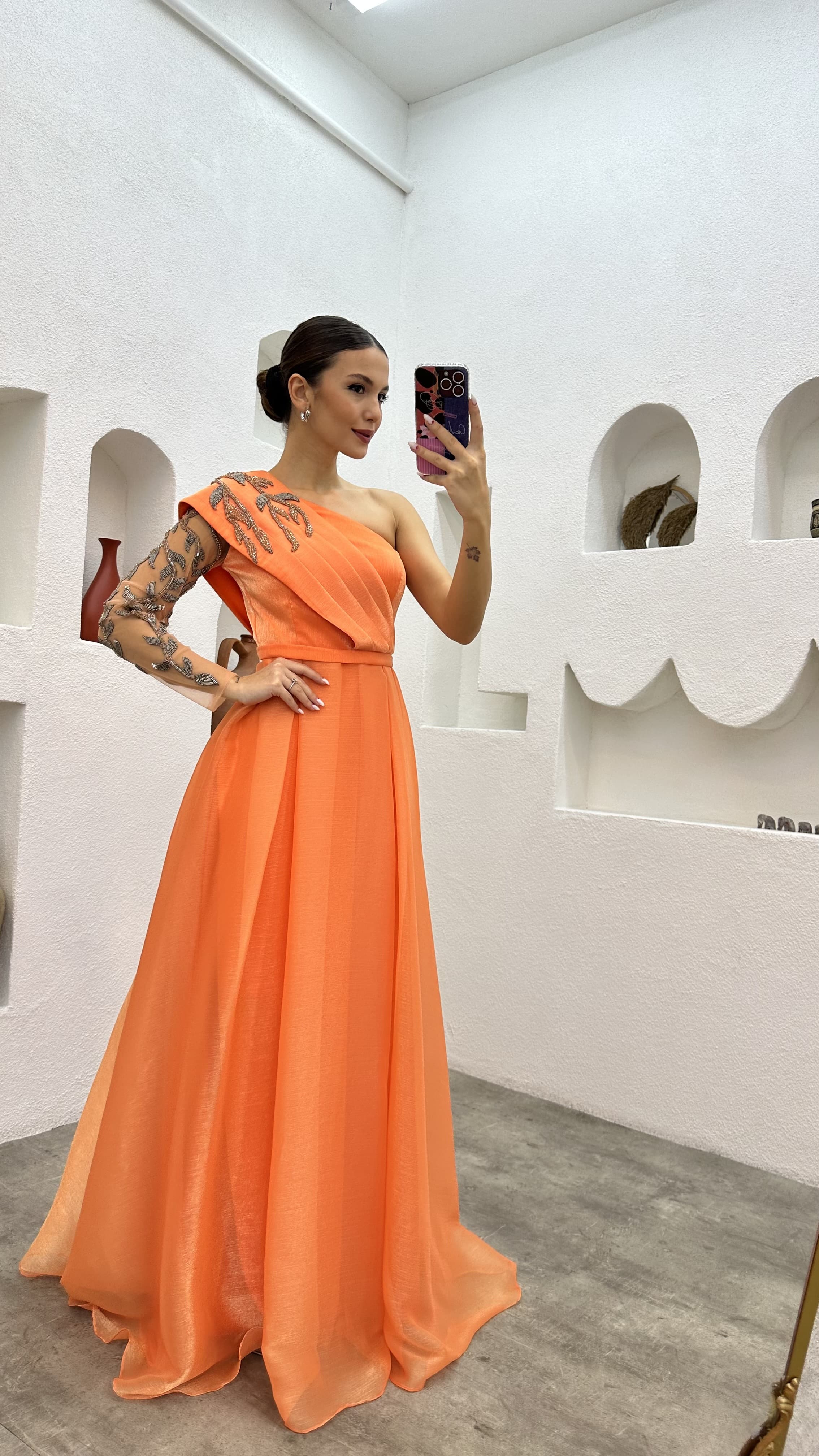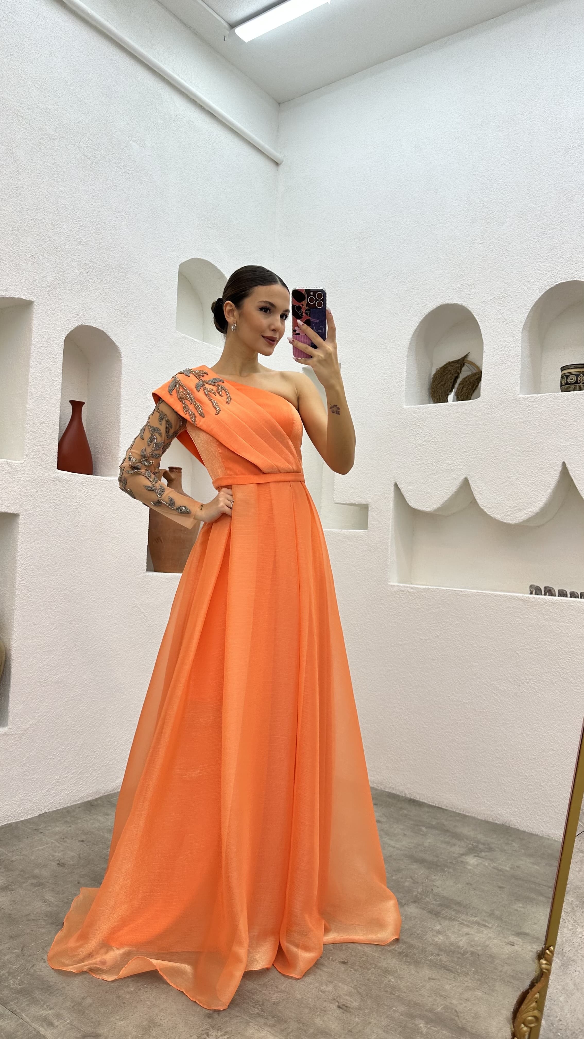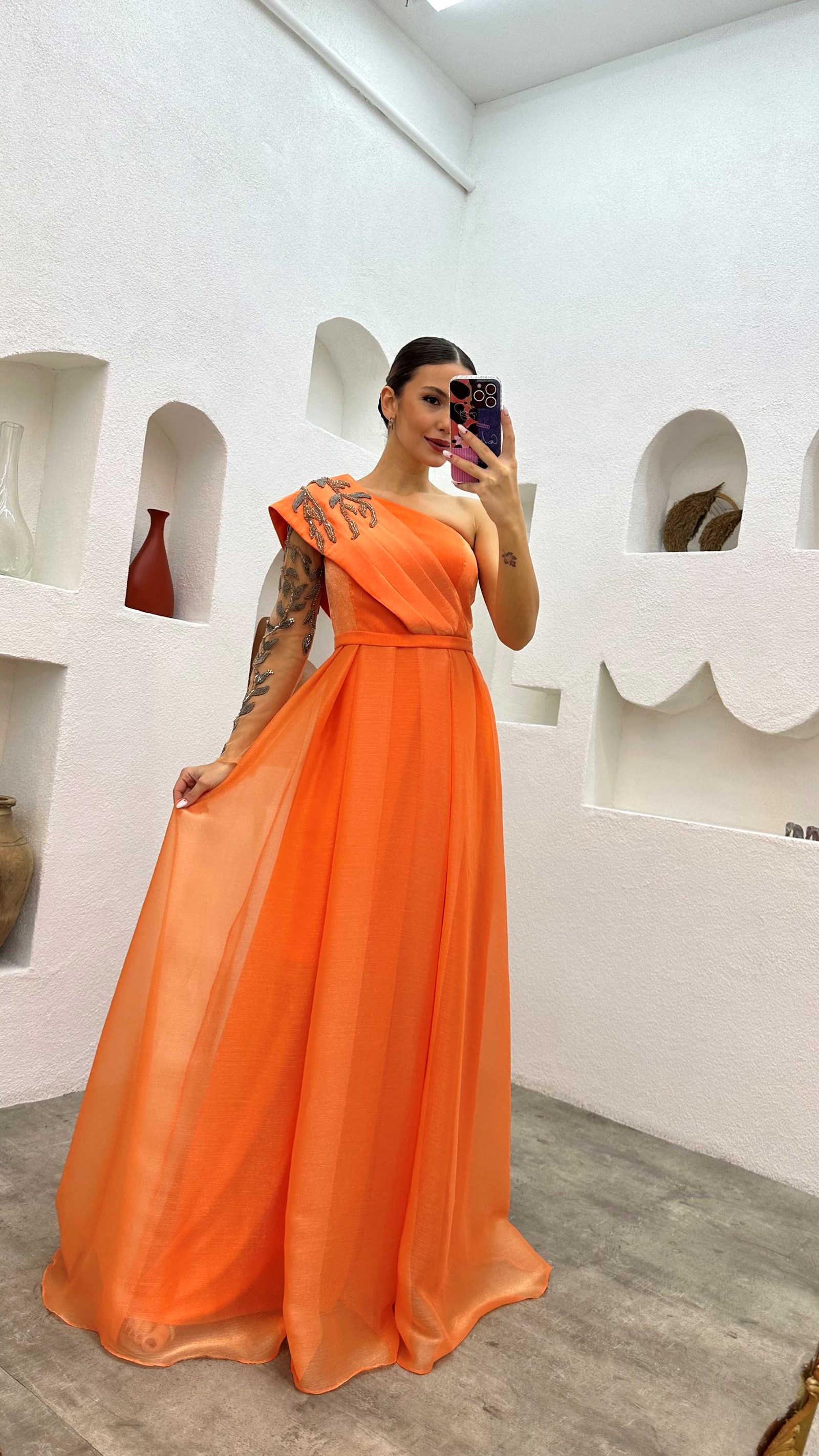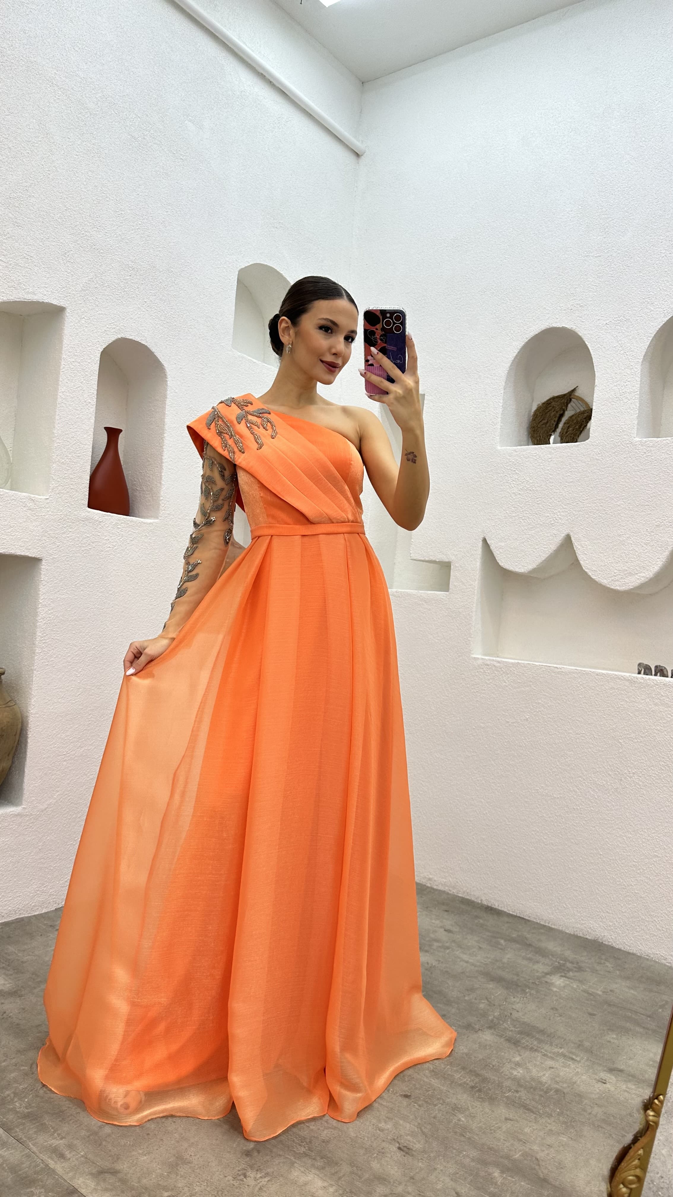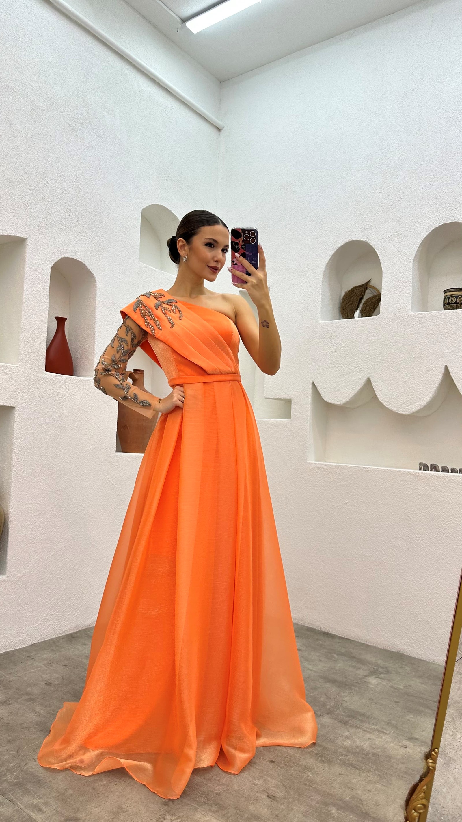 • Turuncu Tek Omuz İşlemeli Abiye Elbise