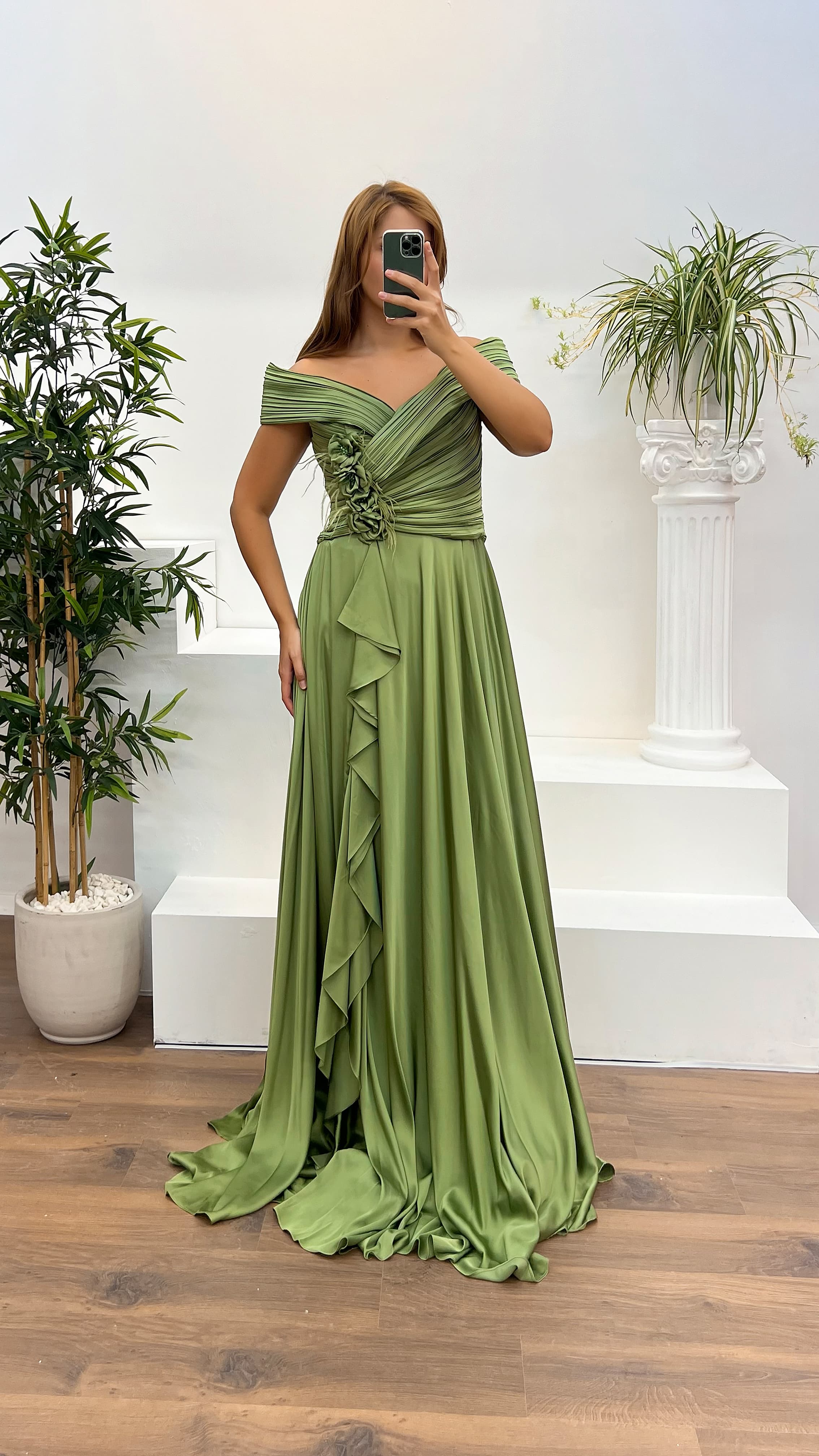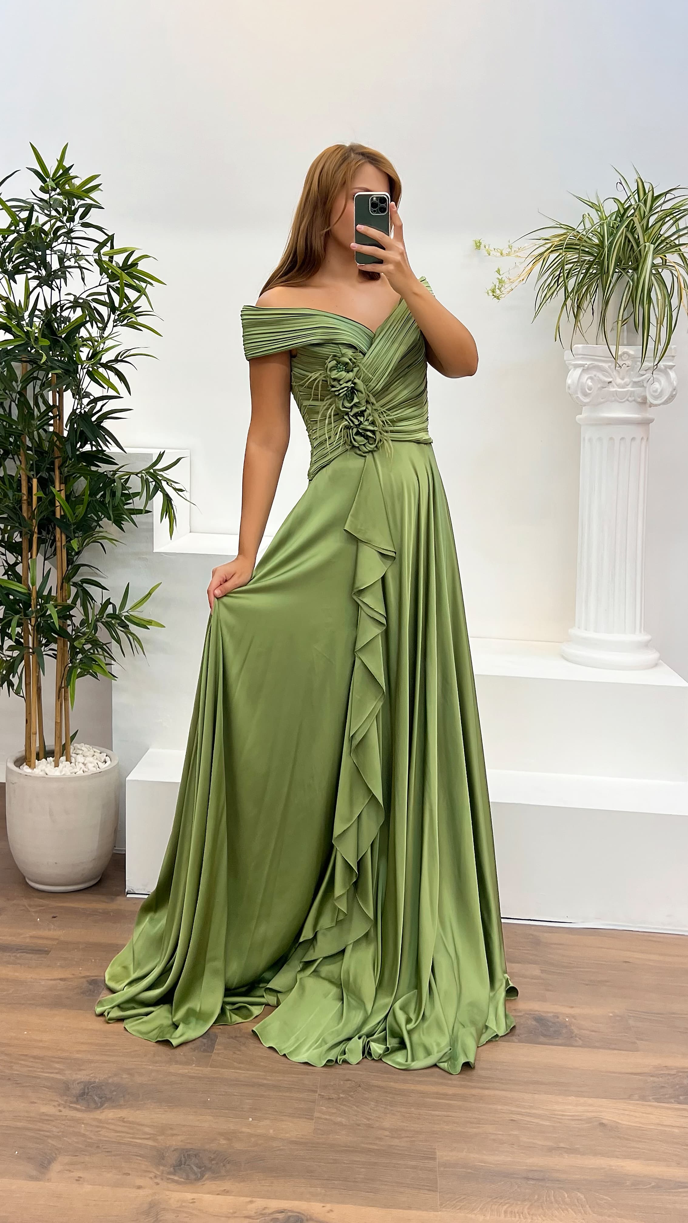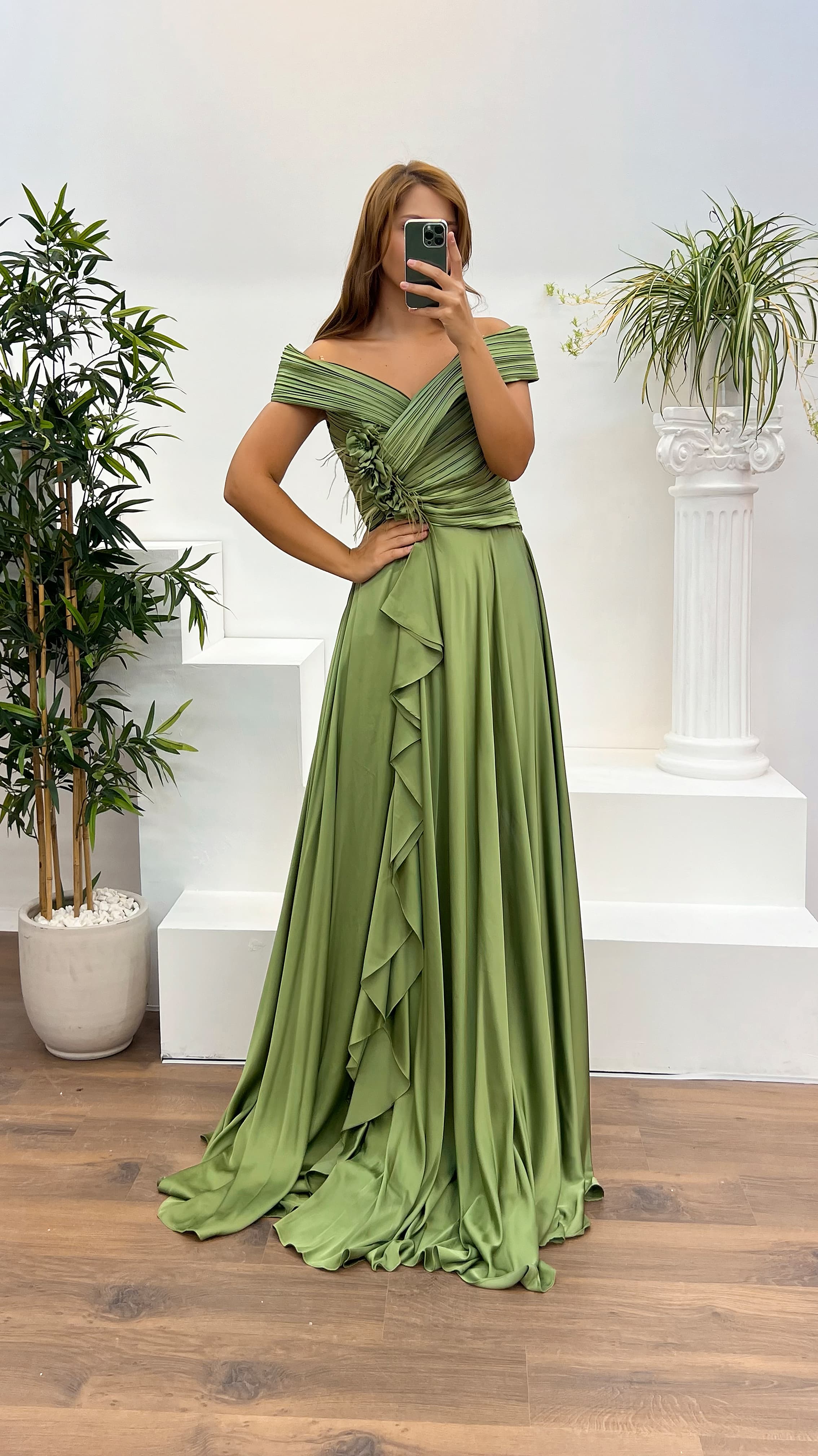 فستان سهرة من الساتان برقبة قارب أخضر وتفاصيل خصر مقاس كبير
