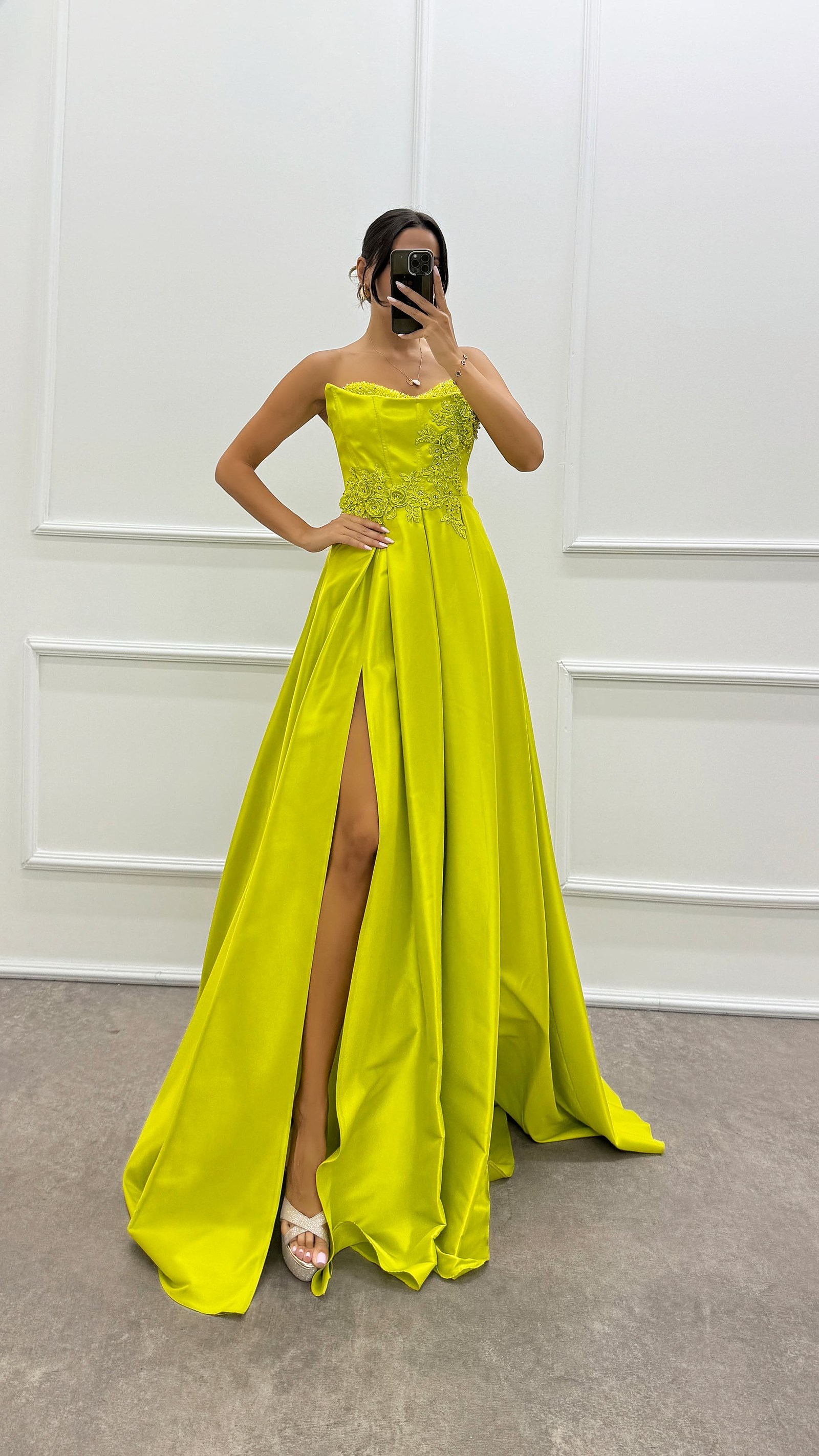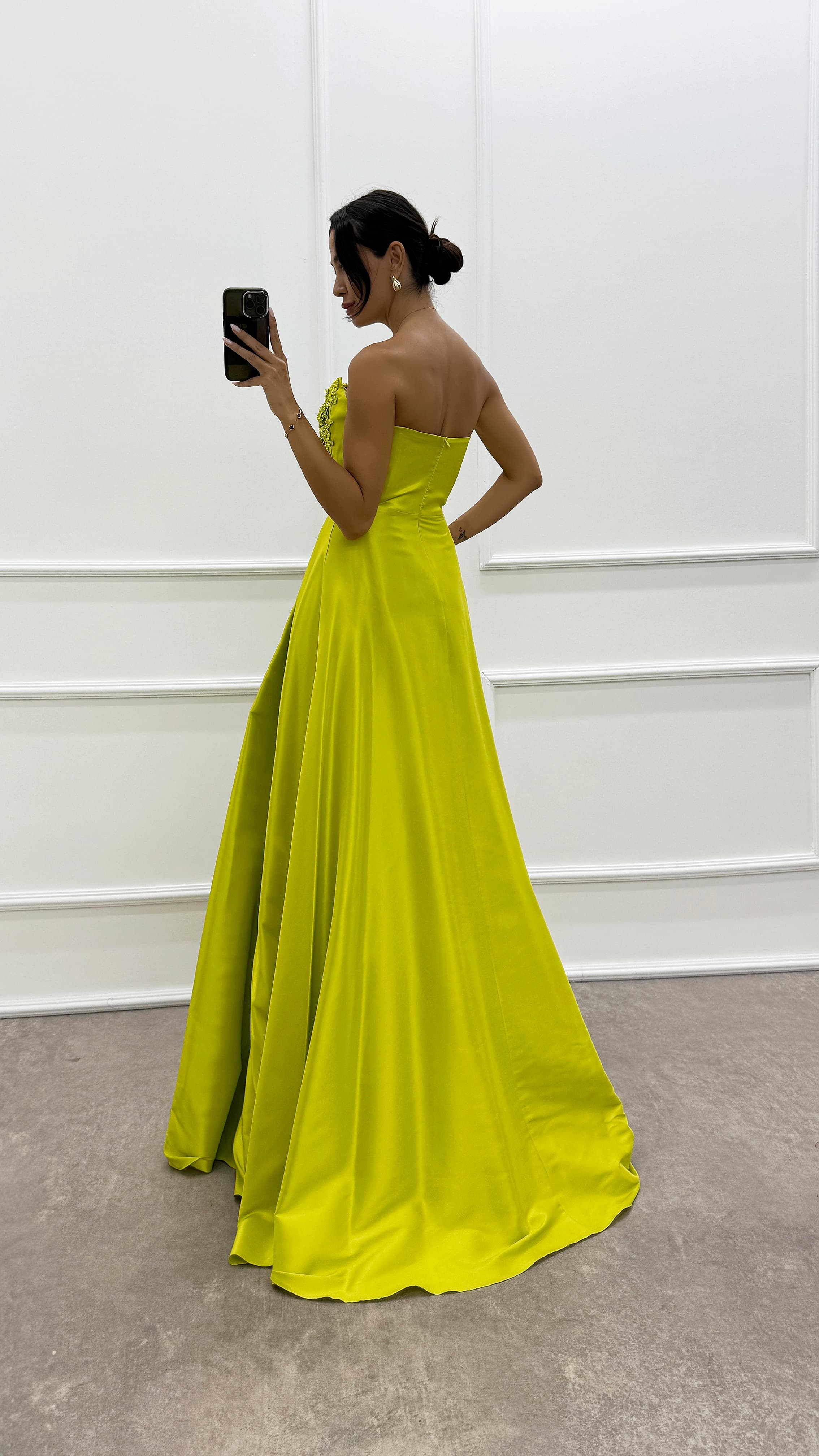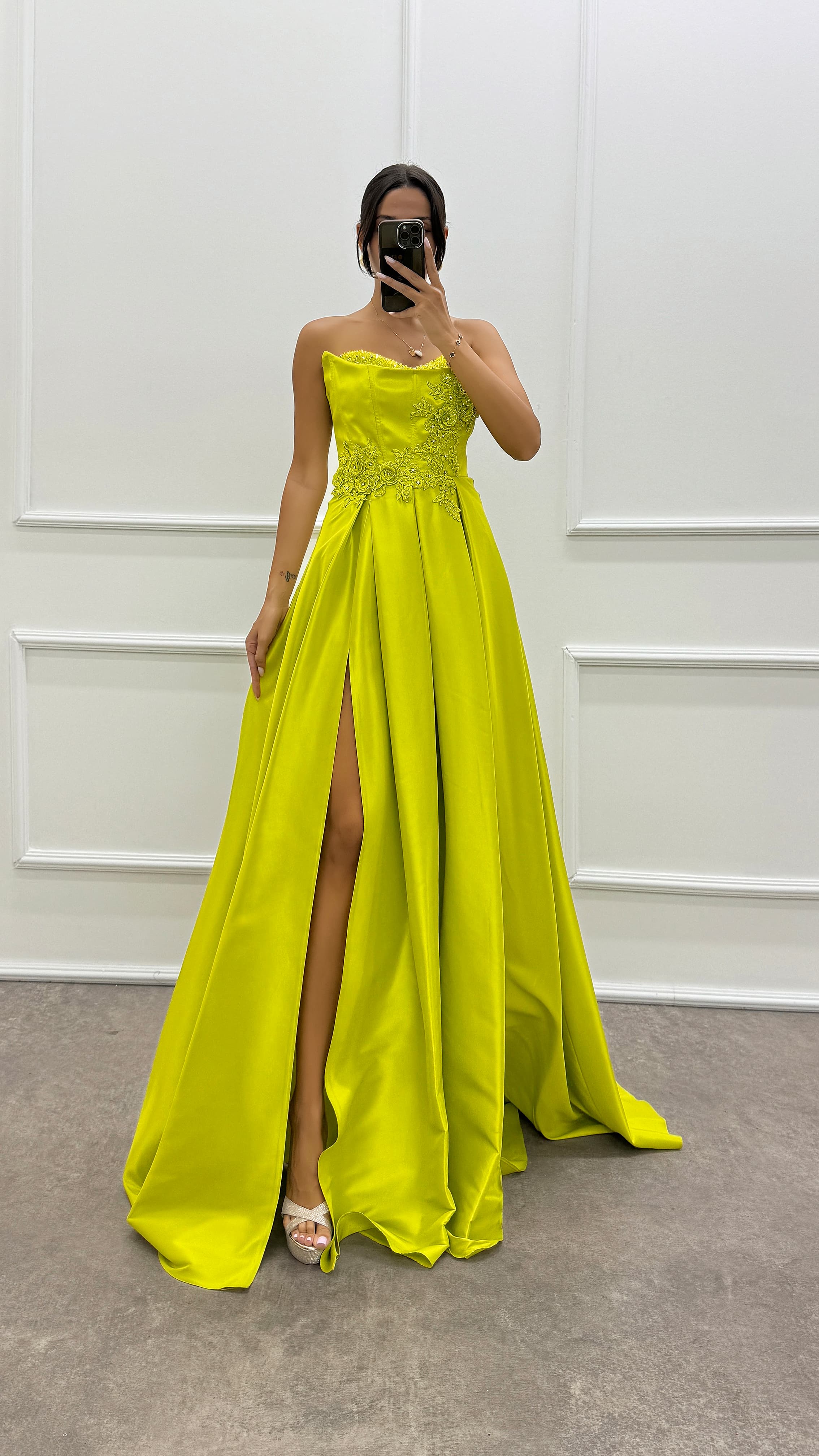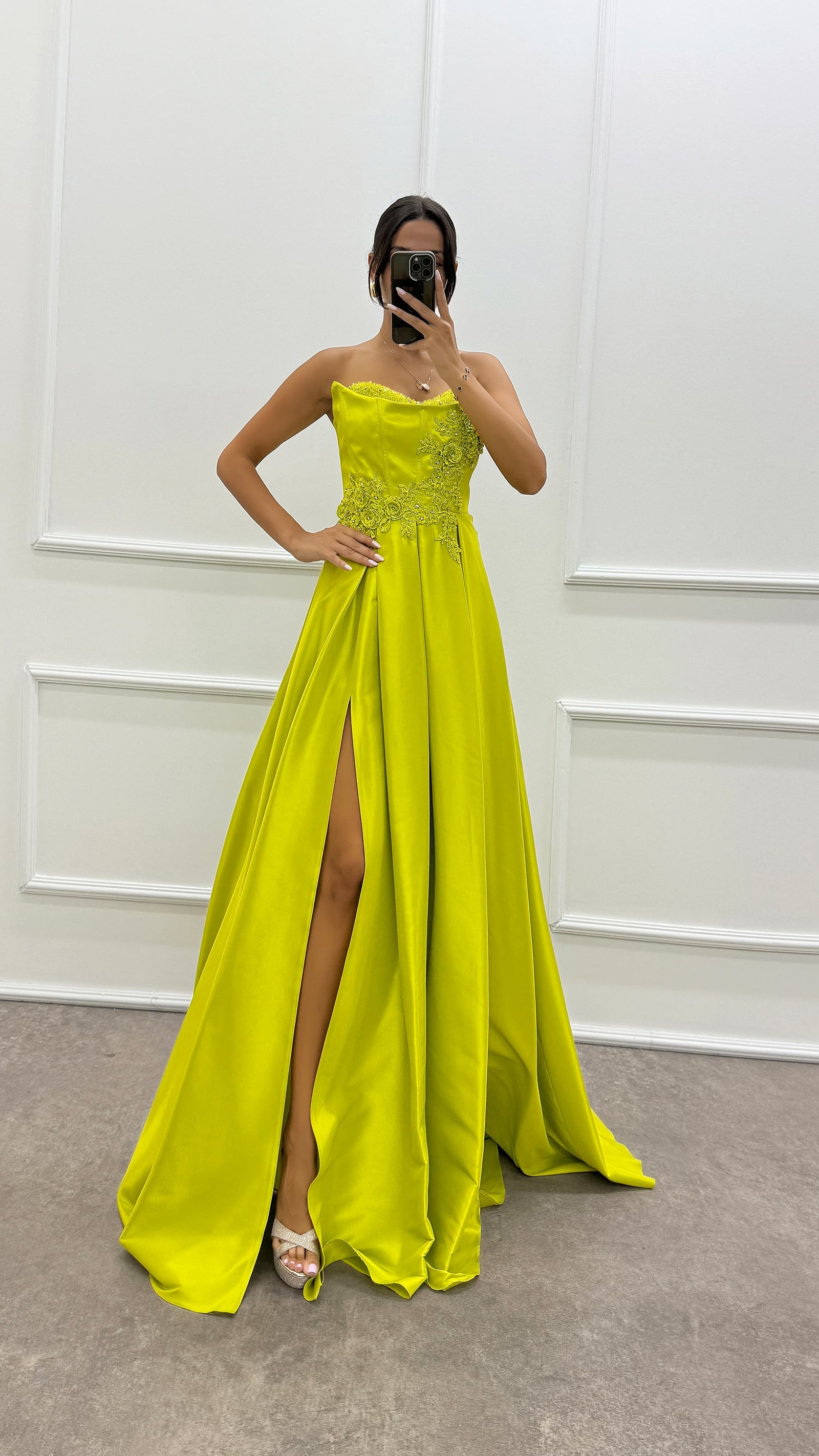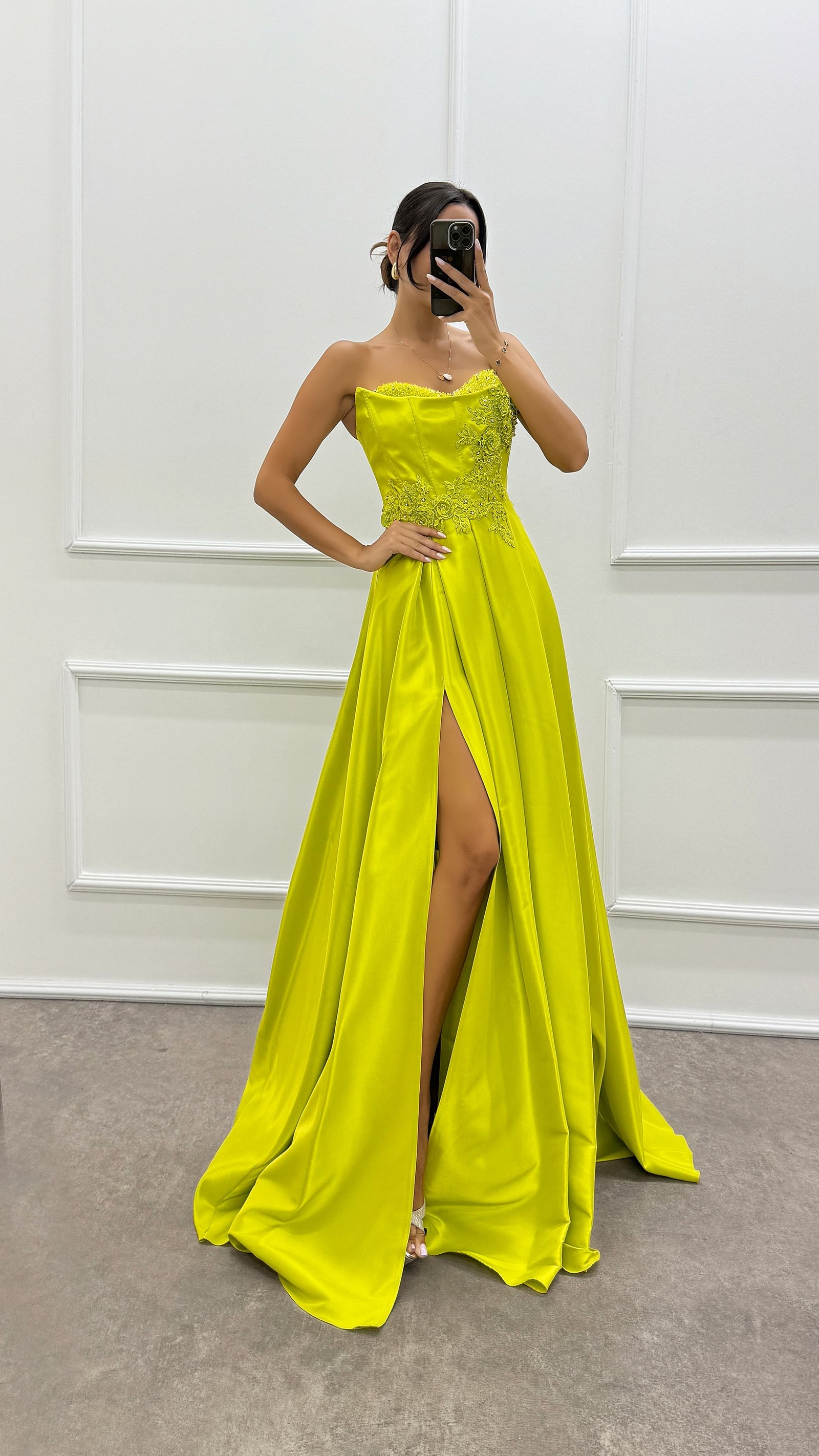 • Sarı Straplez Göğsü İşlemeli Tasarım Abiye Elbise