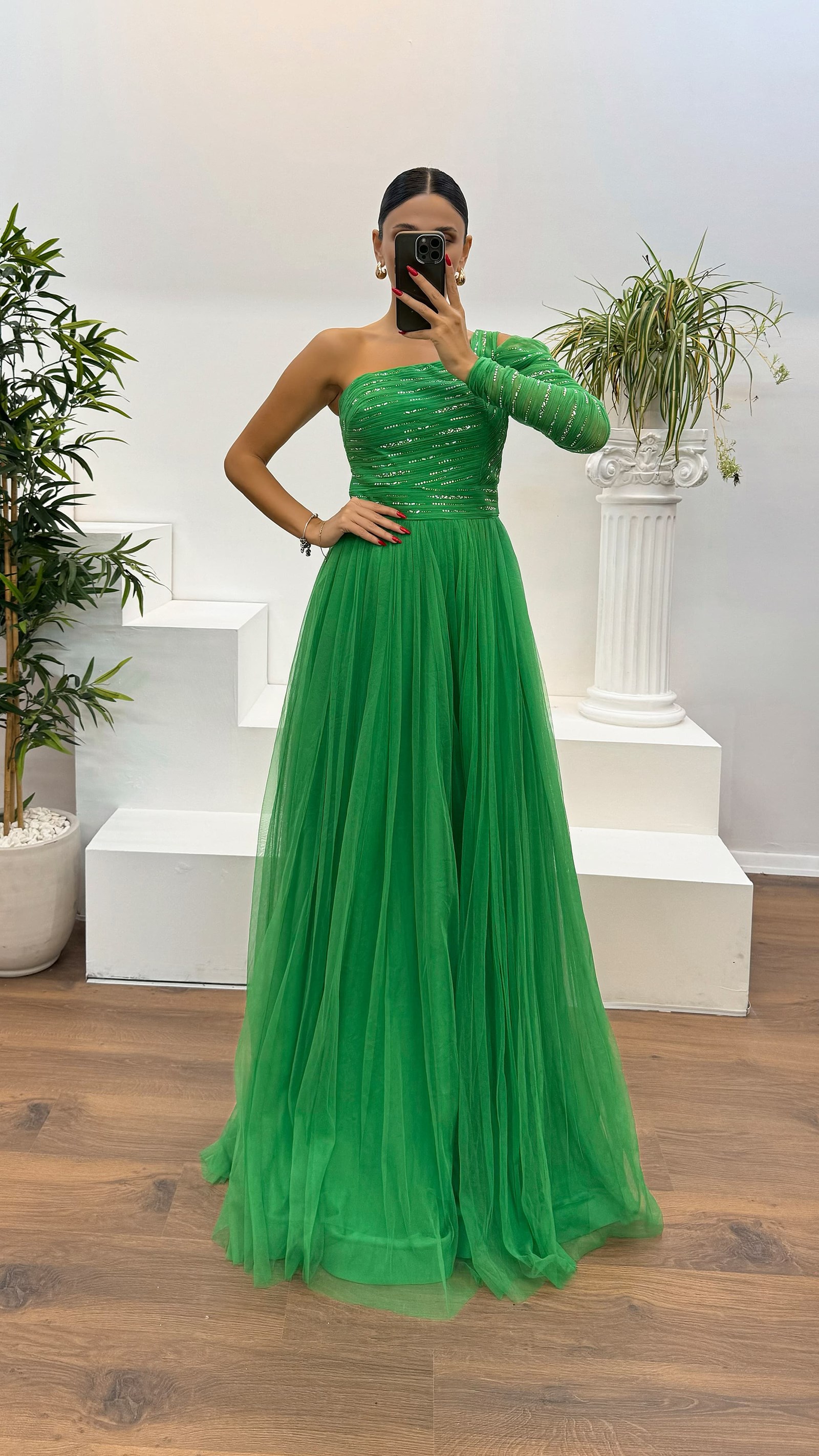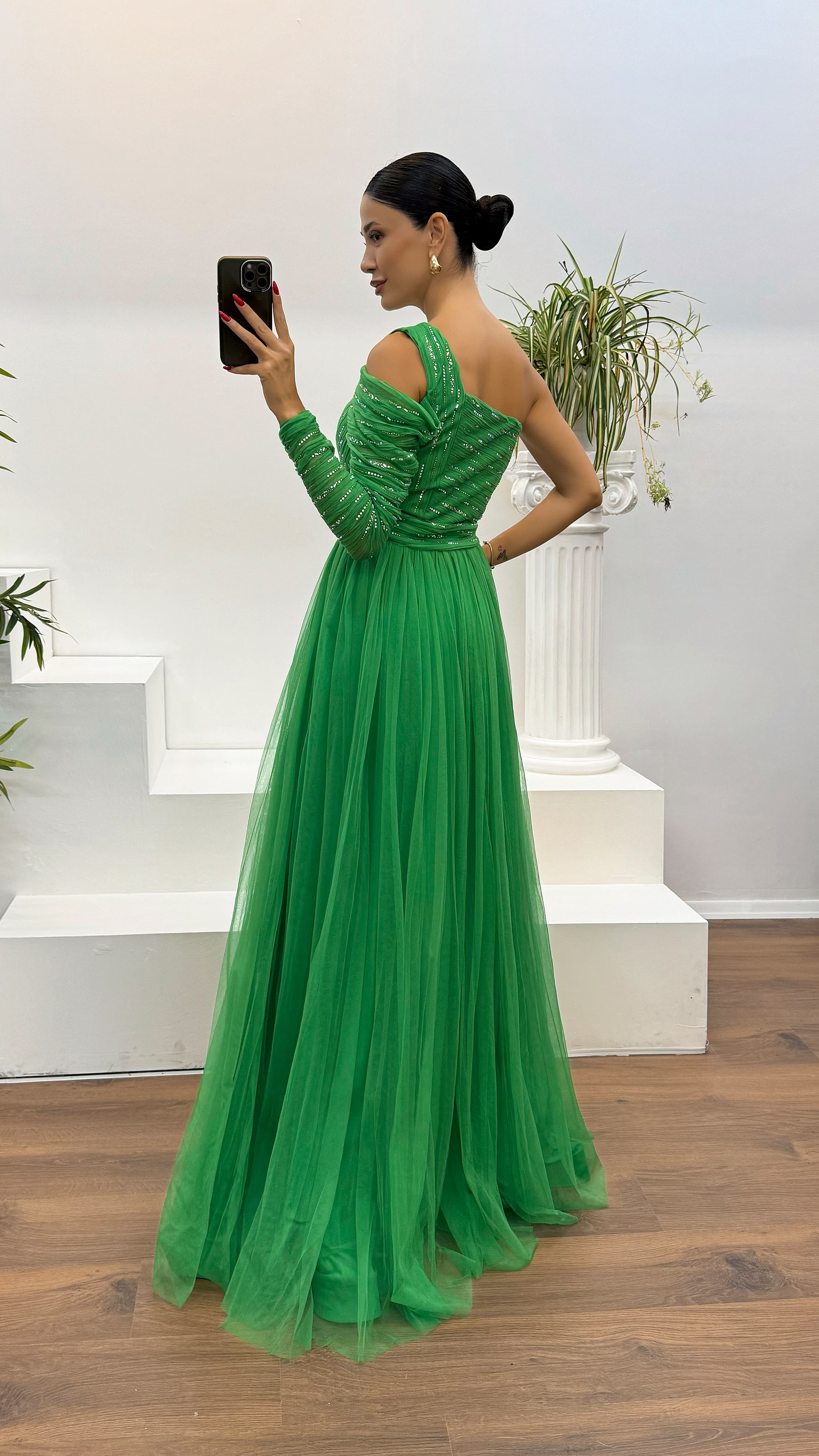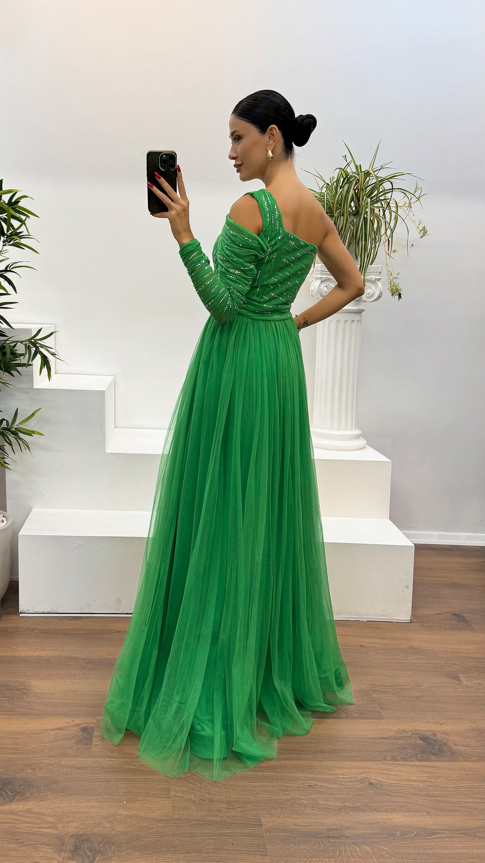 • Yeşil Tek Kol İşlemeli Tül Abiye Elbise