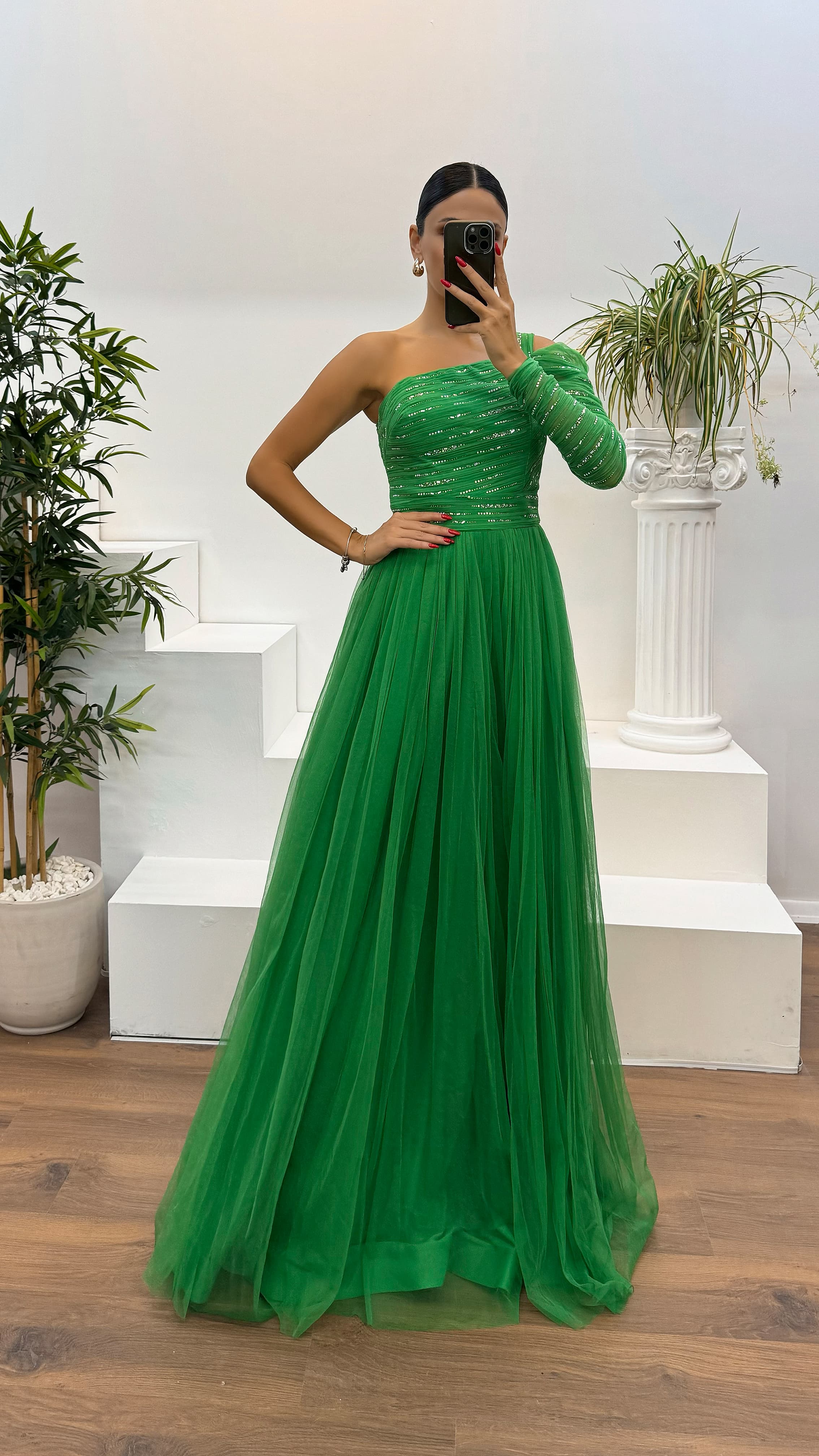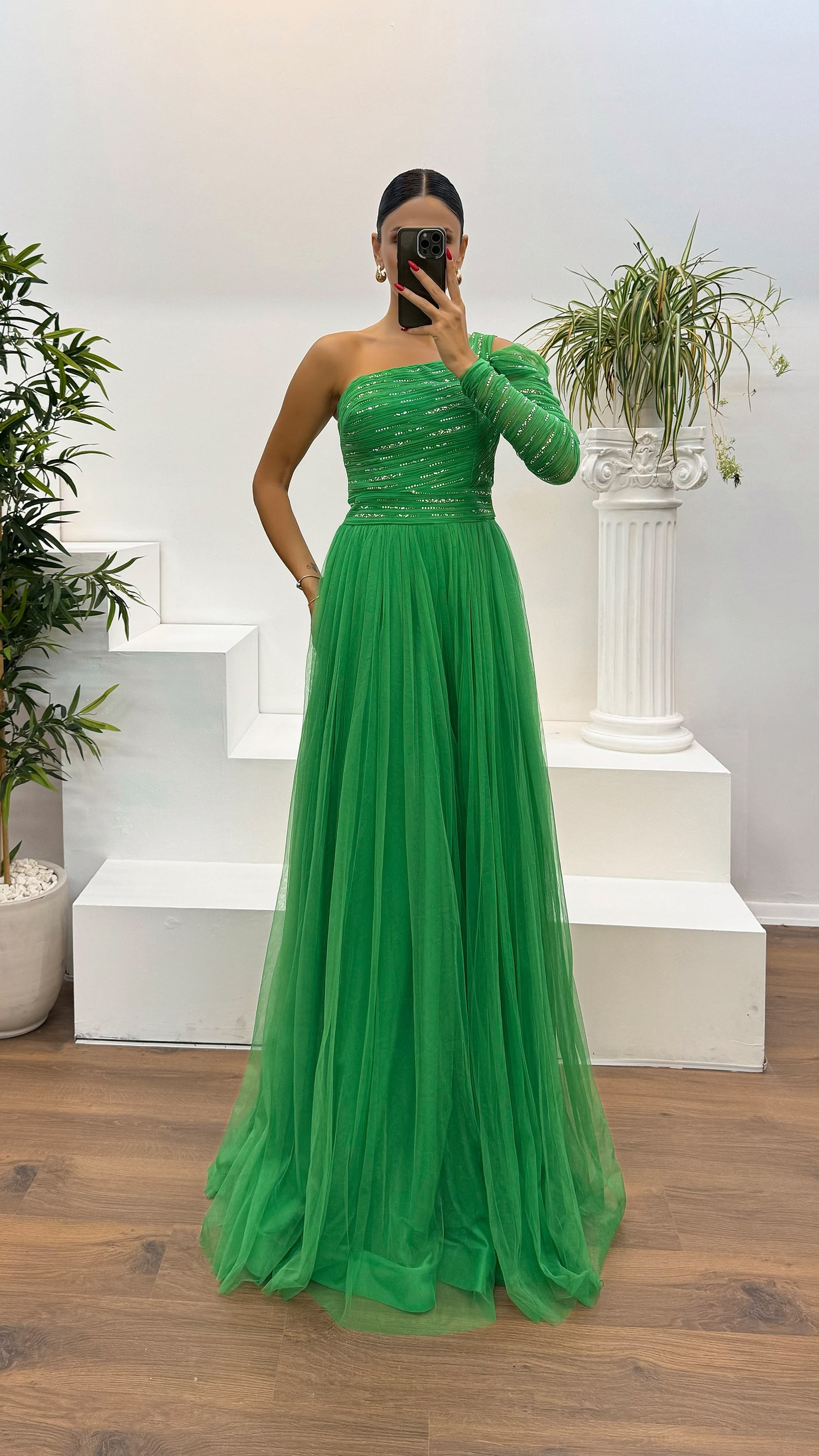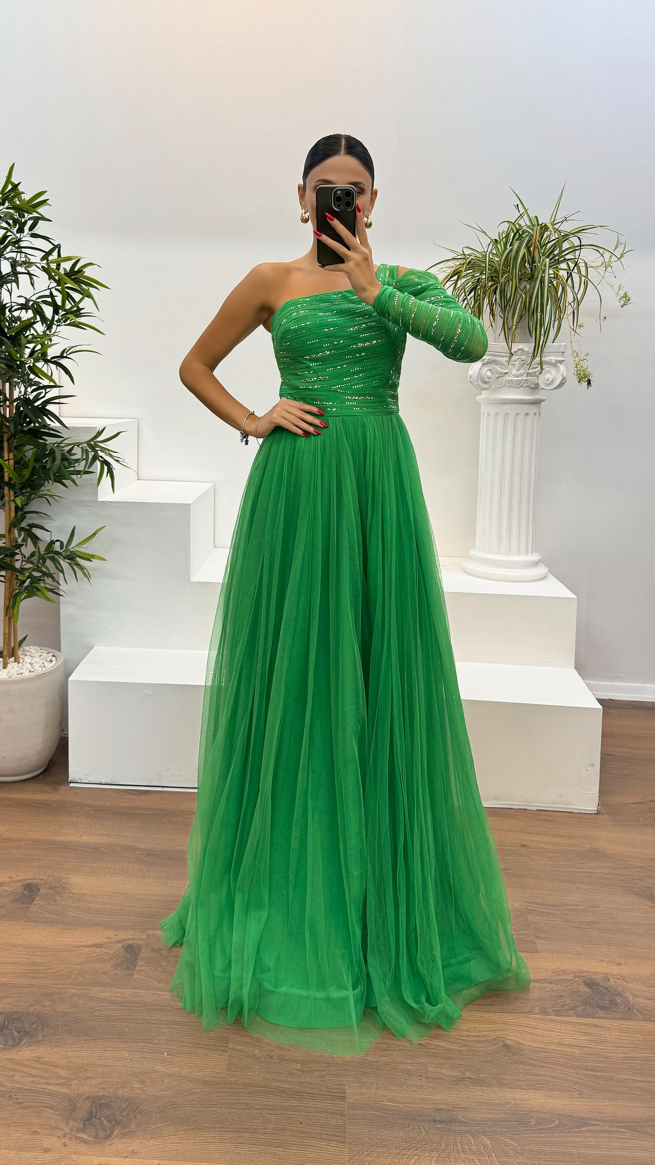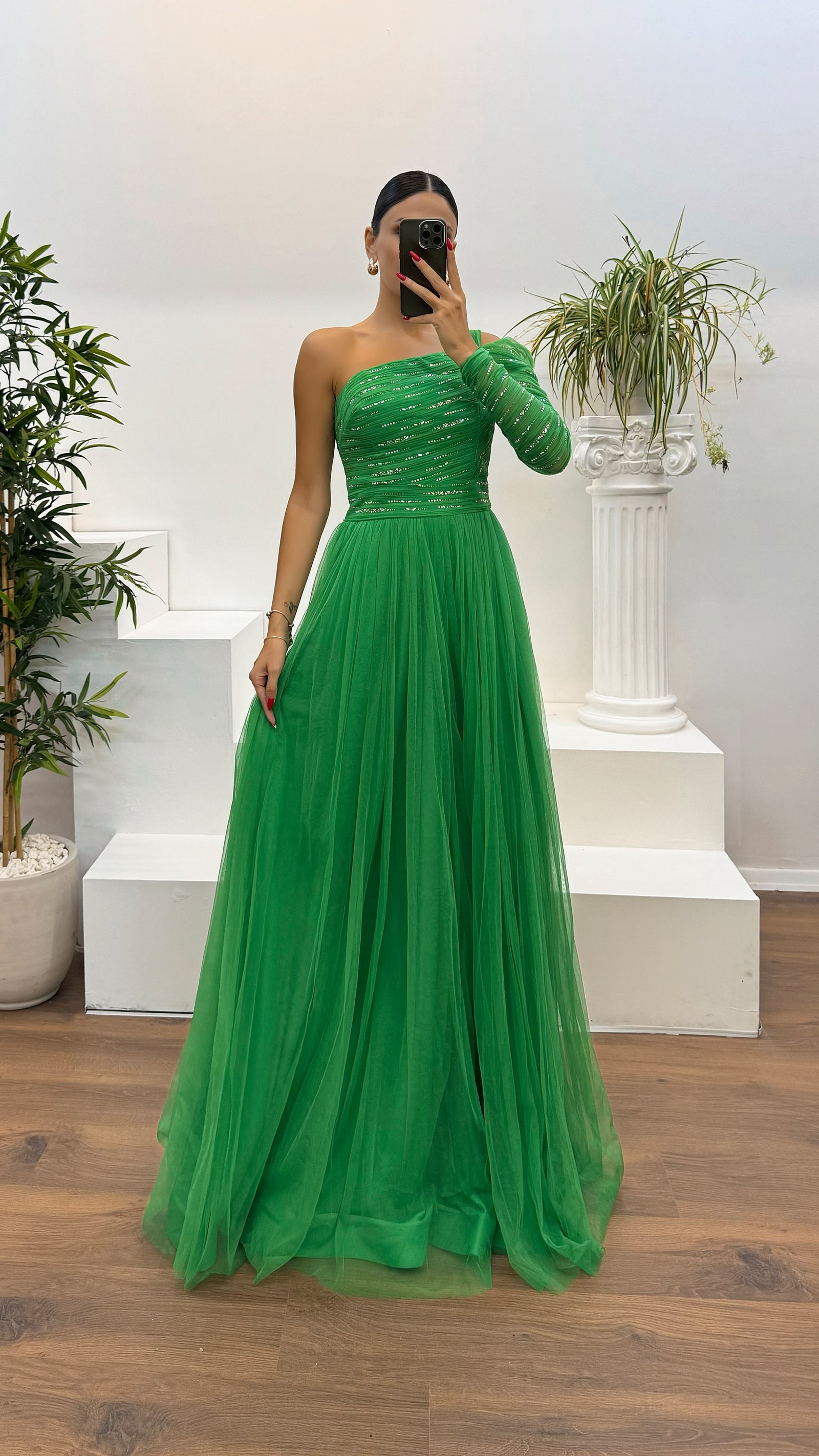 • Yeşil Tek Kol İşlemeli Tül Abiye Elbise