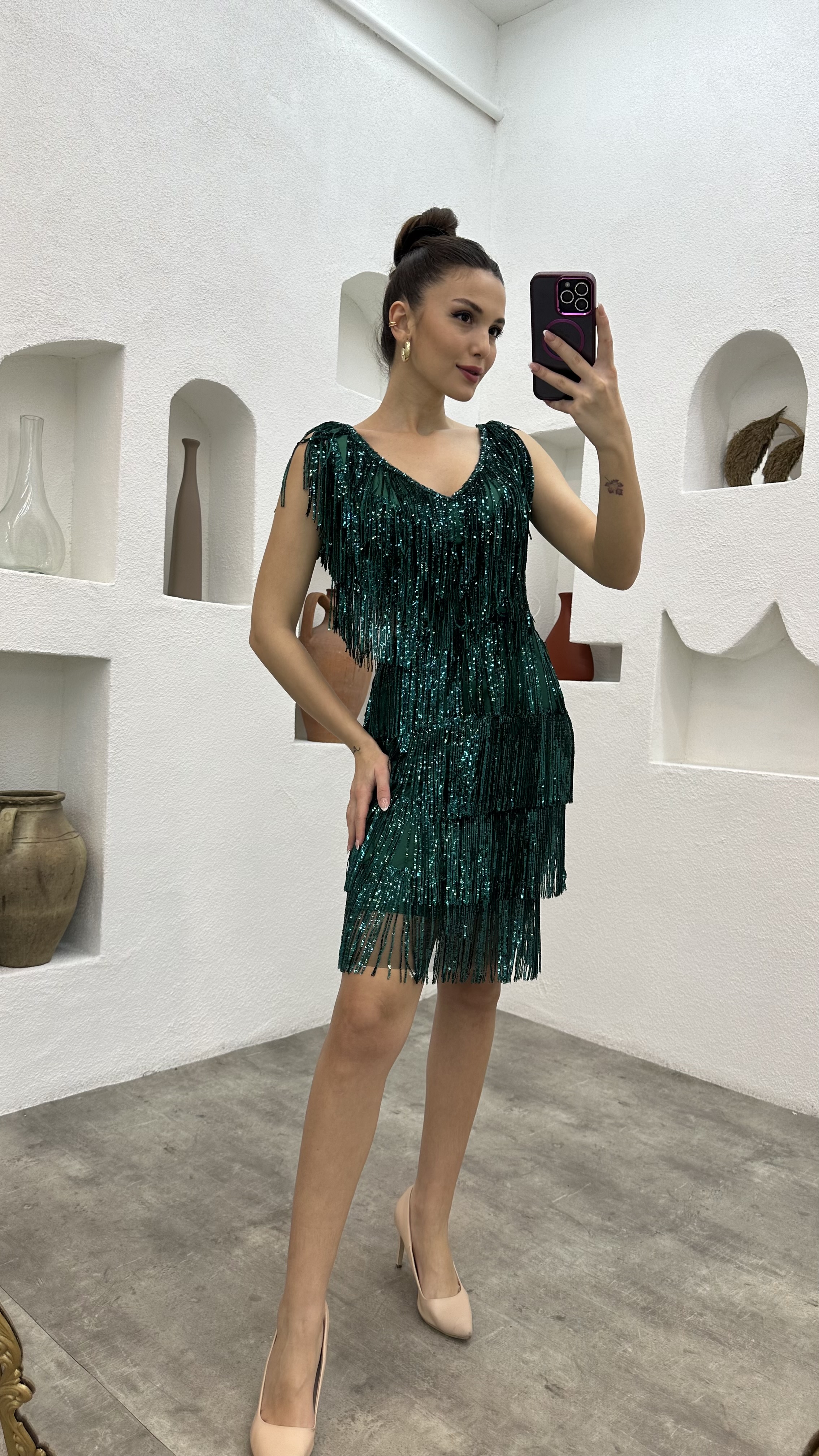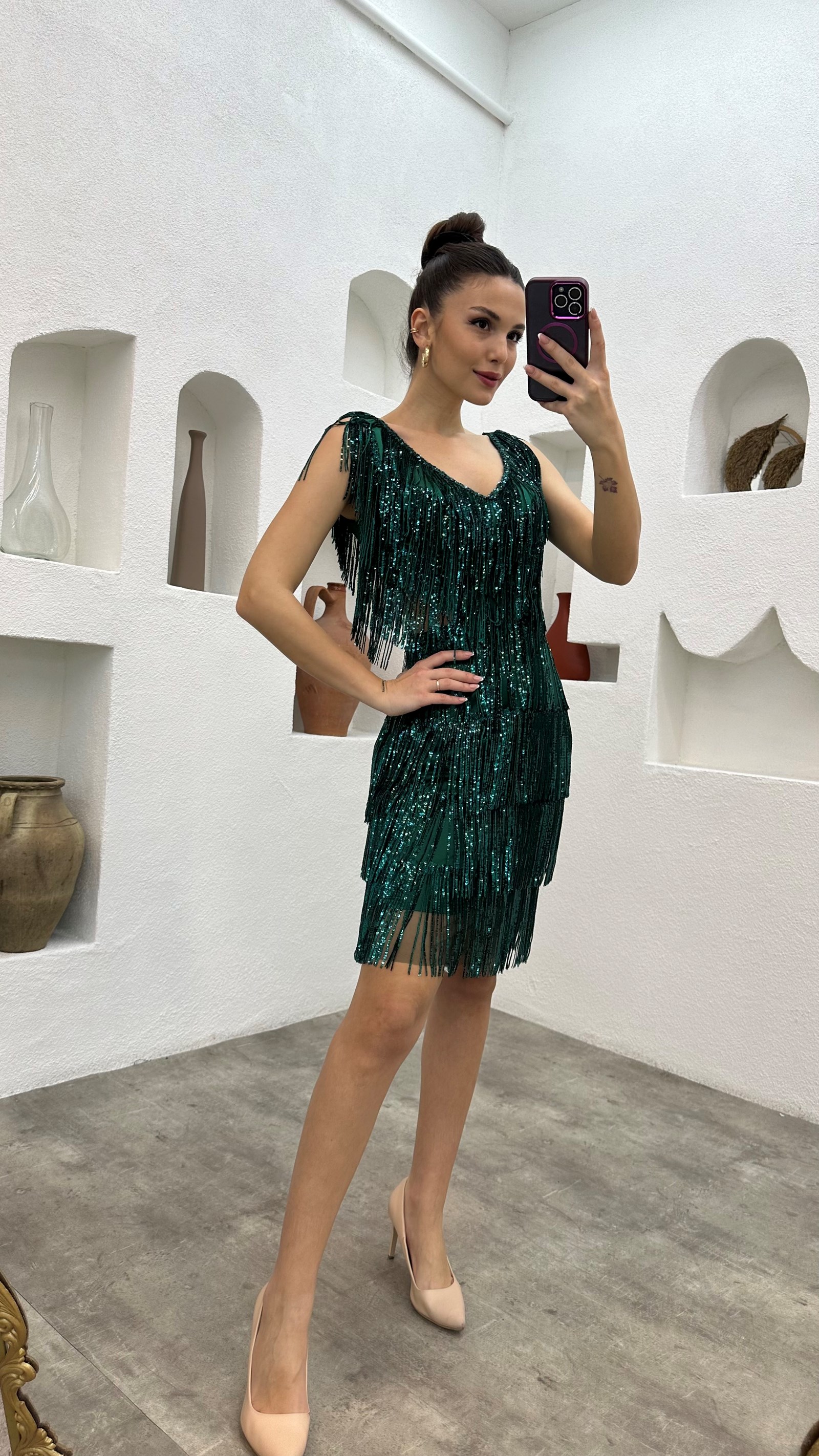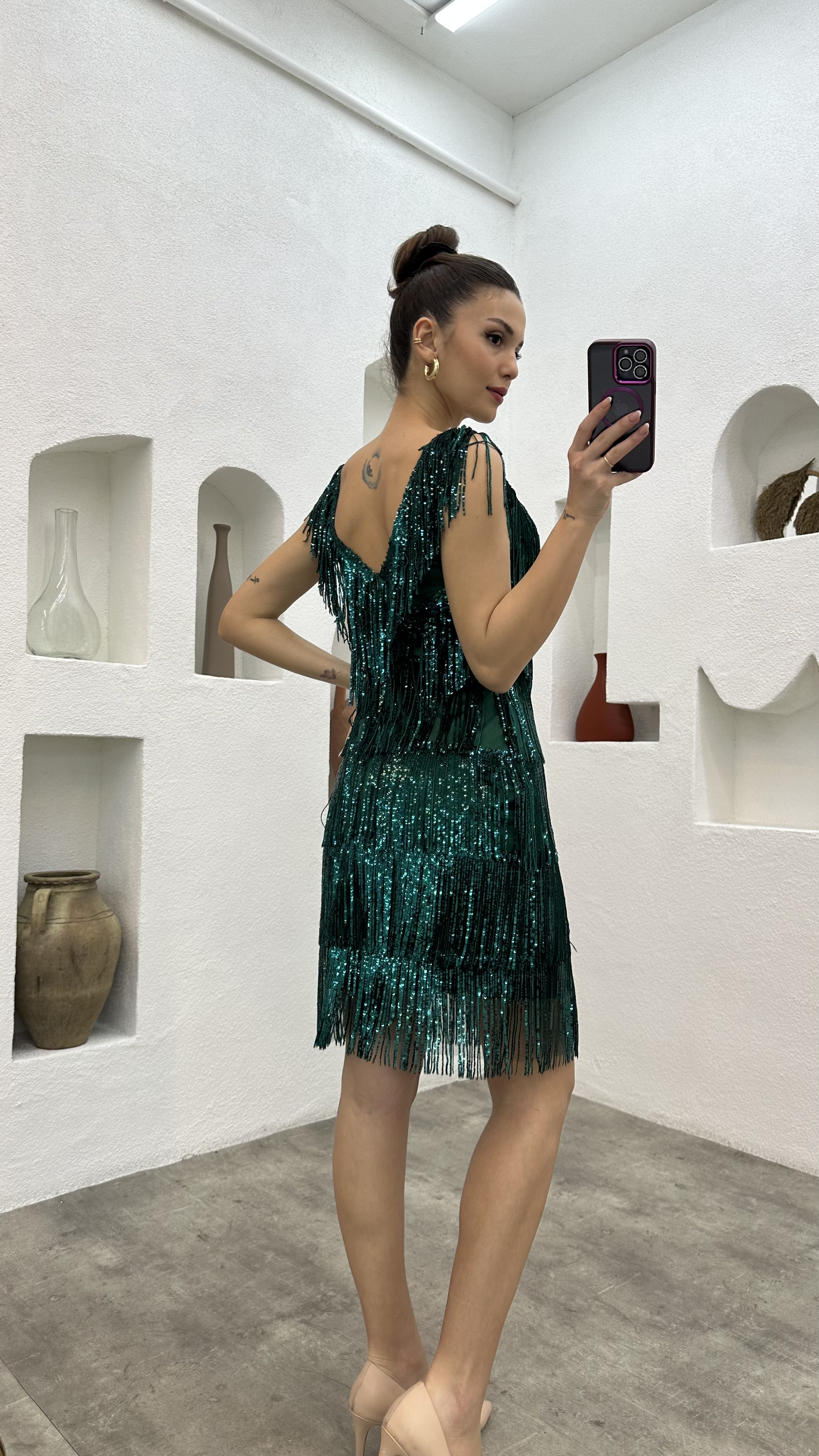 • Zümrüt Bel Detay Saçaklı Abiye Elbise