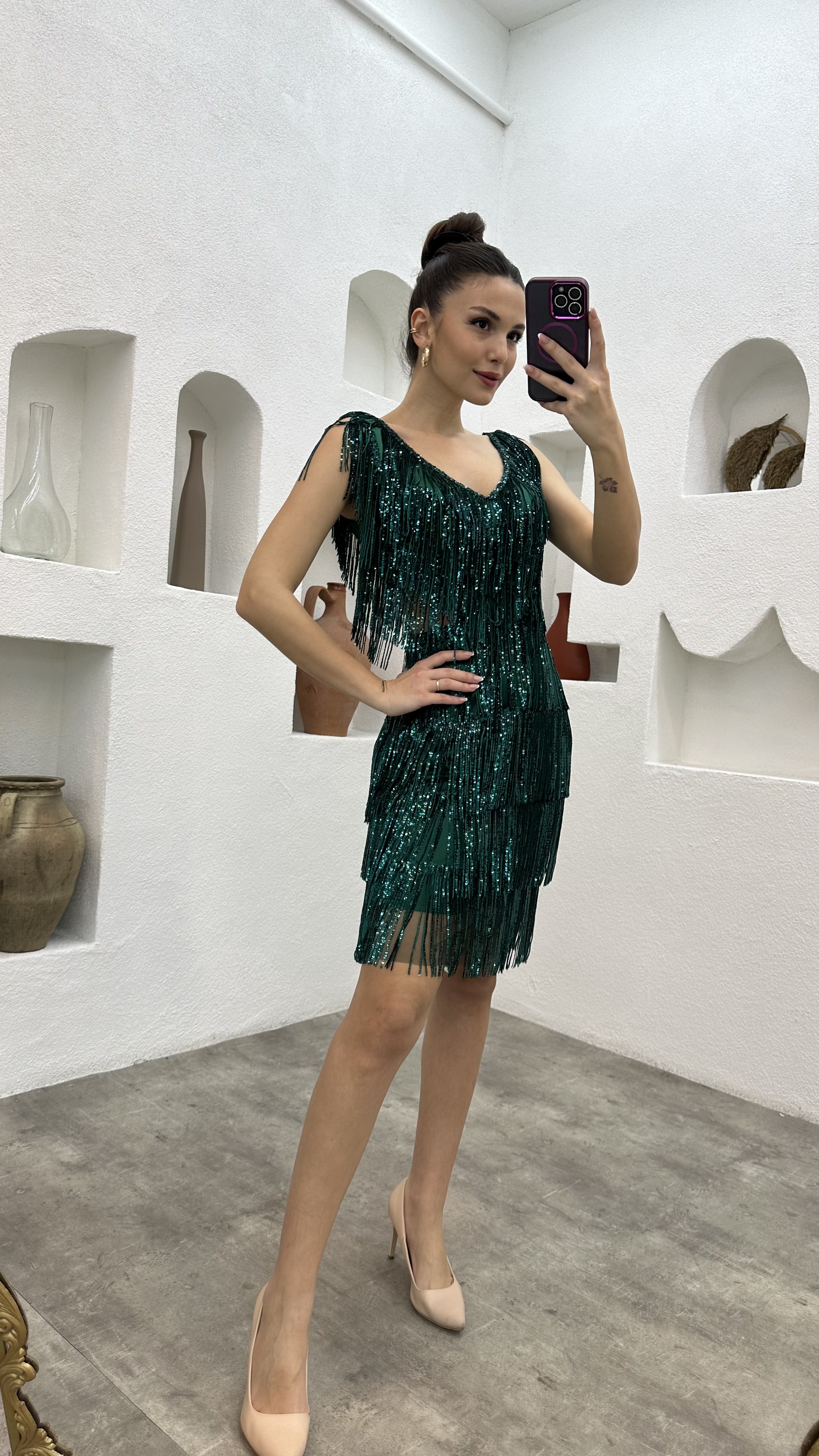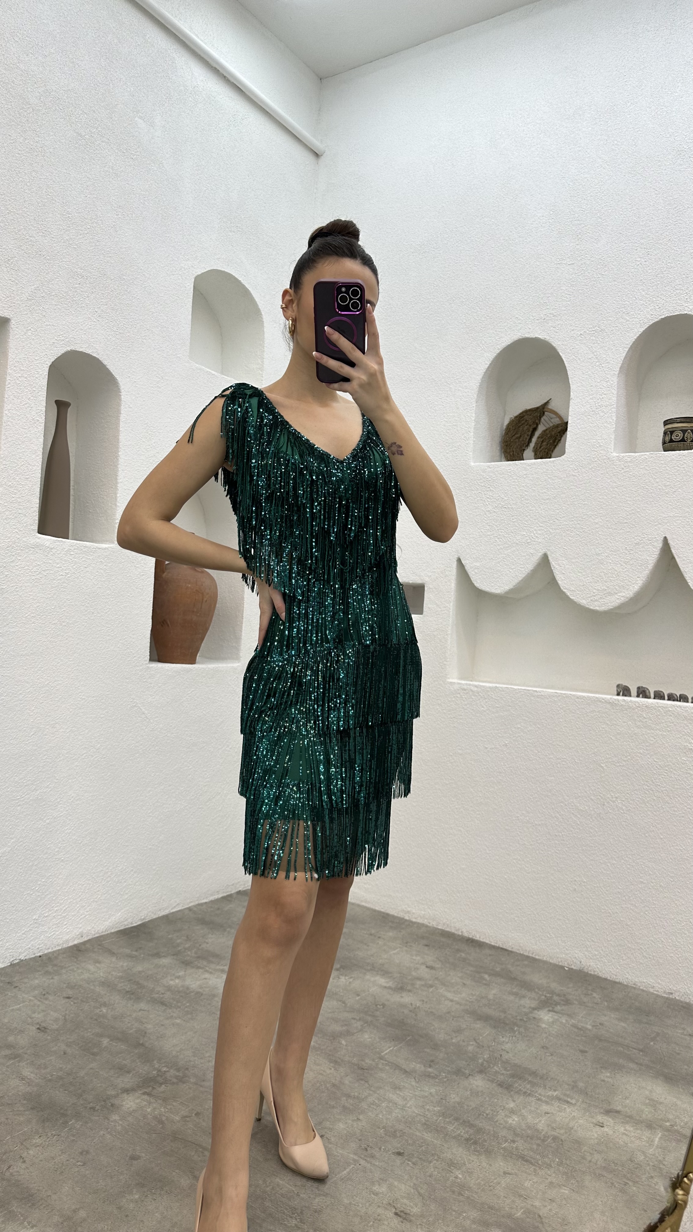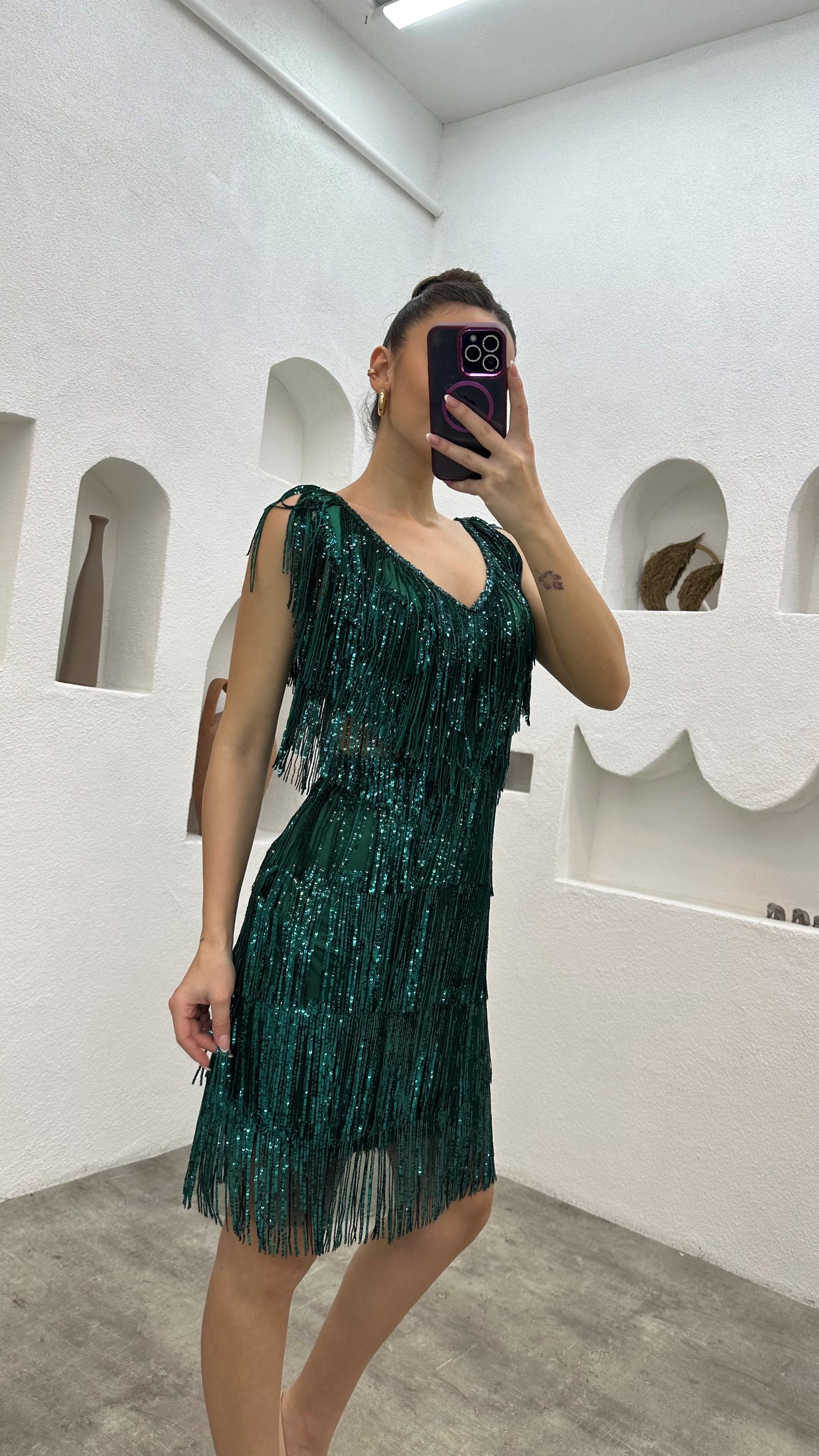 • Zümrüt Bel Detay Saçaklı Abiye Elbise