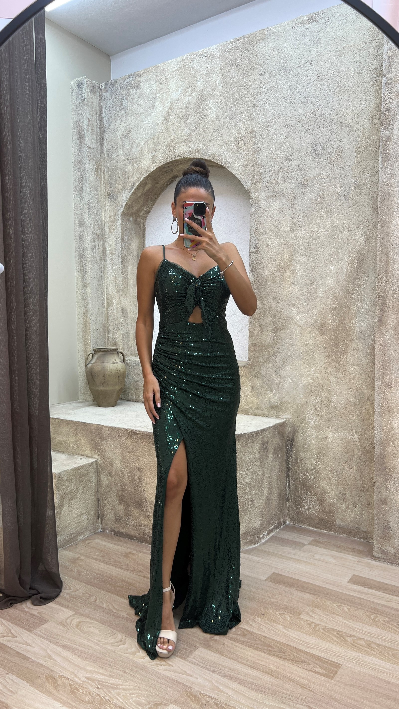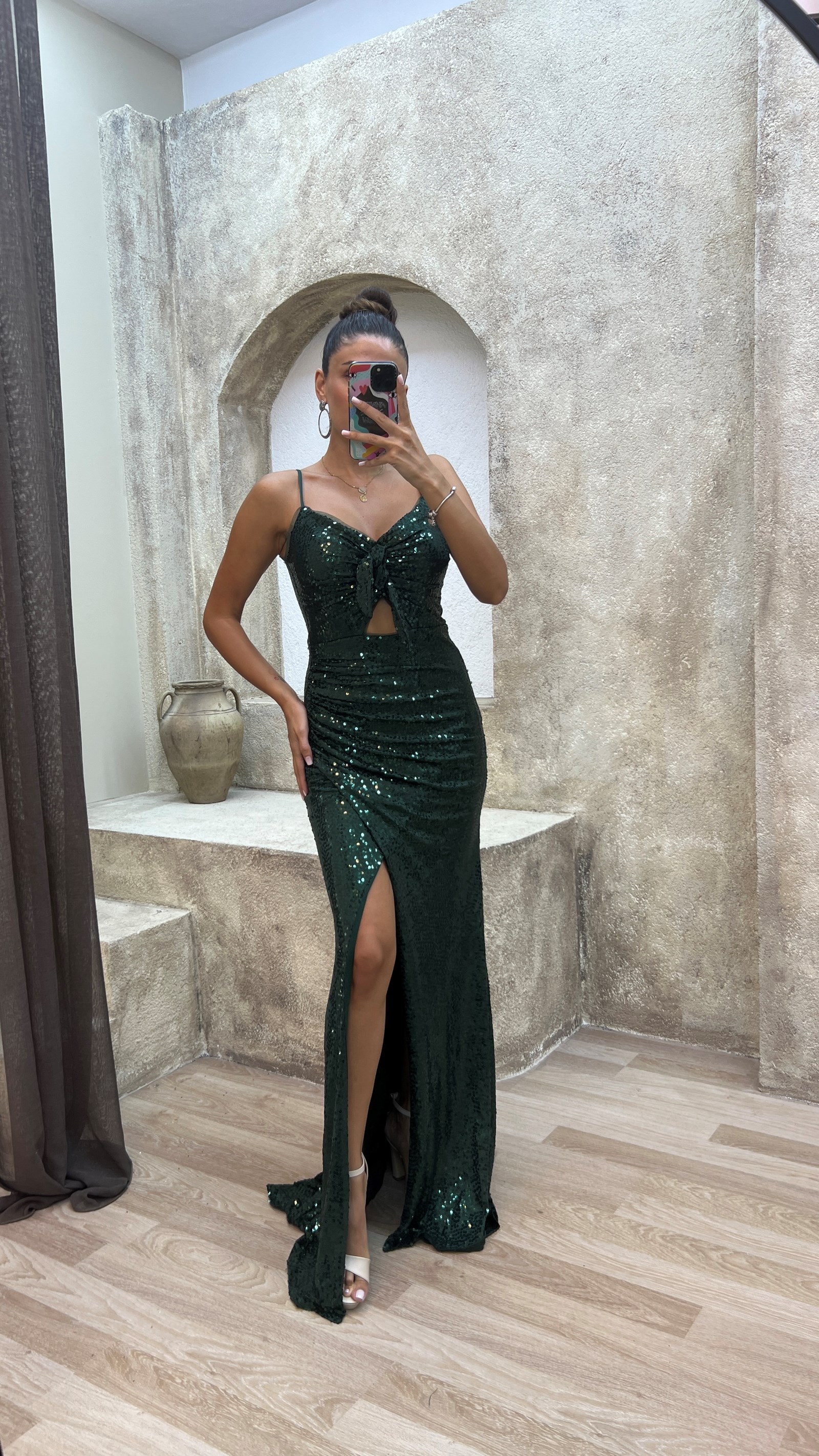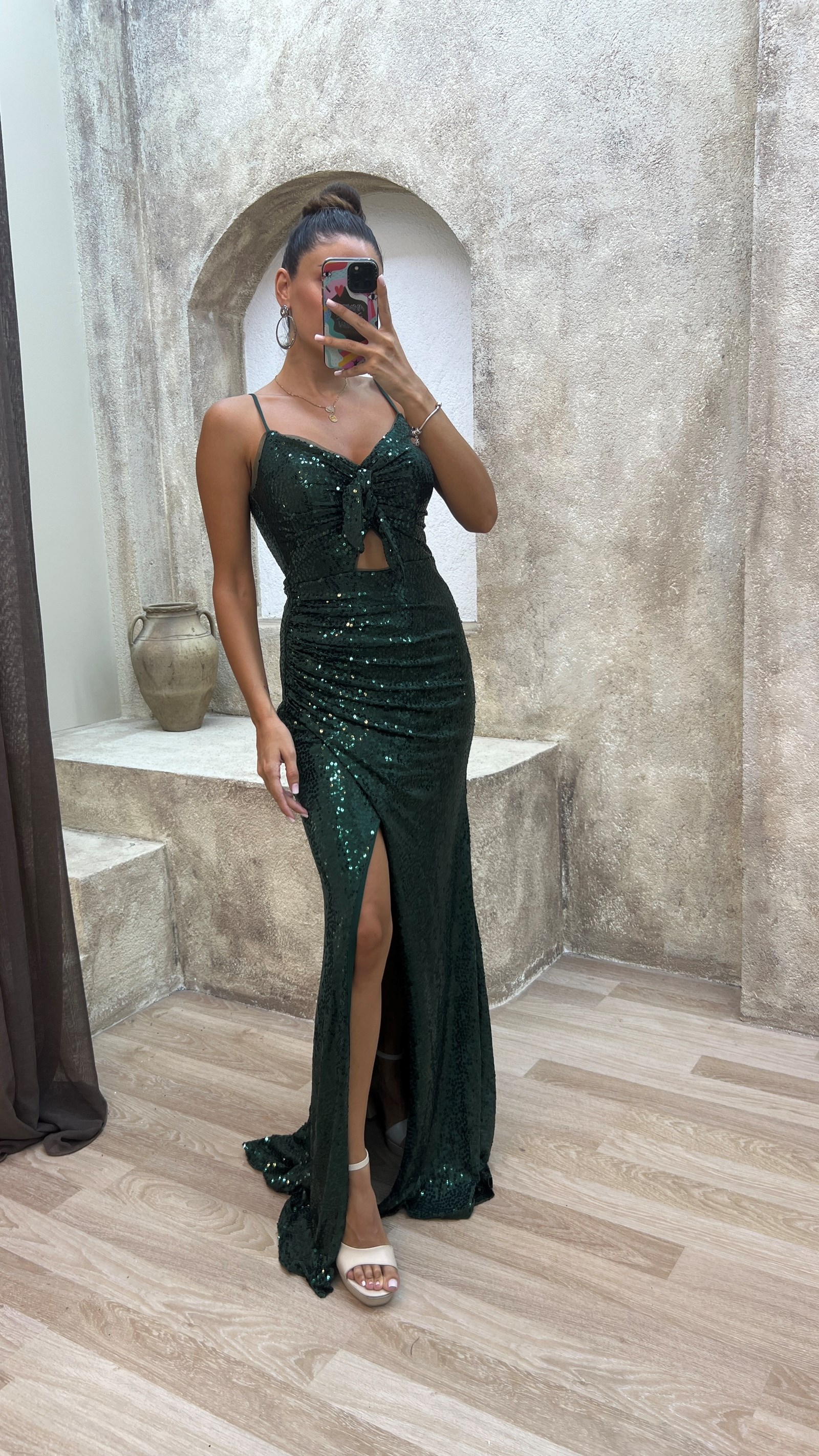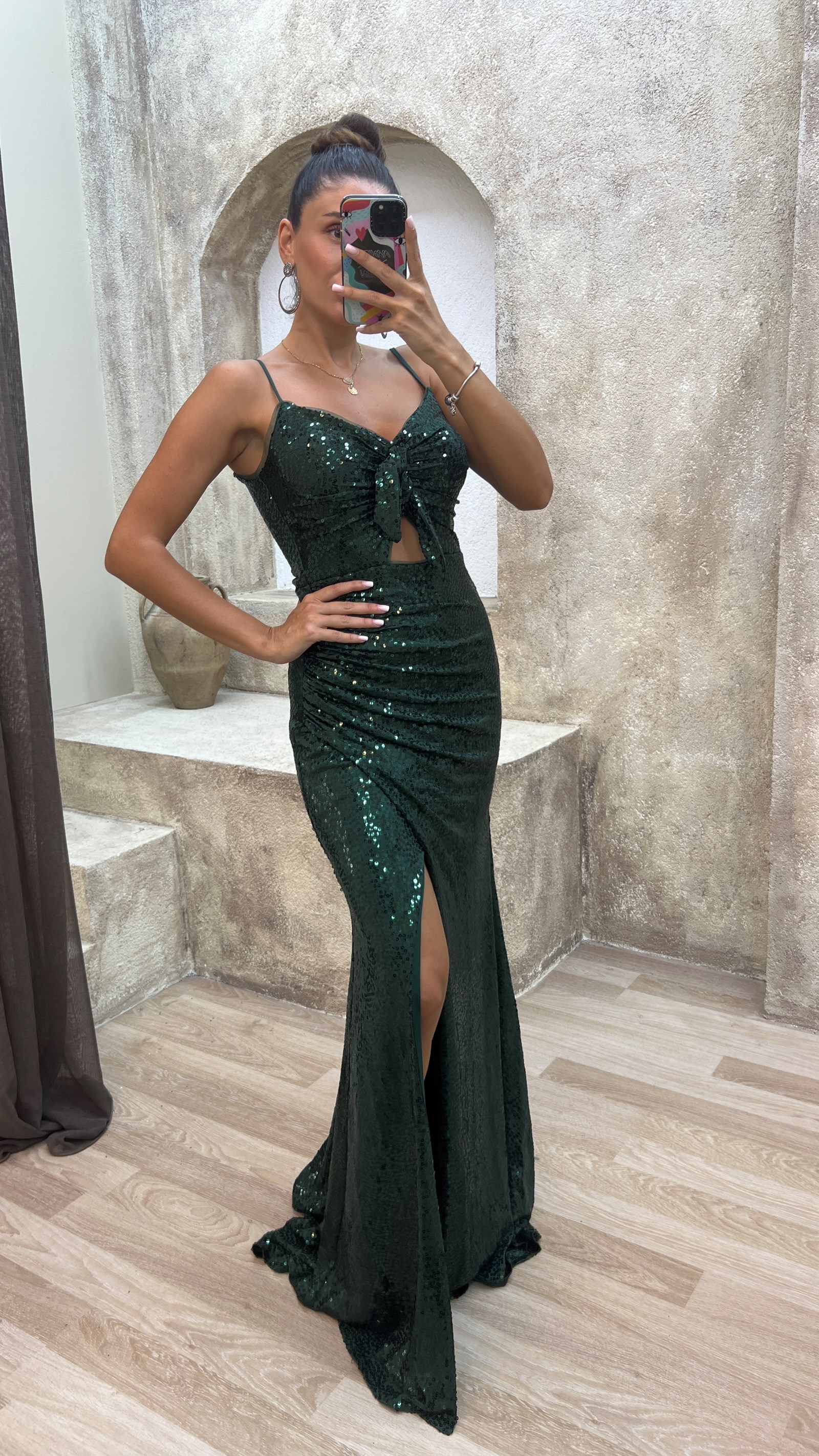 • Zümrüt İp Askılı Göğsü Fiyonk Payet Elbise