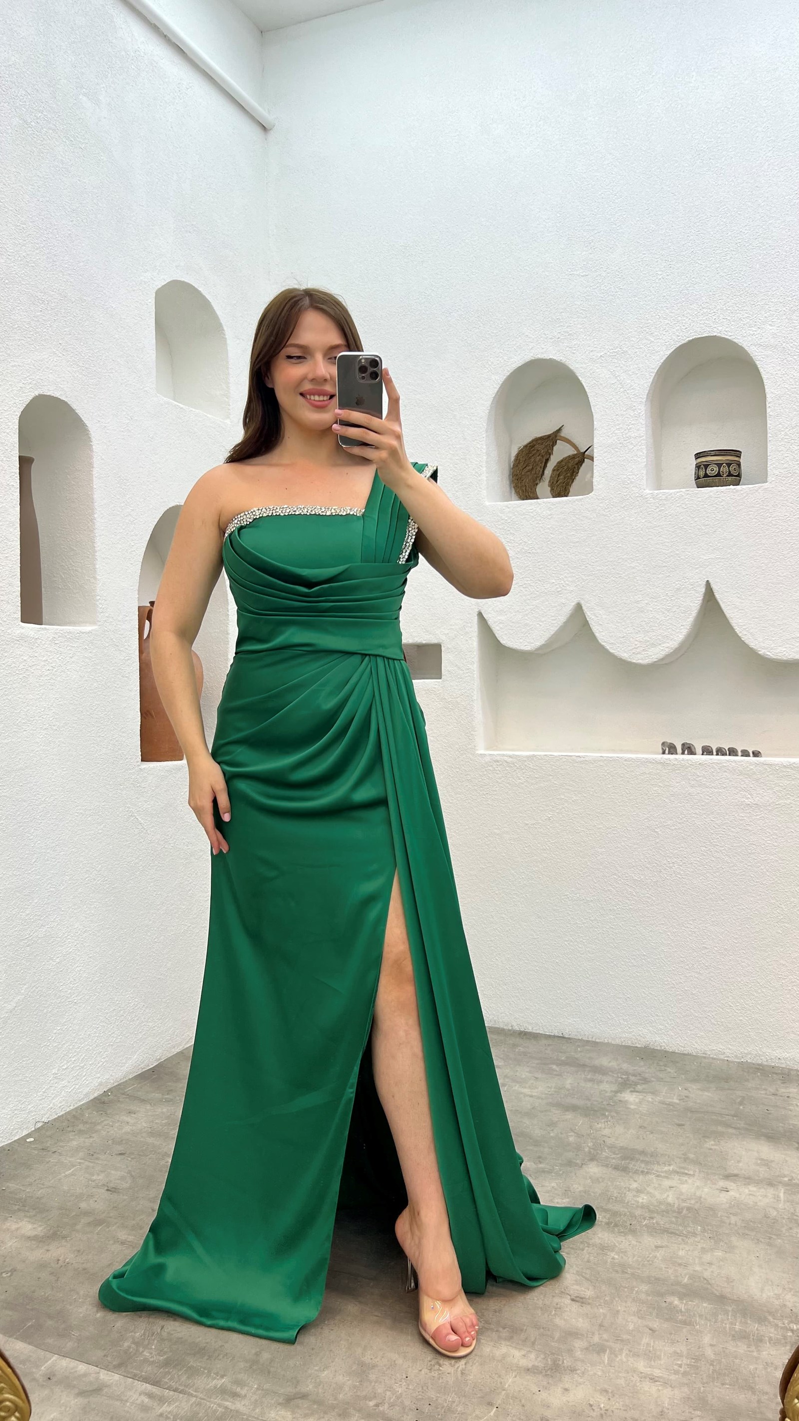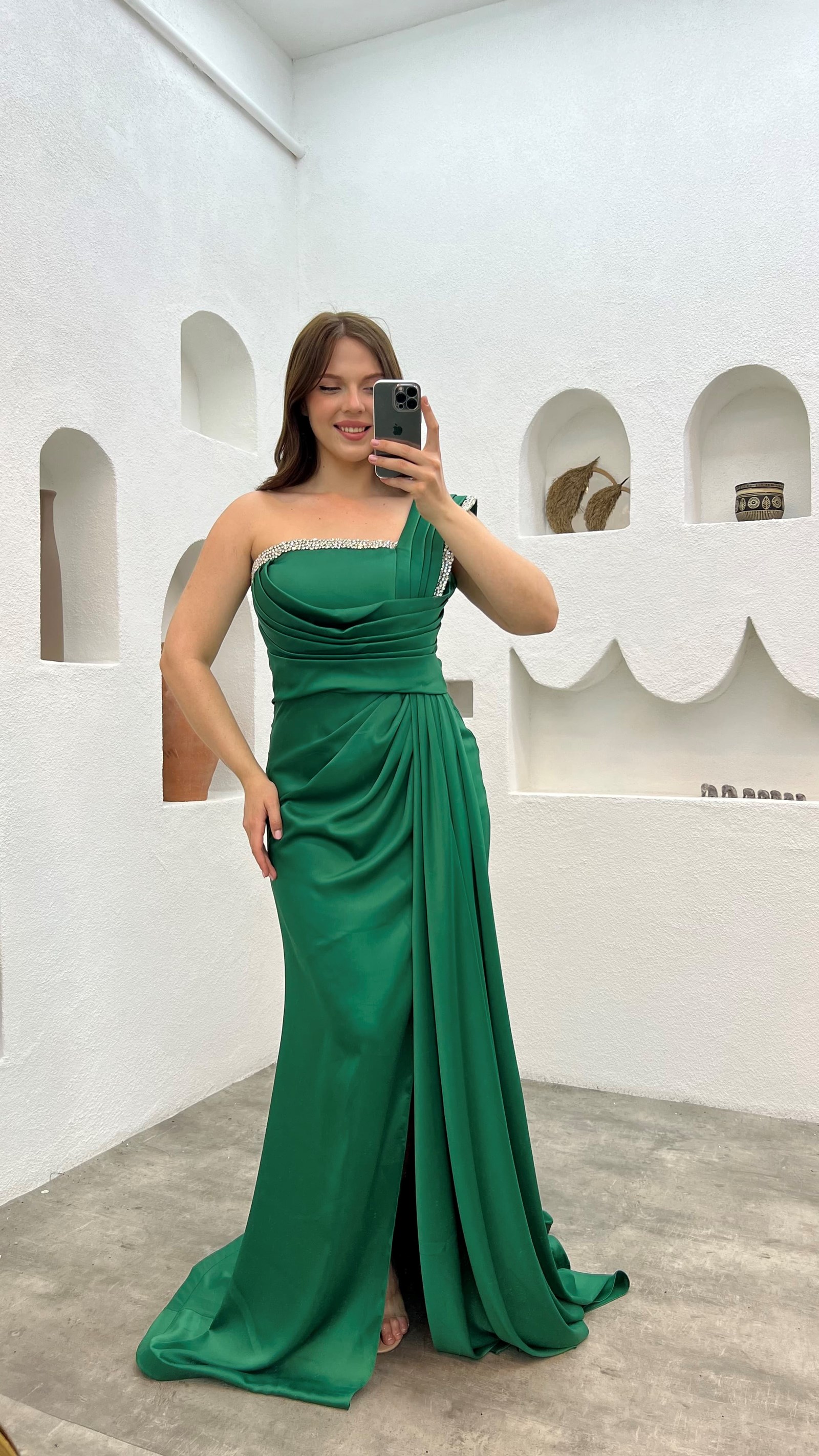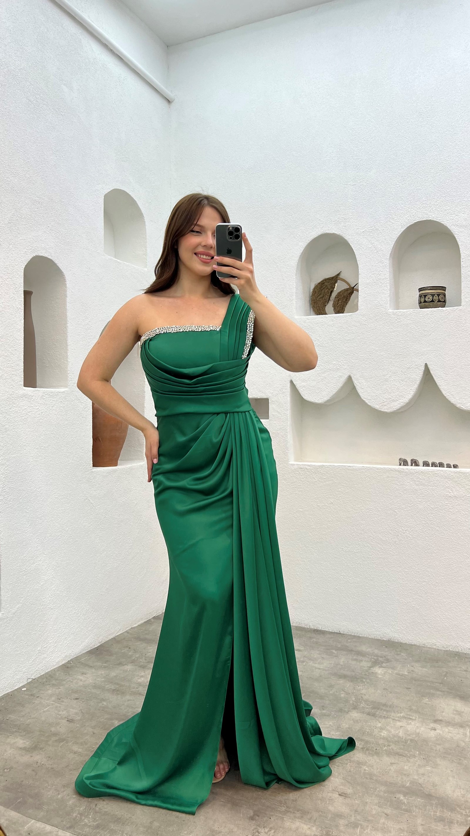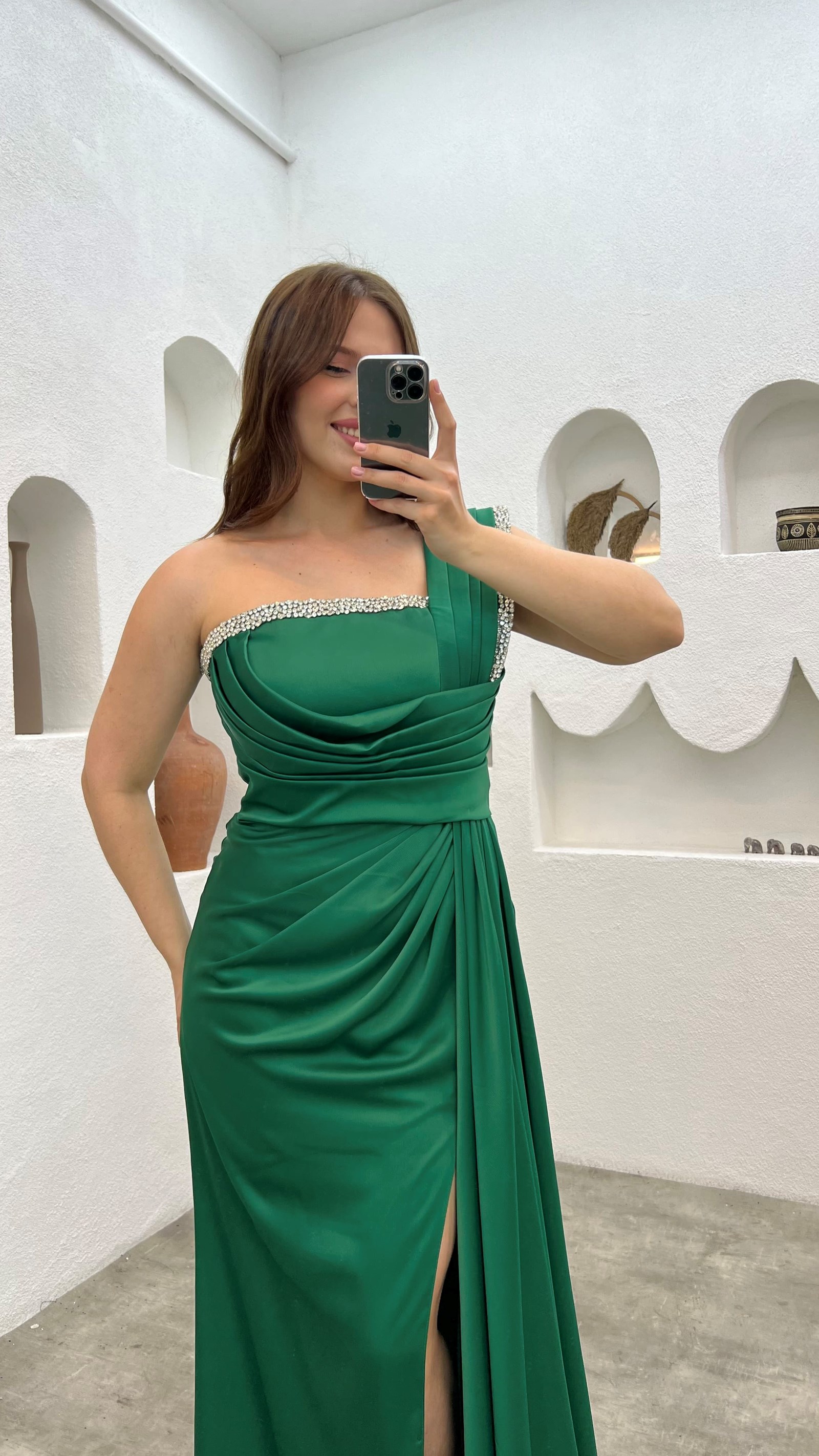 • Zümrüt Omzu Ve Beli İşlemeli Pliseli Büyük Beden Abiye Elbise