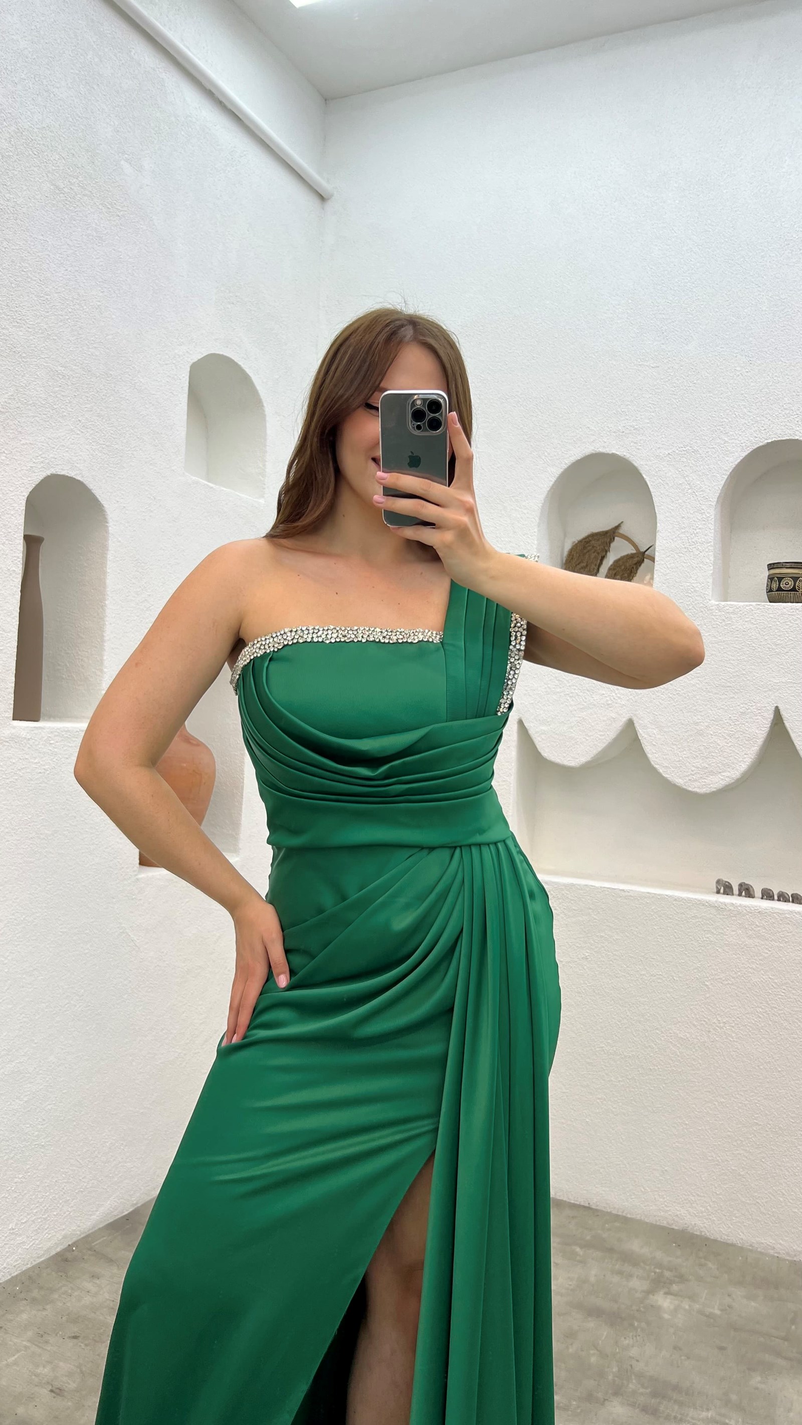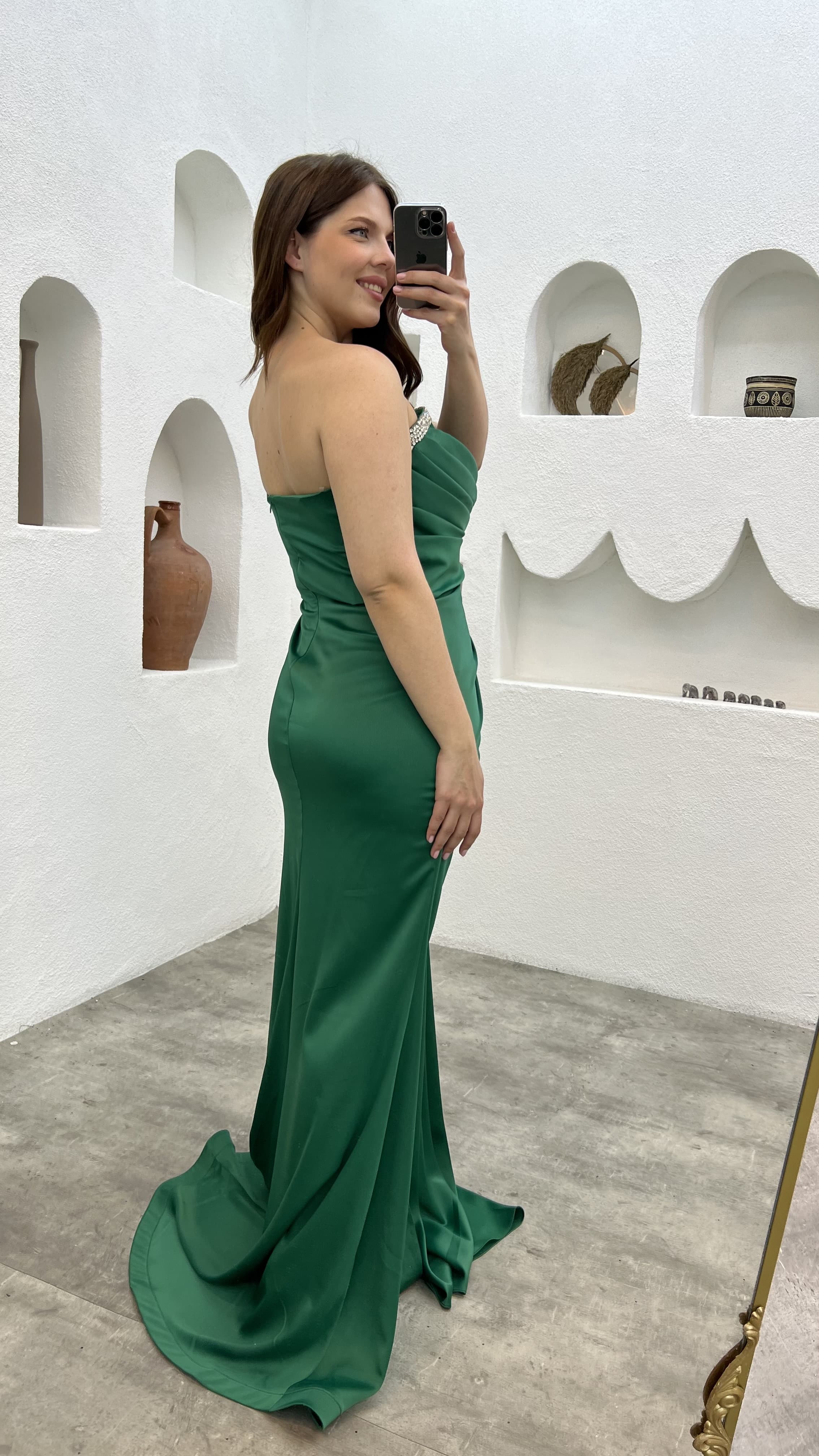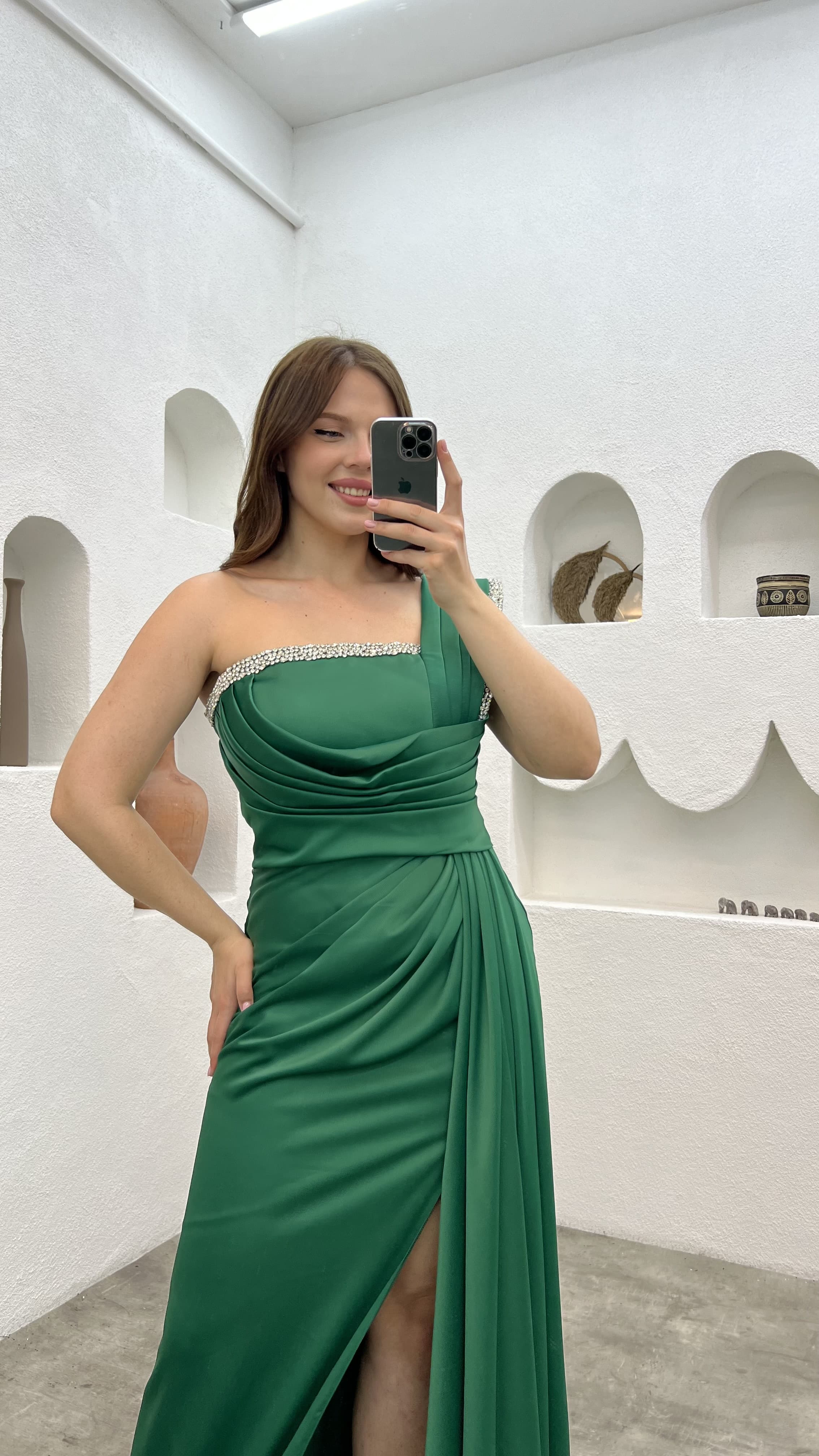 • Zümrüt Omzu Ve Beli İşlemeli Pliseli Büyük Beden Abiye Elbise