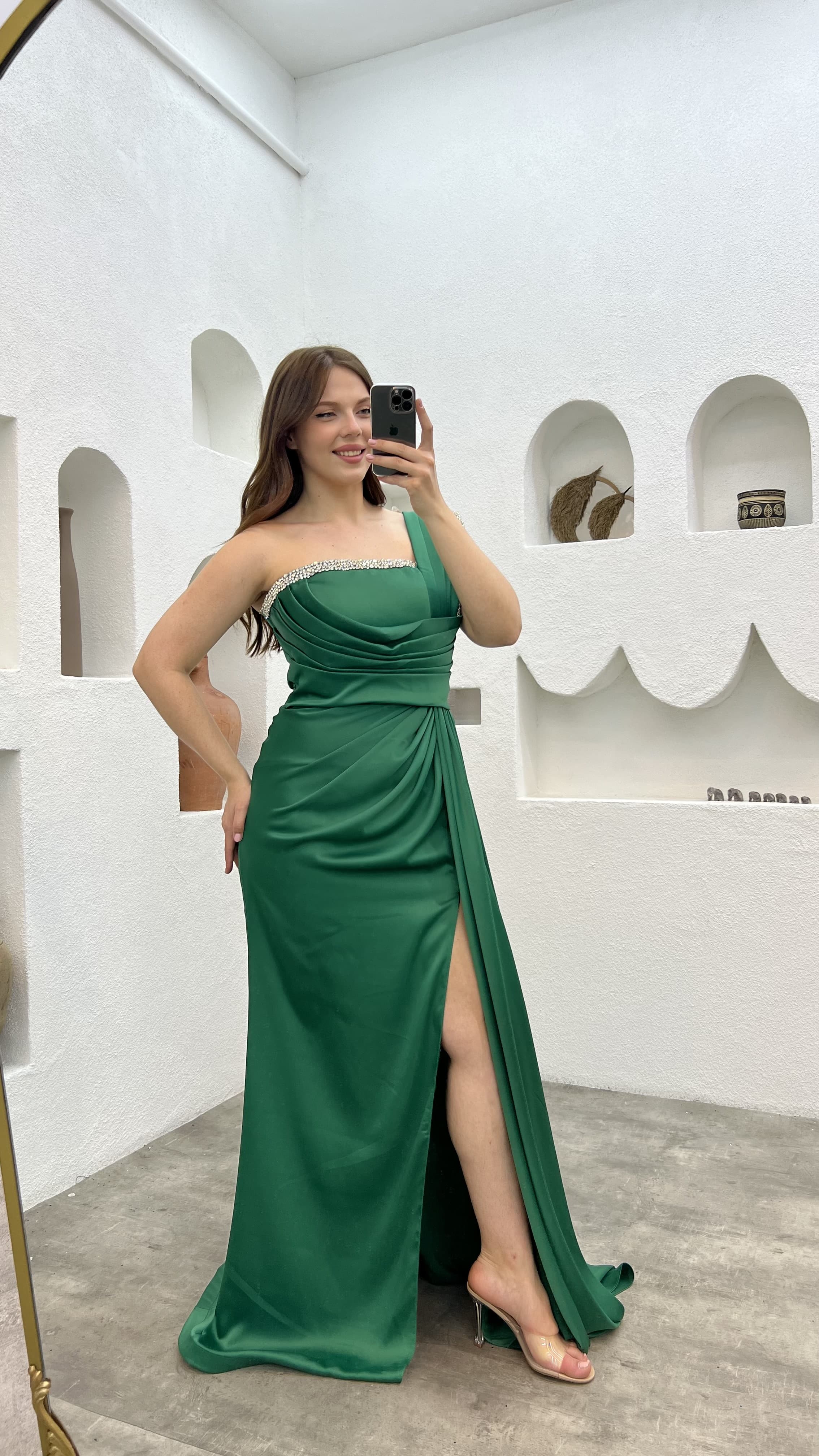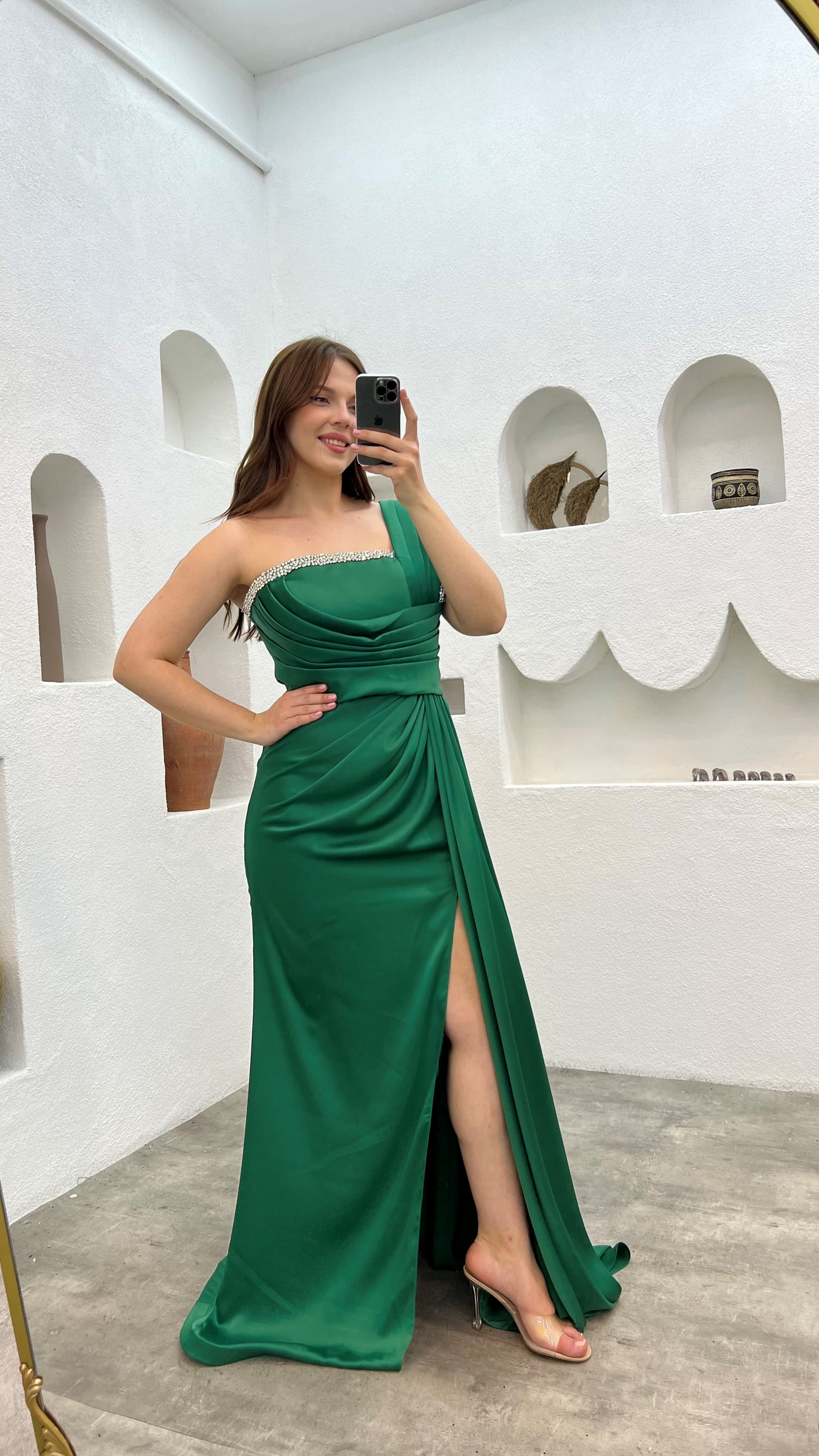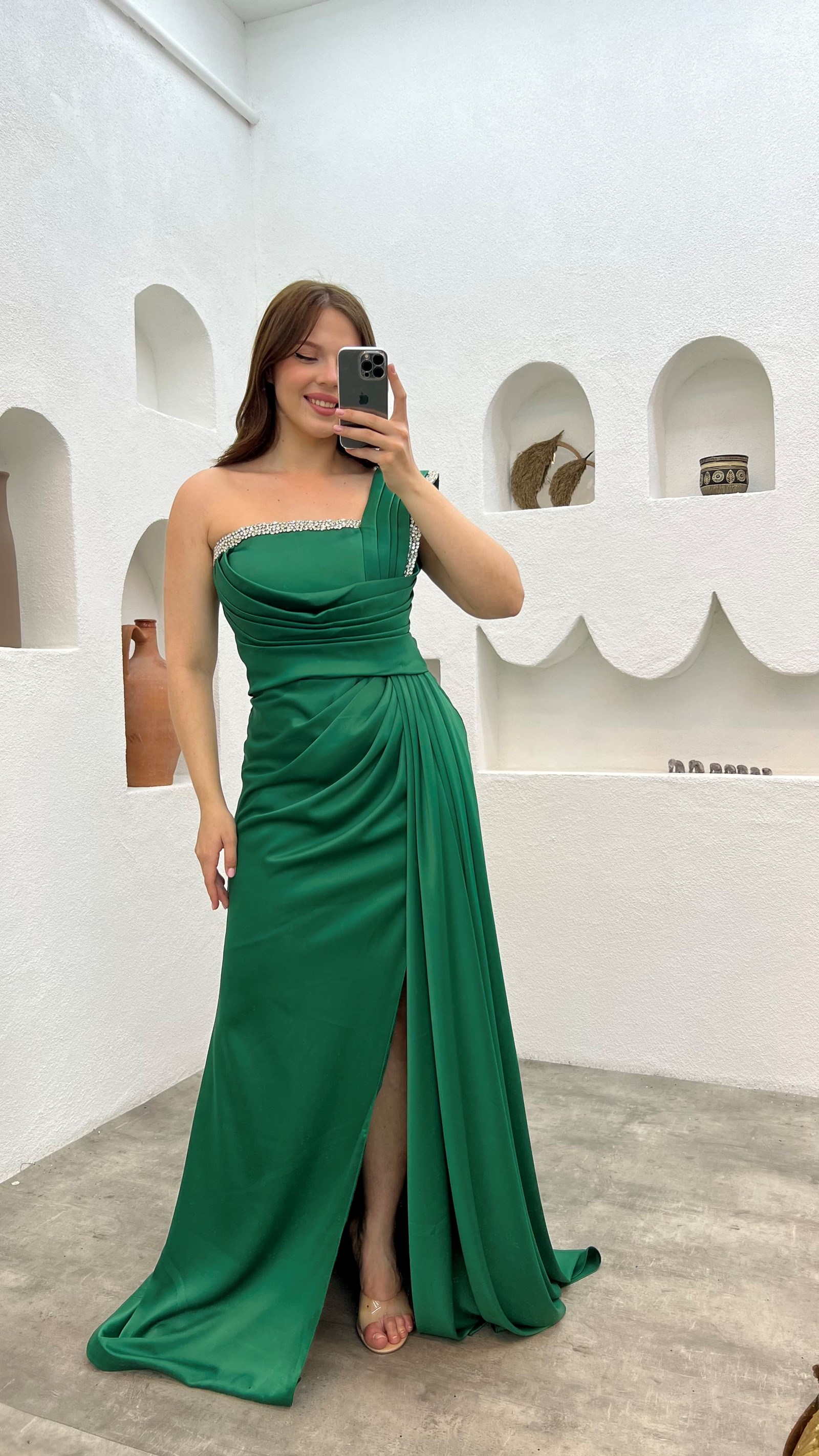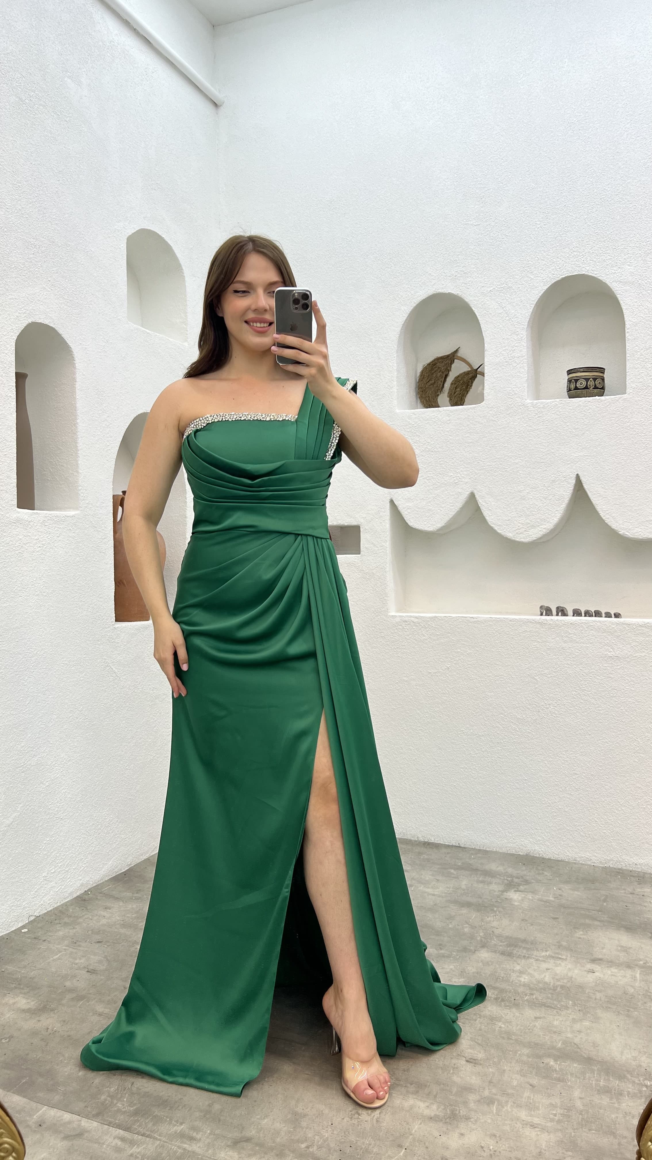 • Zümrüt Omzu Ve Beli İşlemeli Pliseli Büyük Beden Abiye Elbise