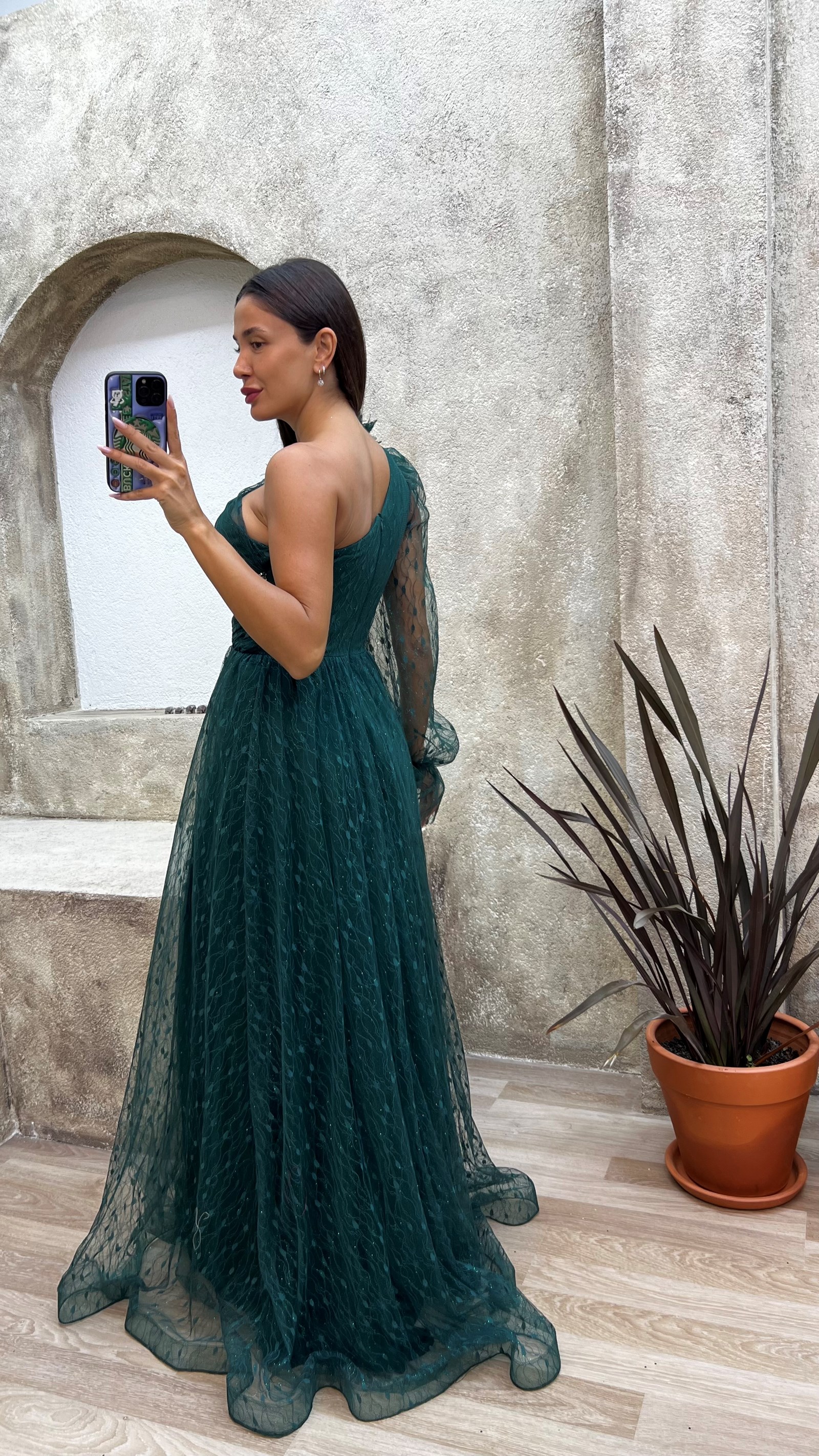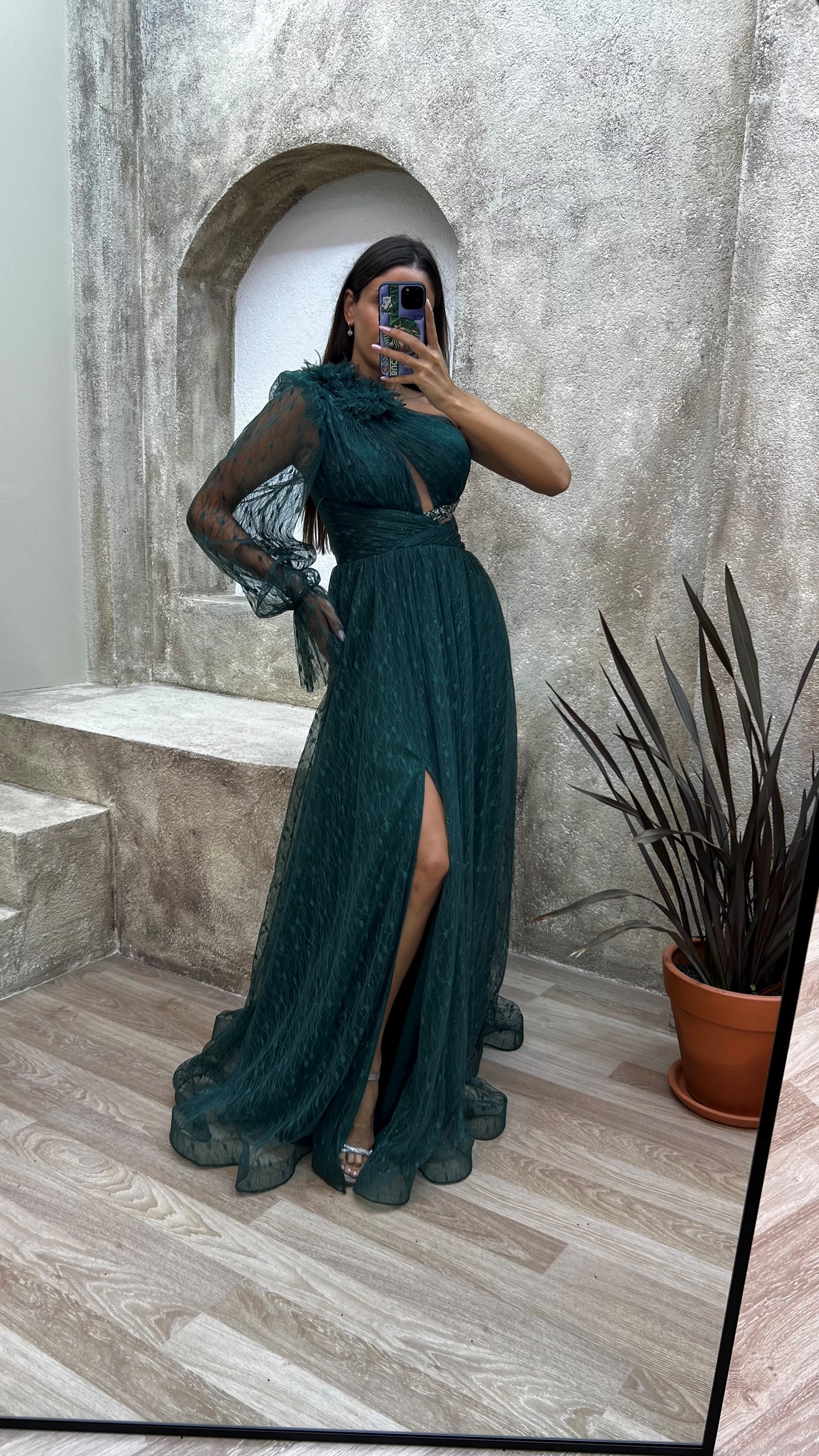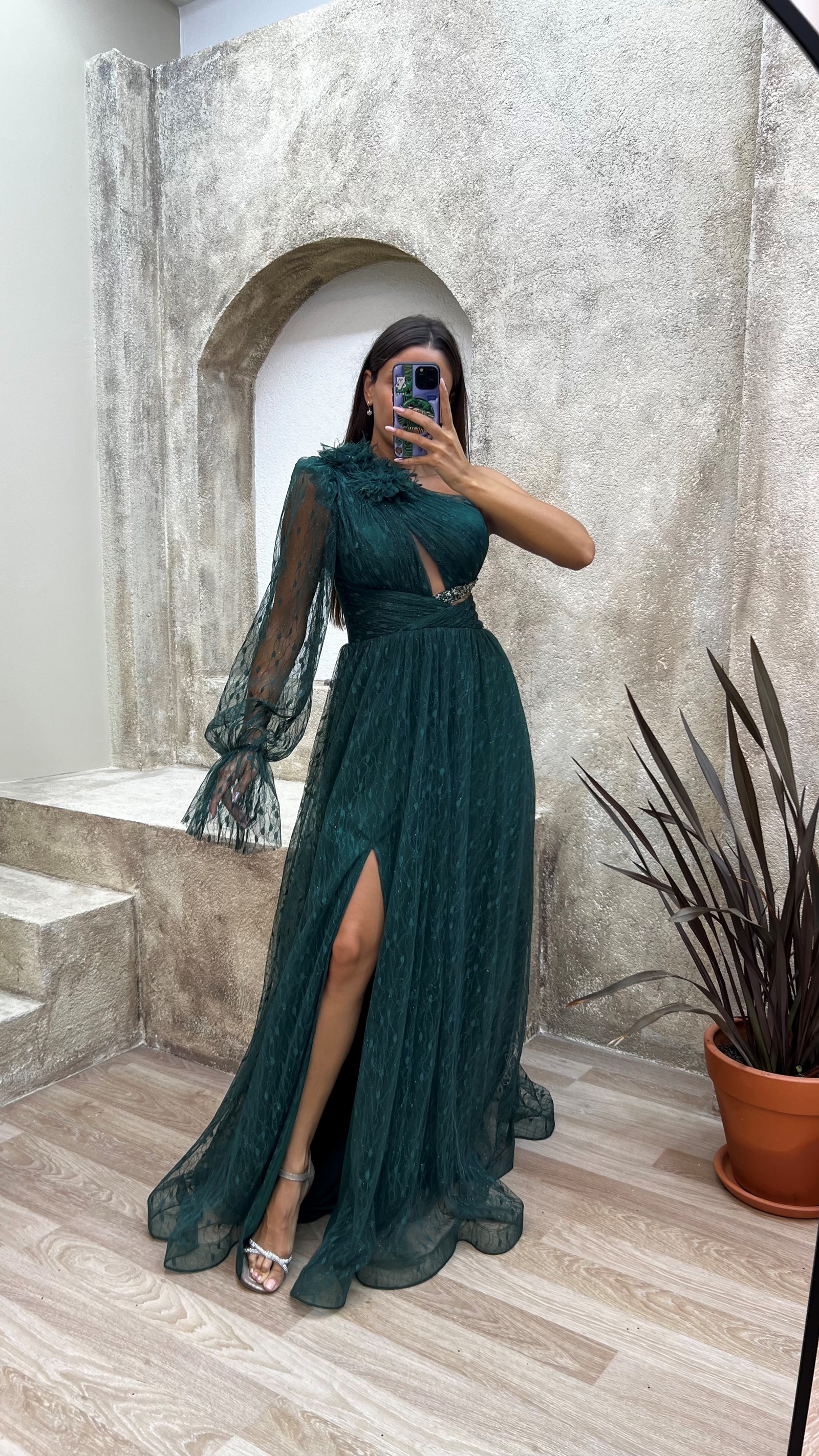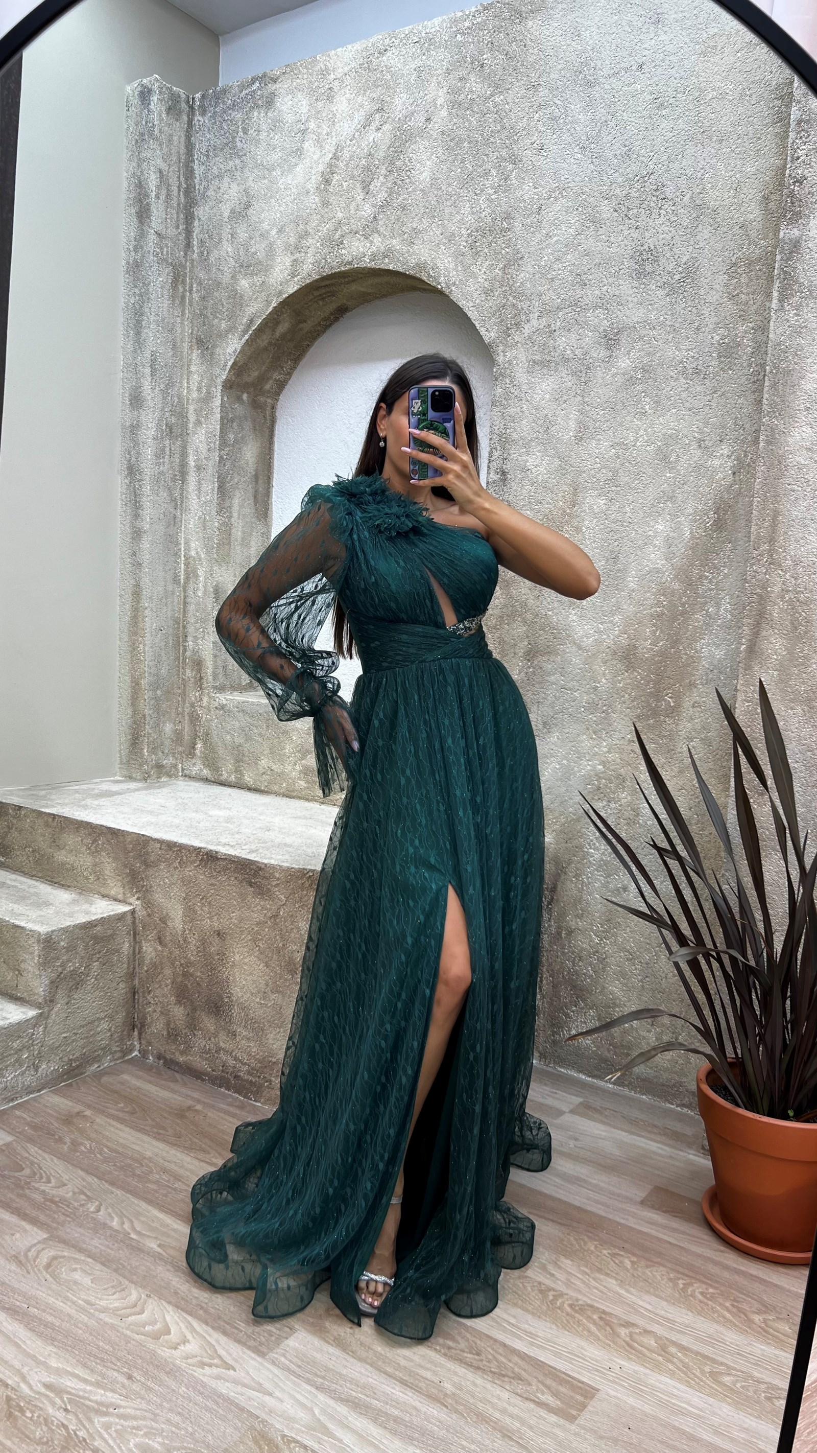 • Zümrüt Tek Kol Tül Abiye Elbise