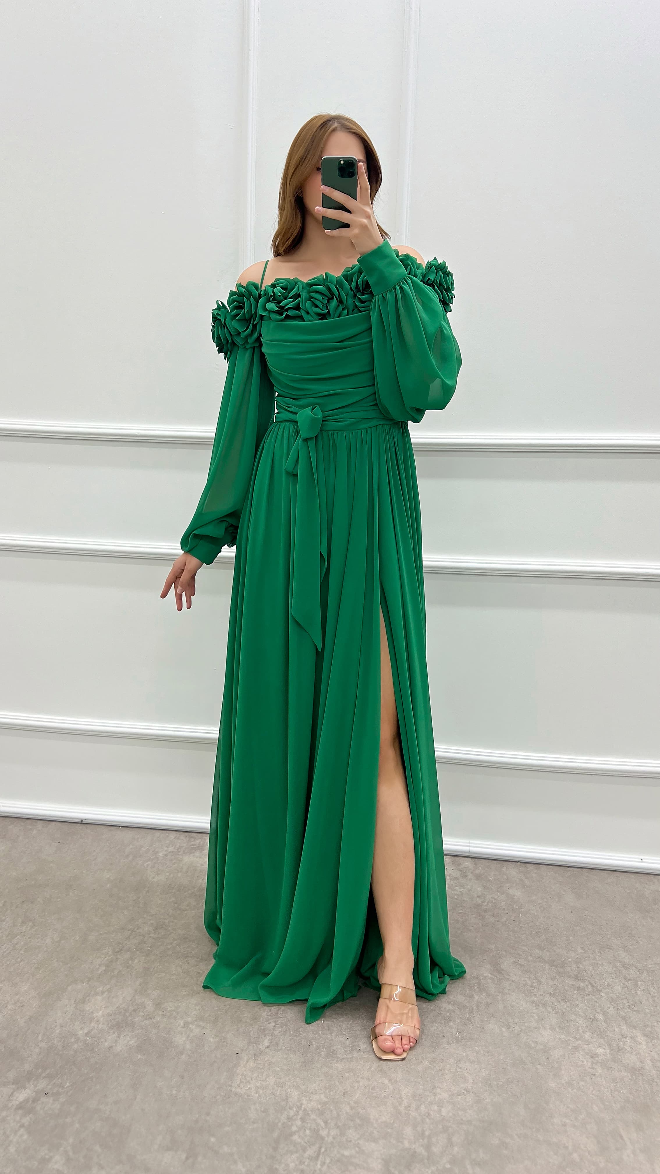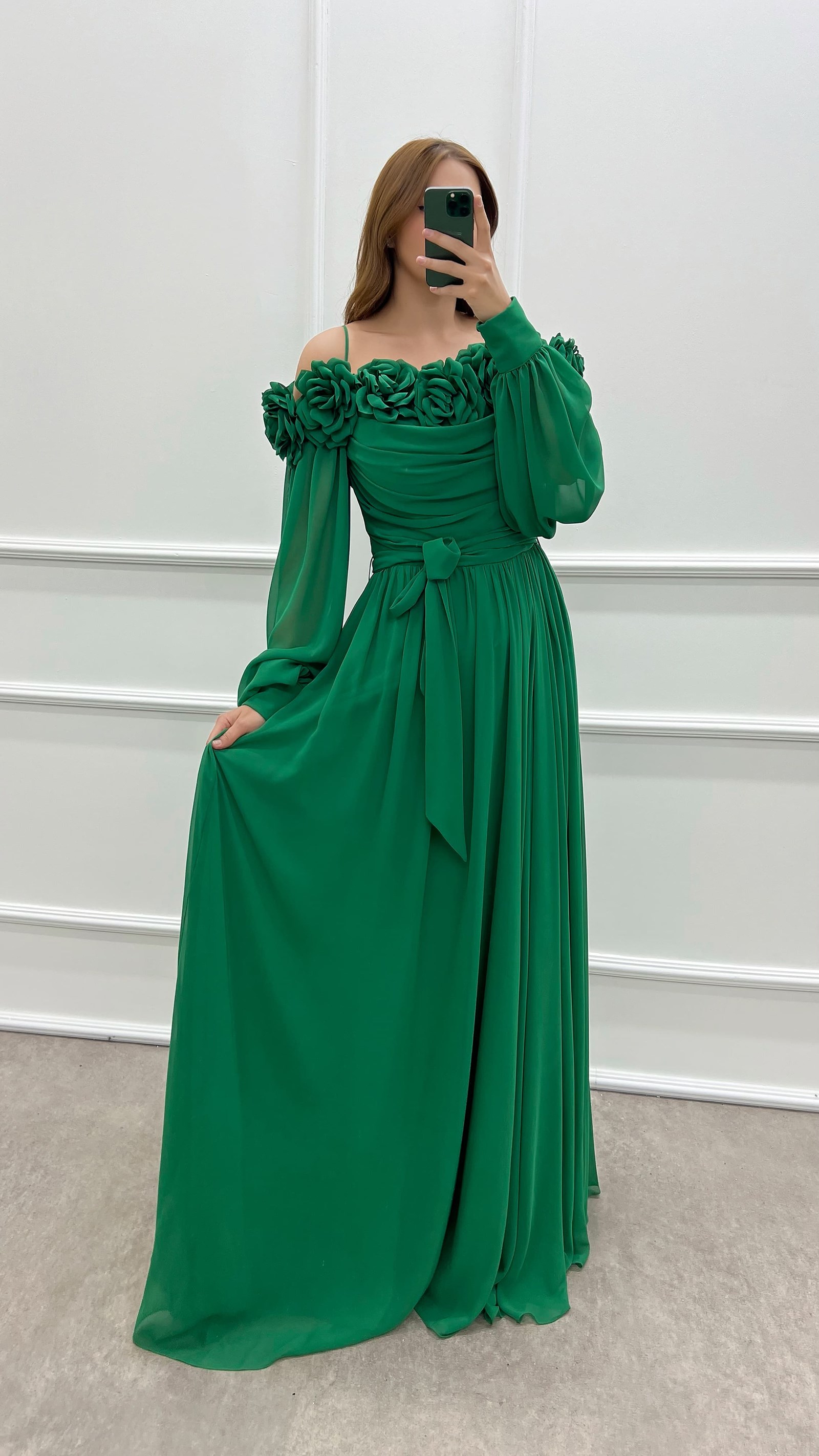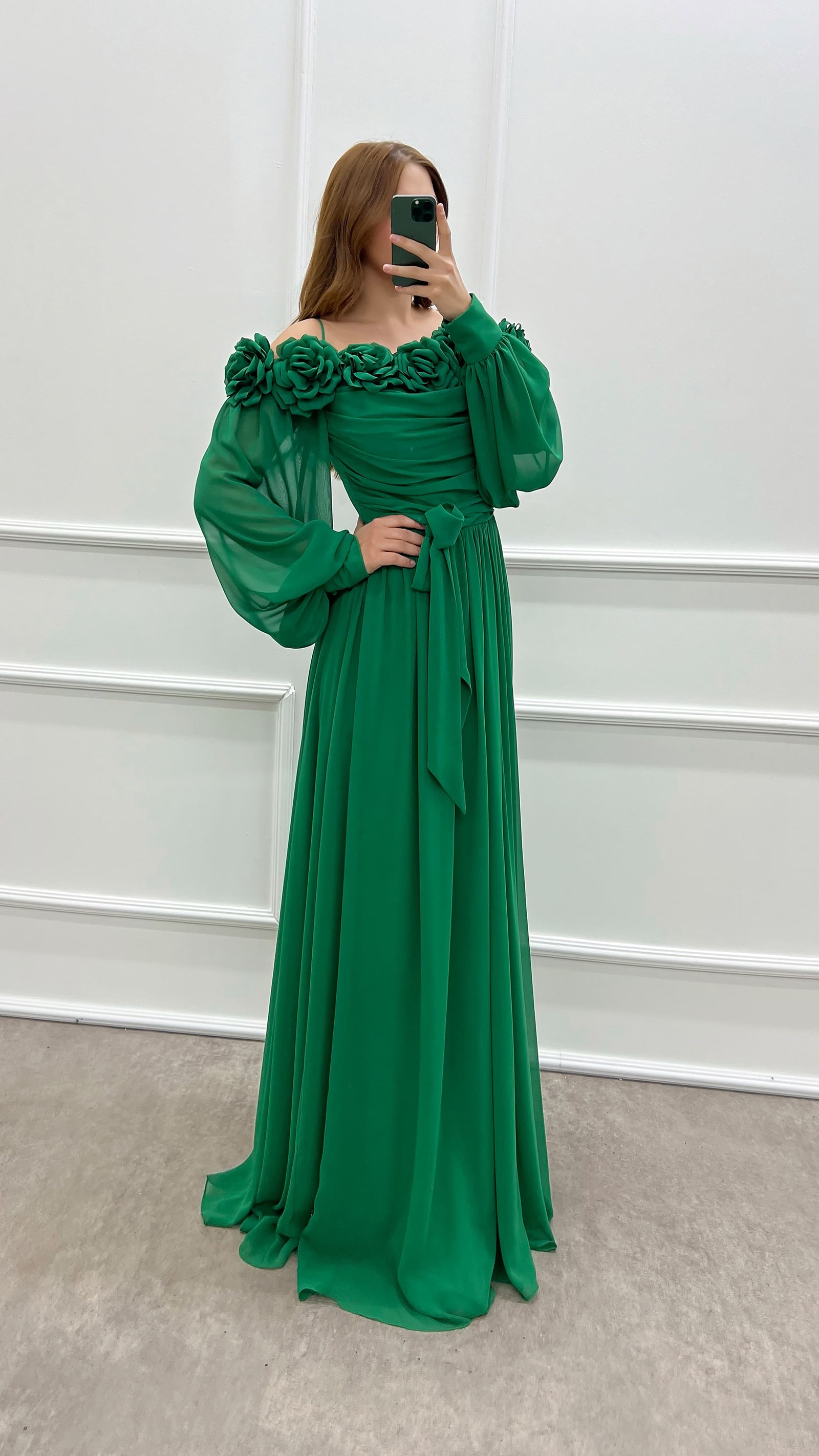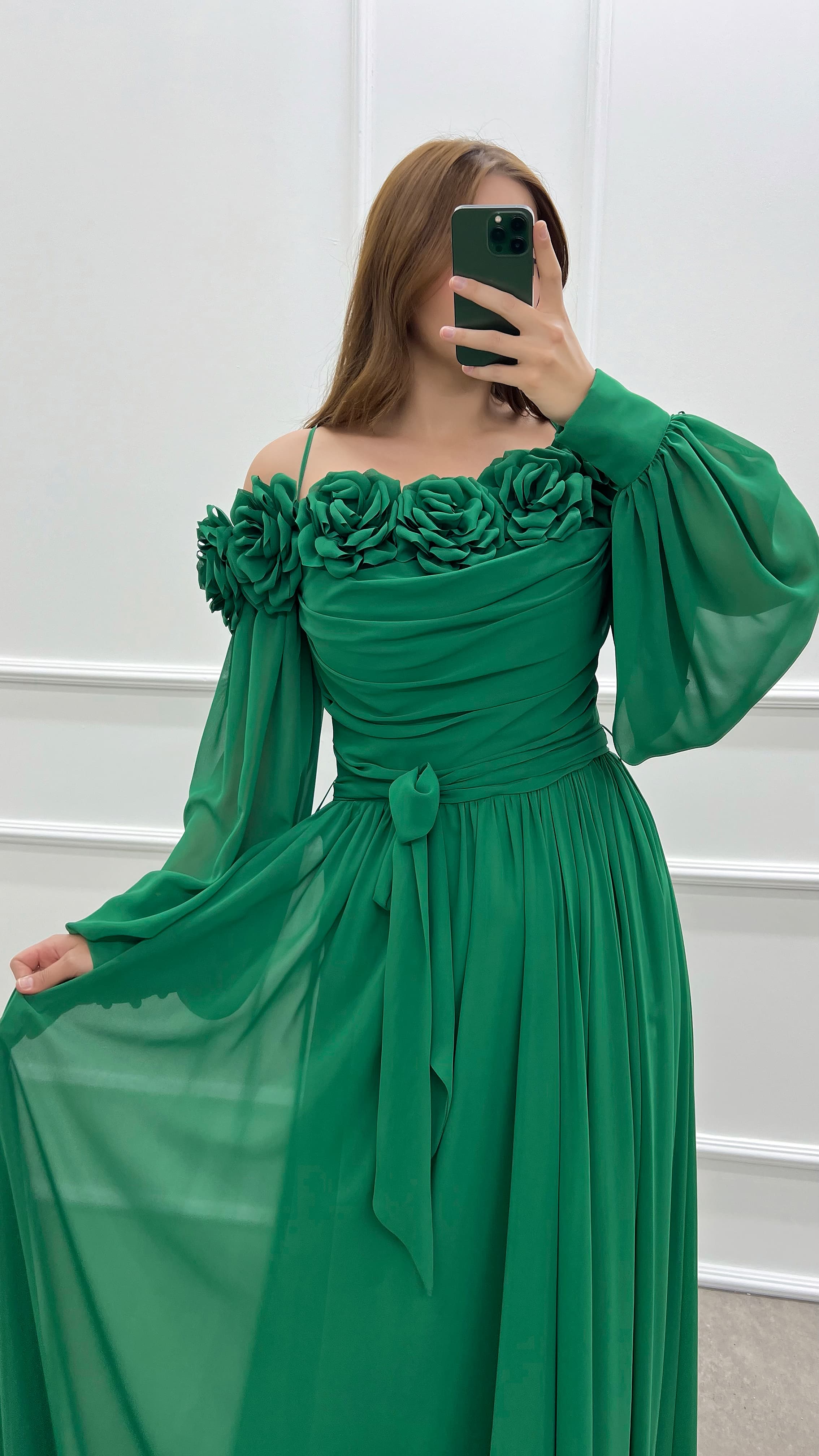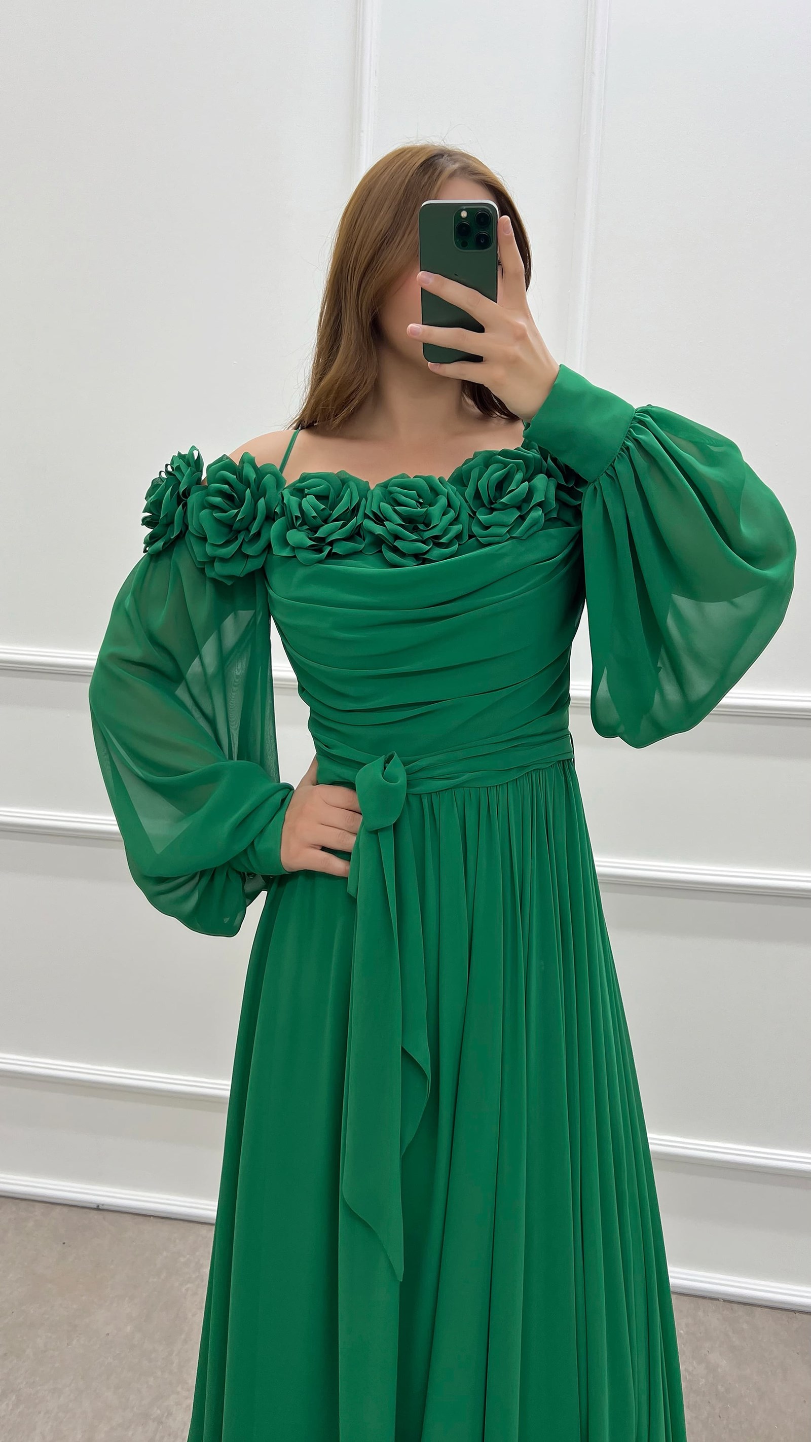 Zümrüt Yeşili Göğsü Gül Balon Kol Şifon Büyük Beden Elbise