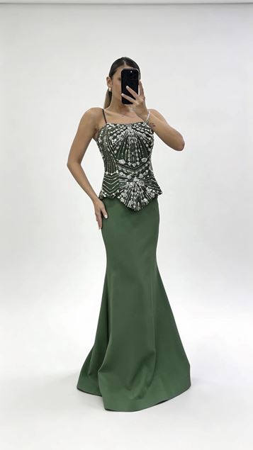فستان سهرة بمقاسات كبيرة، بلون الكاكي، بتصميم صدر منسدل وأكمام جانبية واسعة، مزين بالترتر.