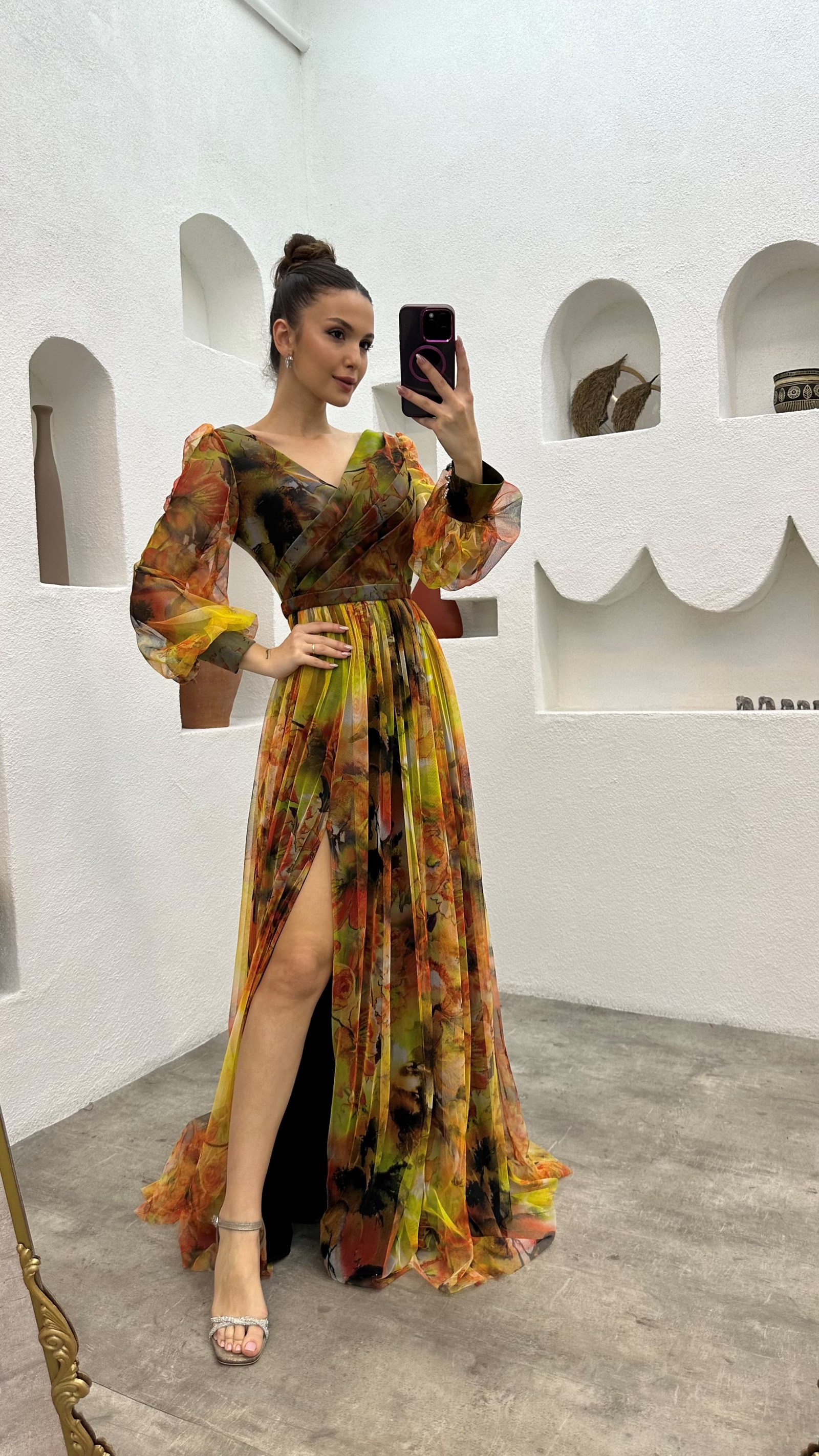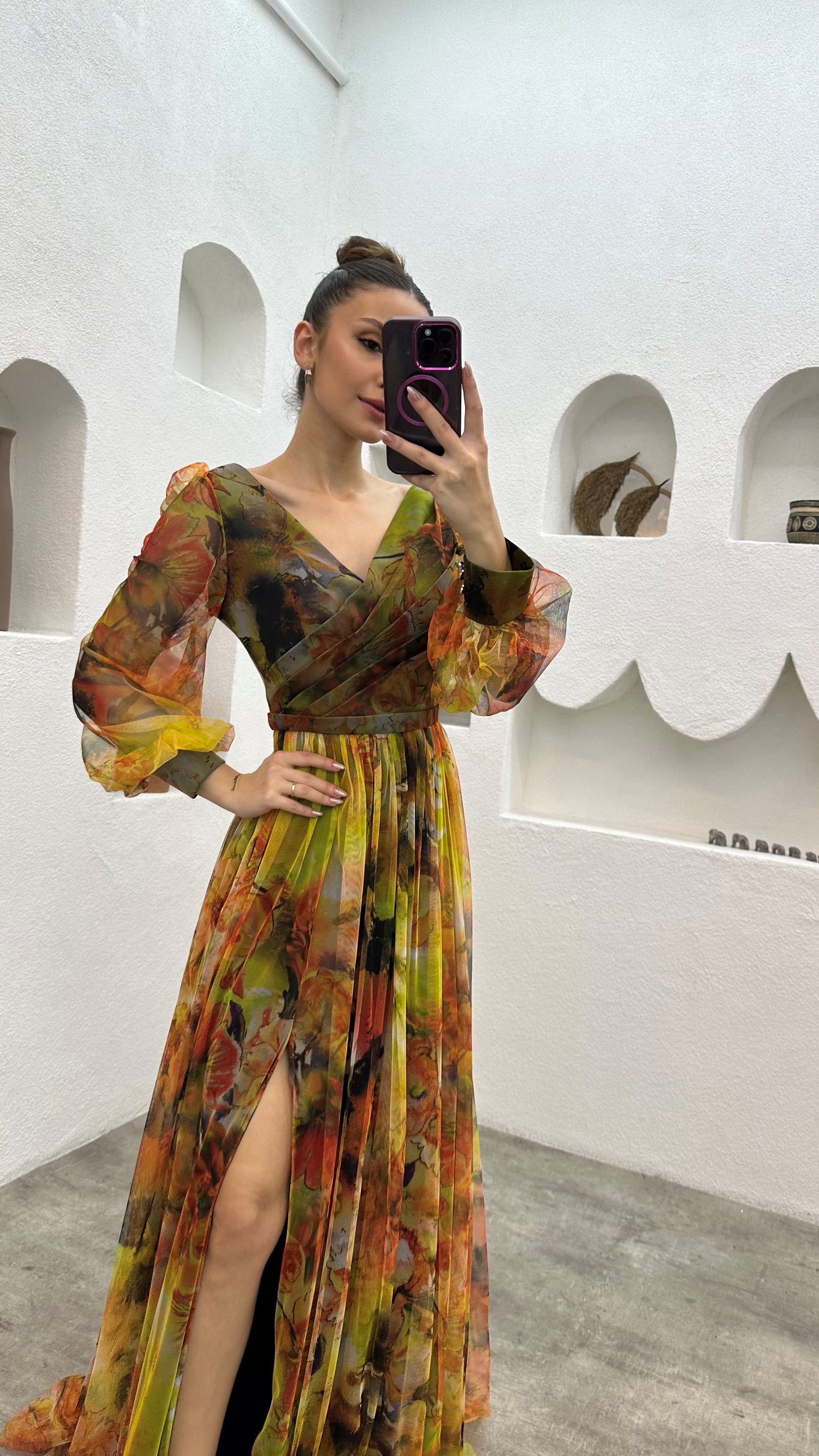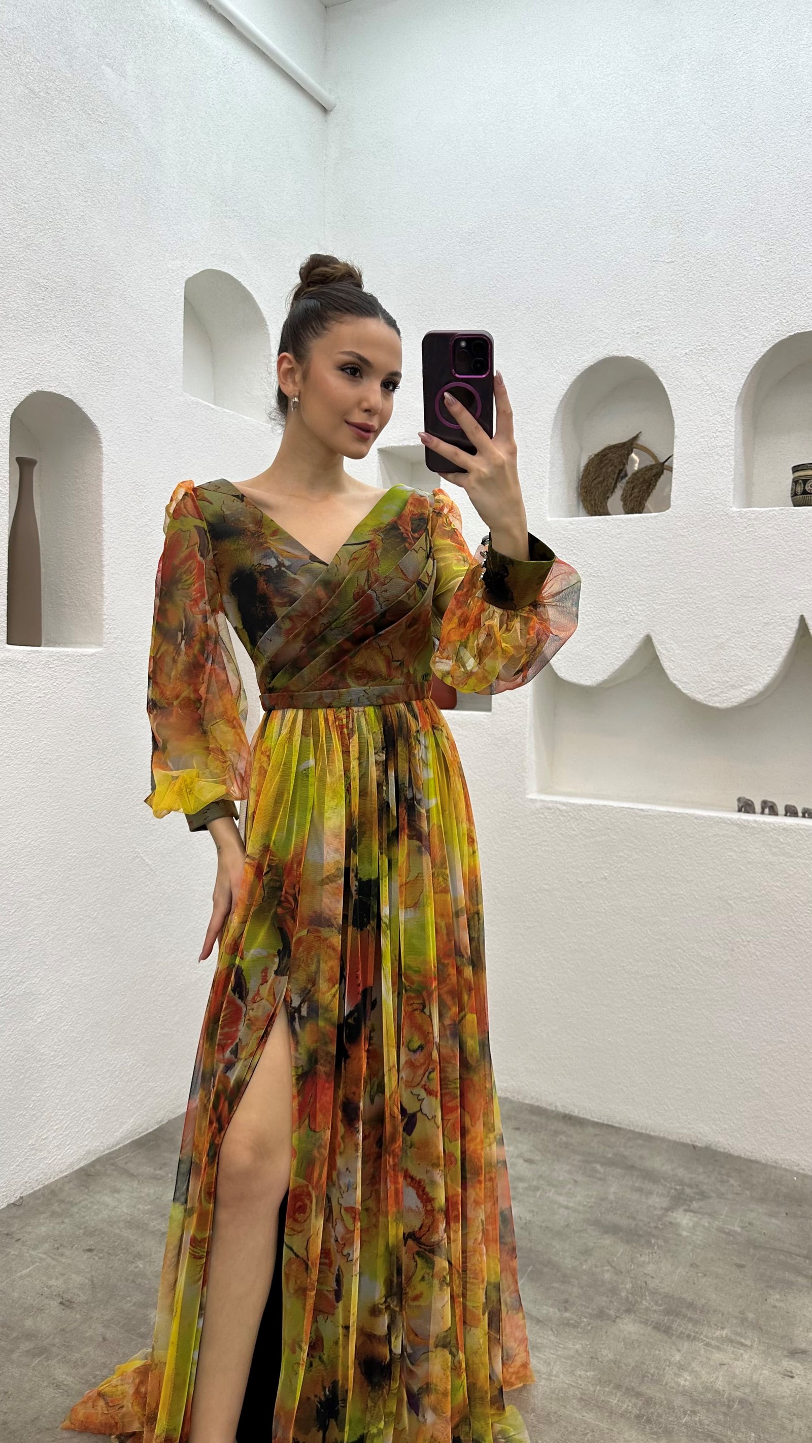 • Turuncu Renkli Balon Kol Abiye Elbise