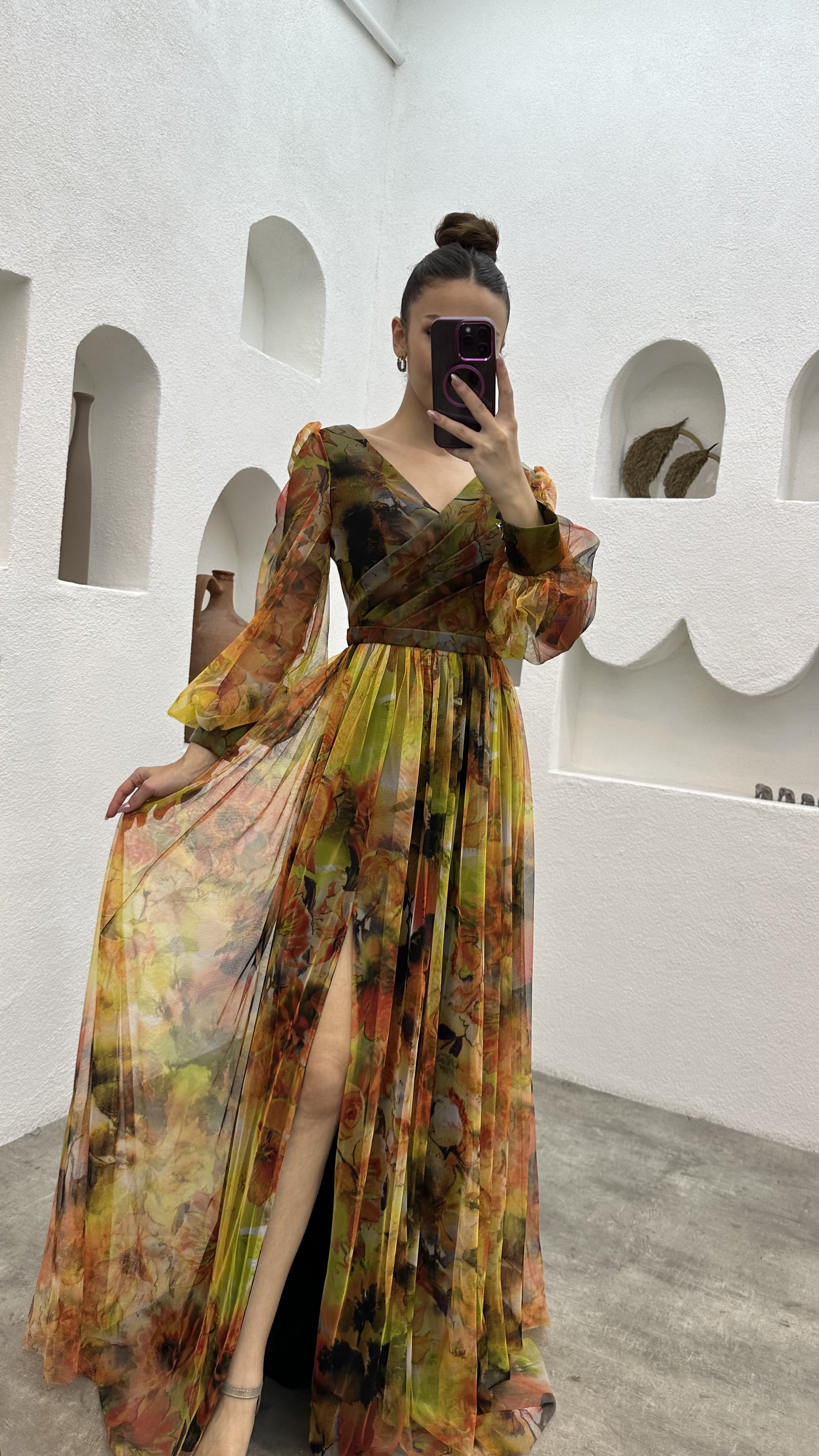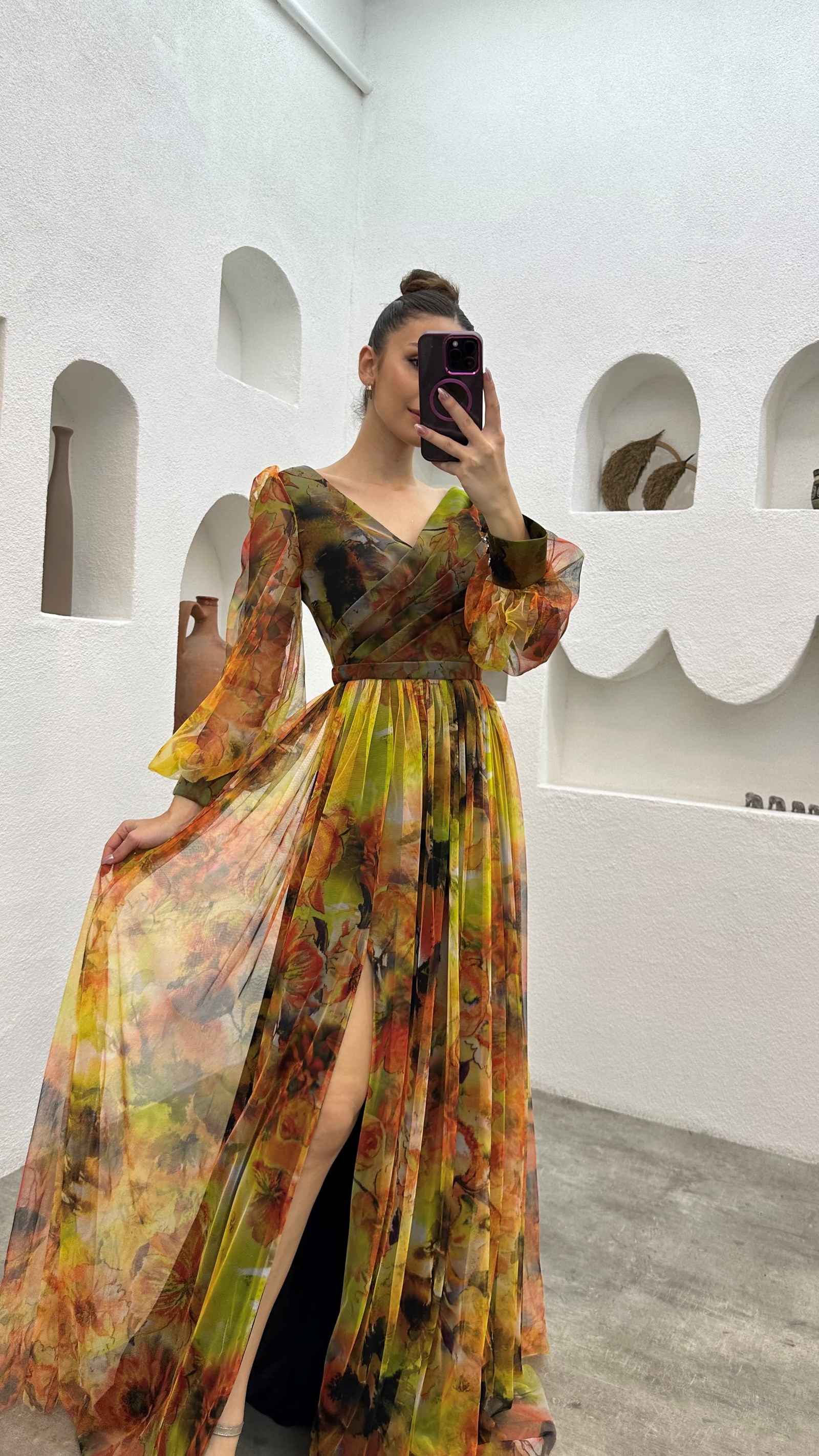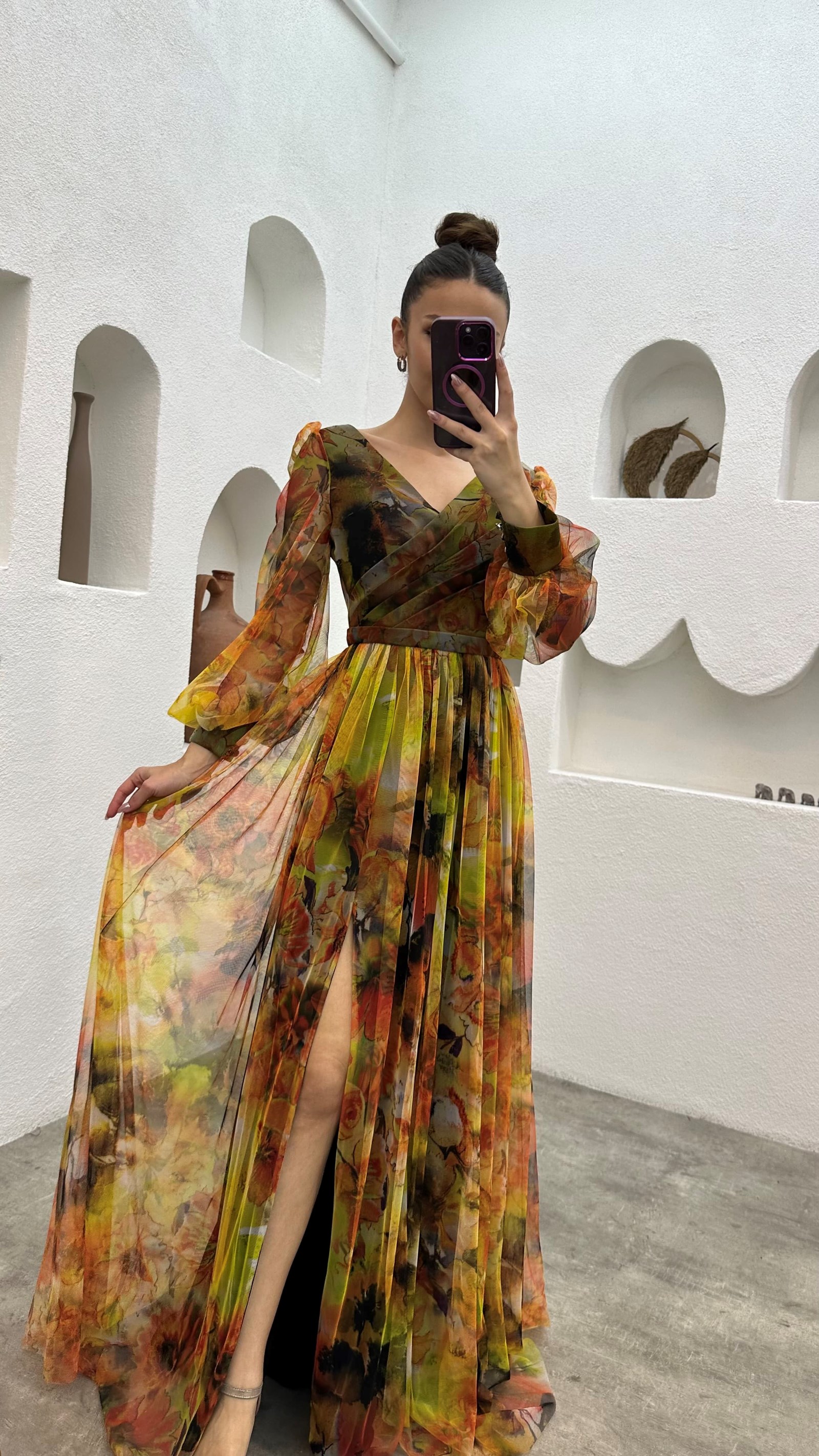 • Turuncu Renkli Balon Kol Abiye Elbise