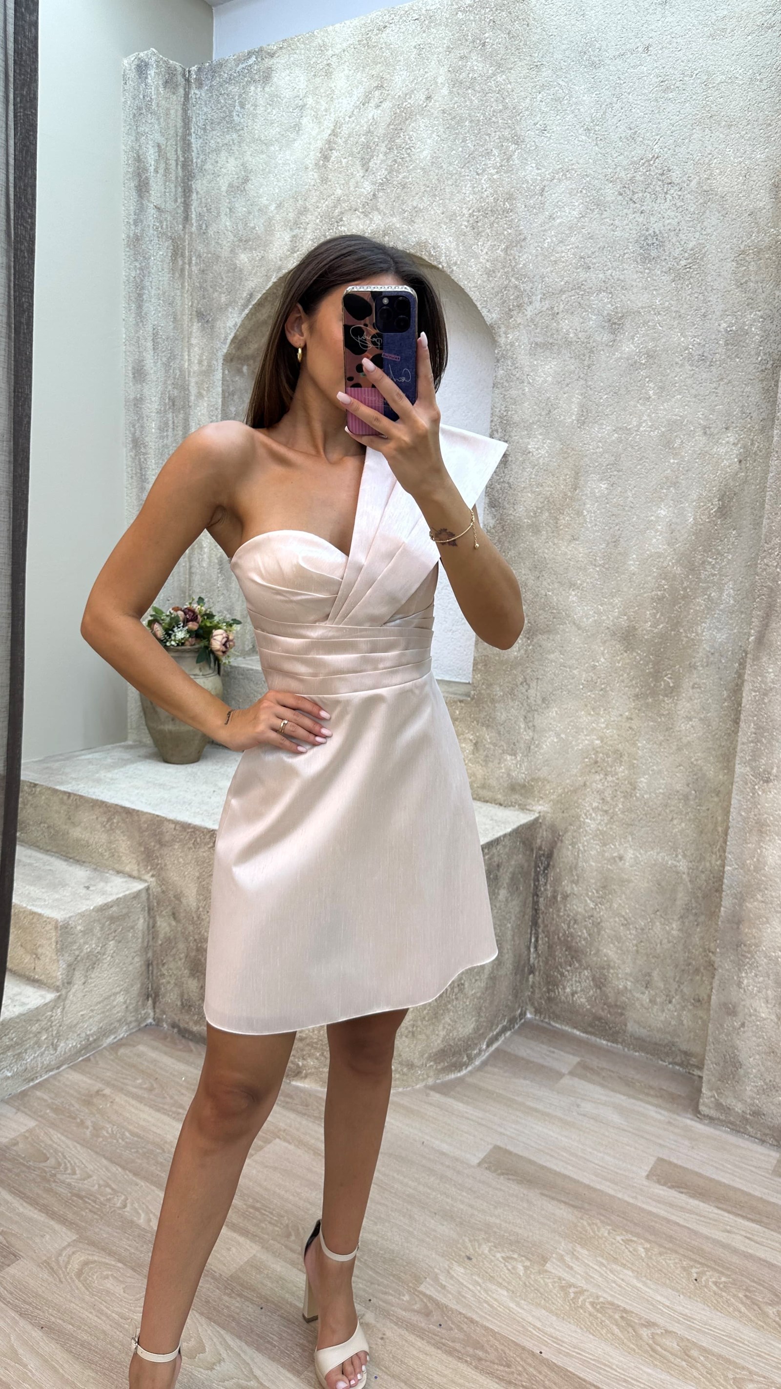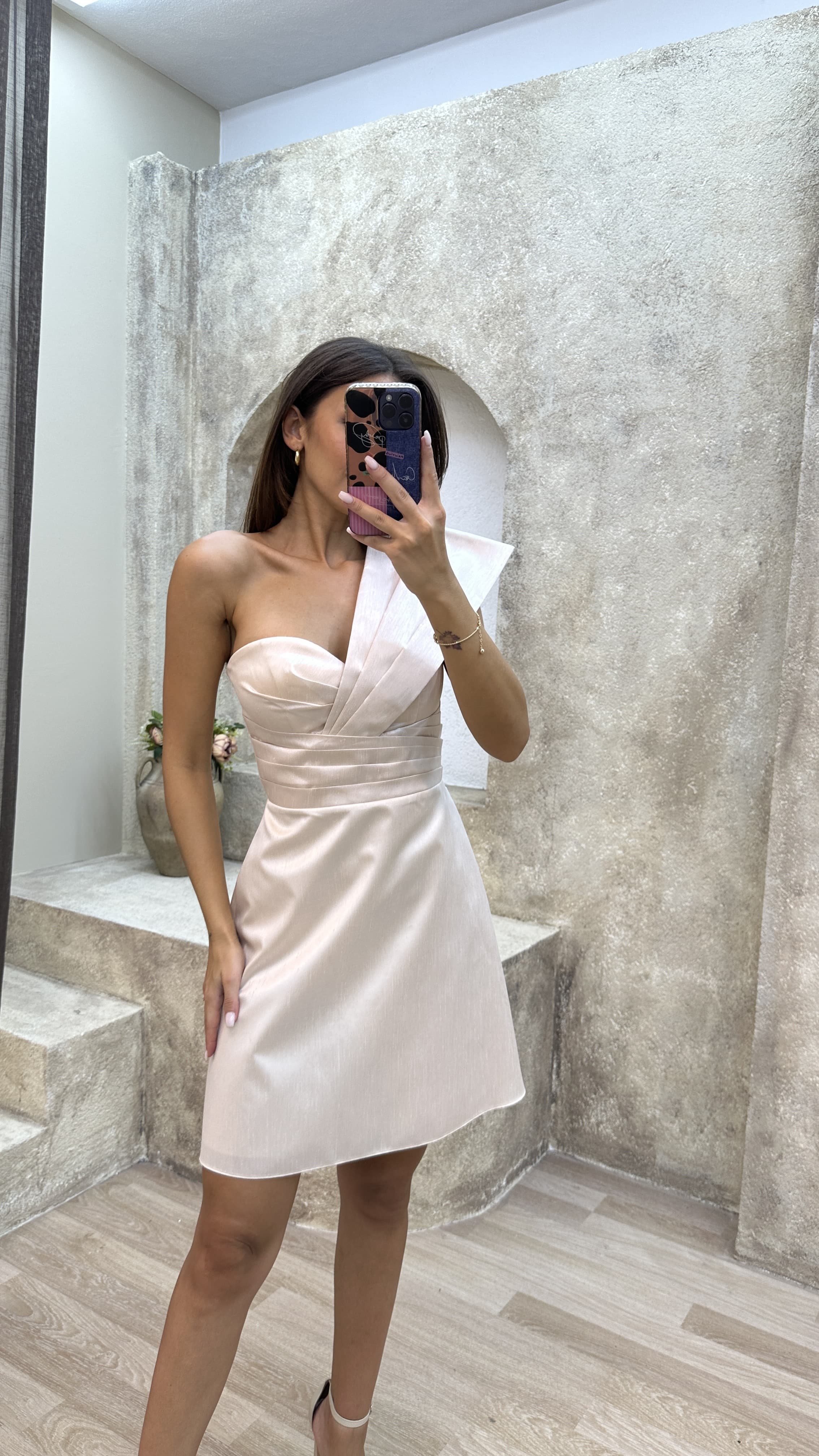 Ekru Tek Omuz Drapeli Midi Elbise