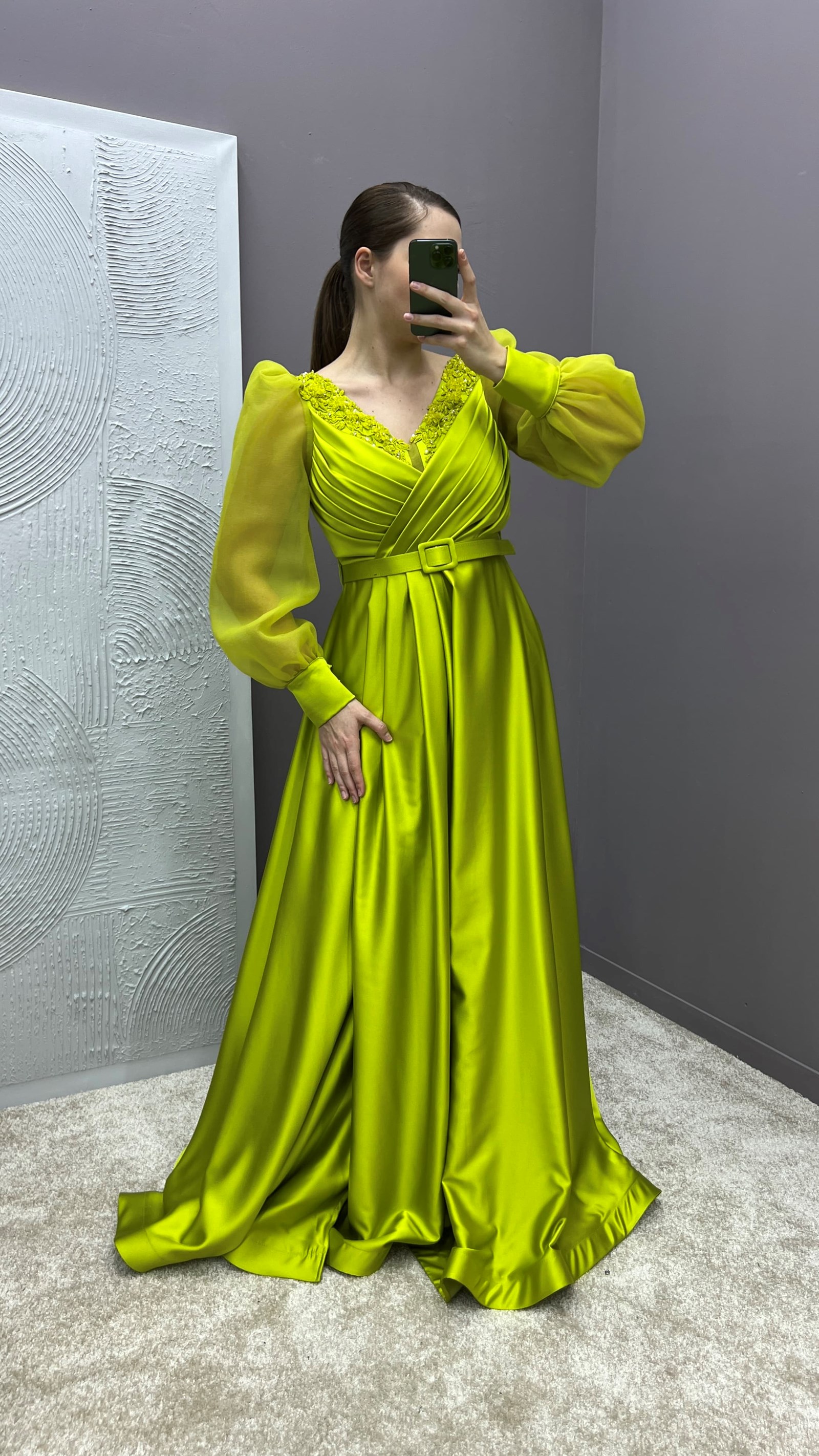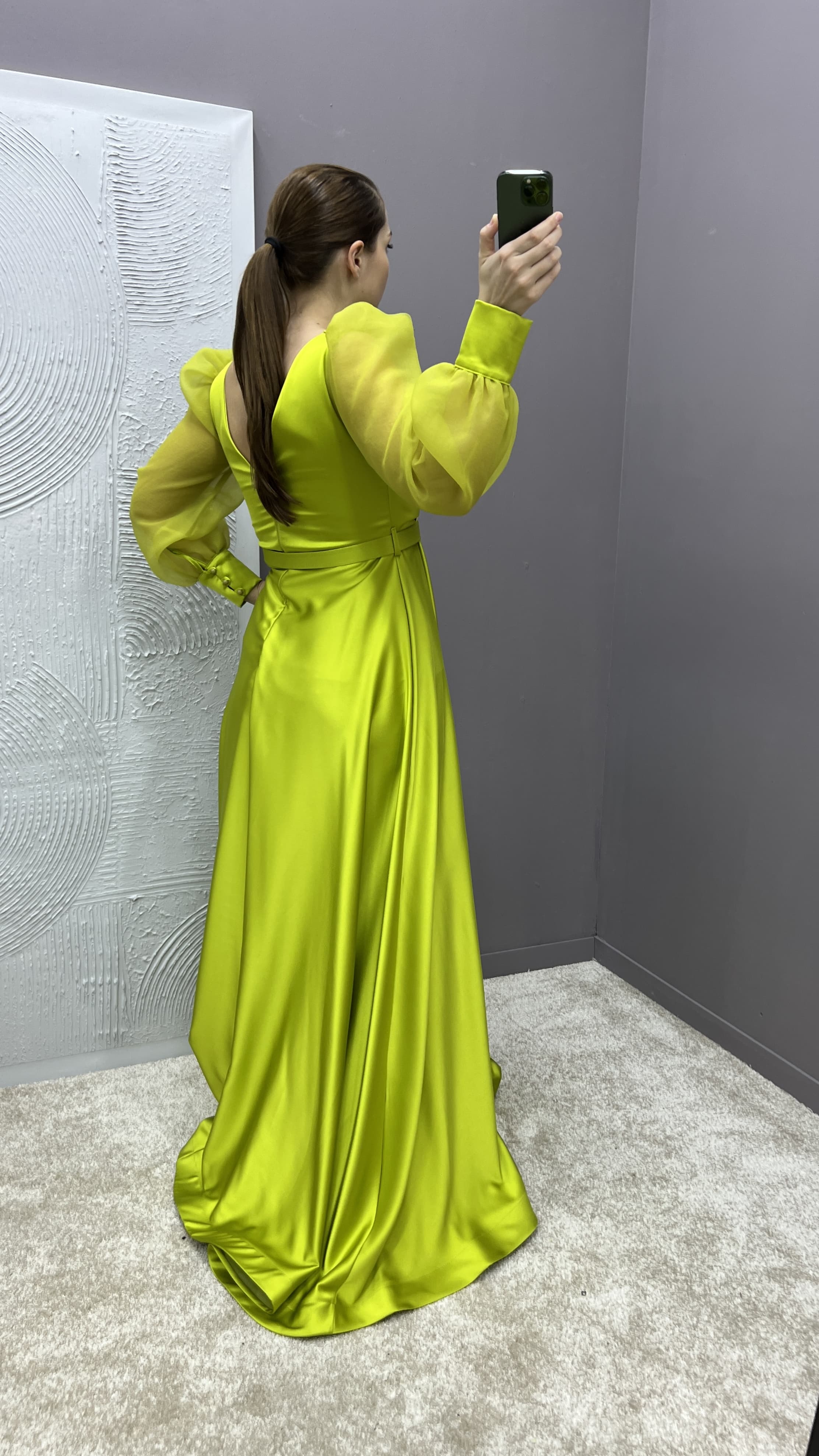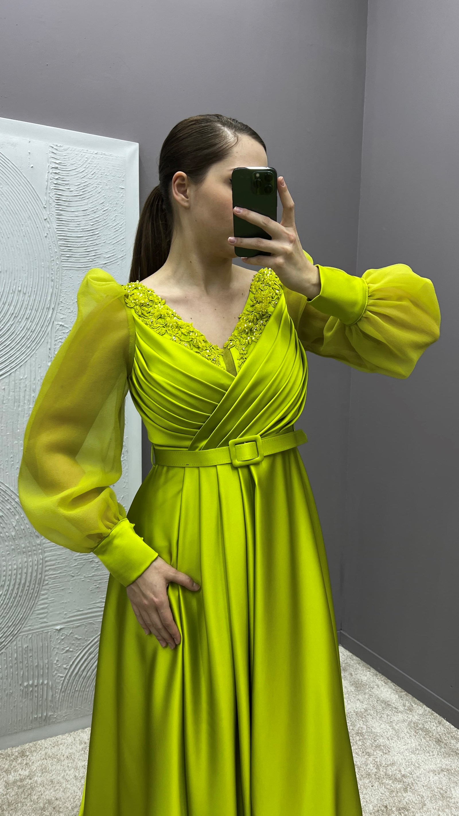 • Sarı Drapeli Kolları Tül Tasarım Saten Büyük Beden Abiye Elbise