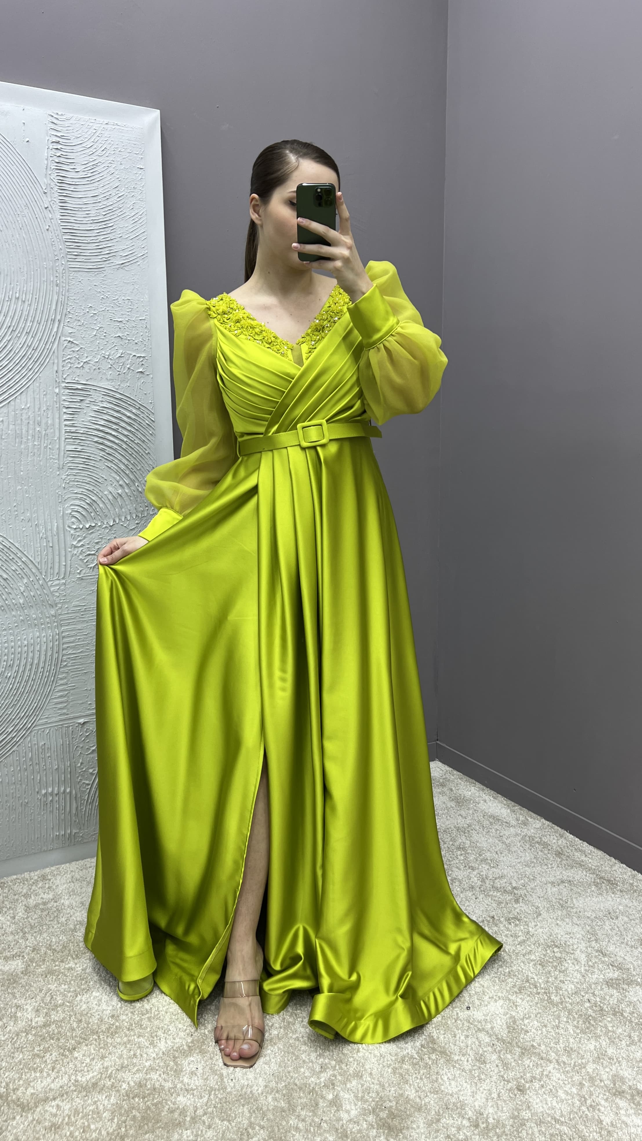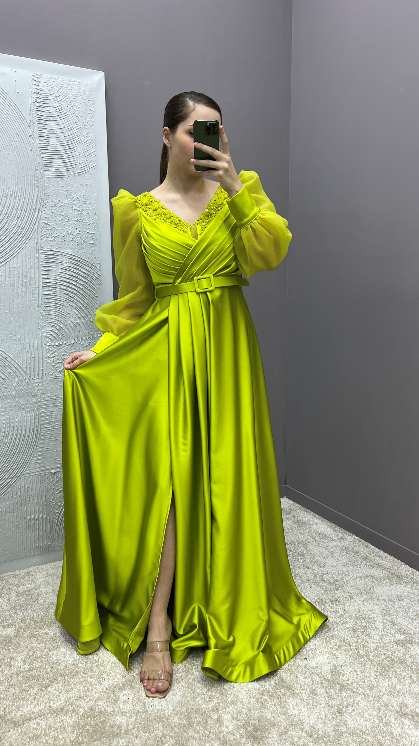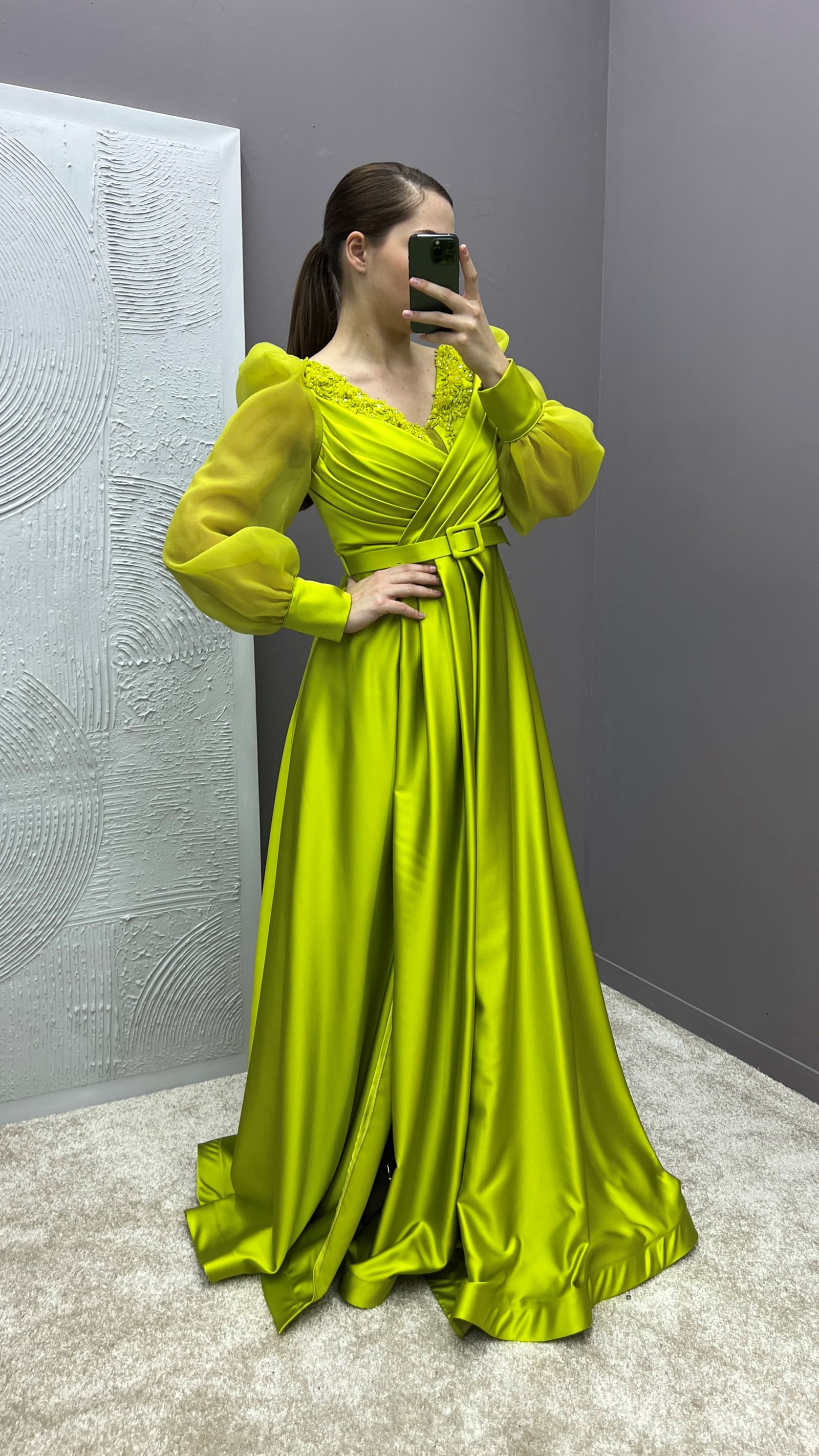 • Sarı Drapeli Kolları Tül Tasarım Saten Büyük Beden Abiye Elbise