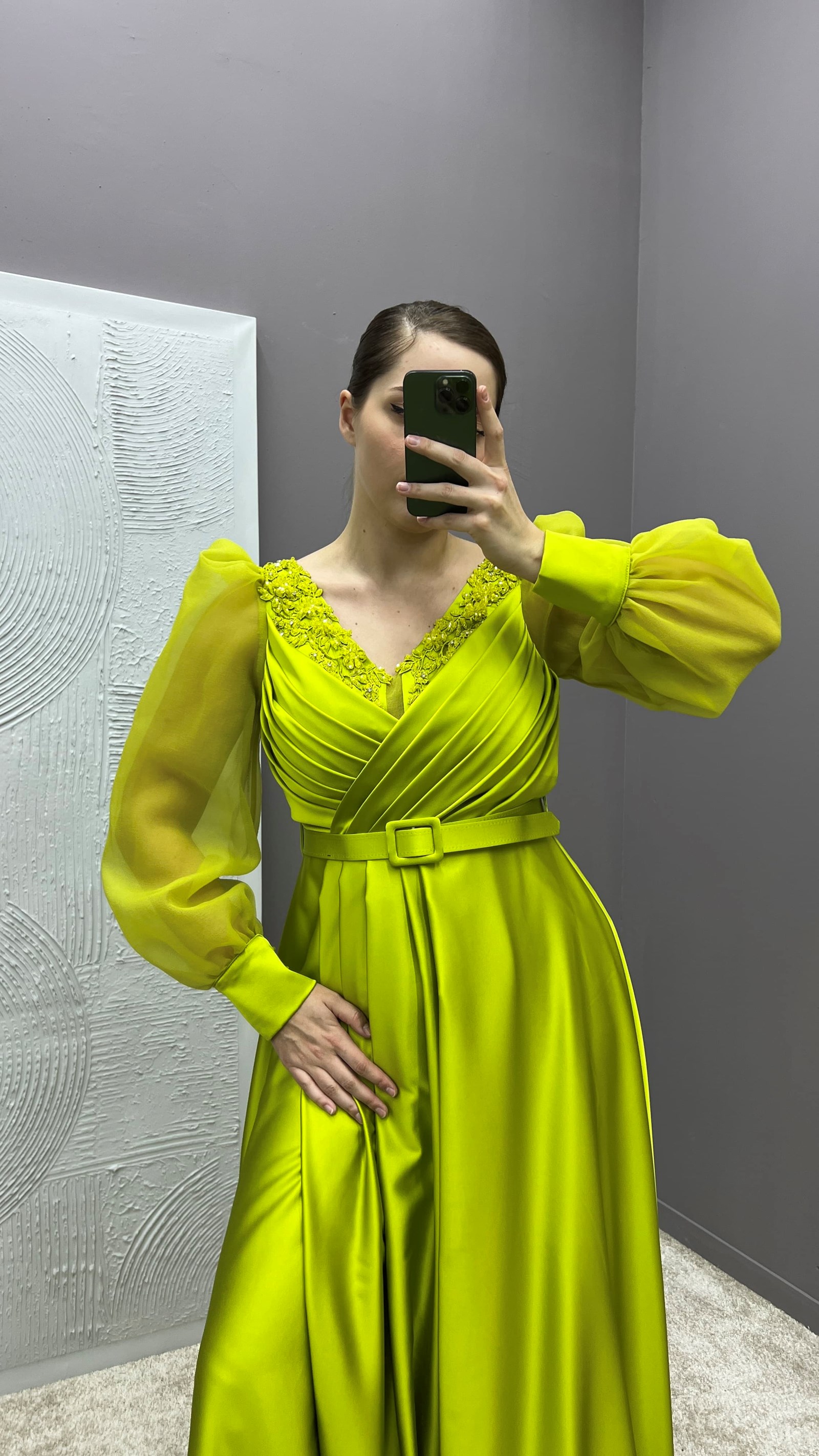 Sarı Drapeli Kolları Tül Tasarım Saten Büyük Beden Abiye Elbise