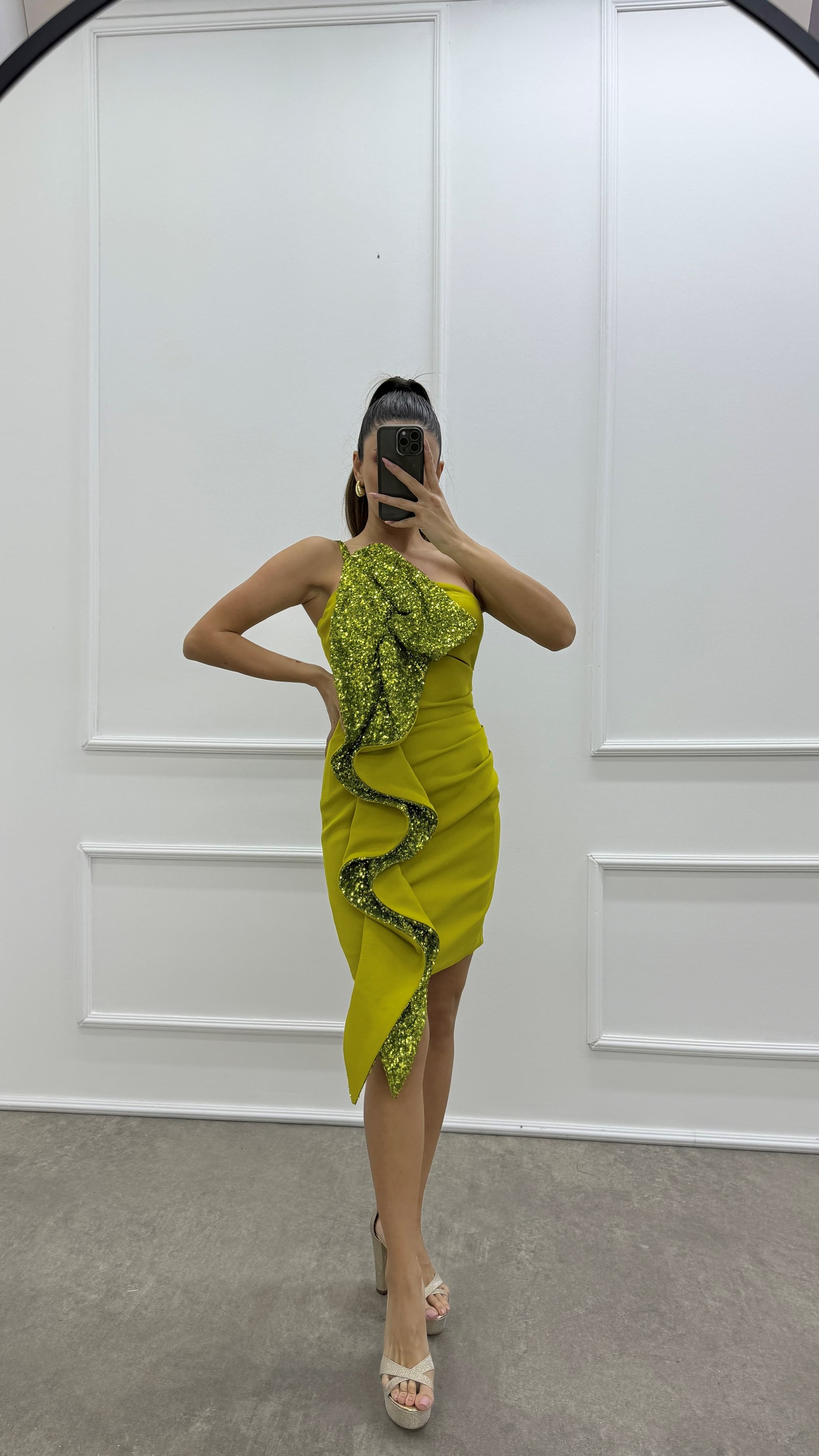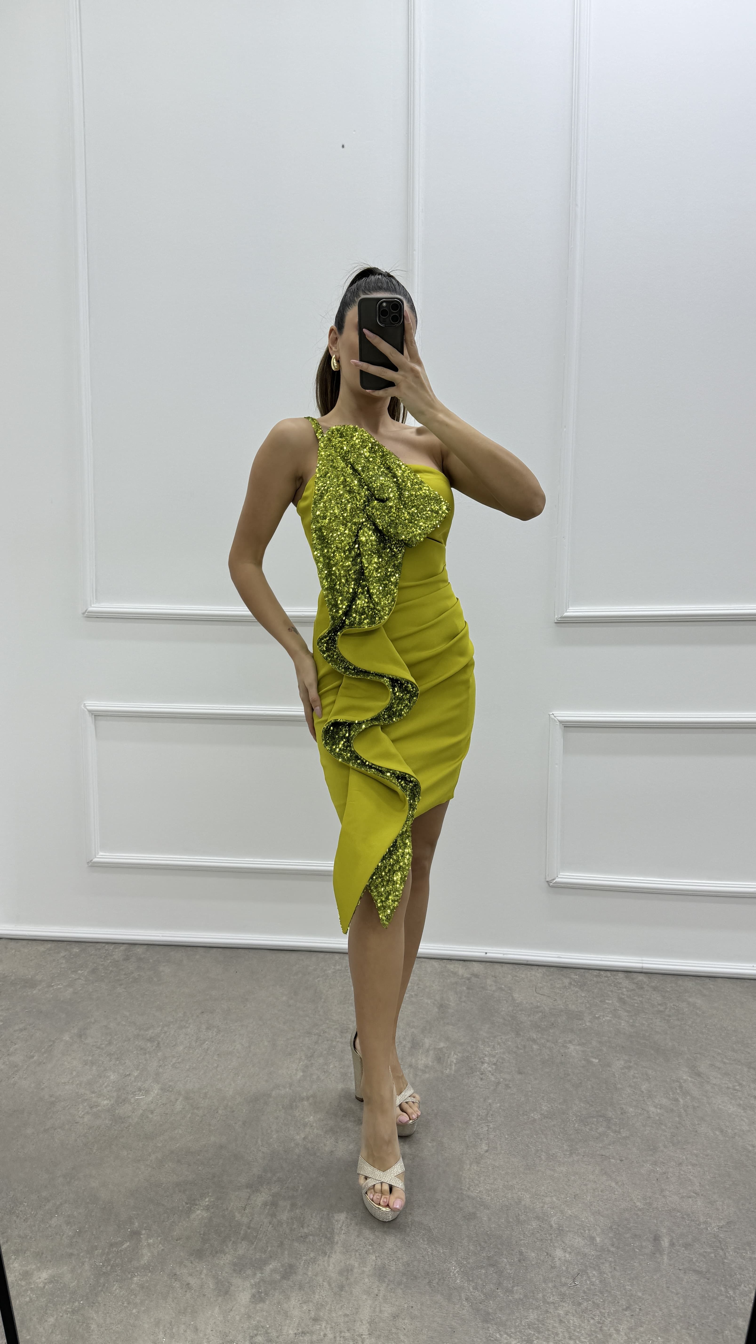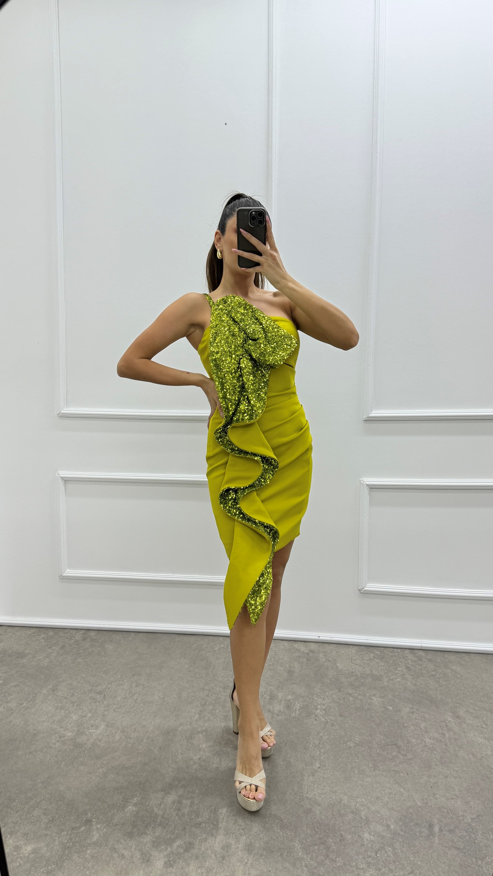 • Sarı Tek Omuz Volanlı Payet Detay Tasarım Elbise