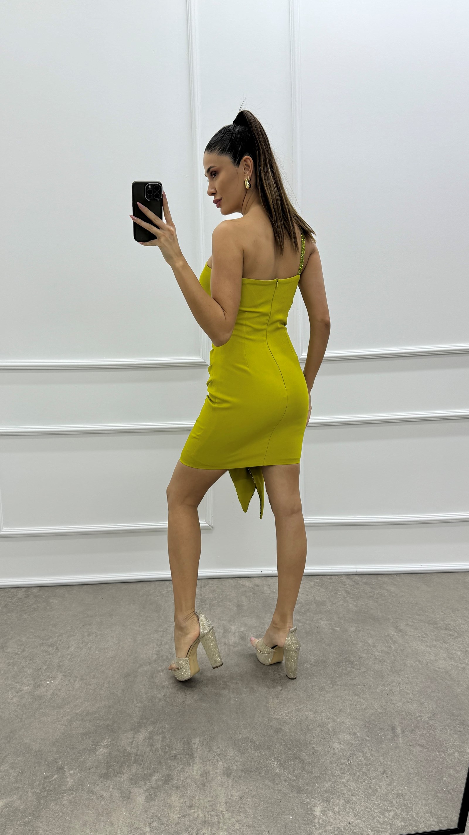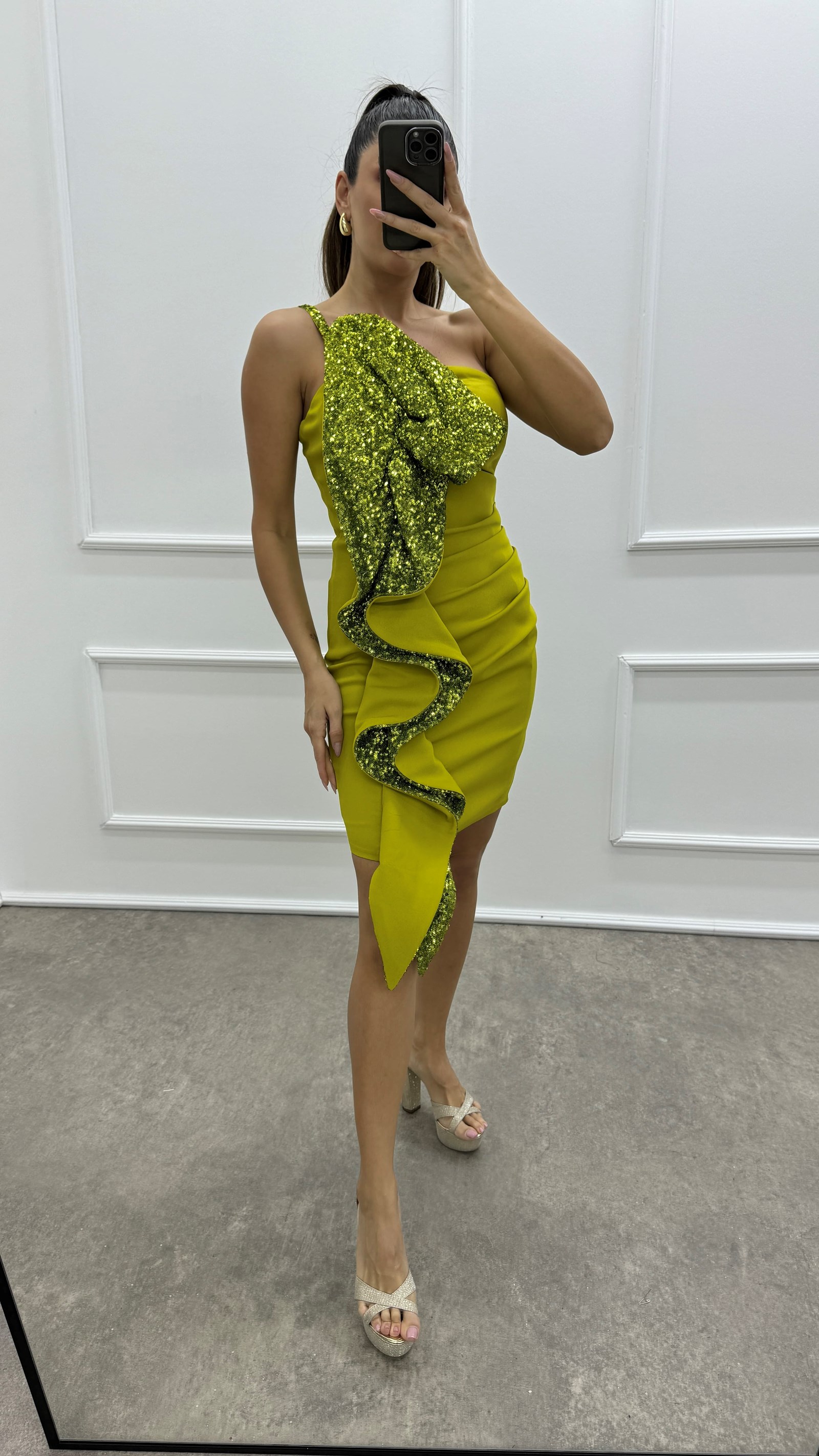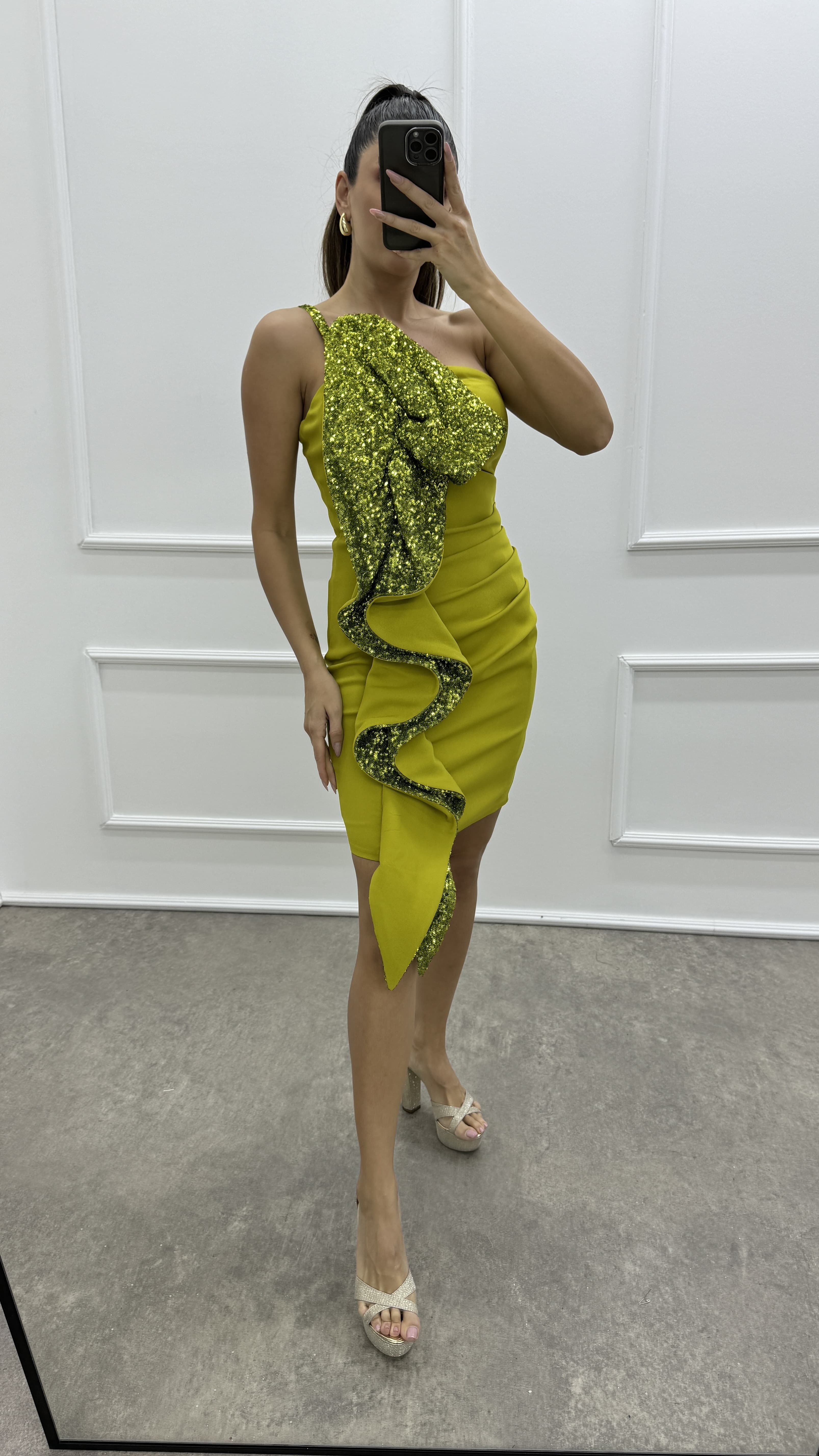 • Sarı Tek Omuz Volanlı Payet Detay Tasarım Elbise