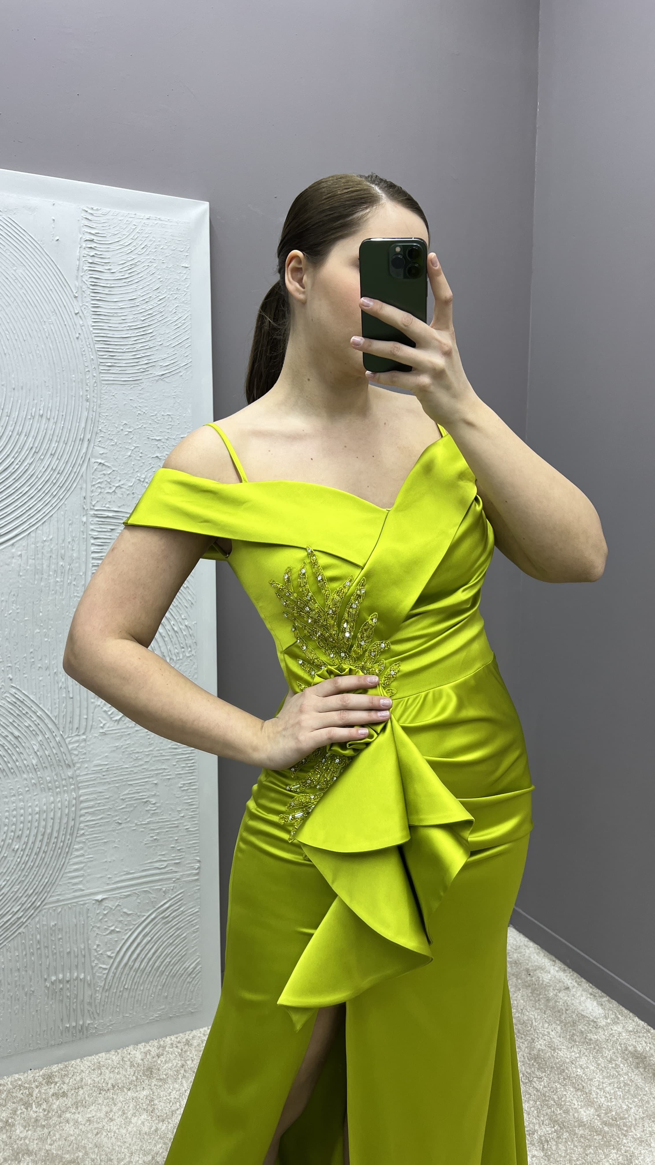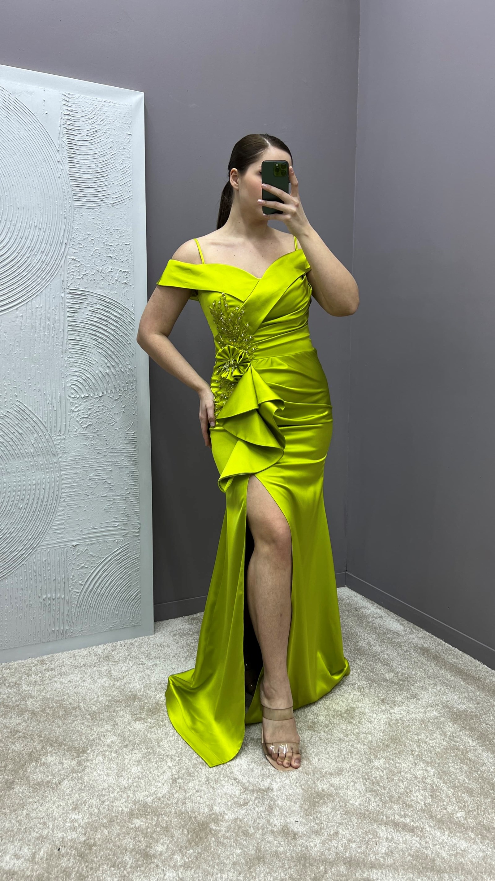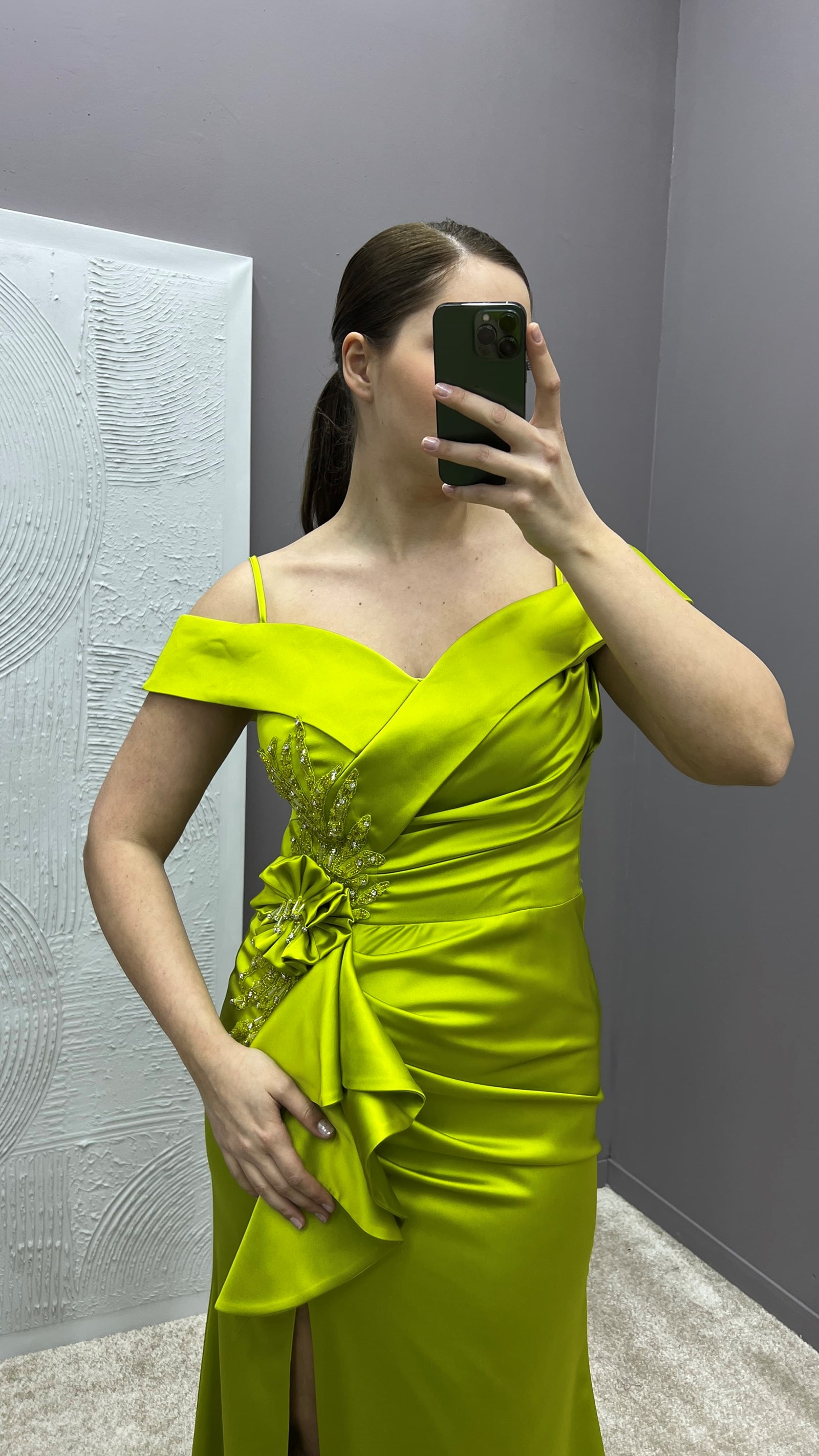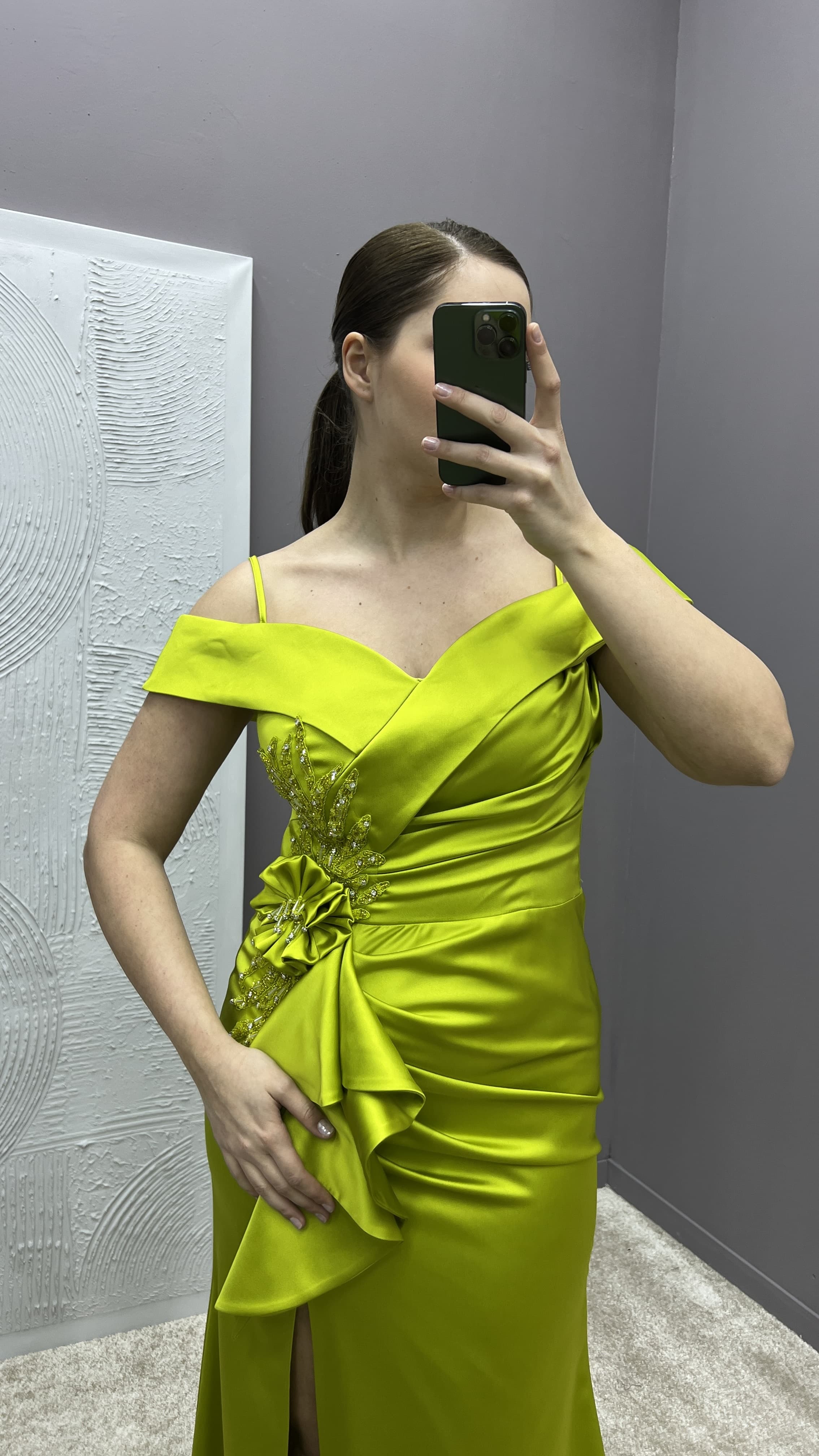Yeşil Kayık Yaka İşlemeli Volan Detay Tasarım Büyük Beden Abiye Elbise