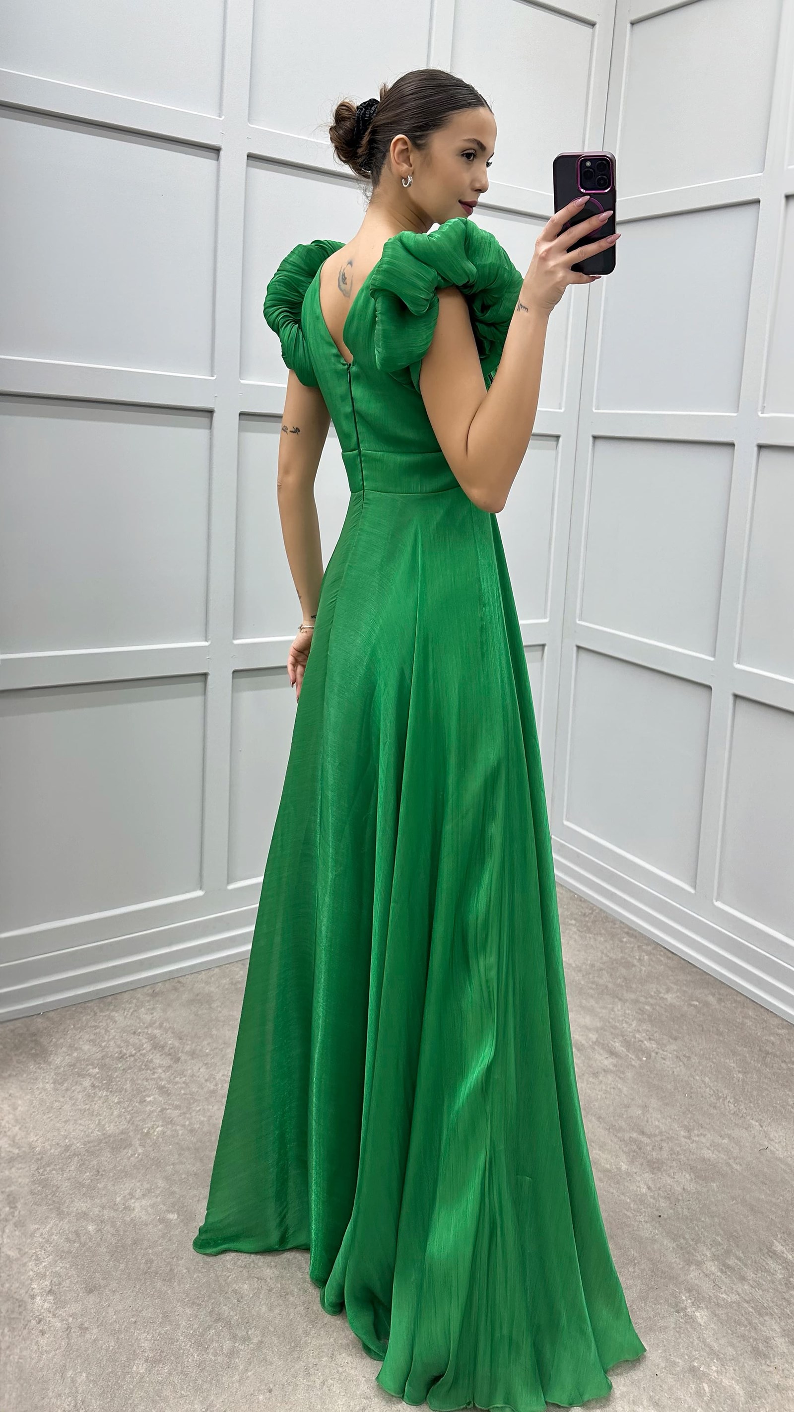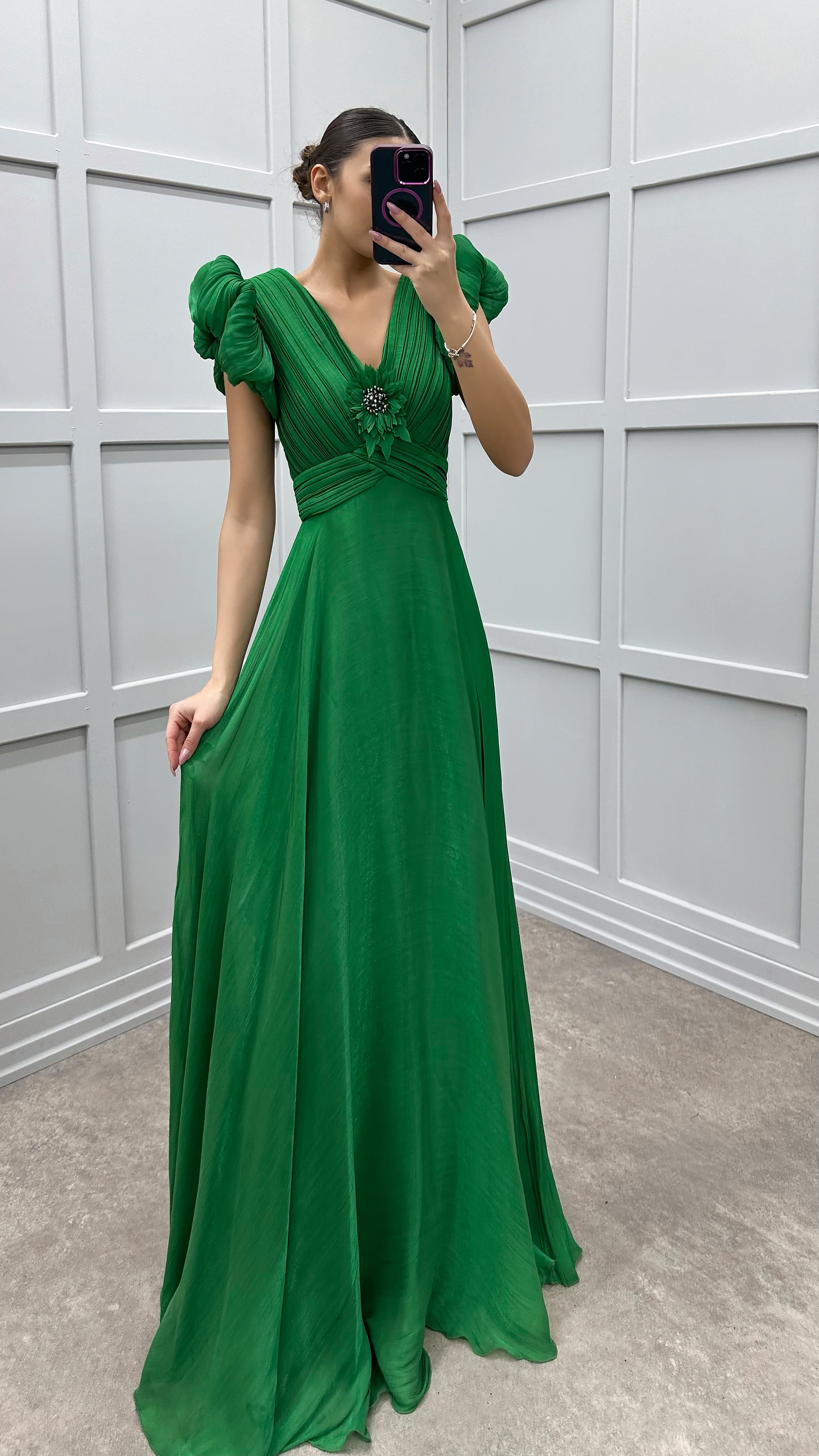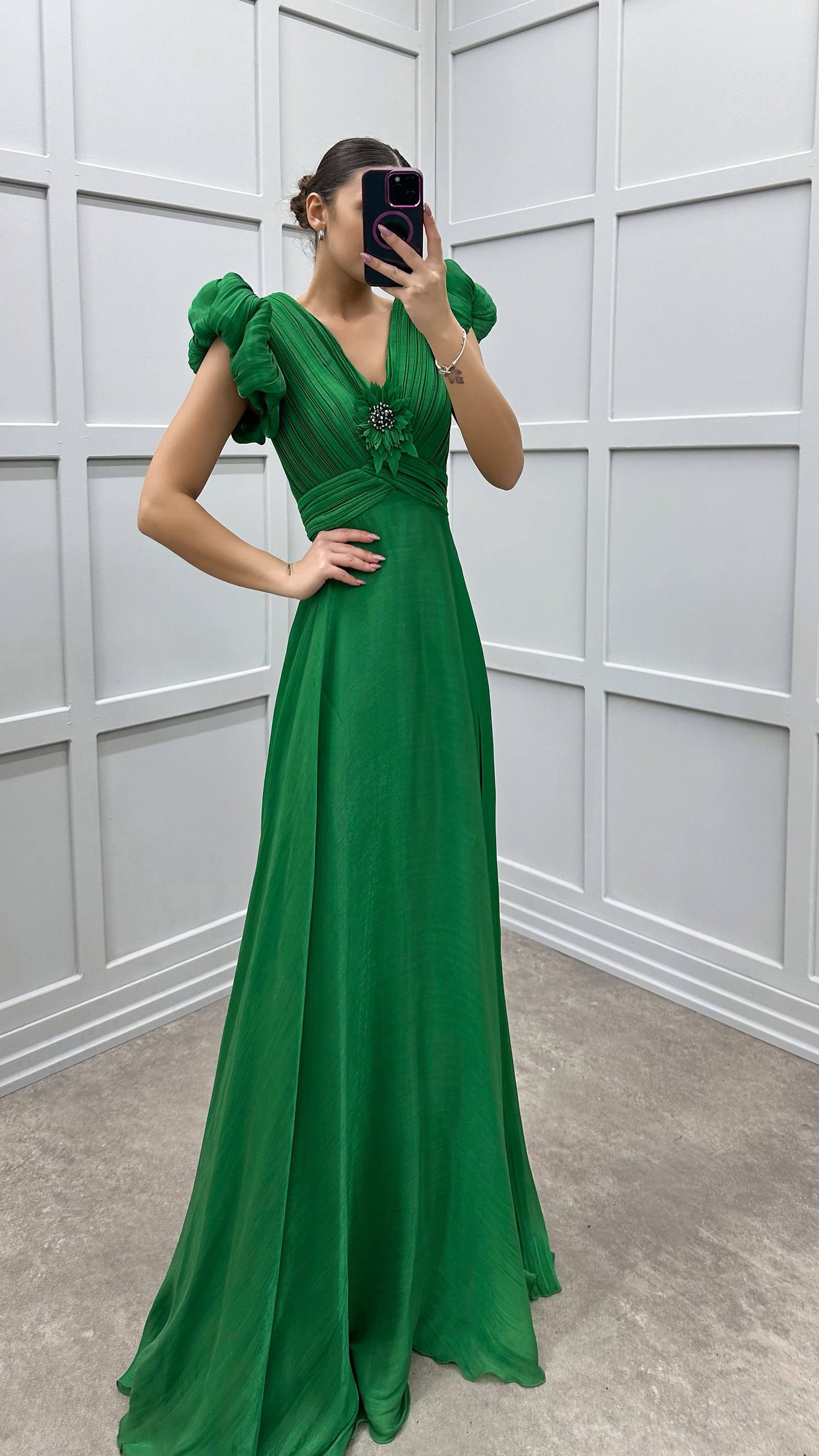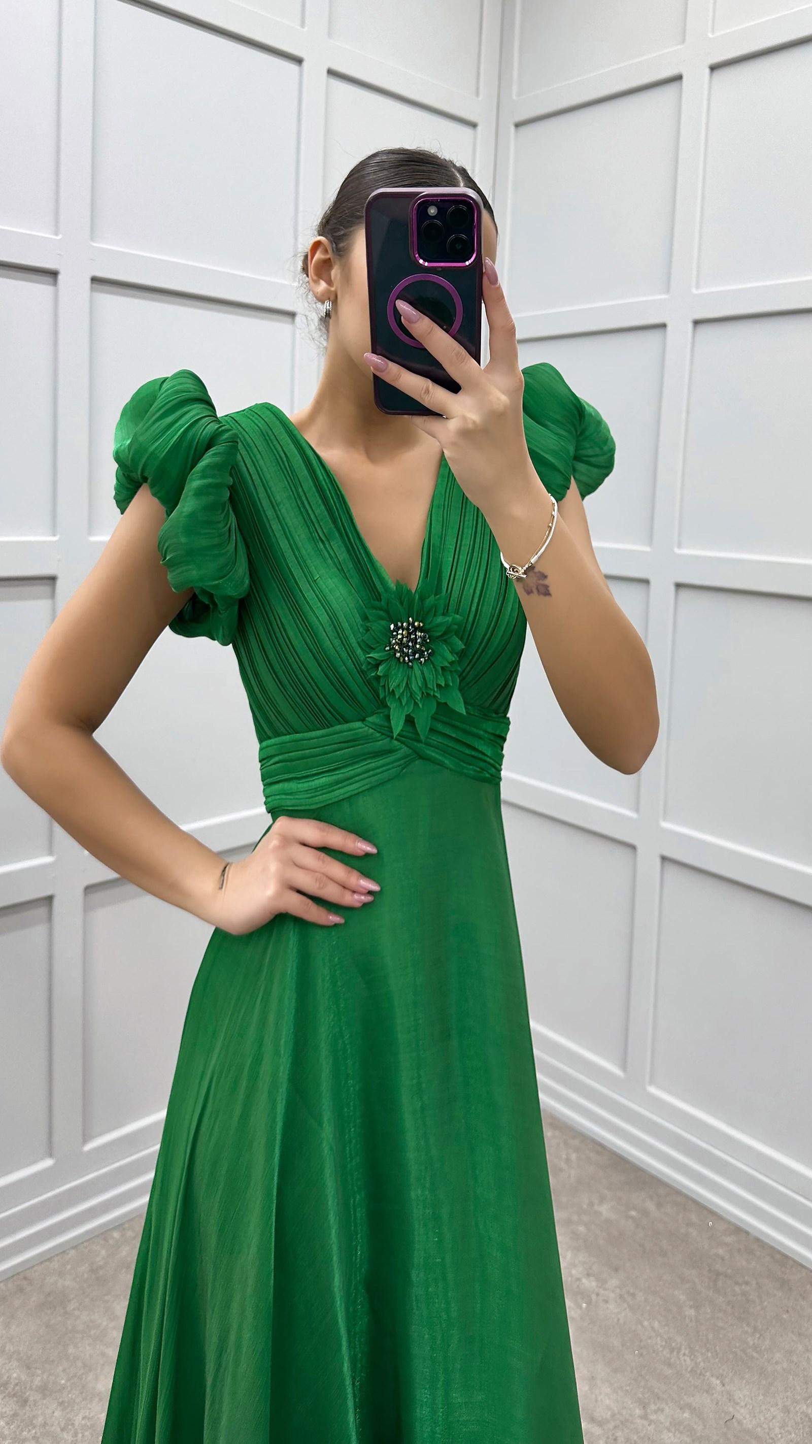 • Yeşil Göğsü Çiçek Detay Abiye Elbise