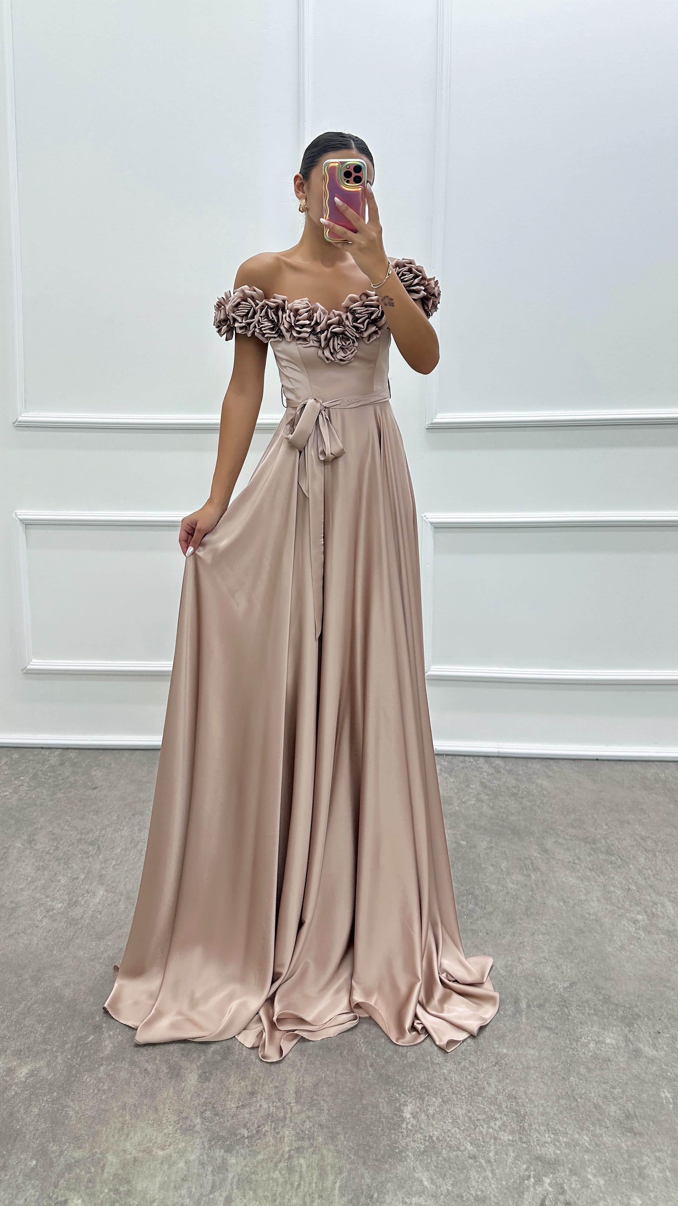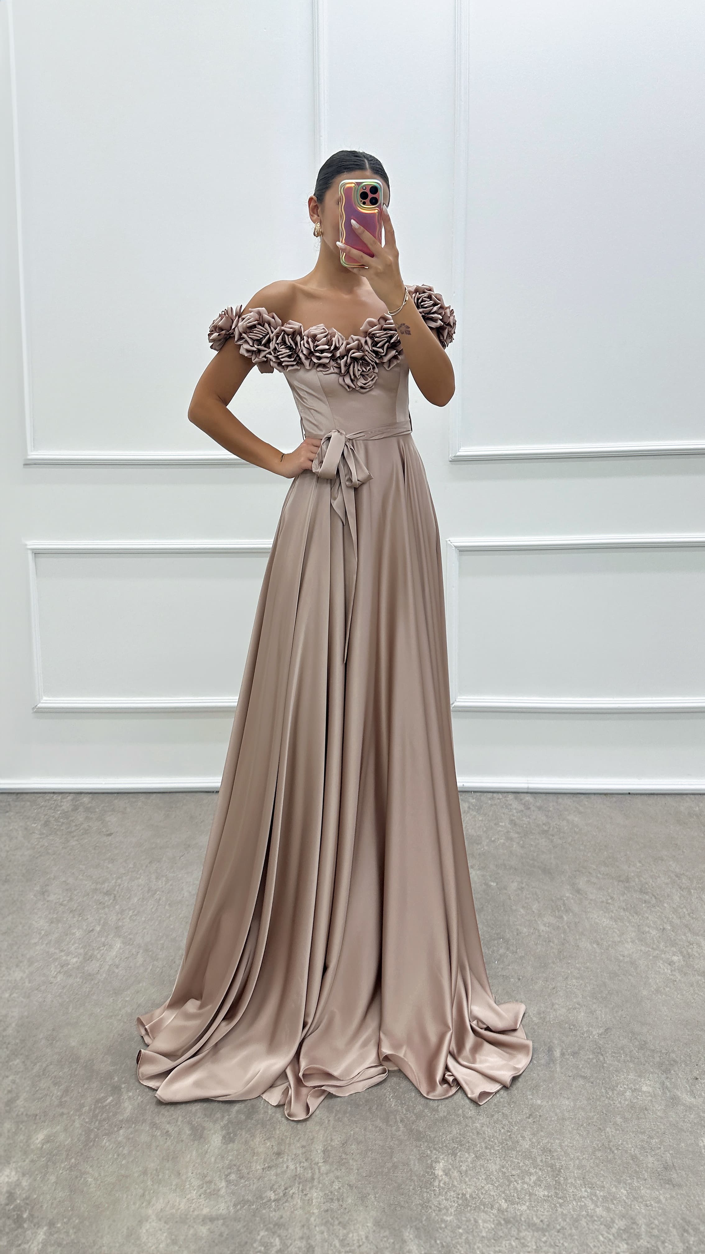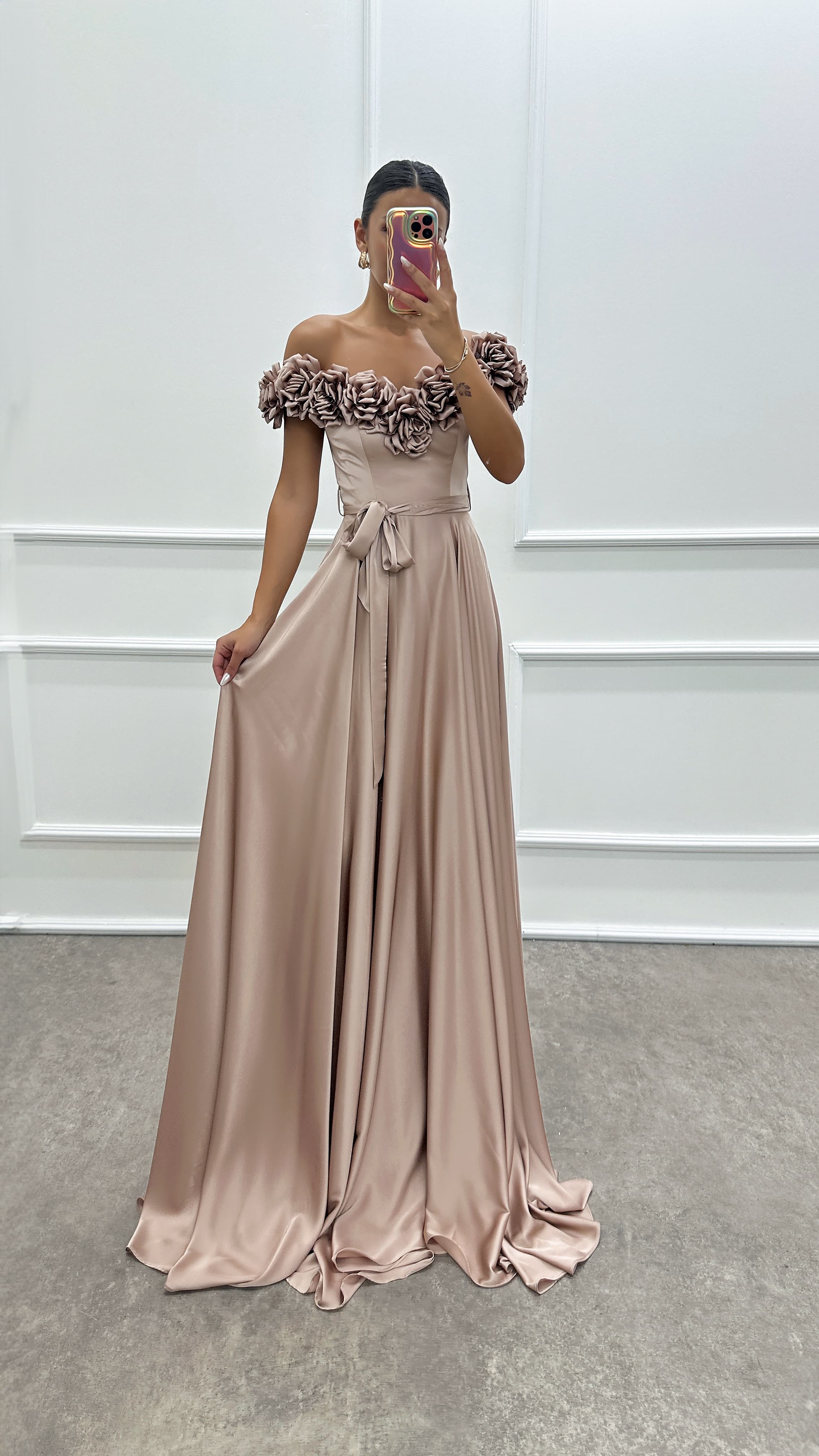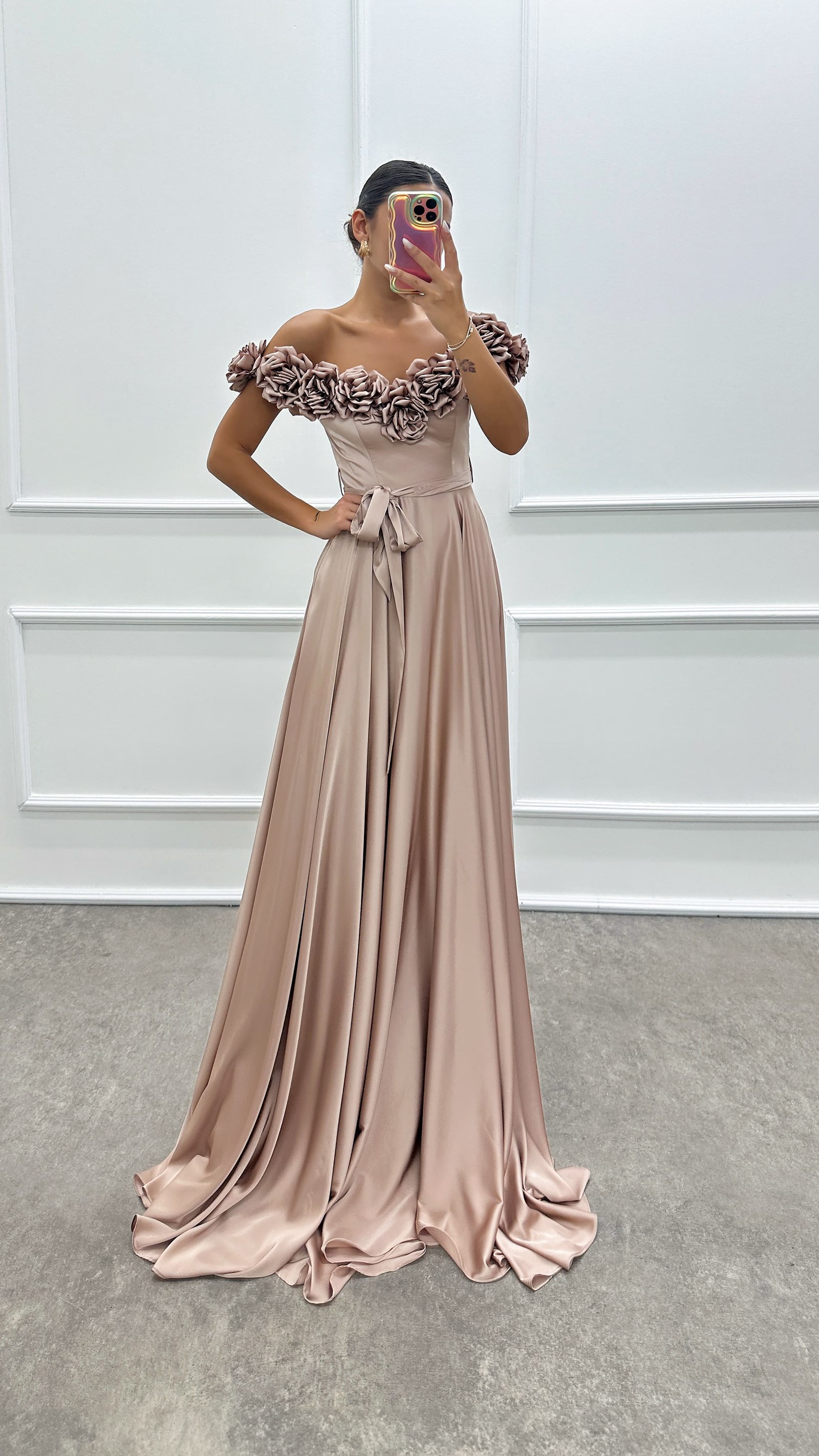 فستان سهرة بتصميم تفاصيل الوردة البيج