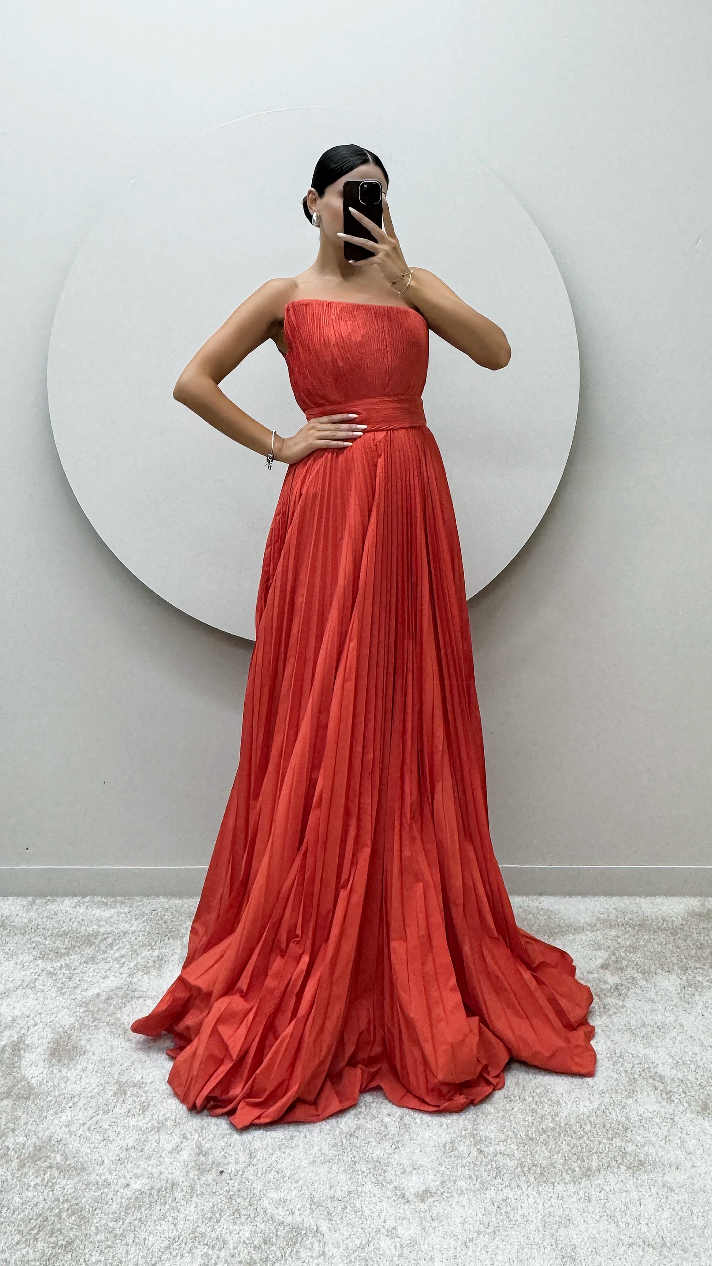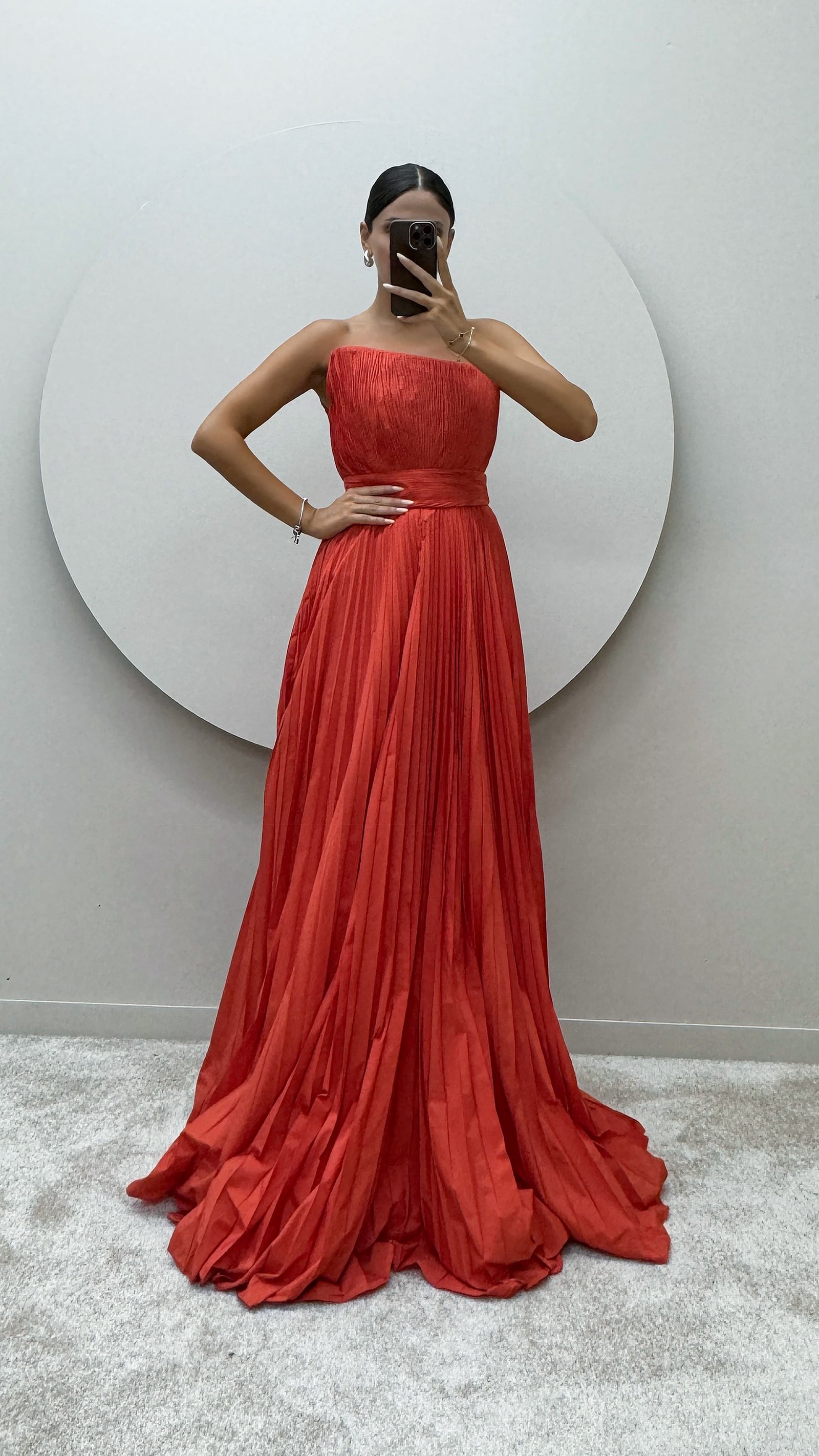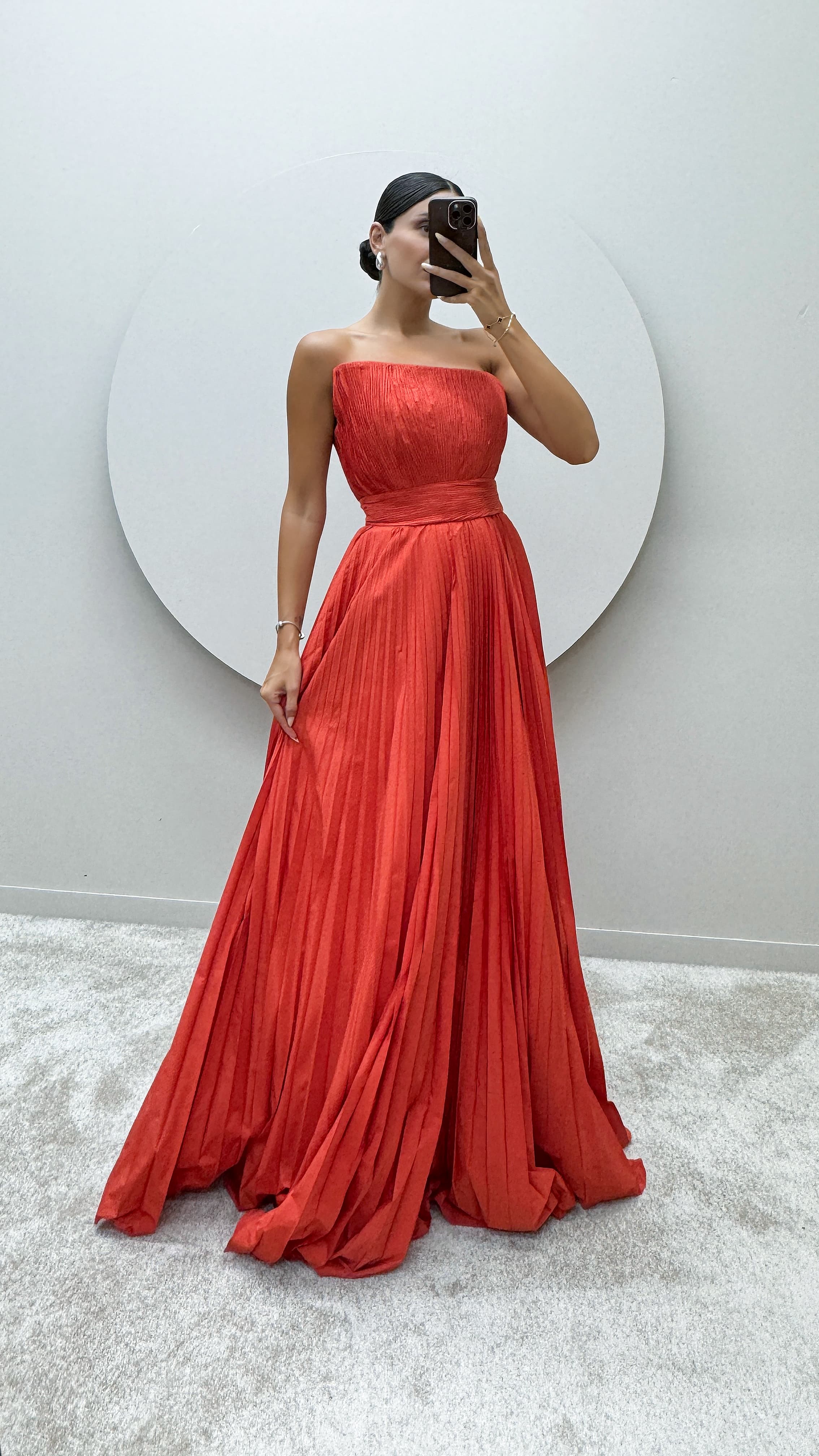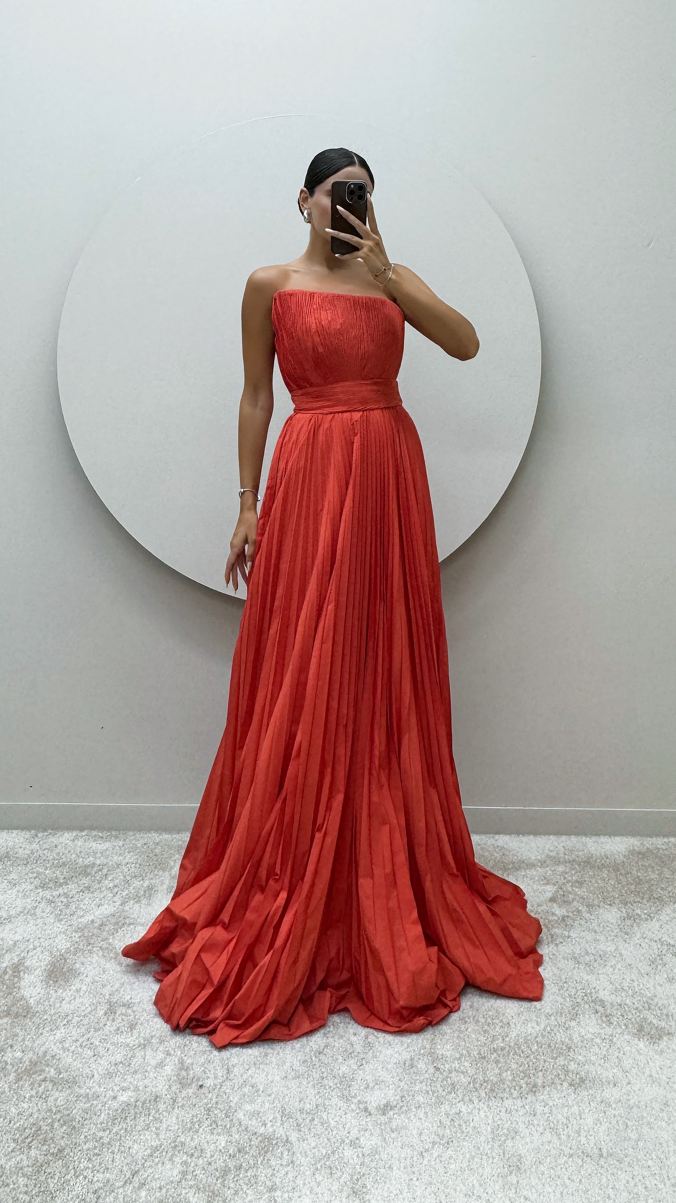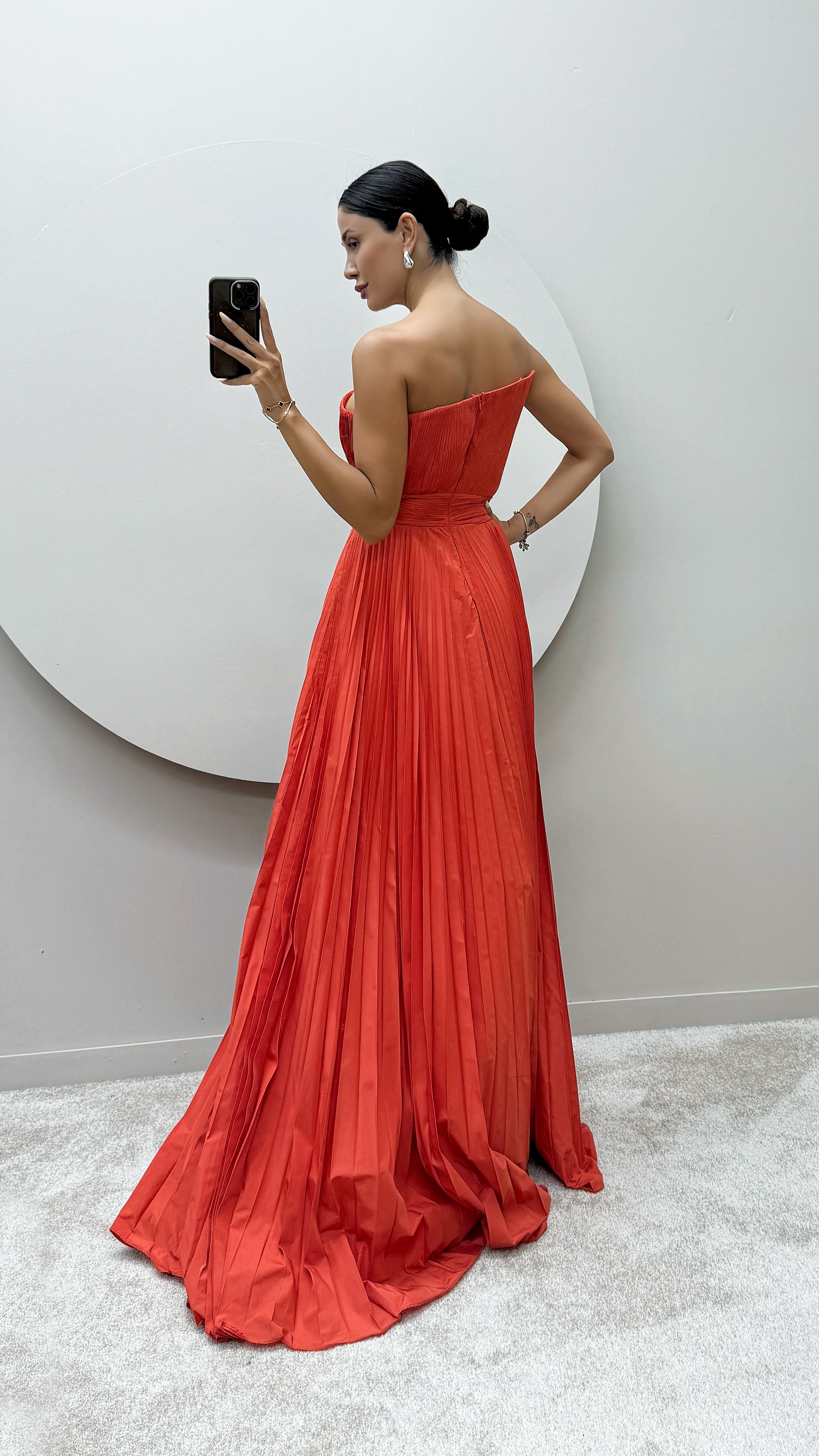 Turuncu İp Askılı Asimetrik Kesim Pliseli Tasarım Elbise