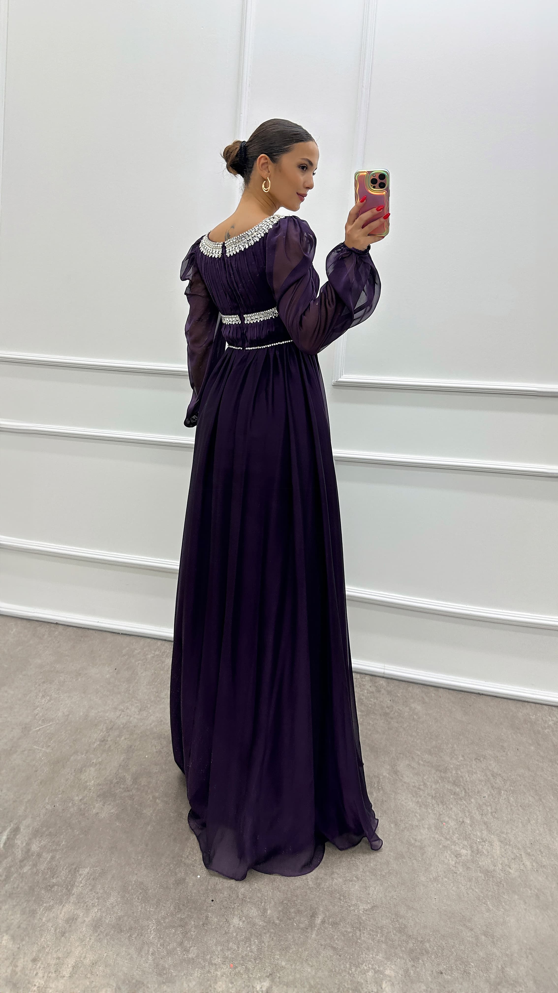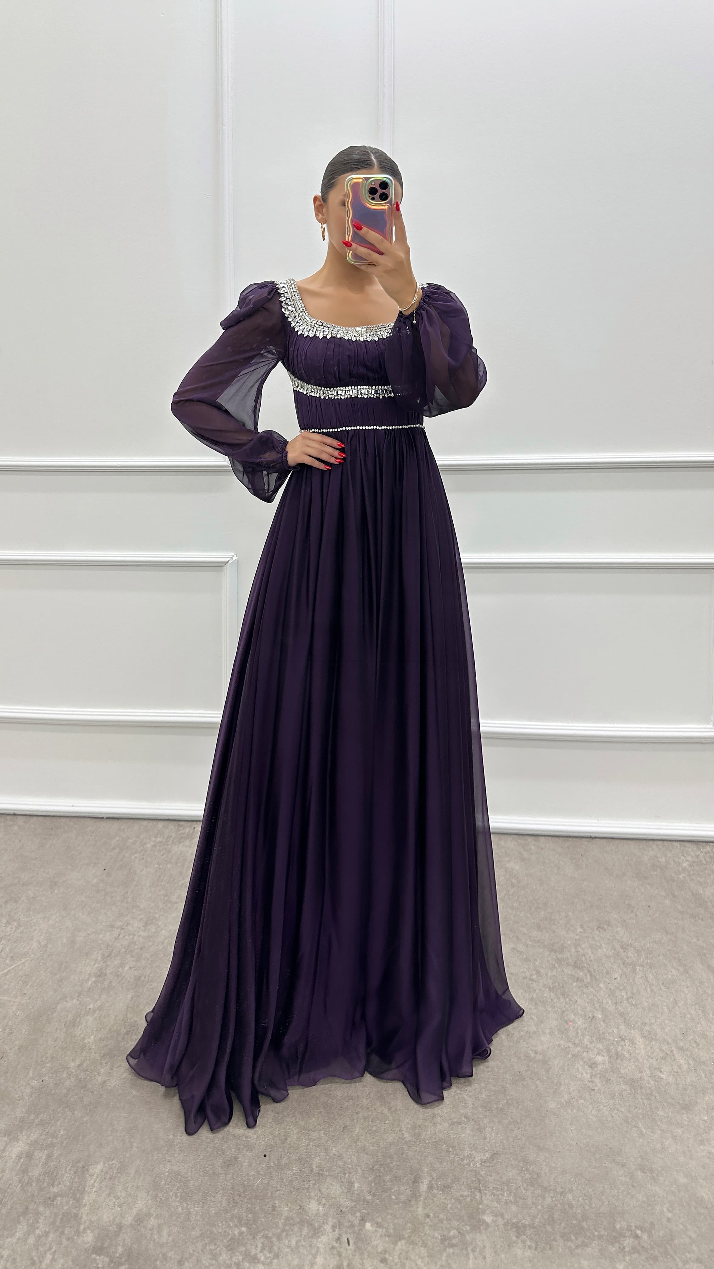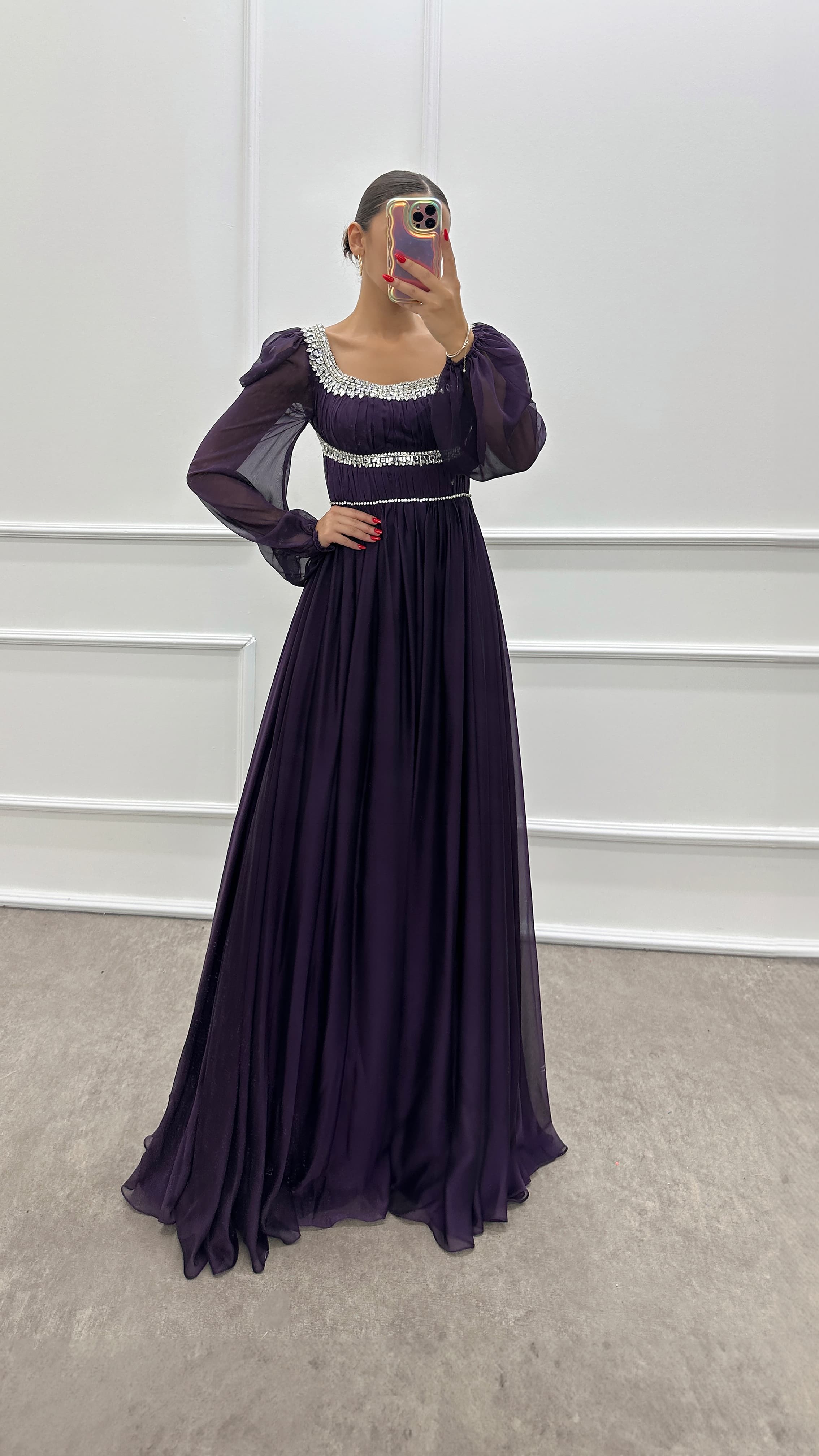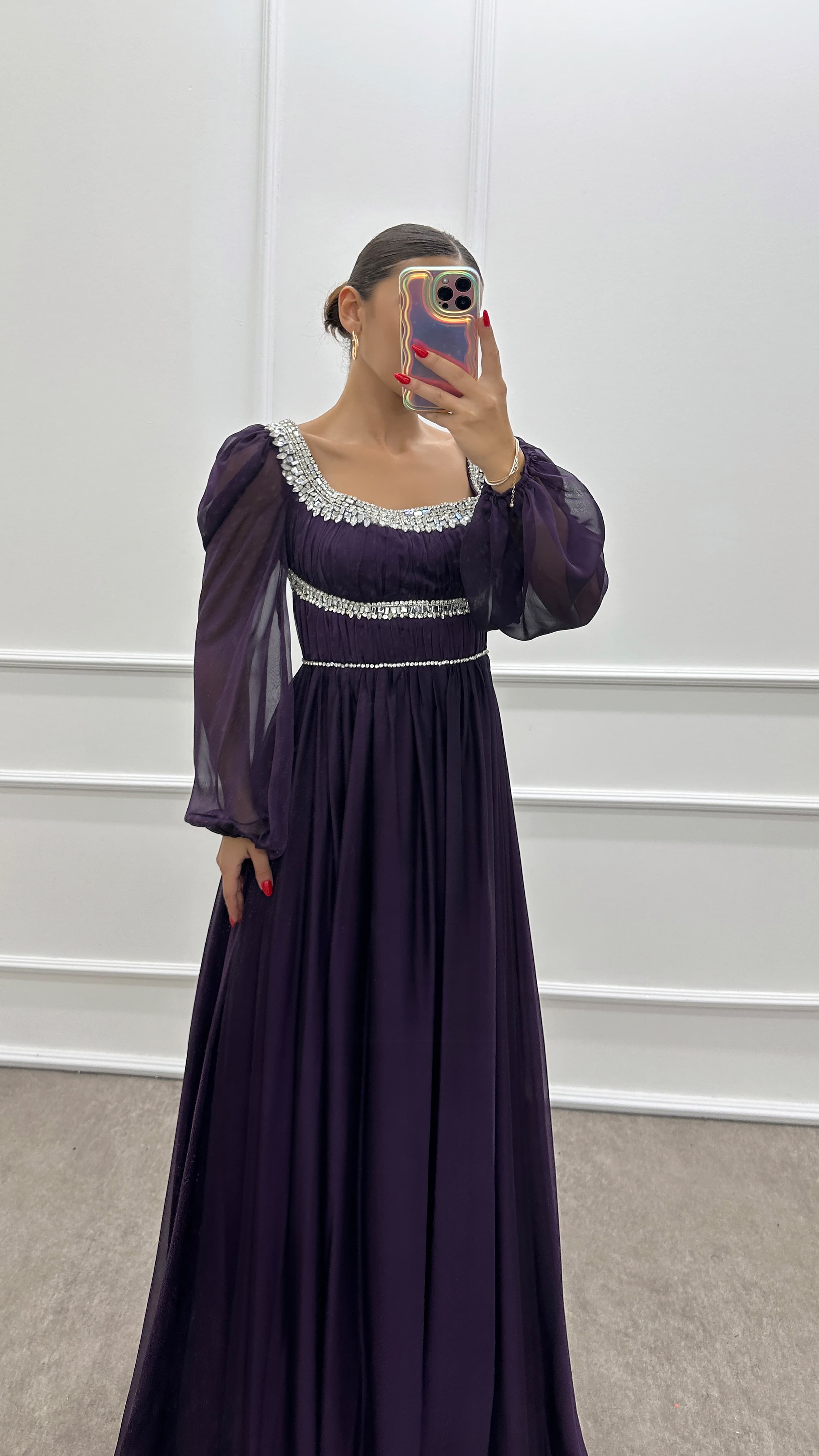 • Mürdüm Göğsü Ve Beli Taş İşlemeli Balon Kol Tasarım Elbise