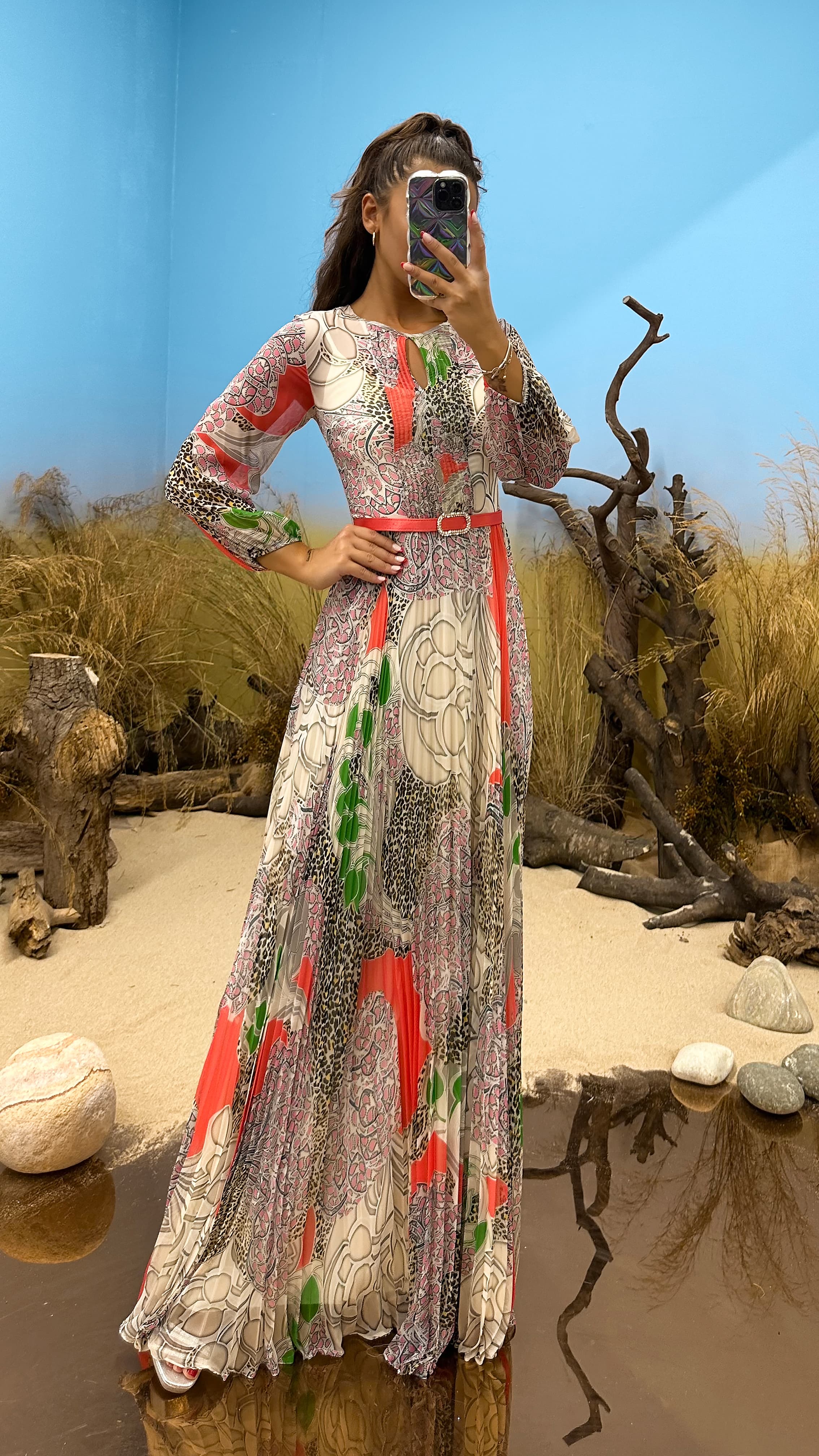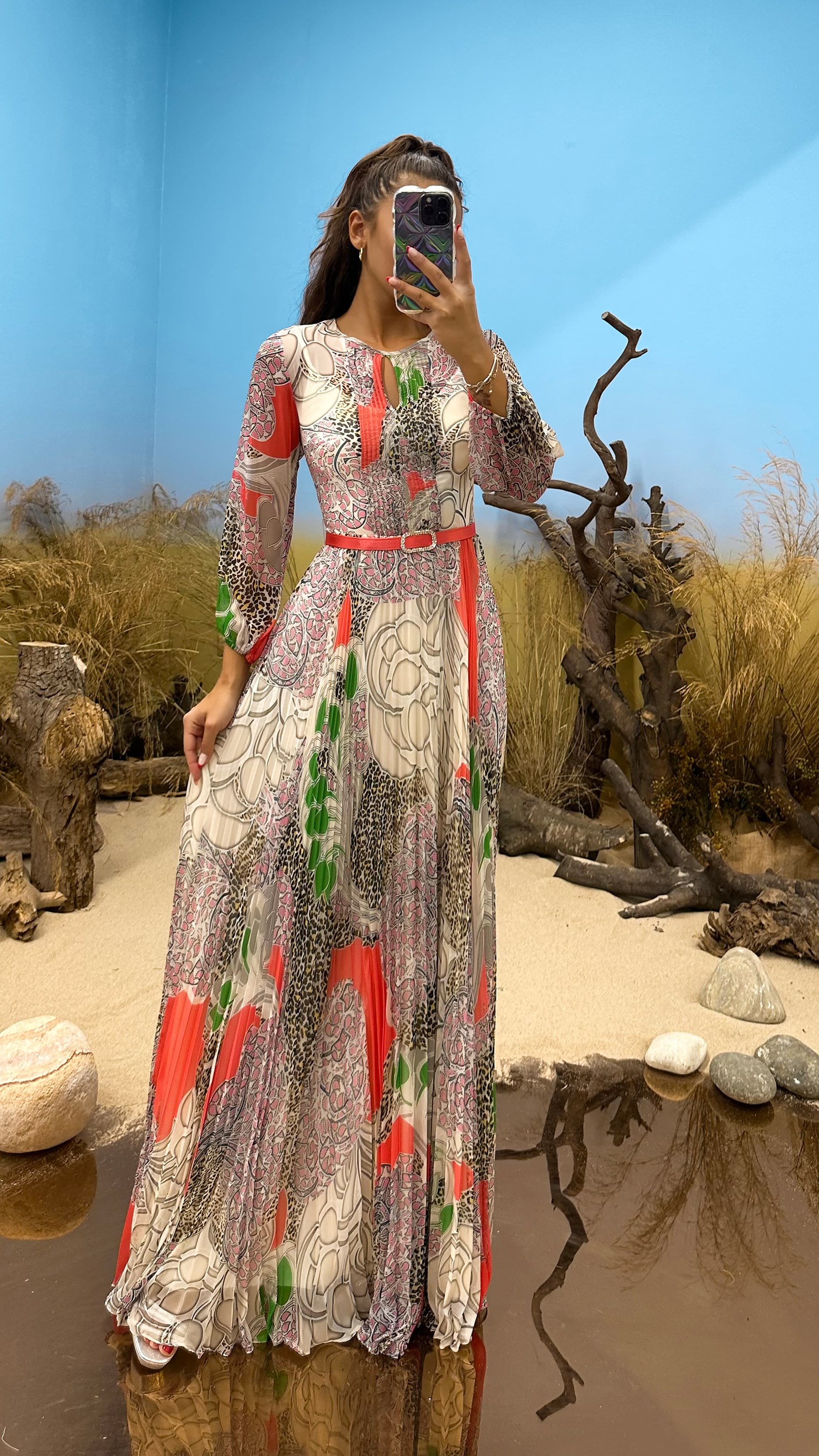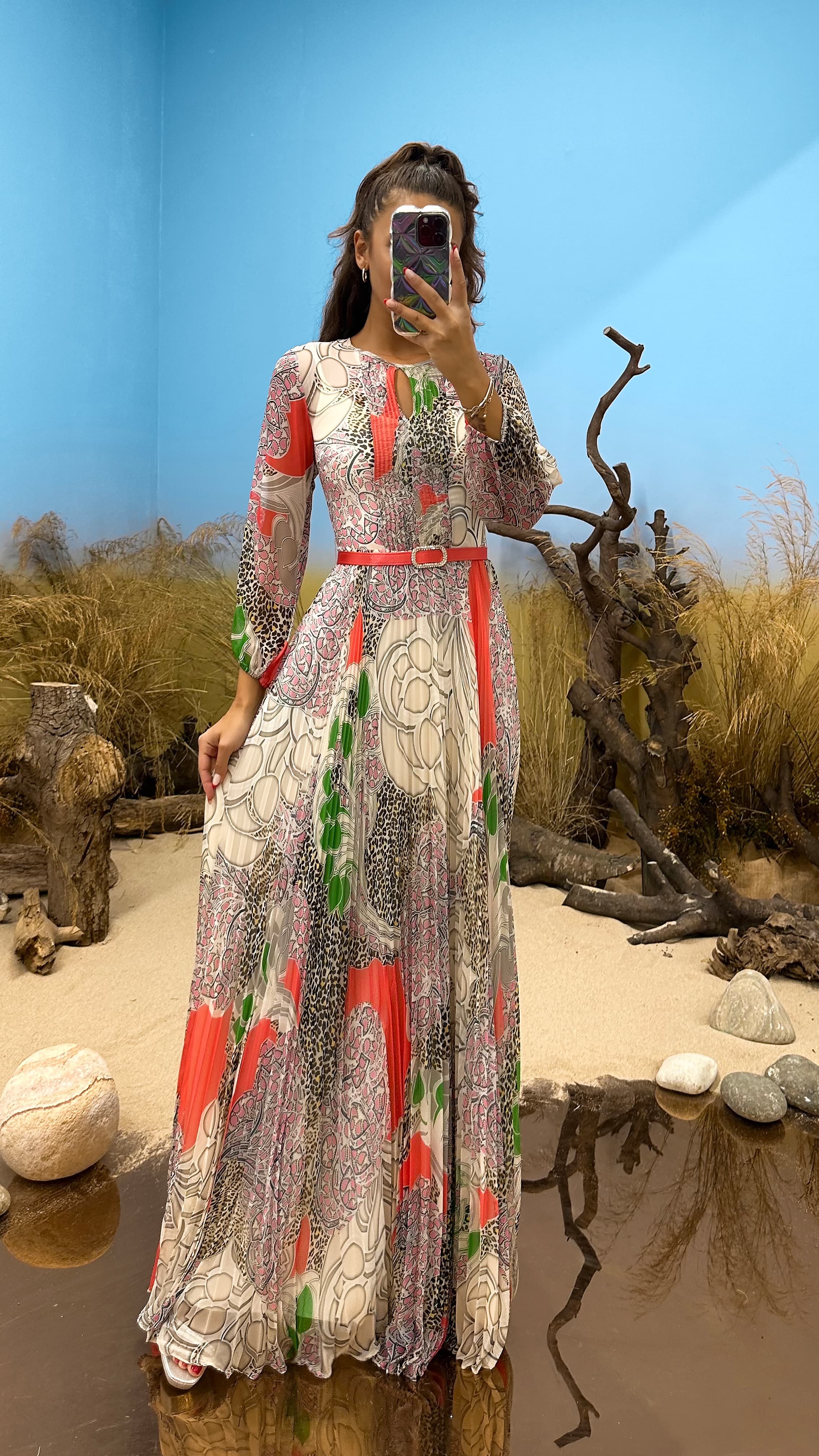 • Oranj Uzun Kollu Desenli Şifon Abiye Elbise