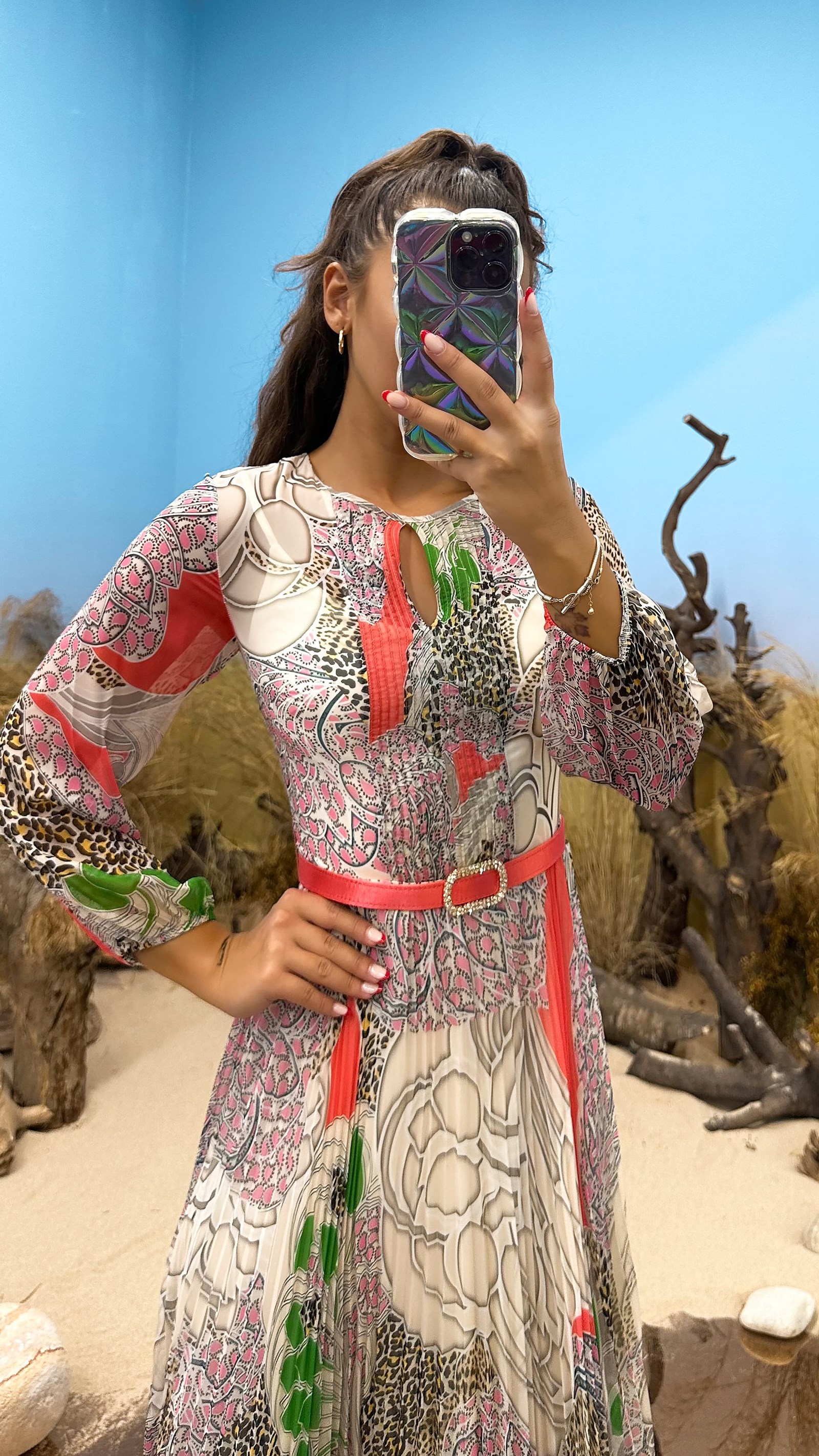 • Pembe Uzun Kollu Desenli Şifon Abiye Elbise