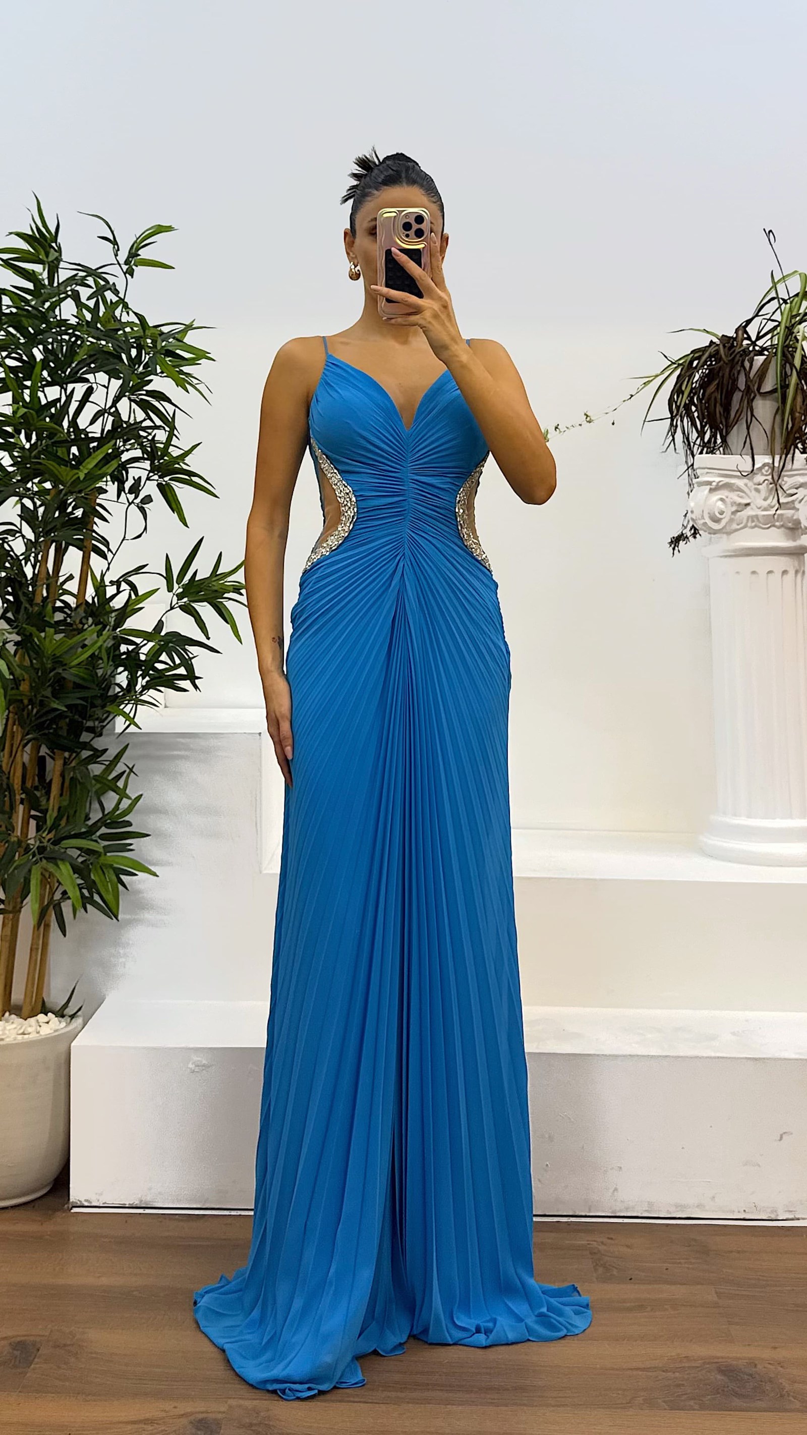 • Mavi İp Askılı Piliseli Abiye Elbise