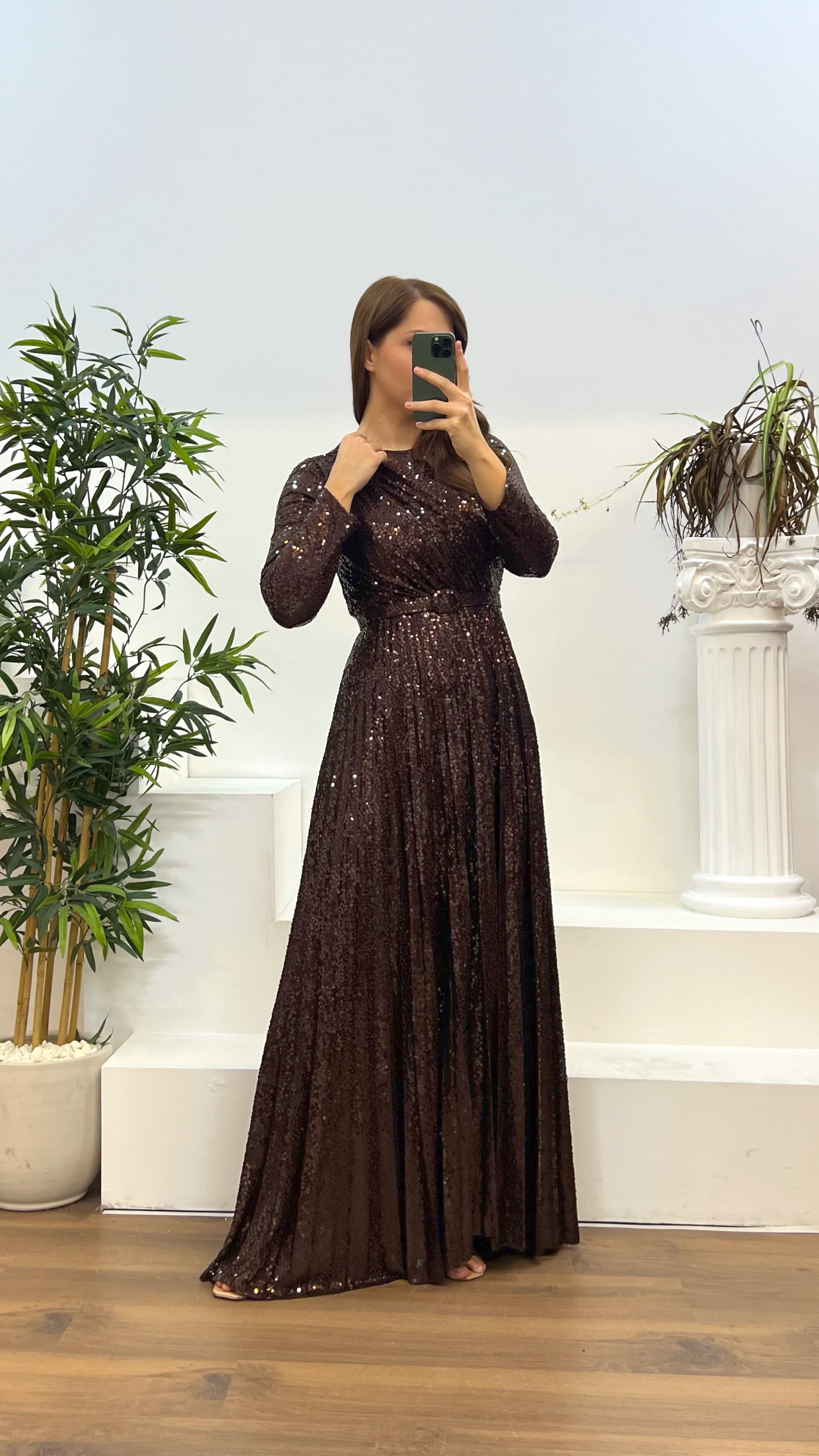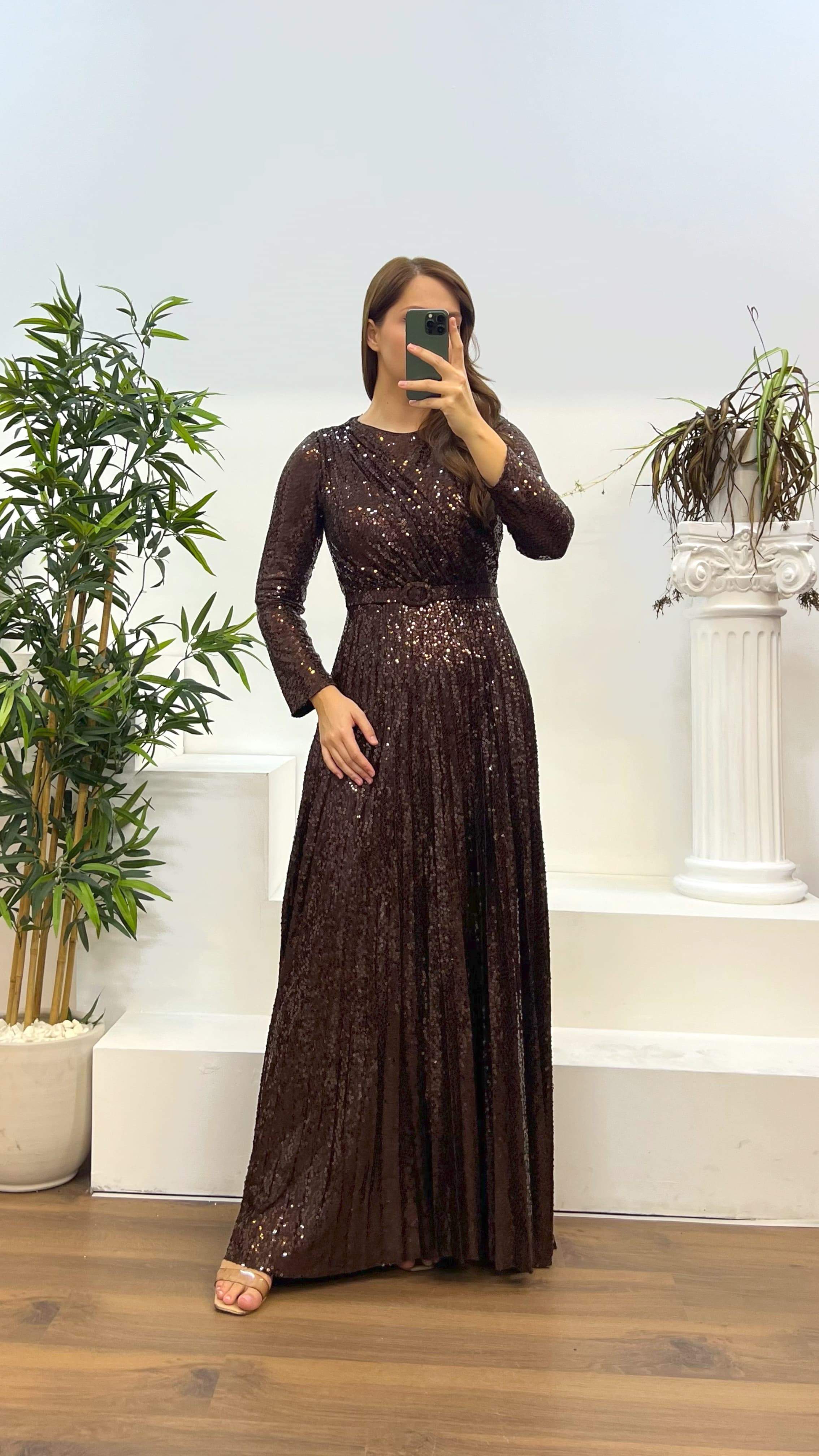 Kahverengi Yuvarlak Yaka Pul Payet Büyük Beden Abiye Elbise