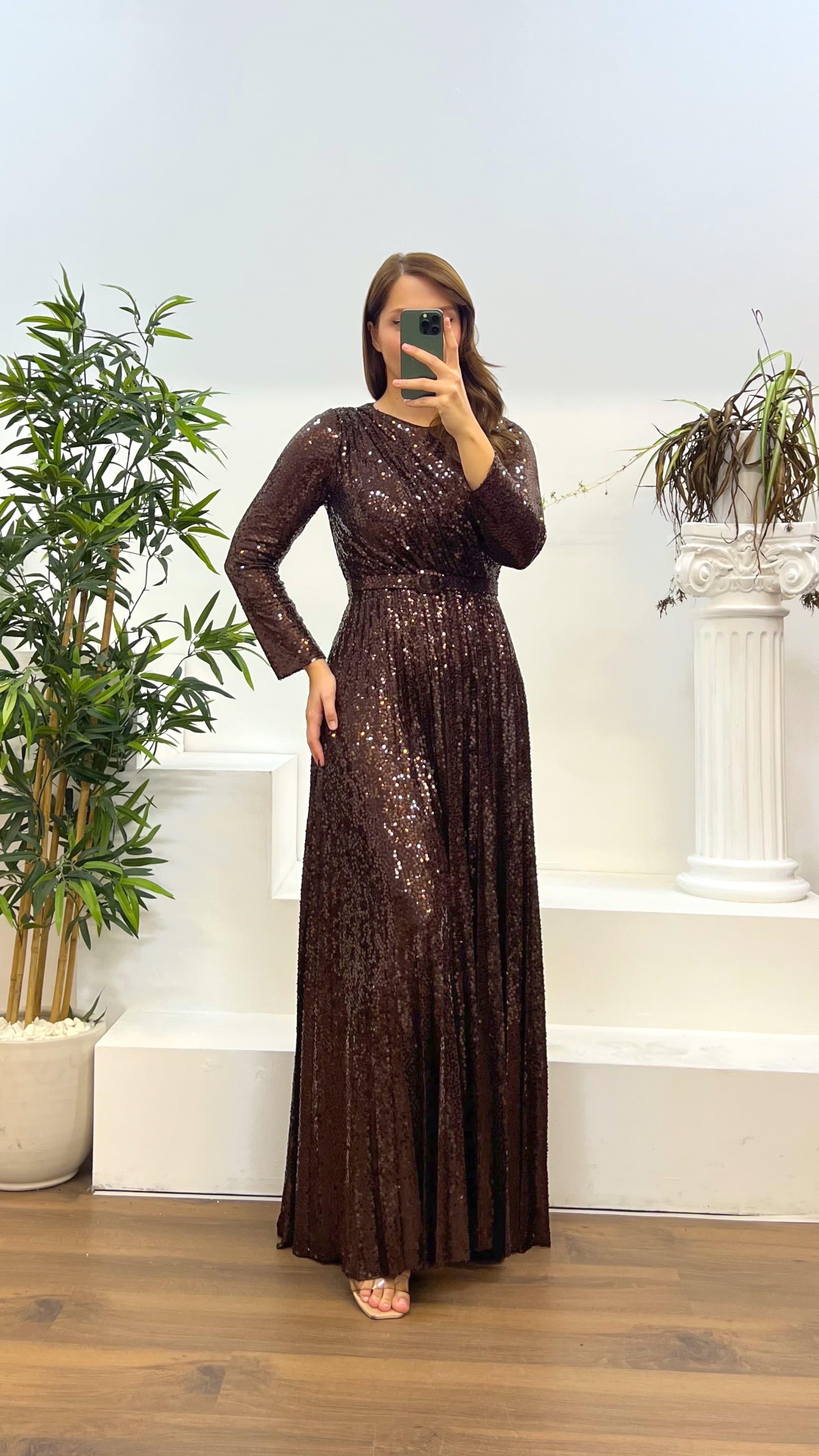 • Kahverengi Yuvarlak Yaka Pul Payet Büyük Beden Abiye Elbise