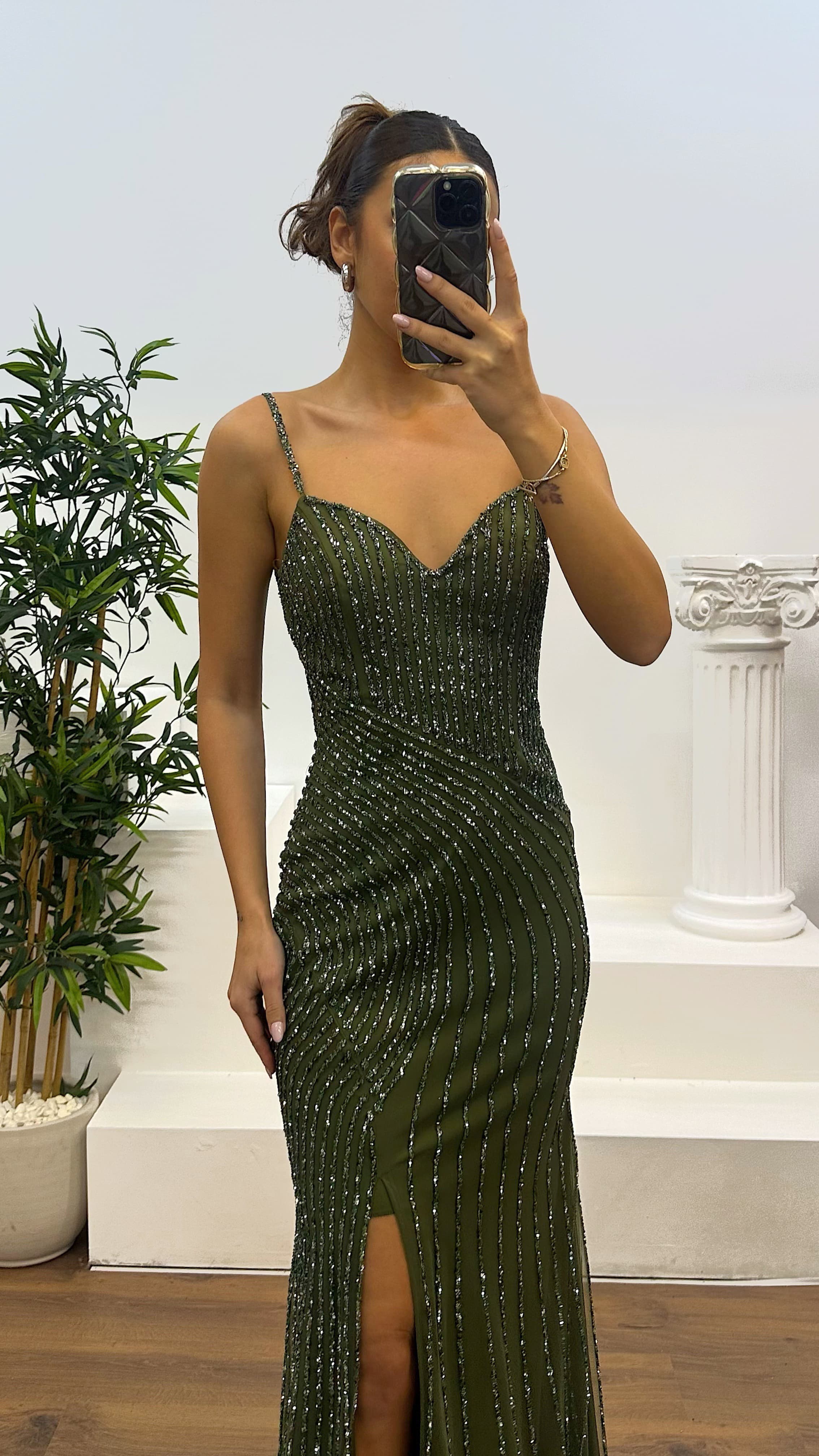 Haki İp Askılı İşlemeli Abiye Tasarım Abiye Elbise