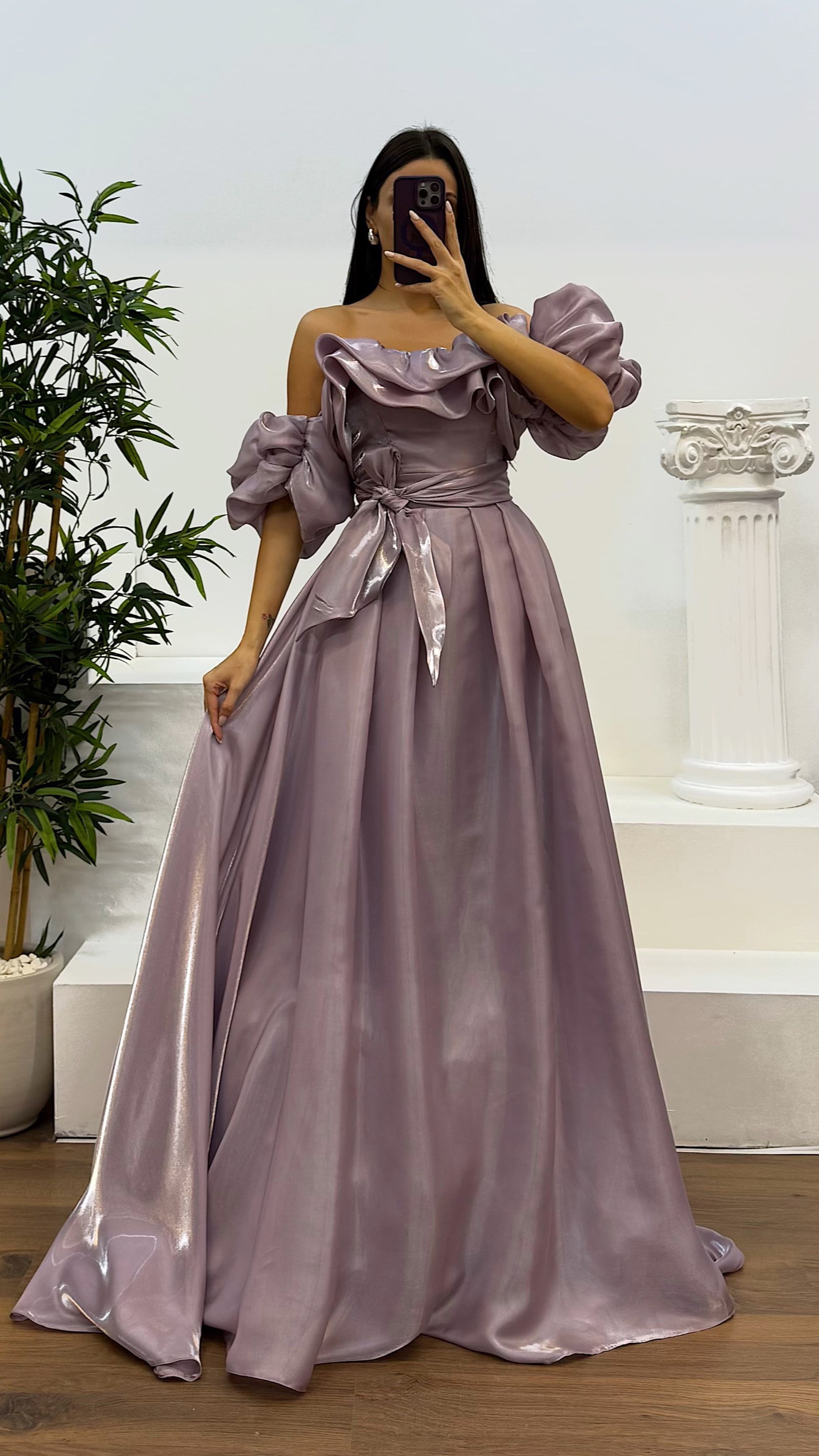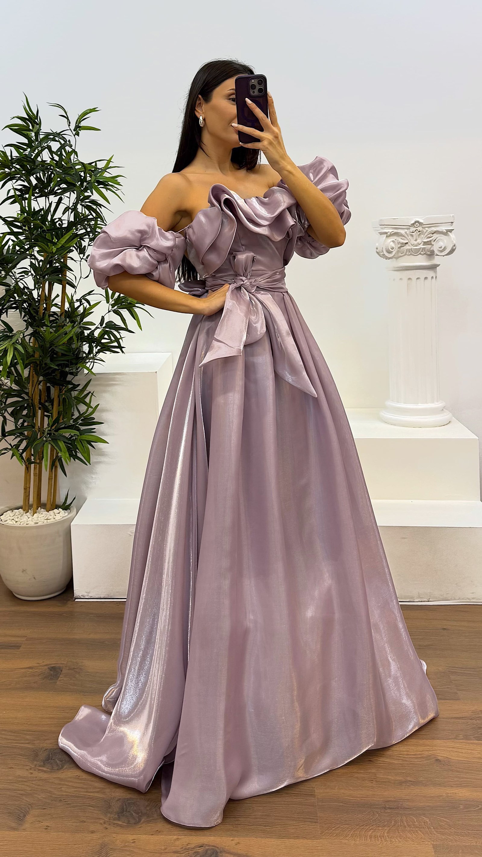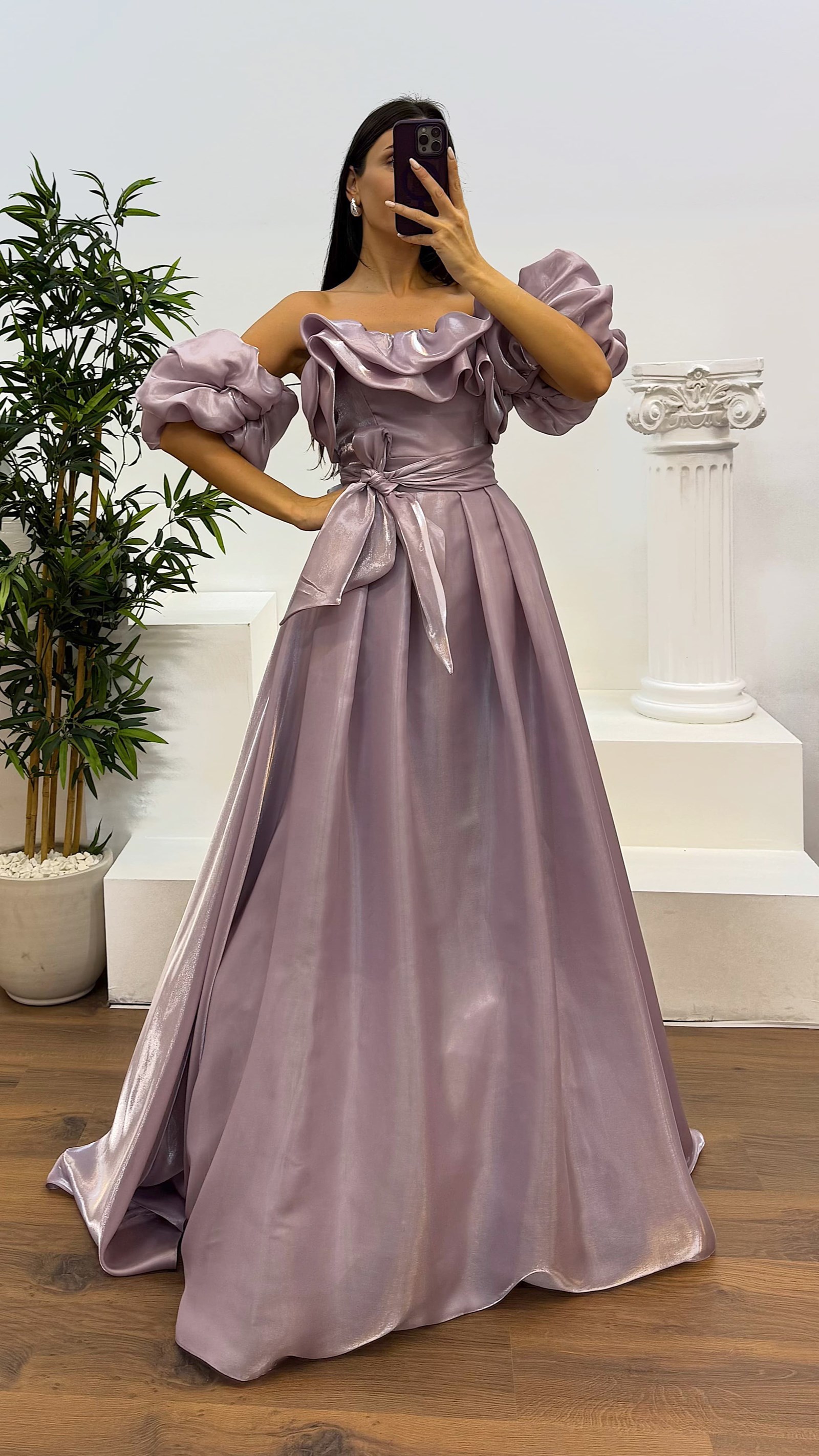 • Lila Balon Kol Valonlu Kabarık Abiye Elbise
