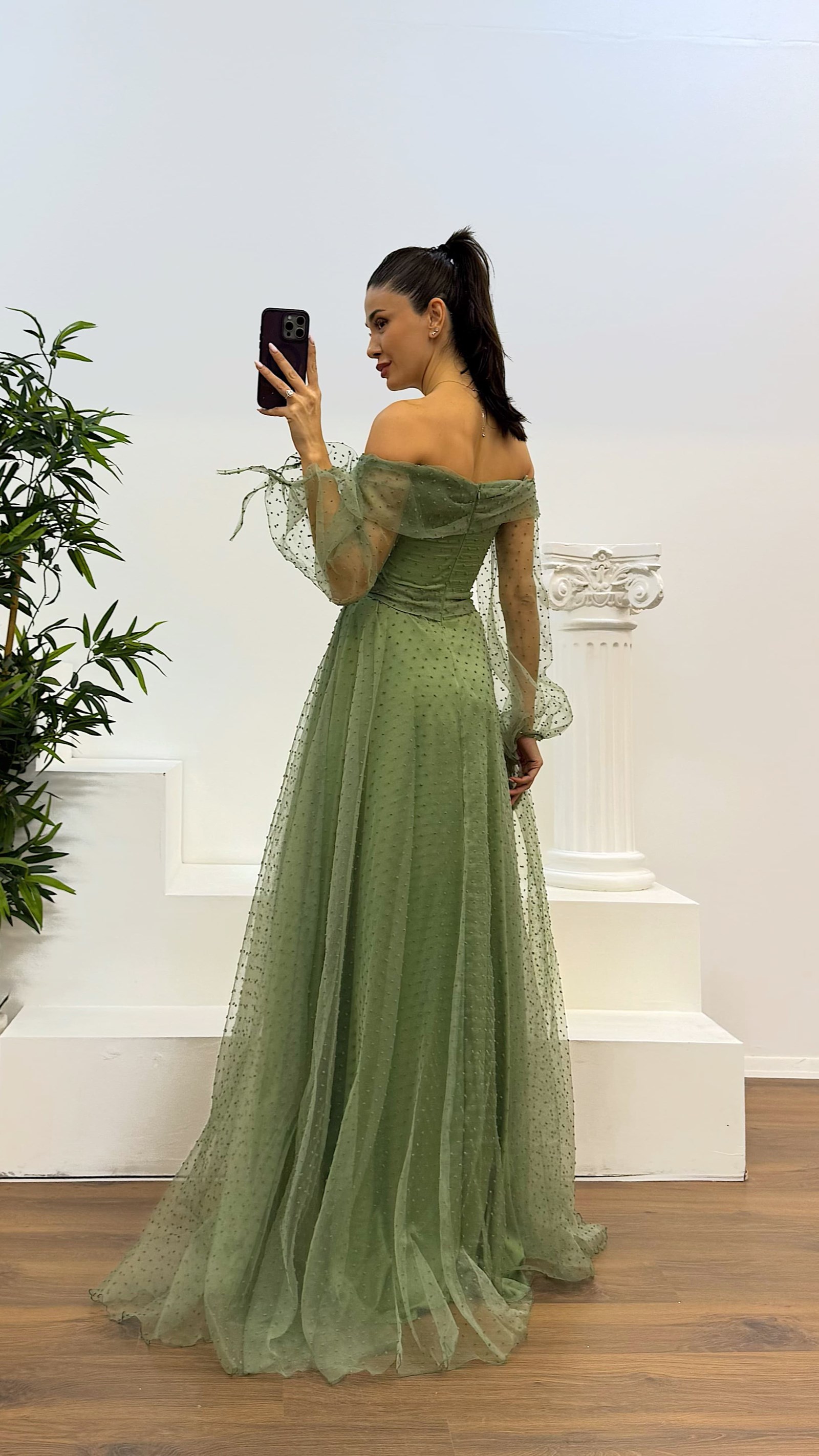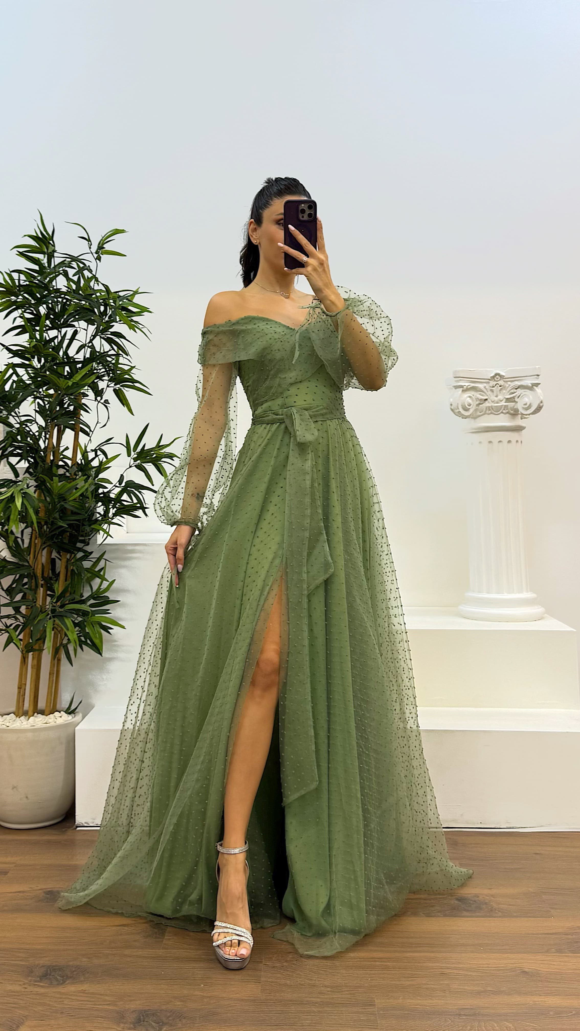 • Gül Kurusu Kuşaklı Tül Abiye Elbise