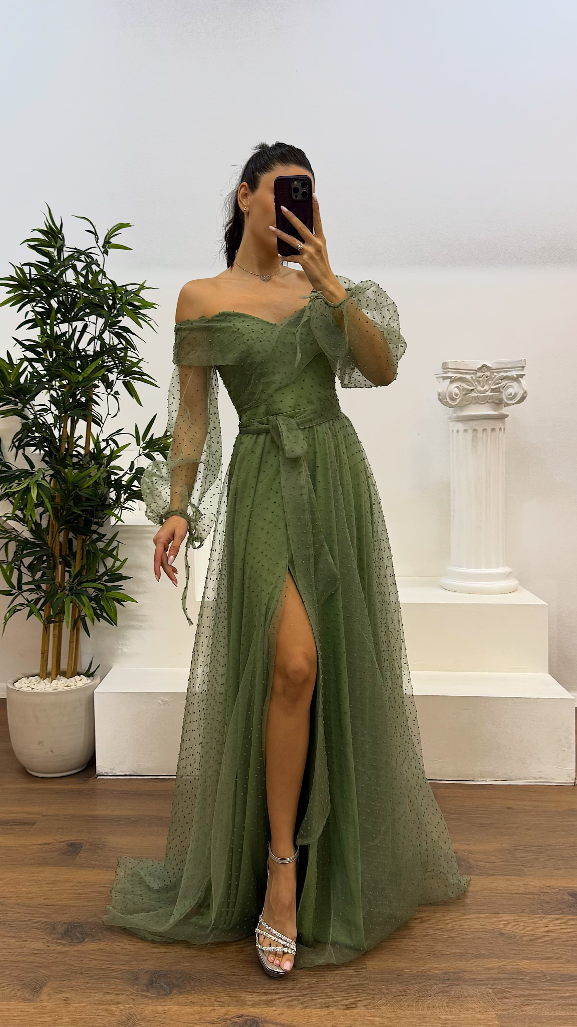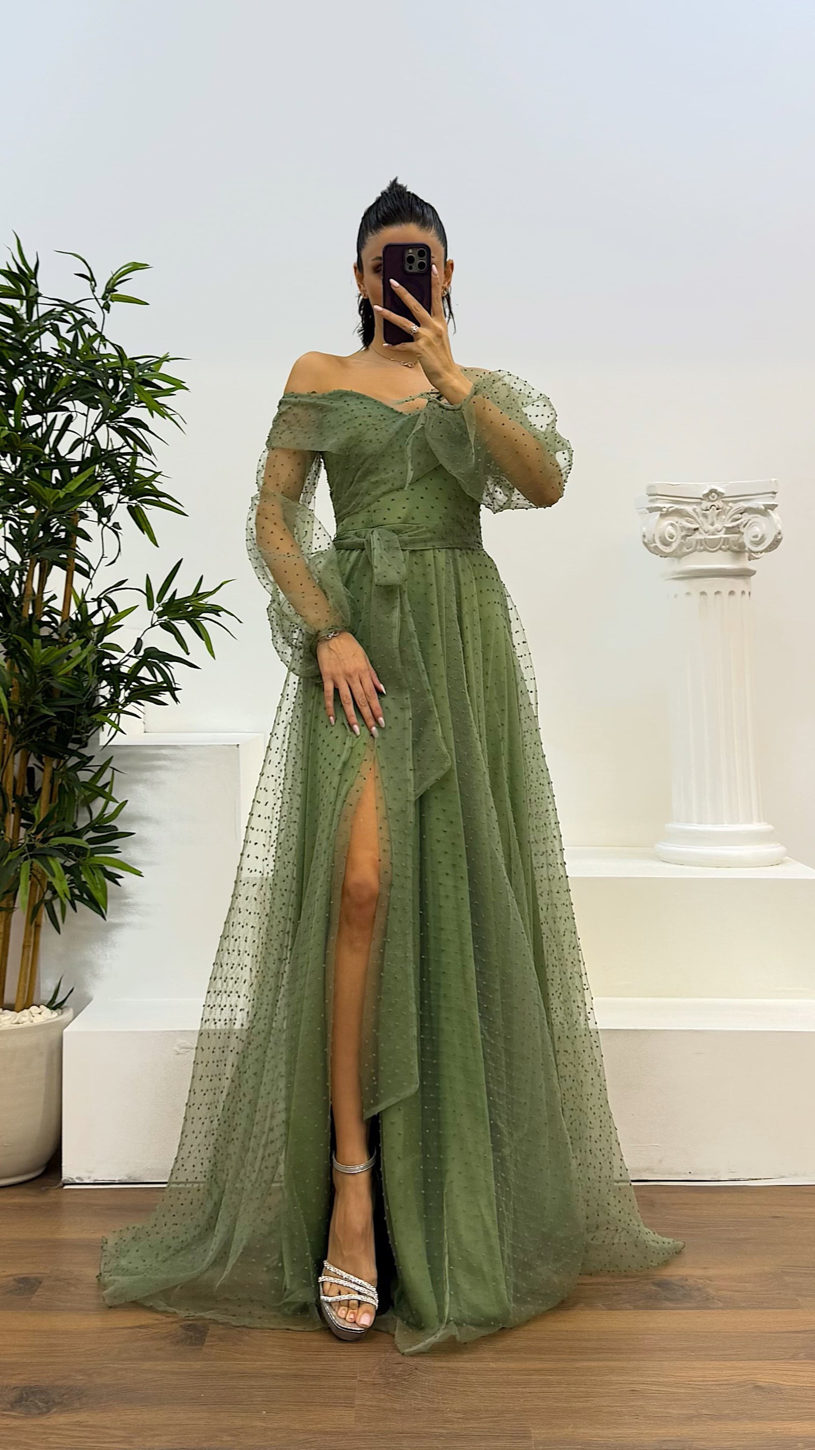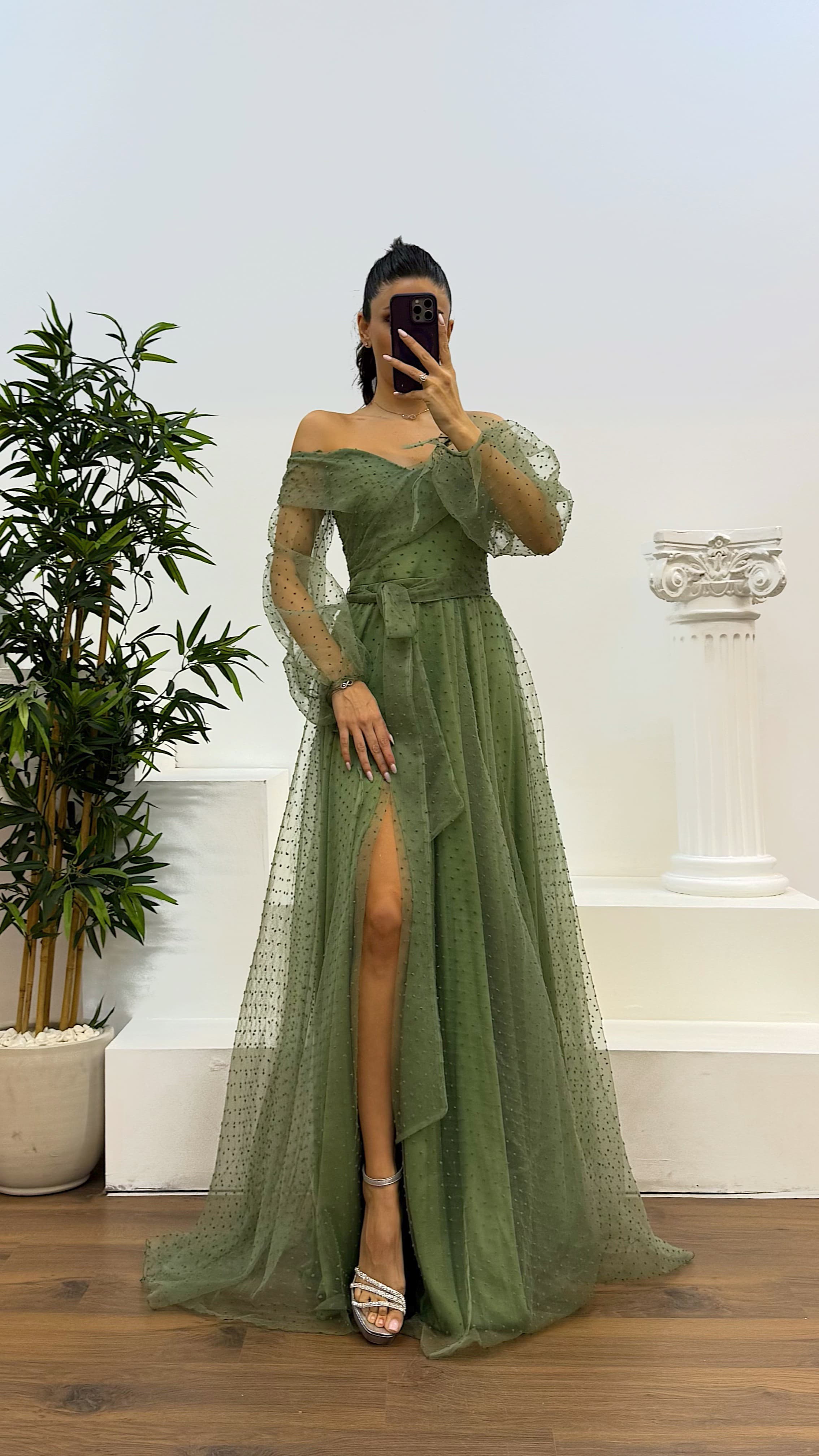 فستان سهرة بشريط على شكل تُلالمنتج متوافق مع المقاسات من 36 إلى 42، مزود بحشوة صدر، بطانة، إغلاق خلفي بسحاب، شق جانبي، وتصميم بشريط.طول المنتج: 160 سم.نوع القماش: تُل 3% ليكرا 97% بوليستر.