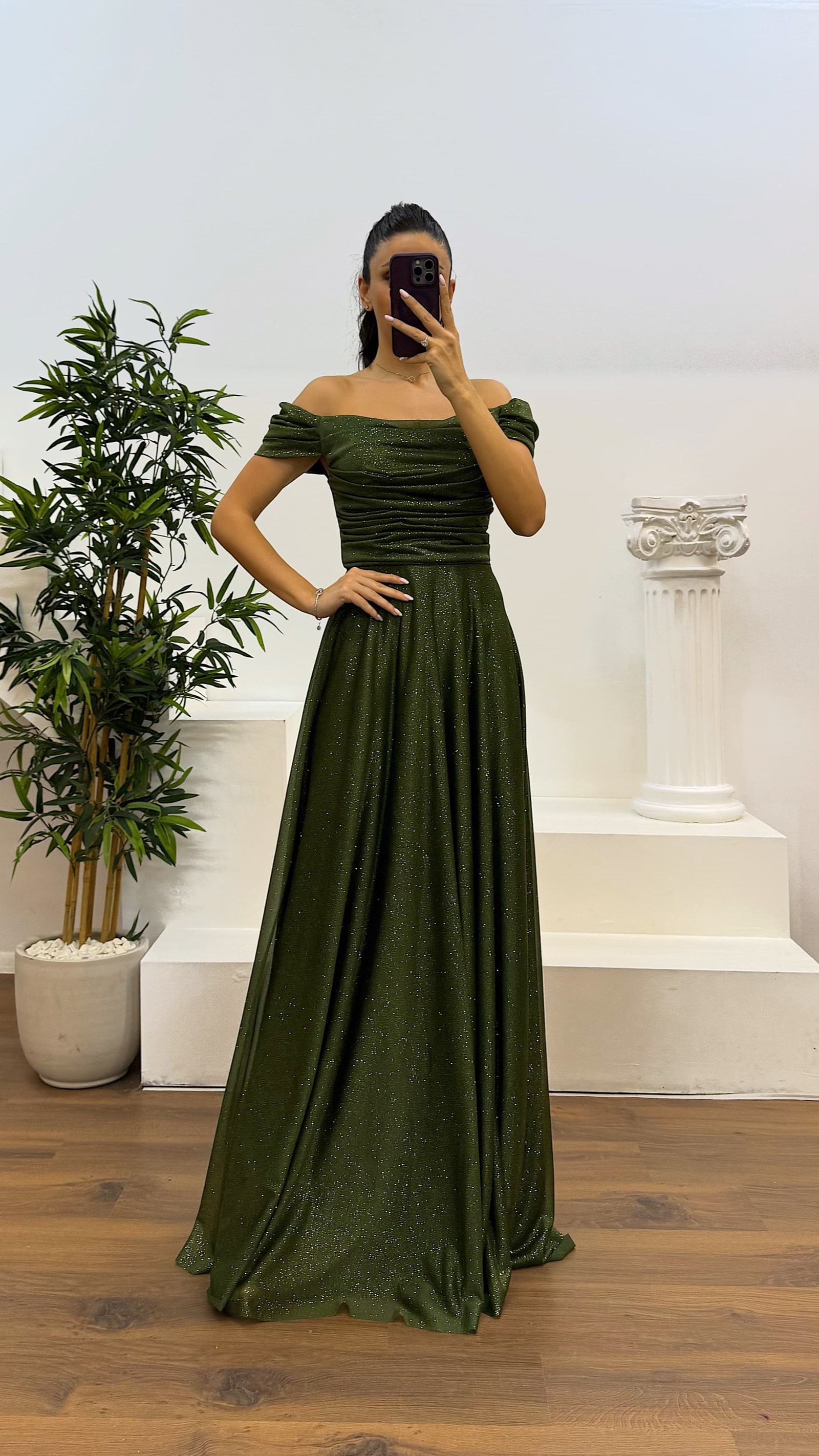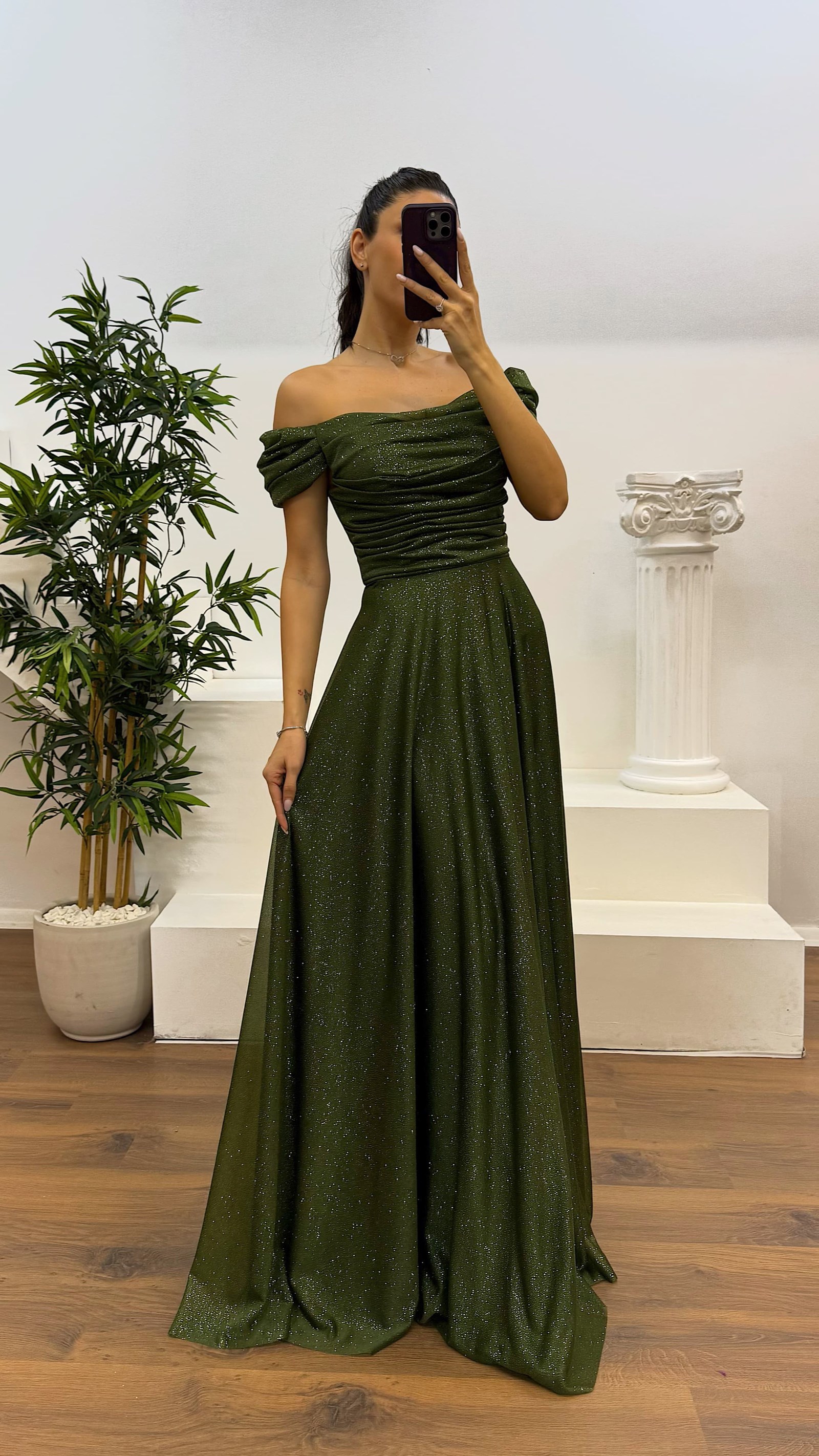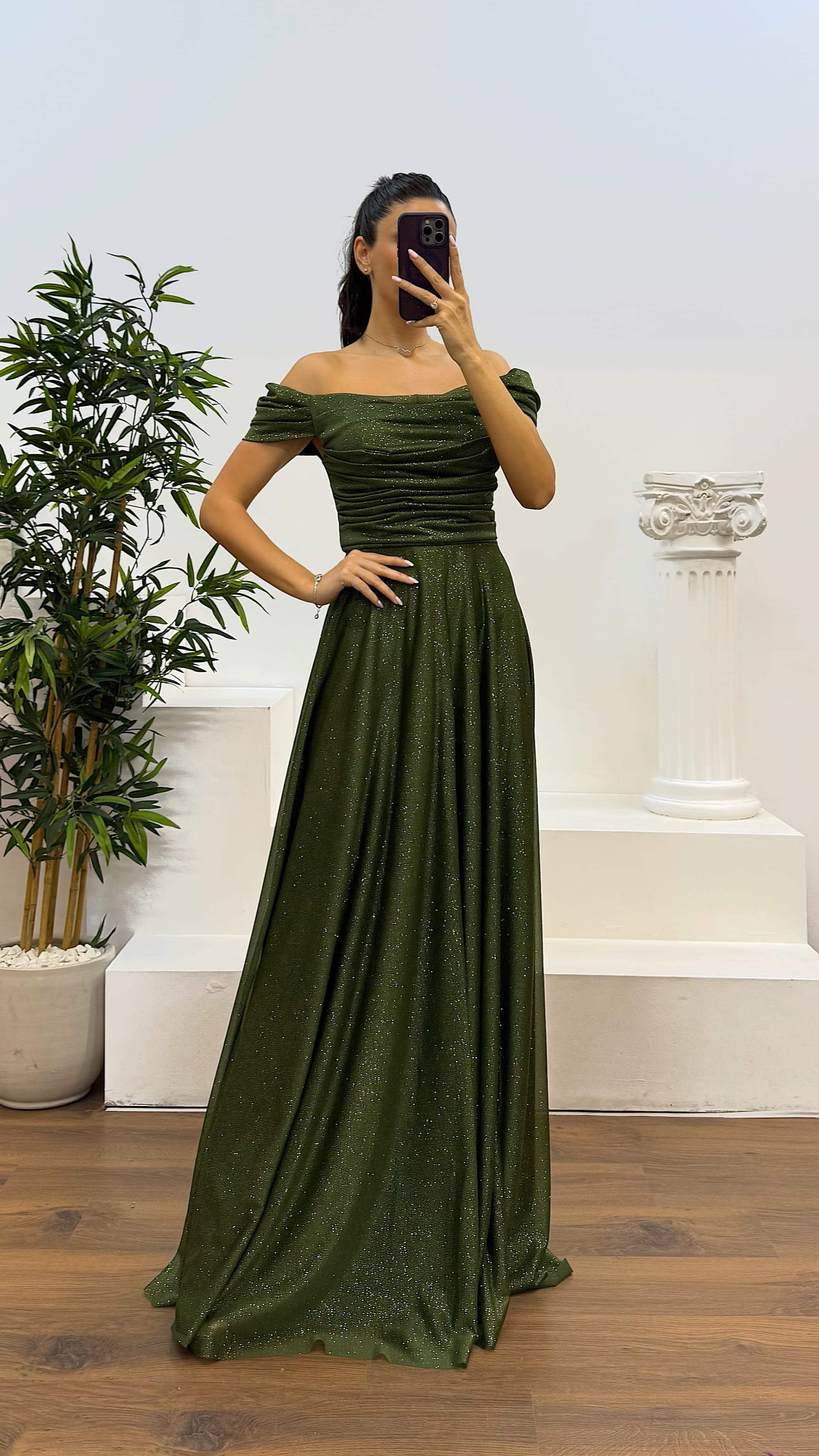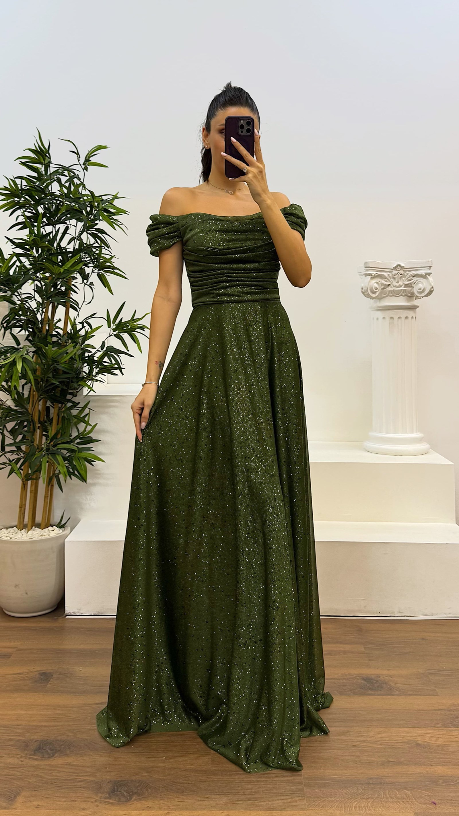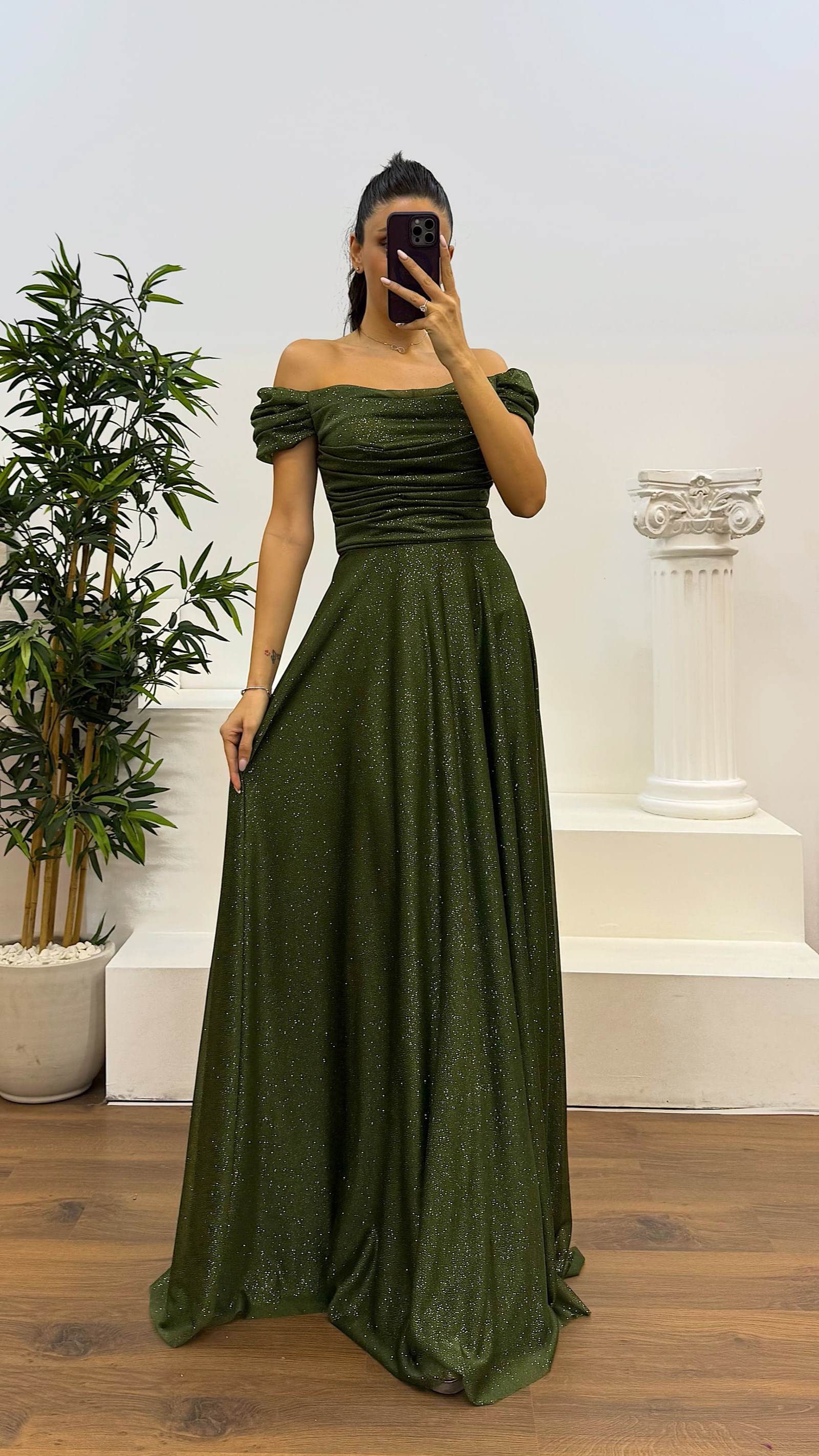 فستان سهرة بثنيات على الصدر باللون الكاكي