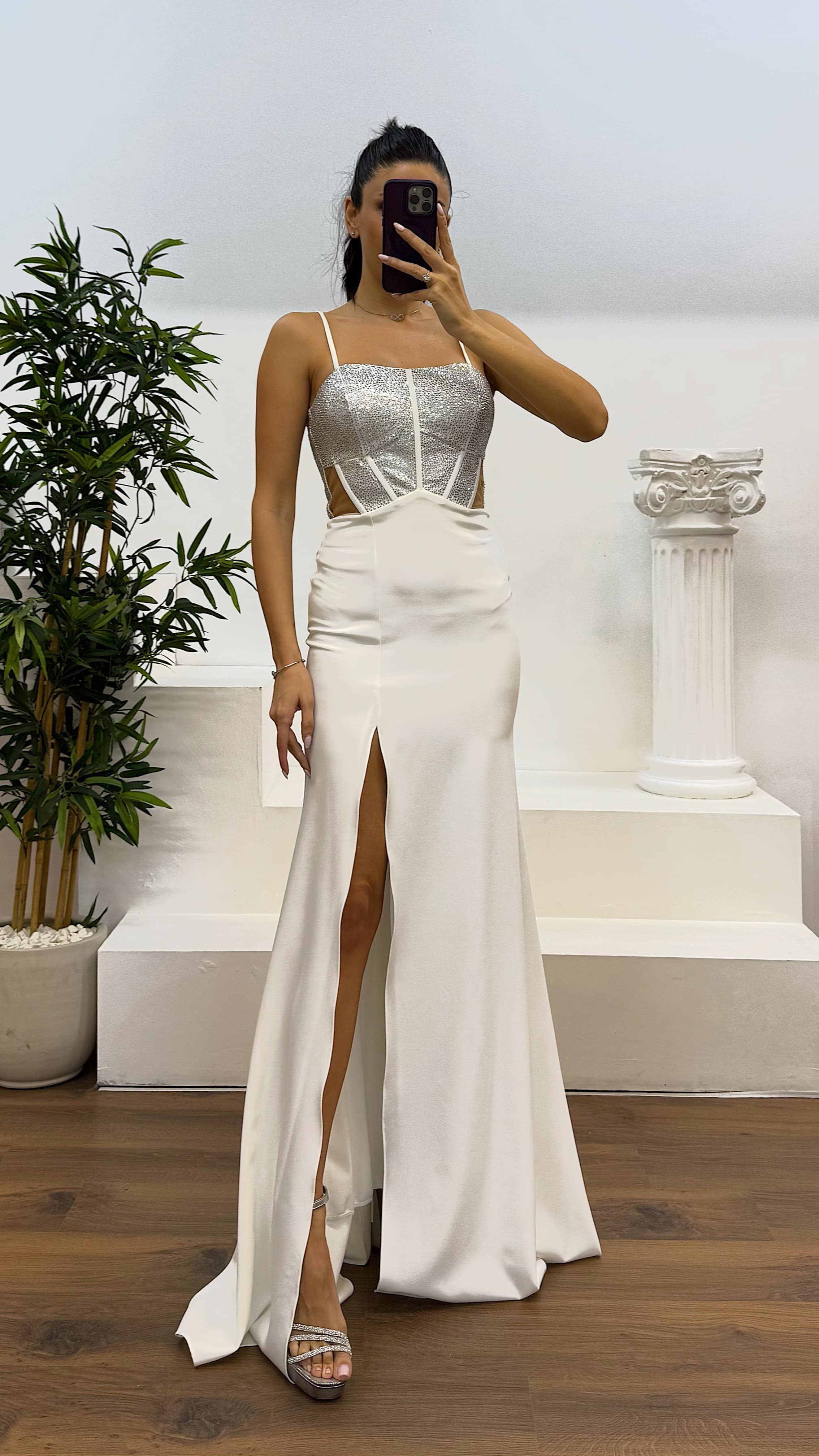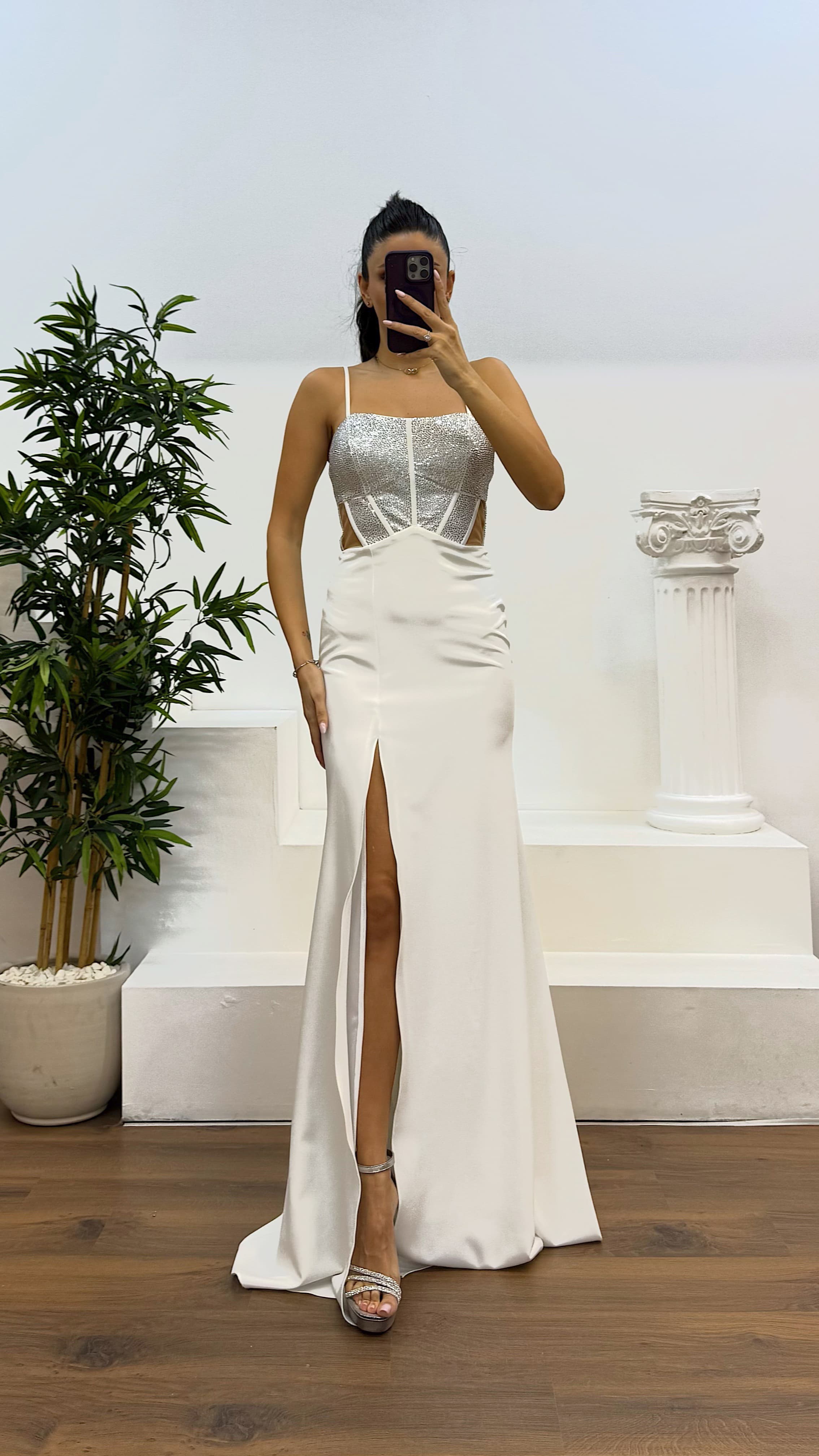 • Kemik İp Askılı Transparan Detay Abiye Elbise