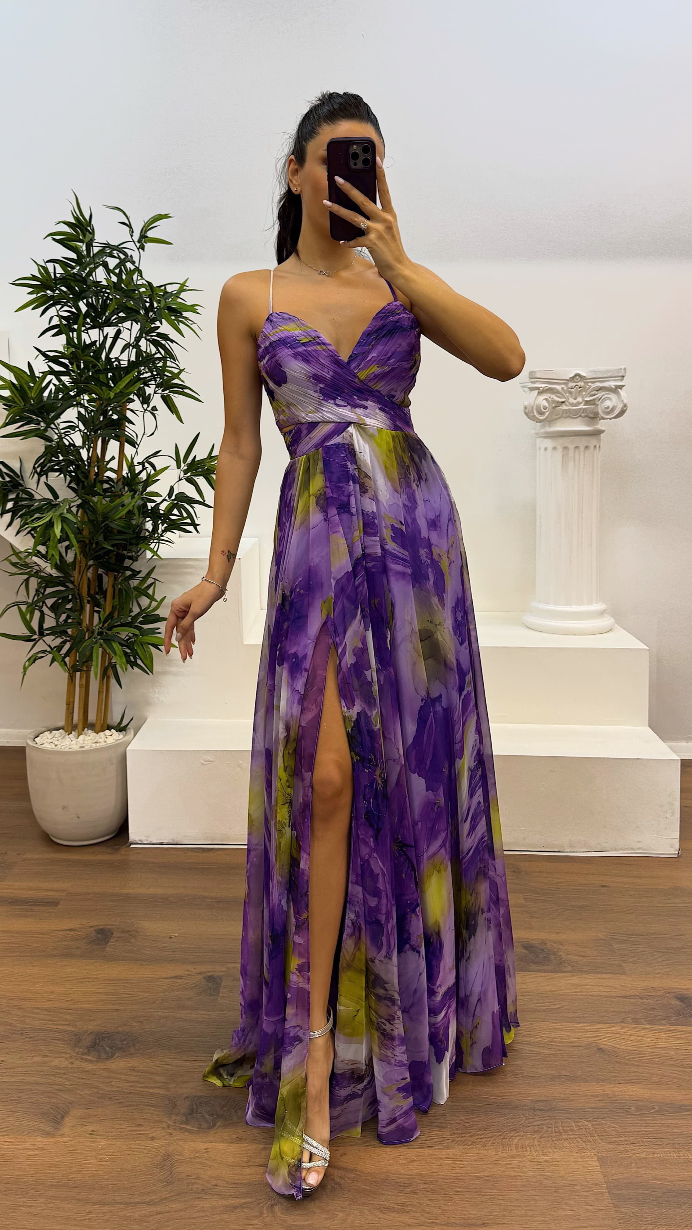 • Mor İp Askılı Sırt Detay Abiye Elbise