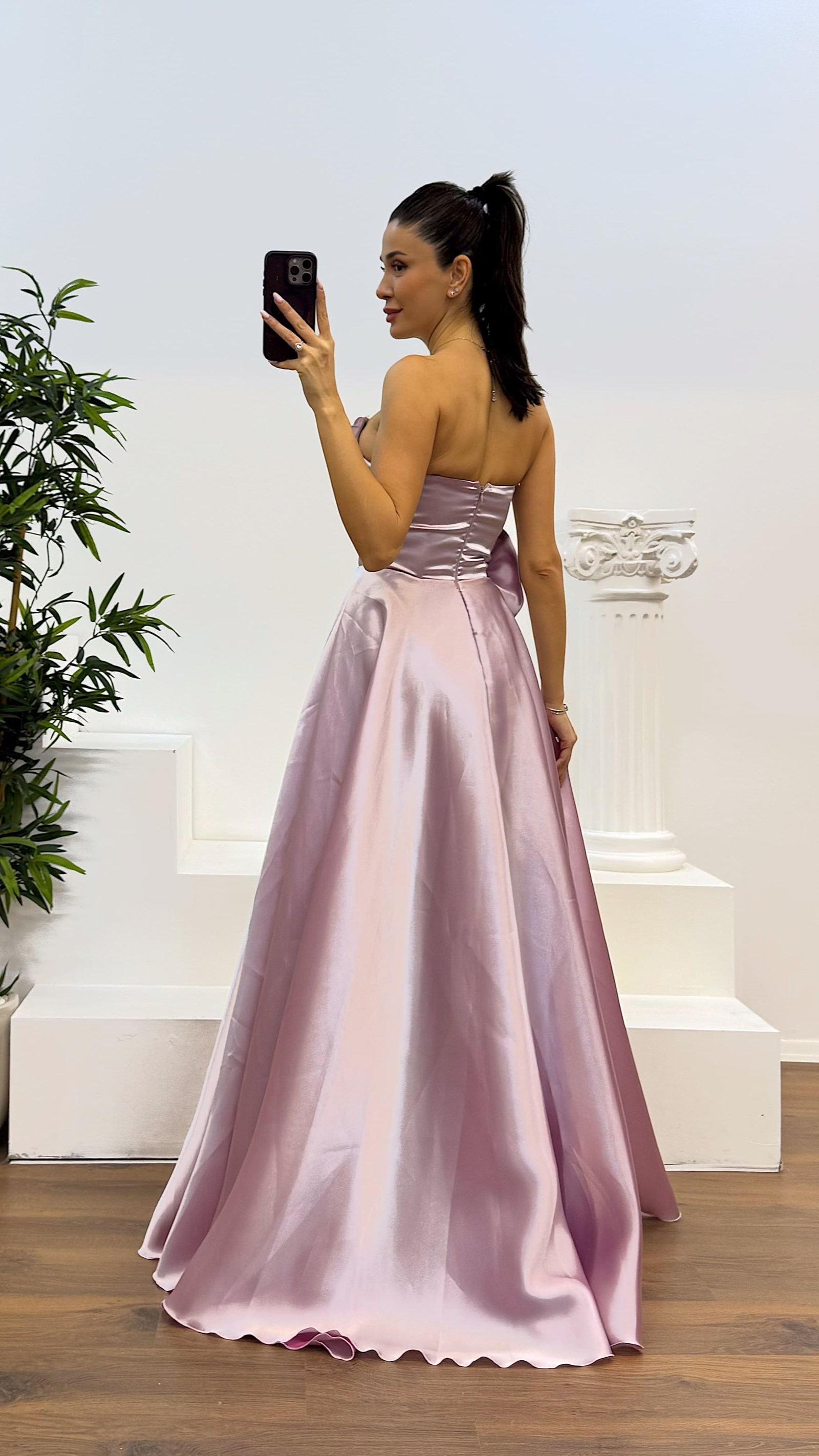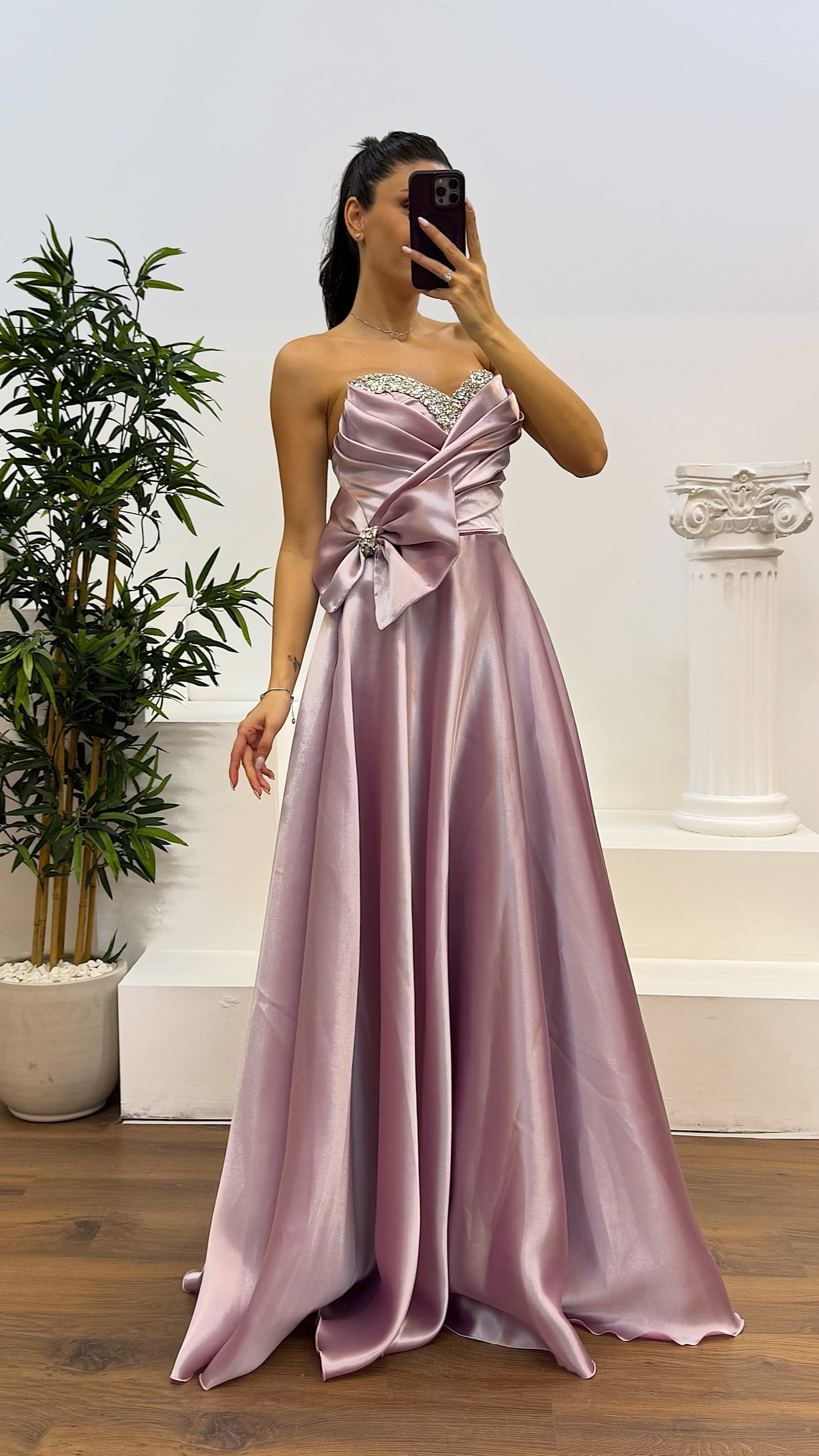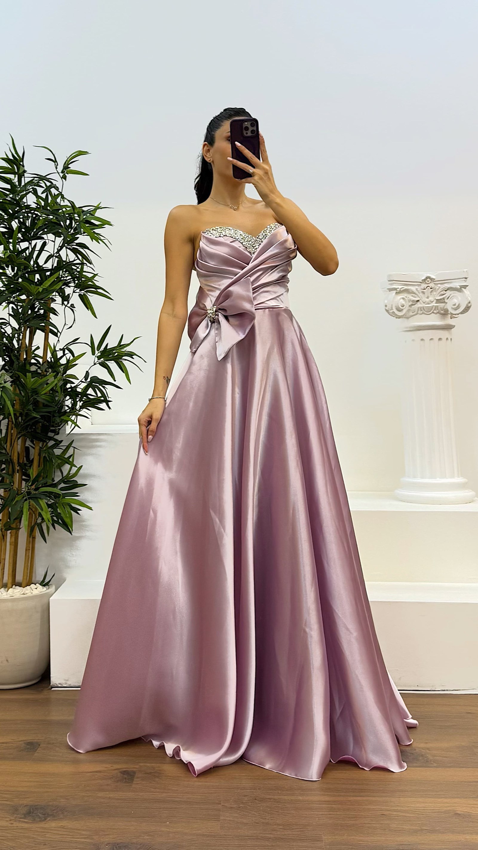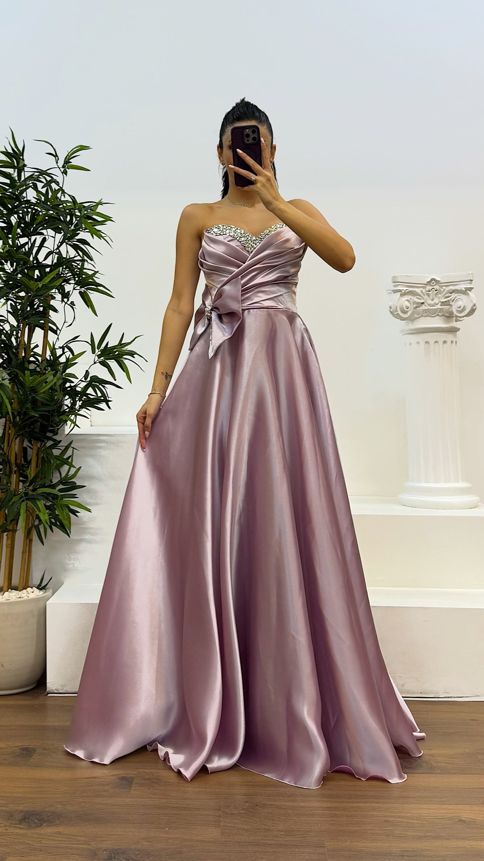 • Pudra Straplez Fiyonk Detay Abiye Elbise