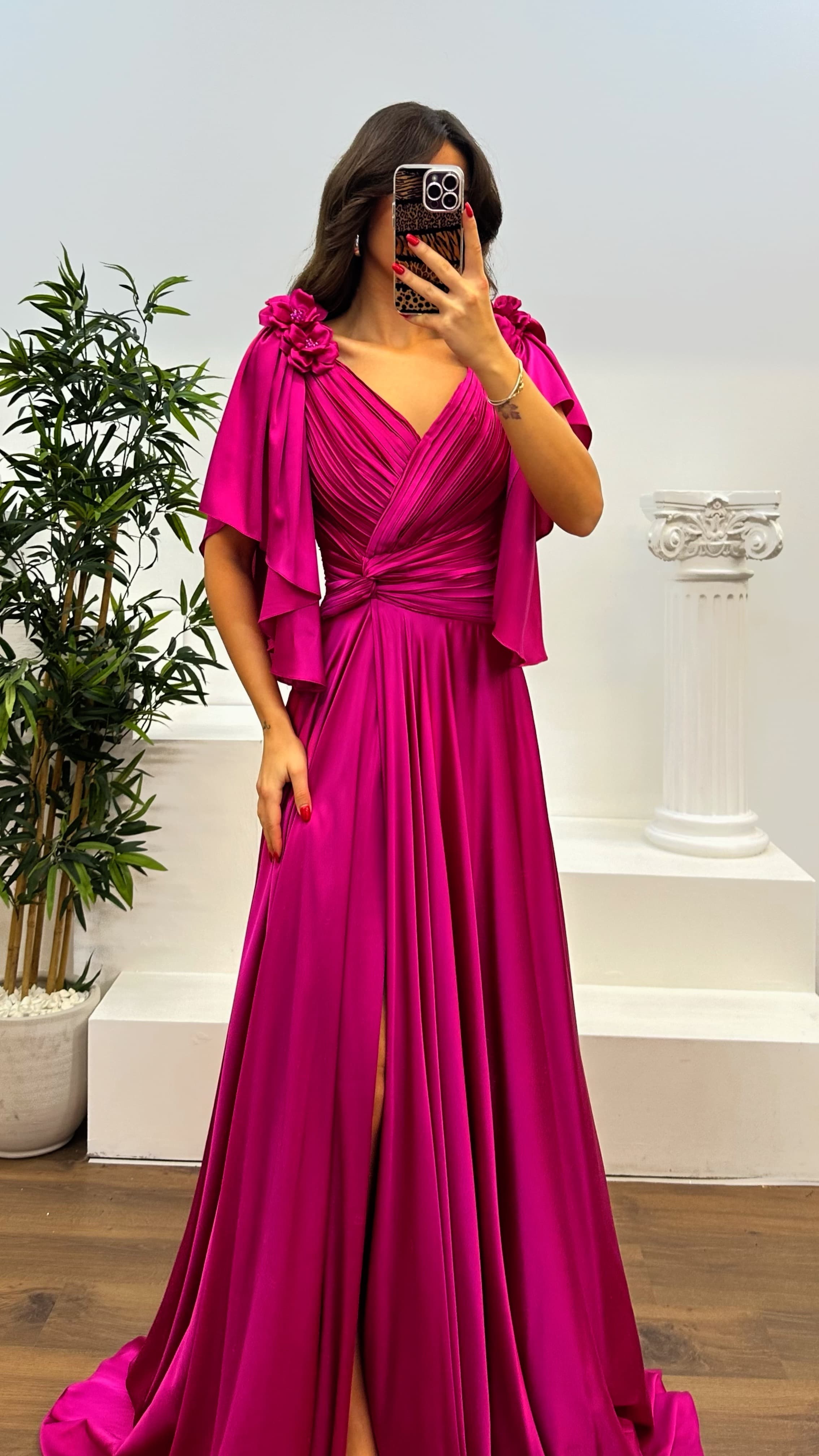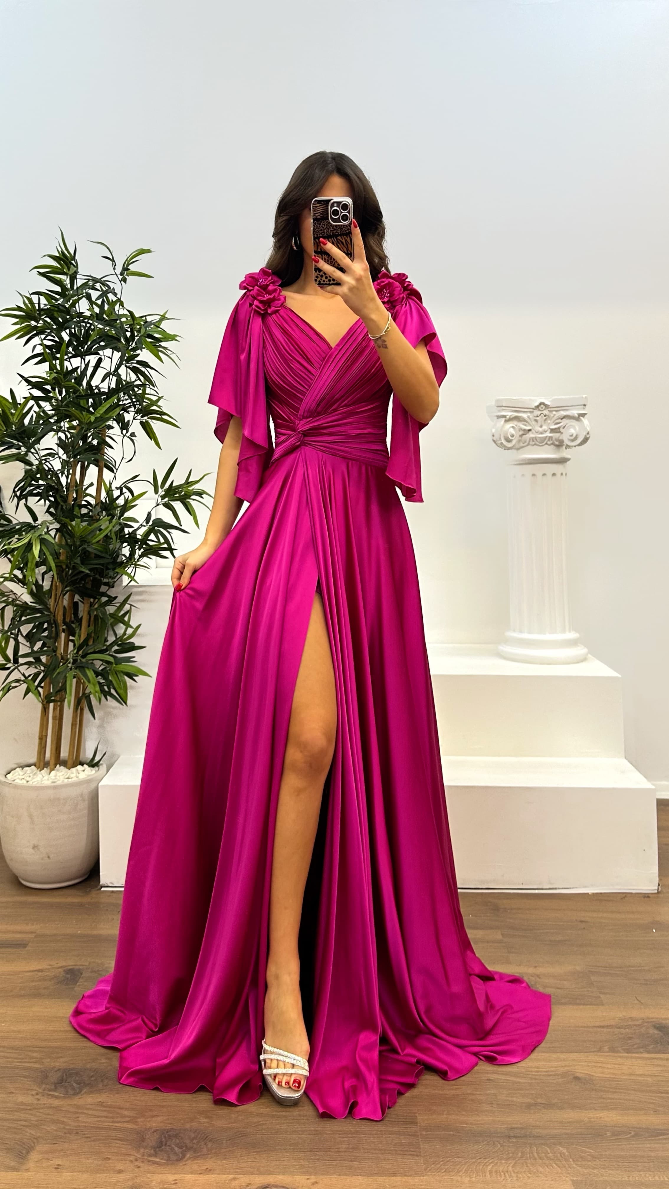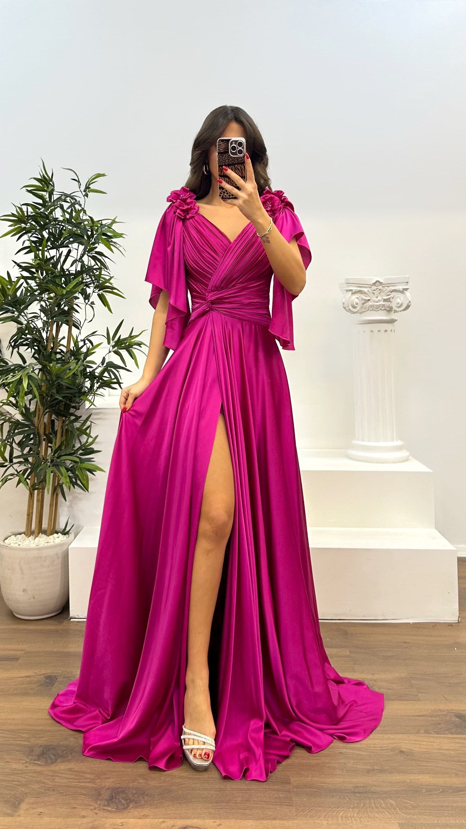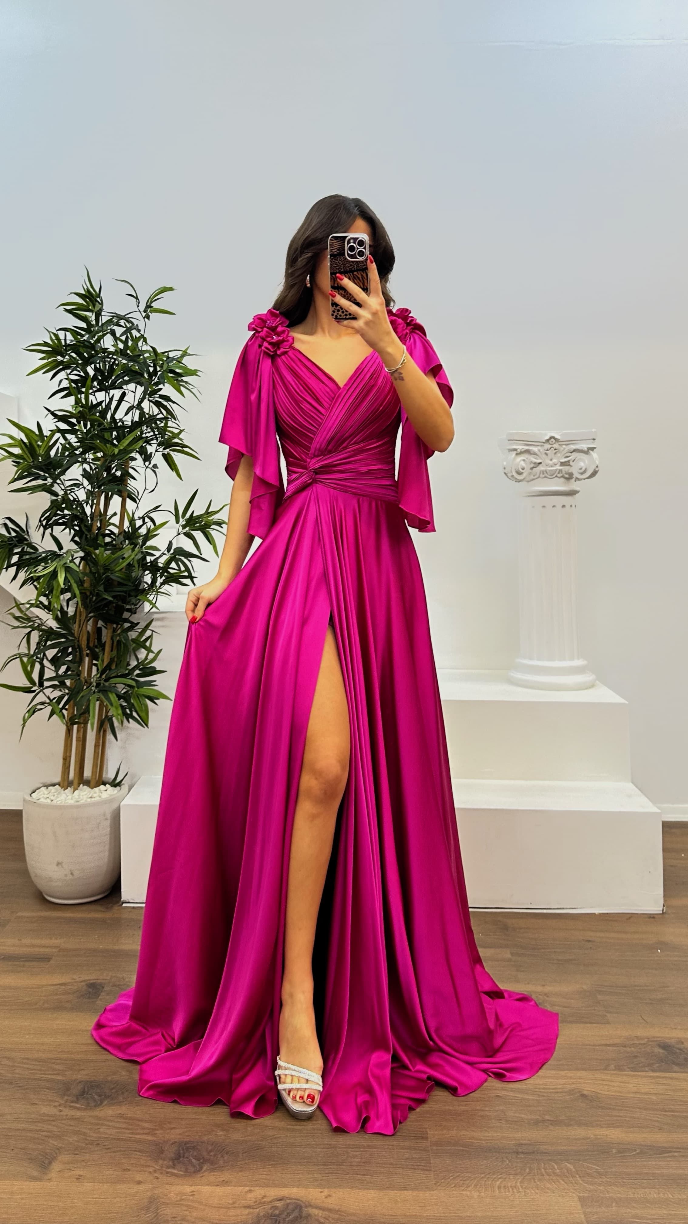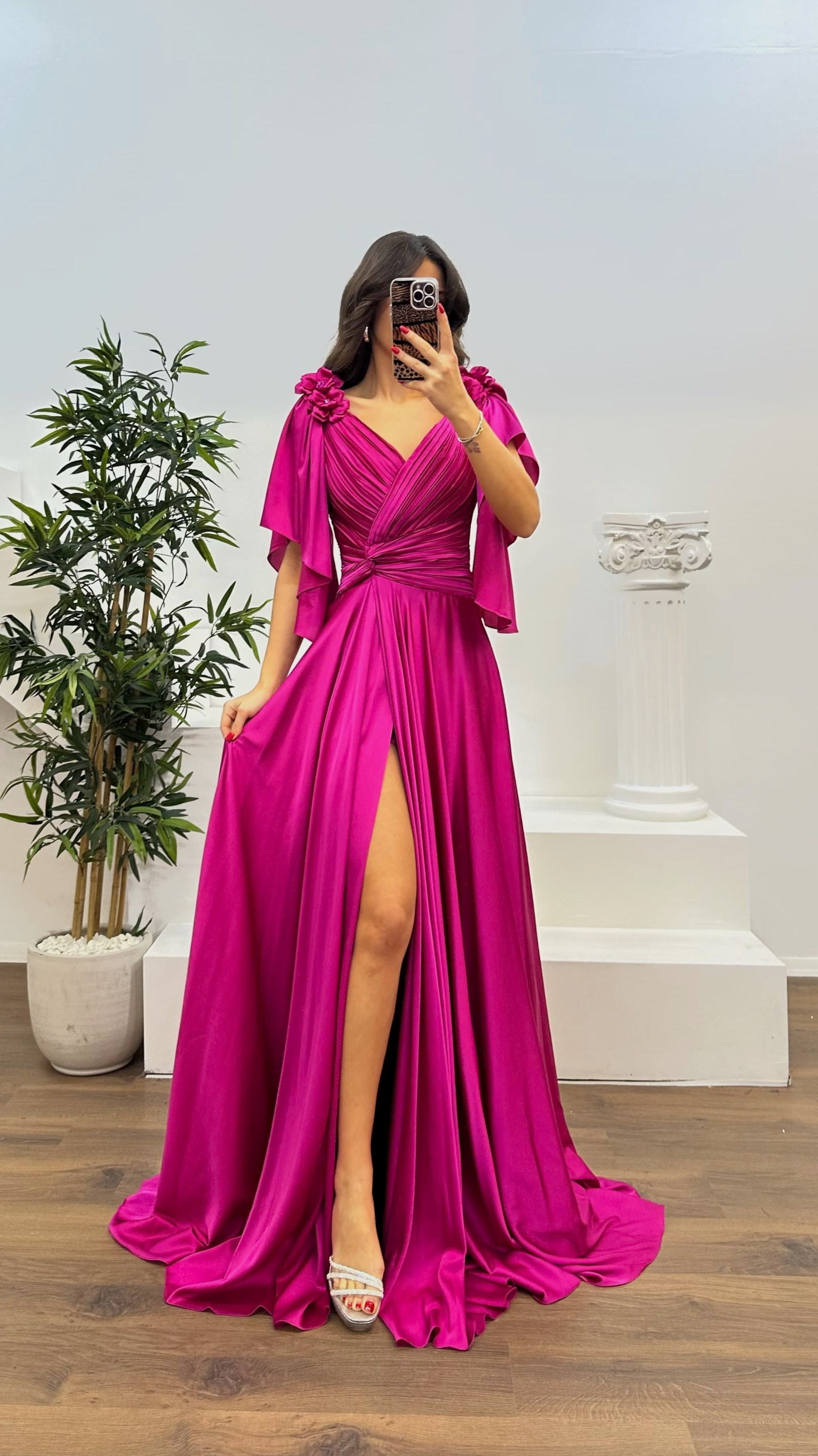 • Fuşya Çiçek Detay Saten Abiye Elbise