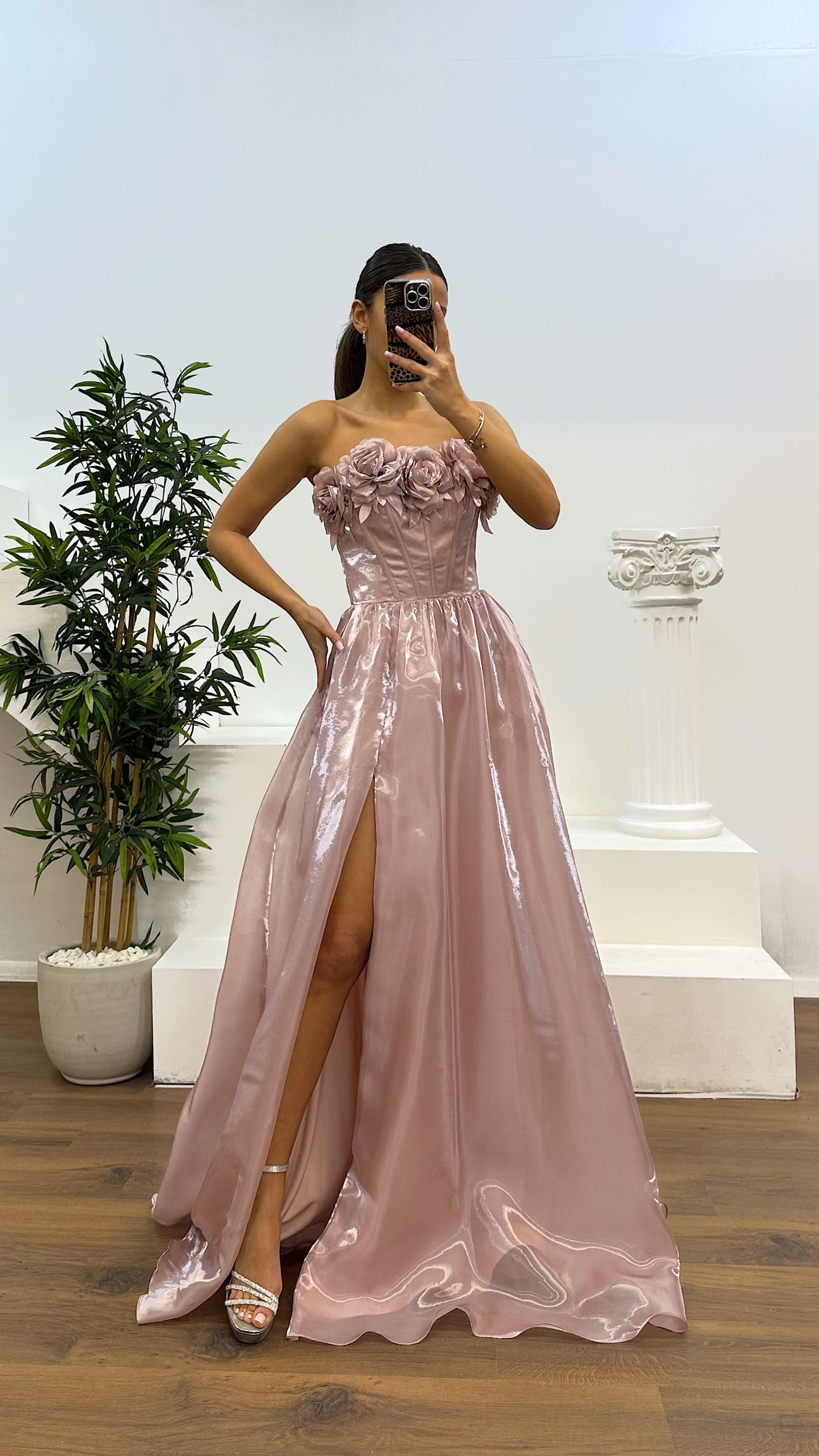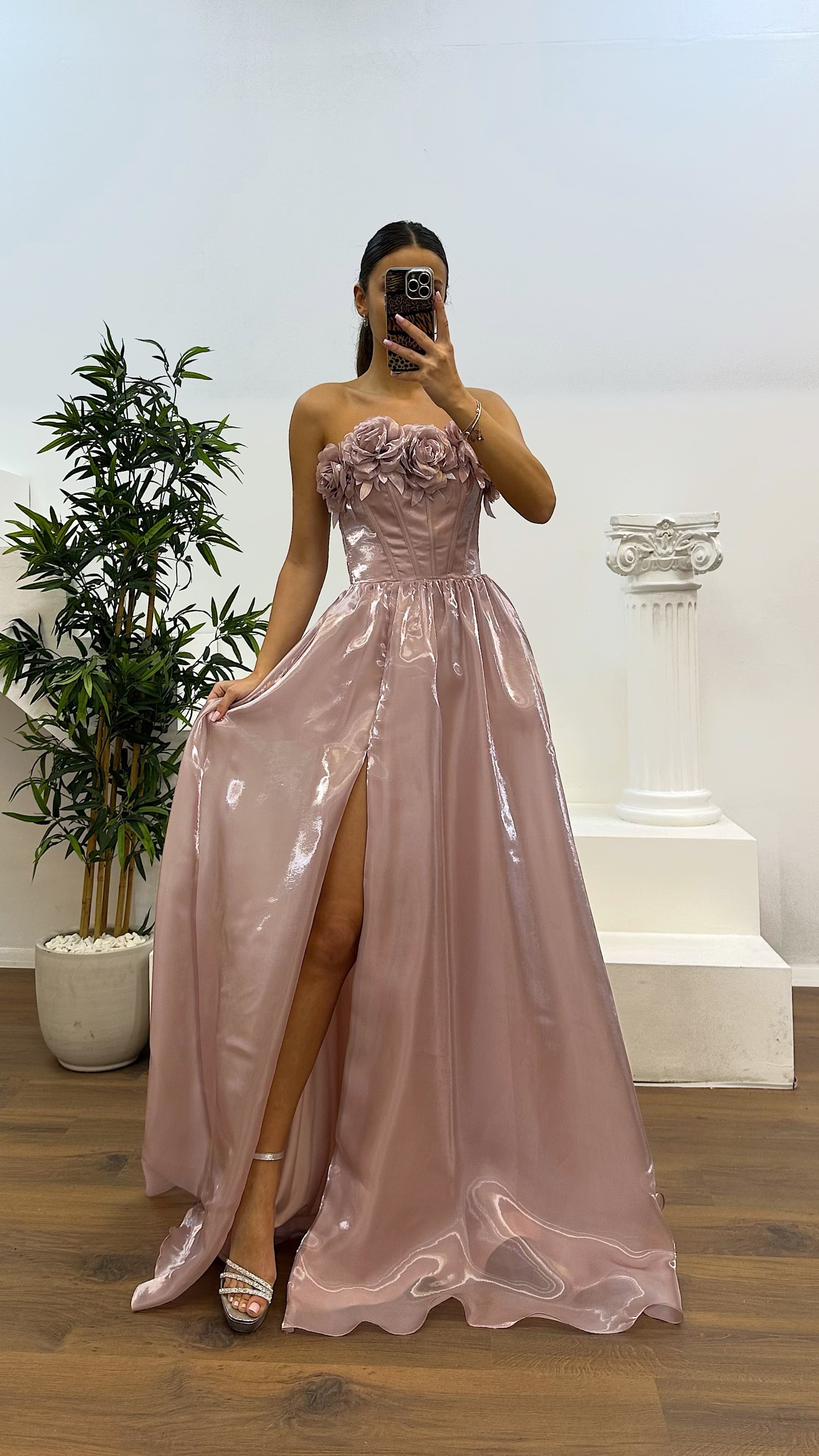 Pudra Straplez Çiçek Detay Abiye Elbise