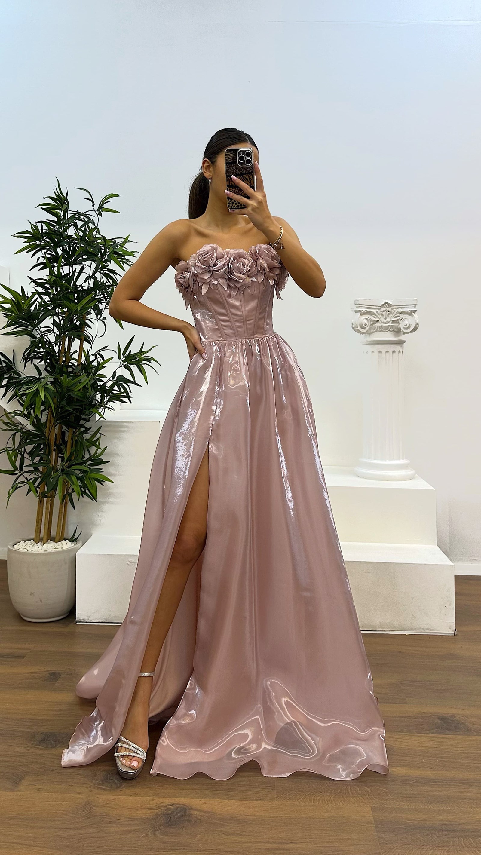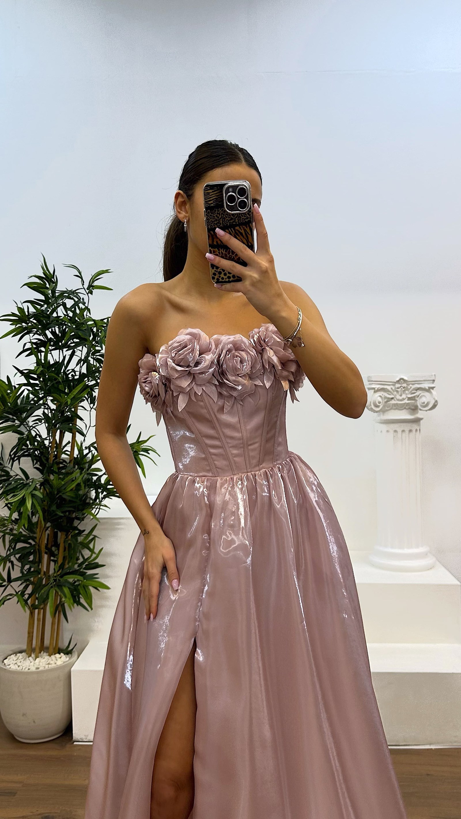 • Pudra Straplez Çiçek Detay Abiye Elbise