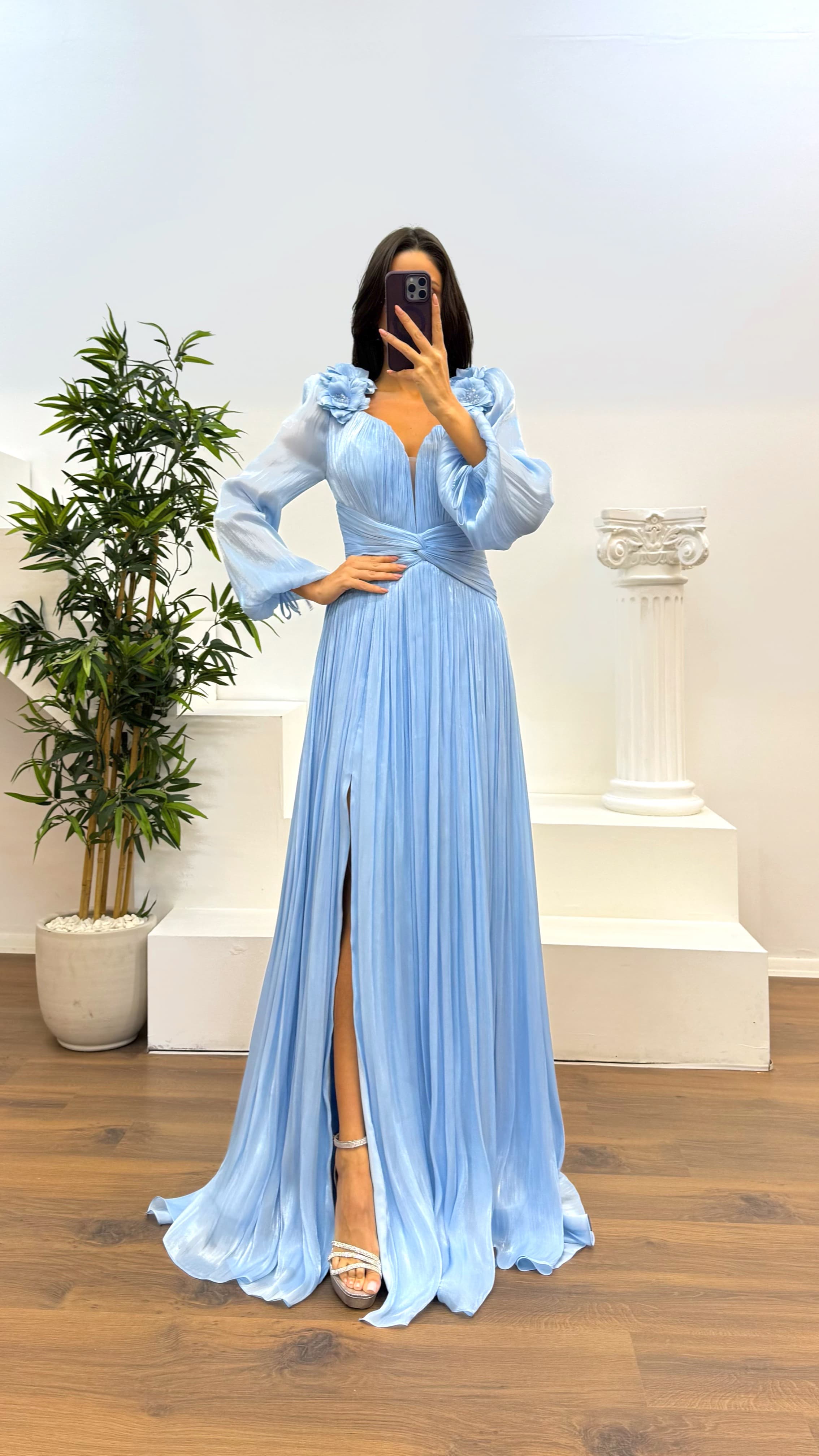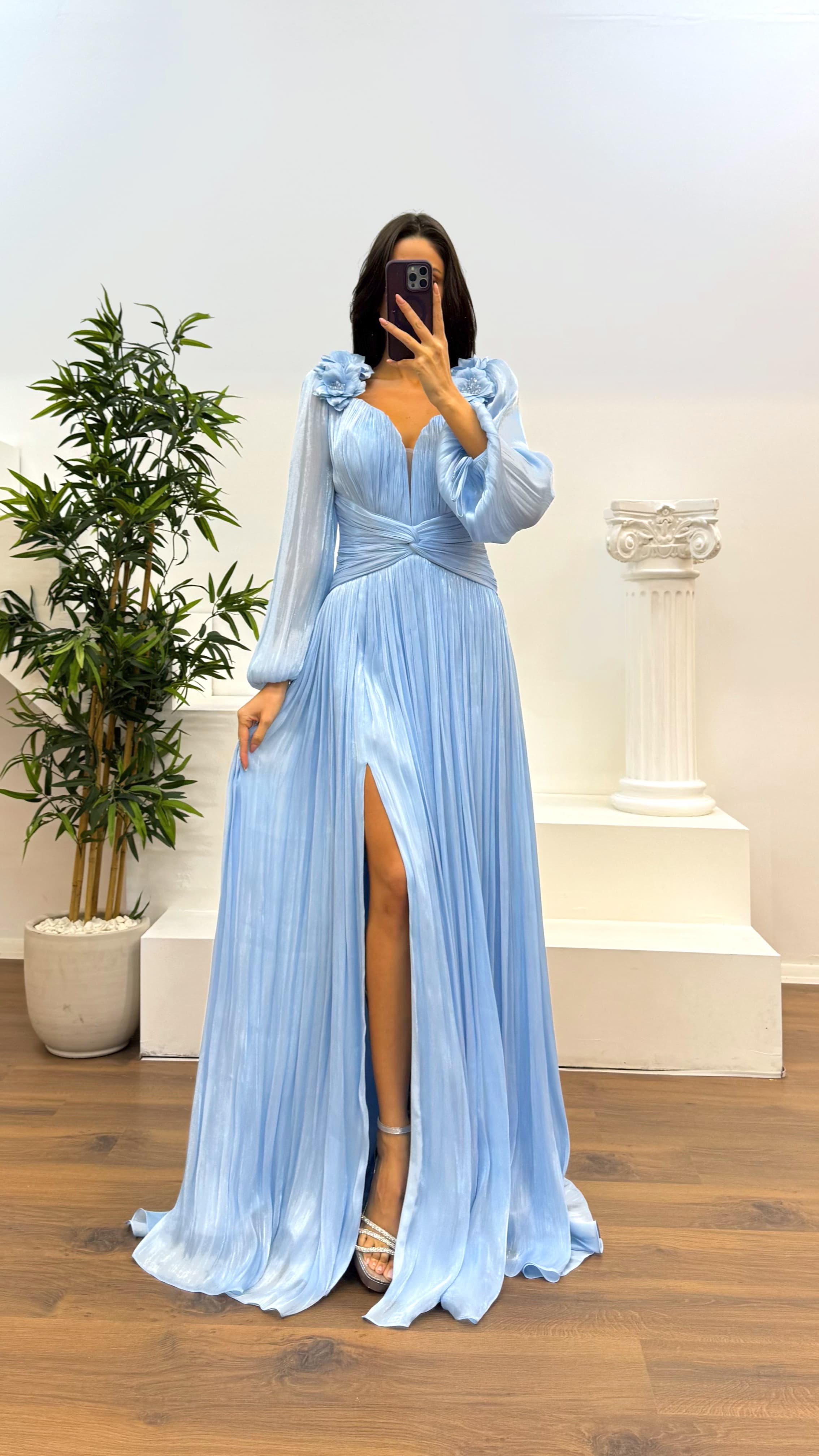 • Soğan Kabuğu Çiçek Detay Piliseli Abiye Elbise