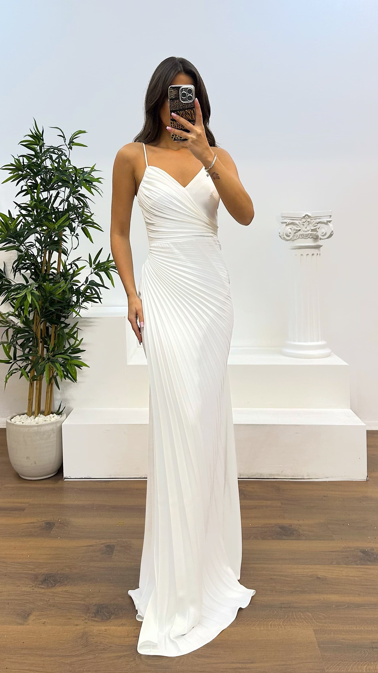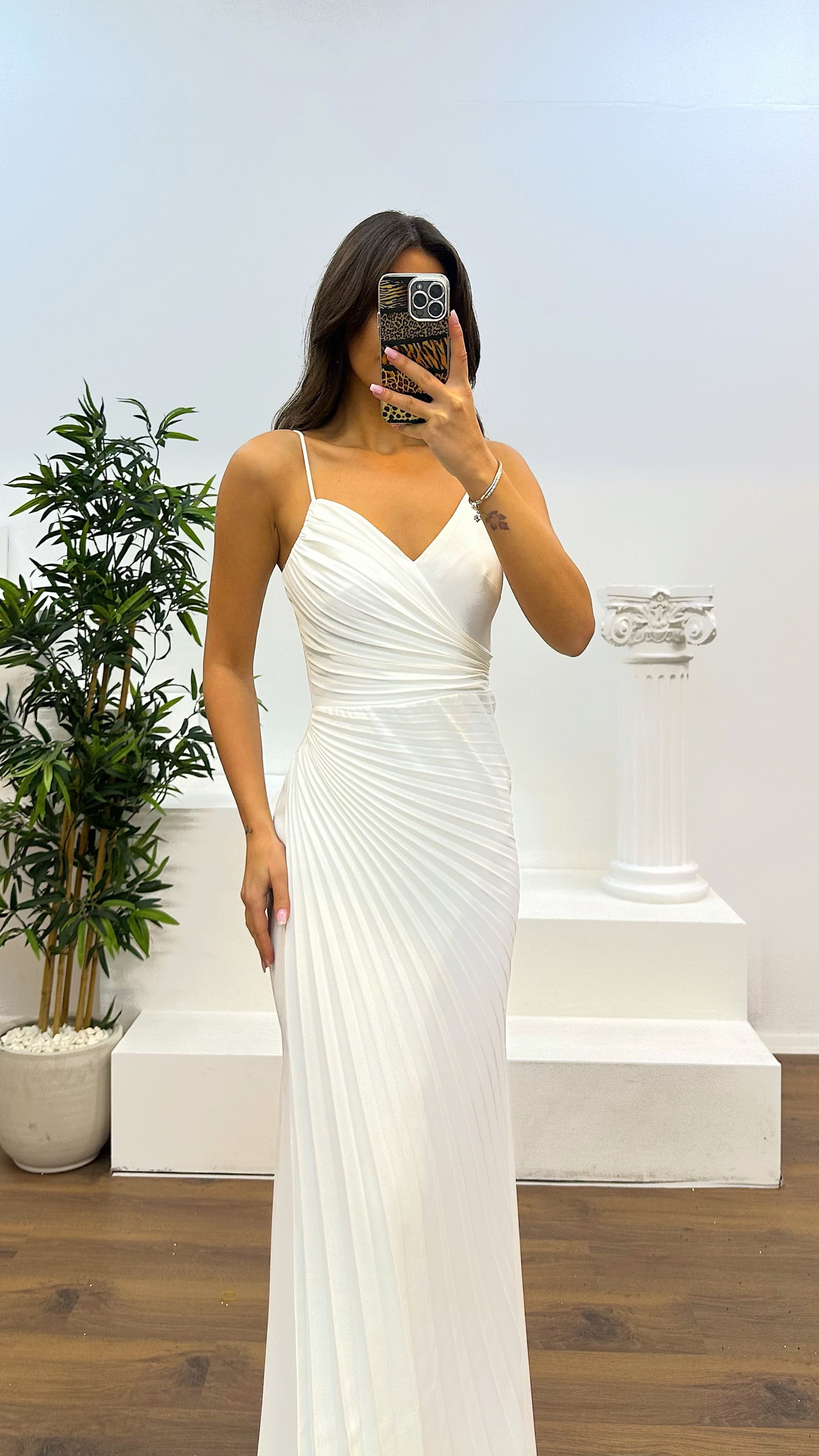 • Kemik İp Askılı Piliseli Abiye Elbise