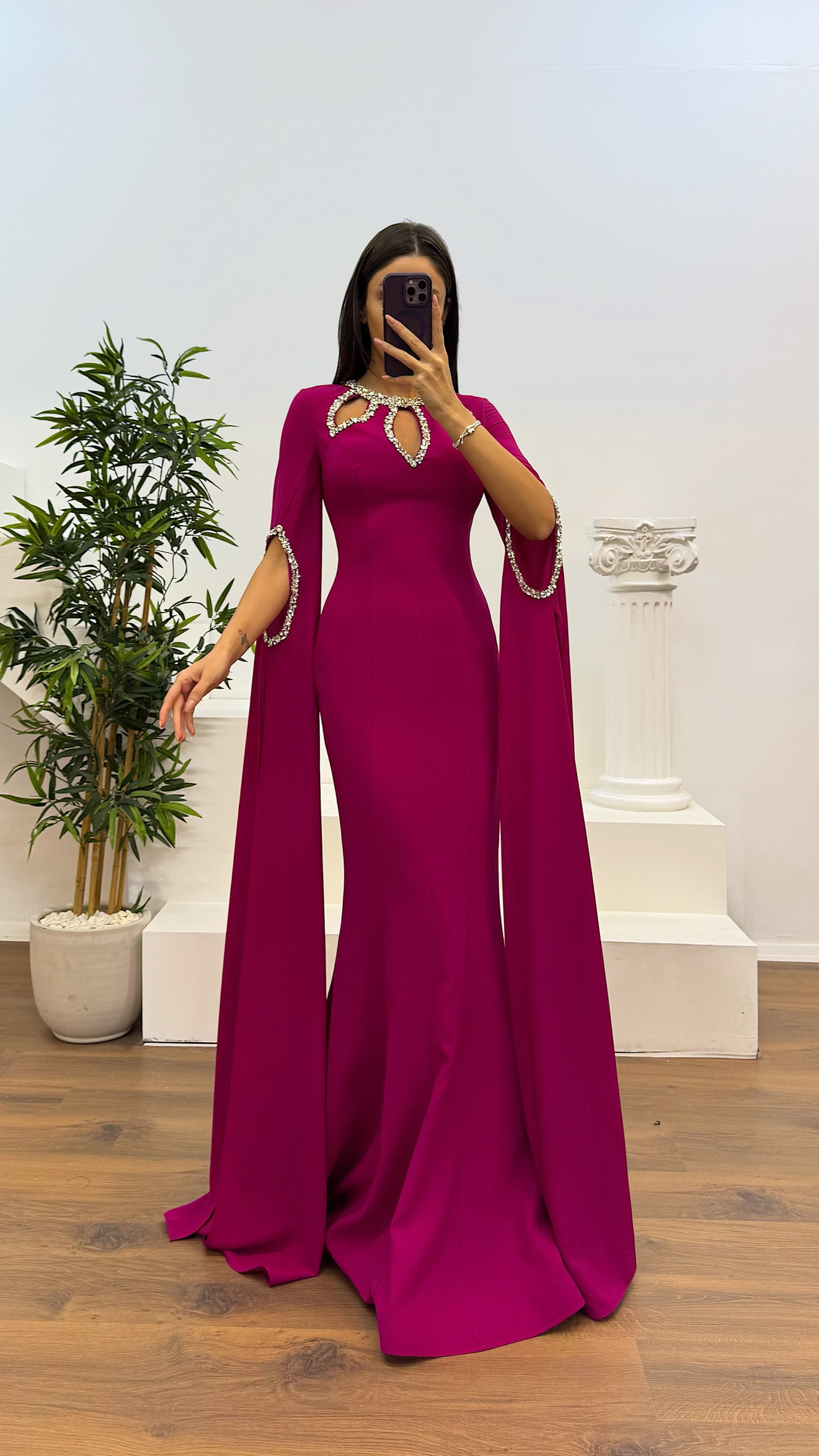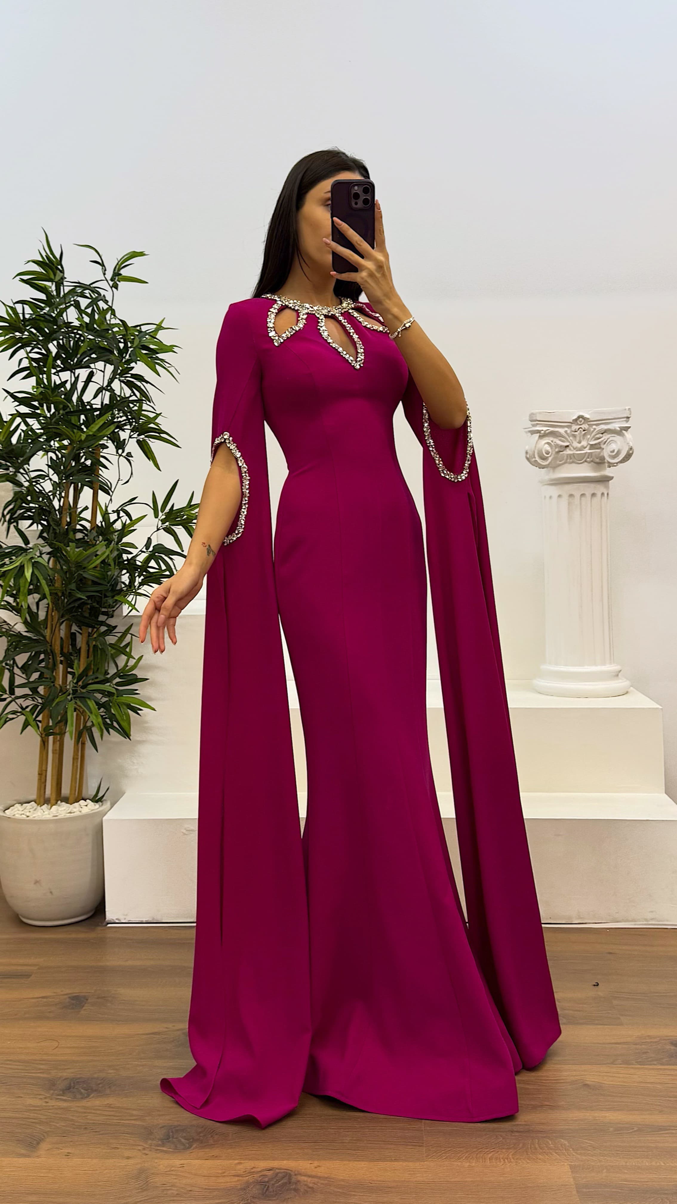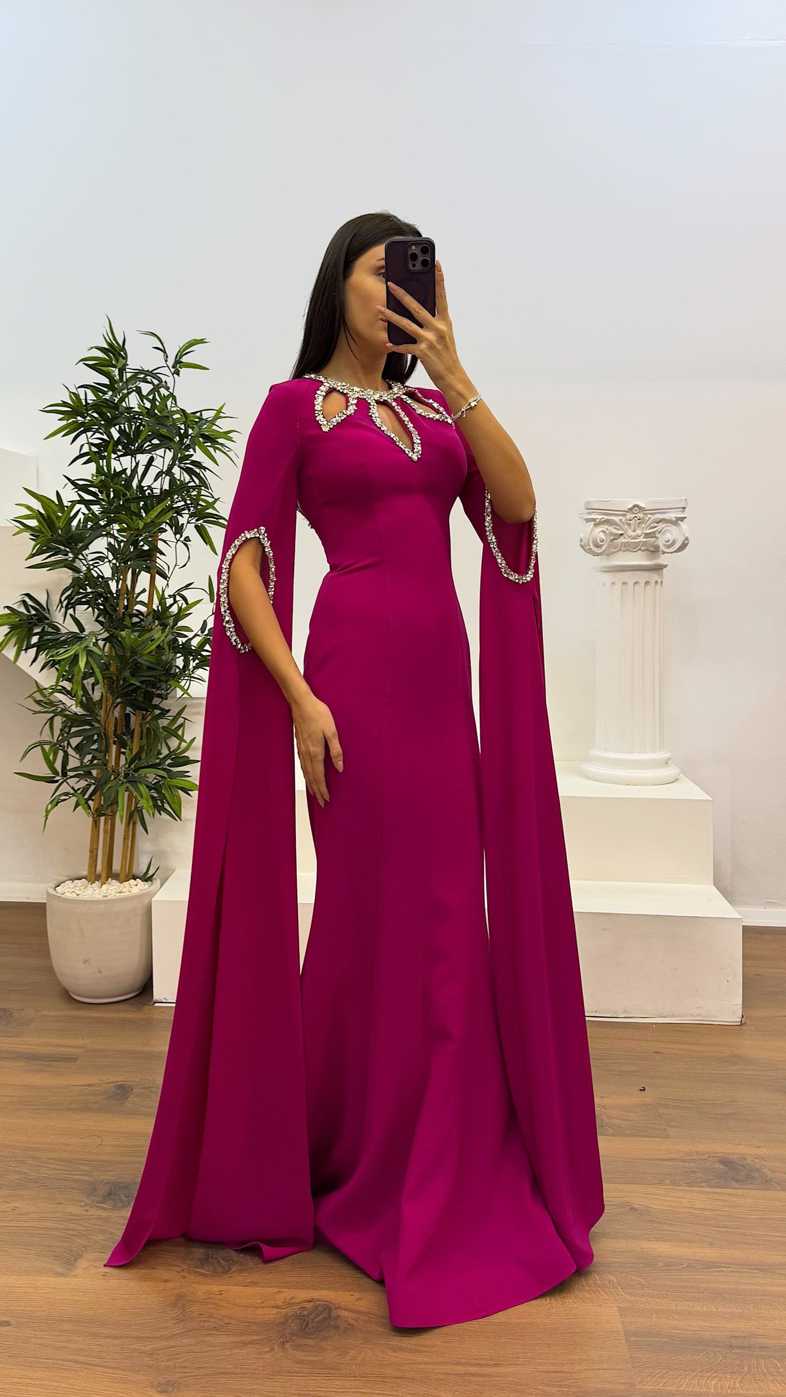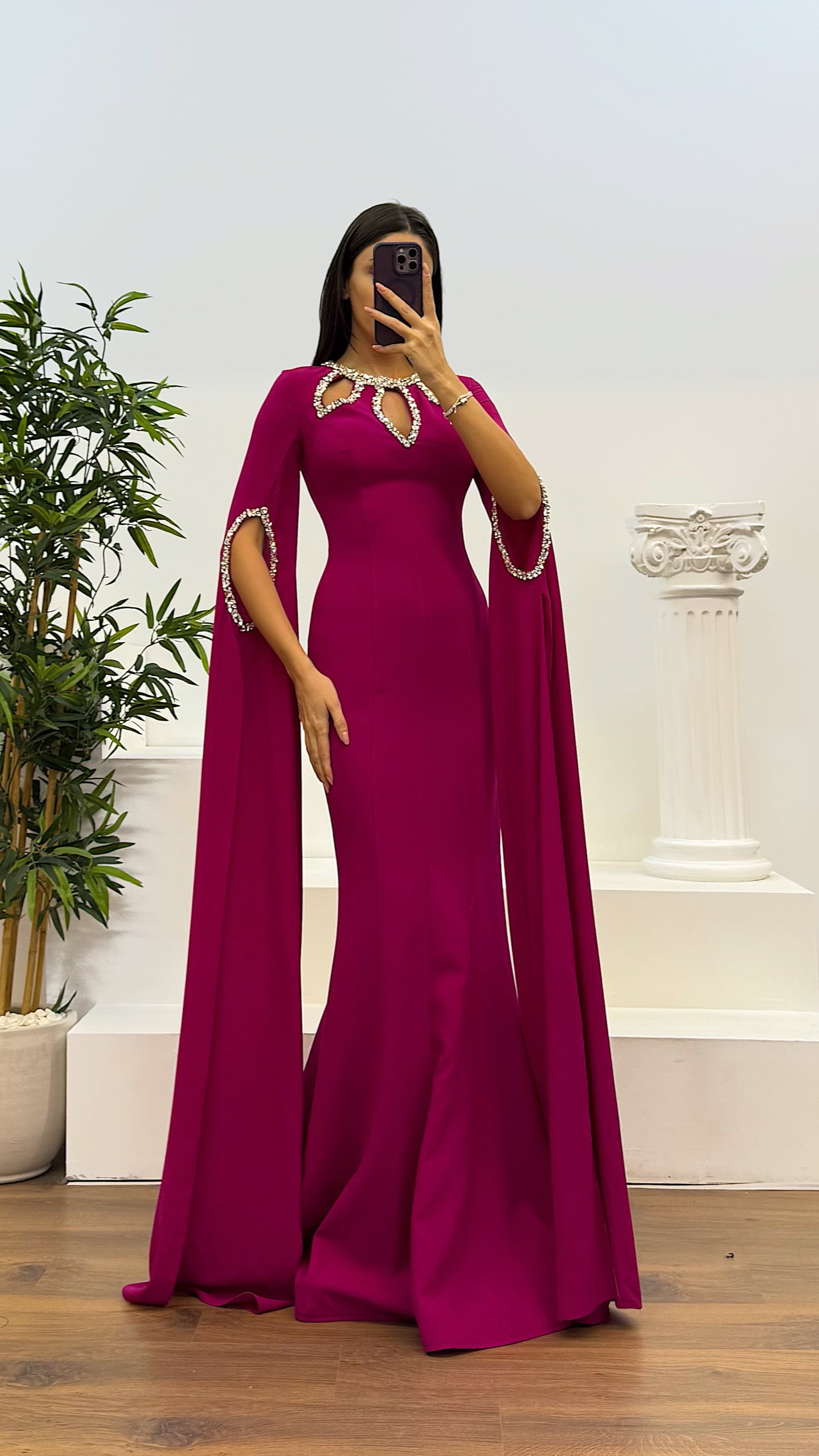 فستان سهرة بتفاصيل من الأحجار المنتج متوافق مع المقاسات من 36 إلى 42، يحتوي على بطانة ودعامة صدر، يغلق من الخلف بسحاب، مصمم كفستان سهرة بتفاصيل من الأحجار. طول المنتج: يمكن أن يتراوح بين 165-170 سم. نوع القماش: أطلس 100% بوليستر.