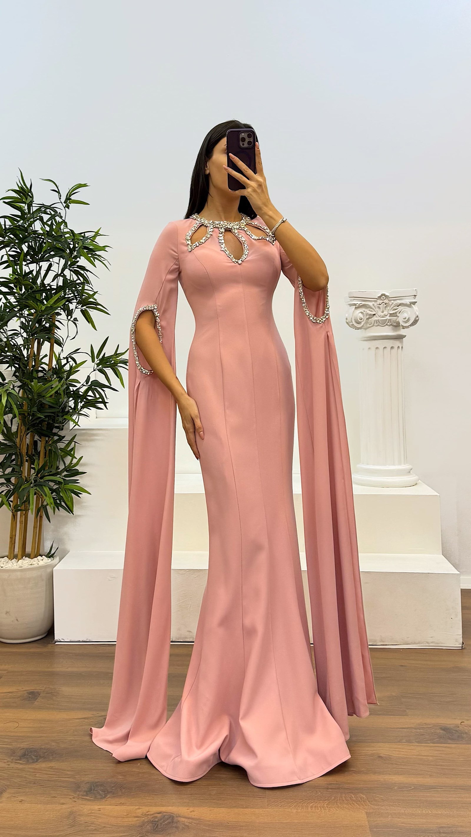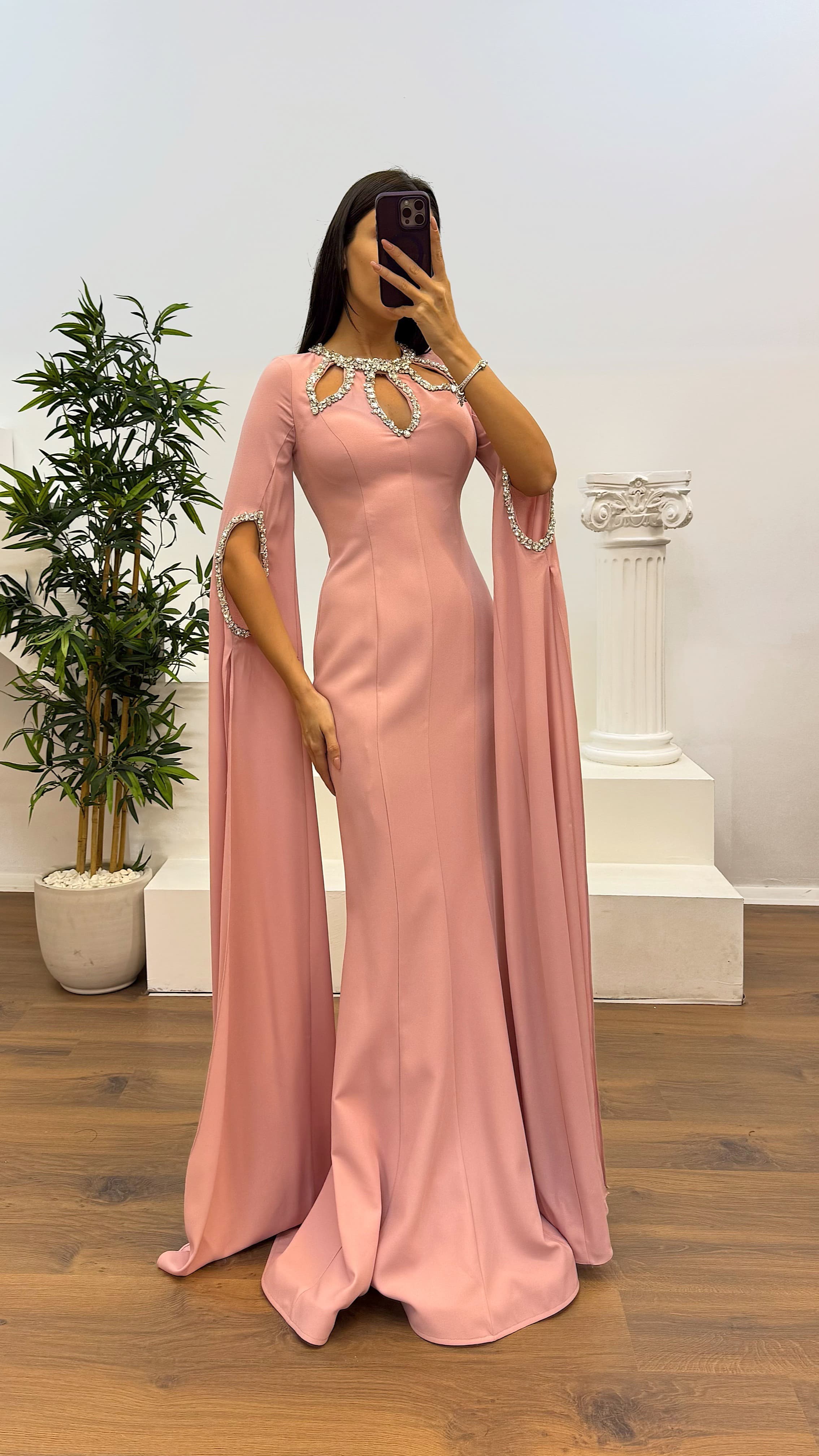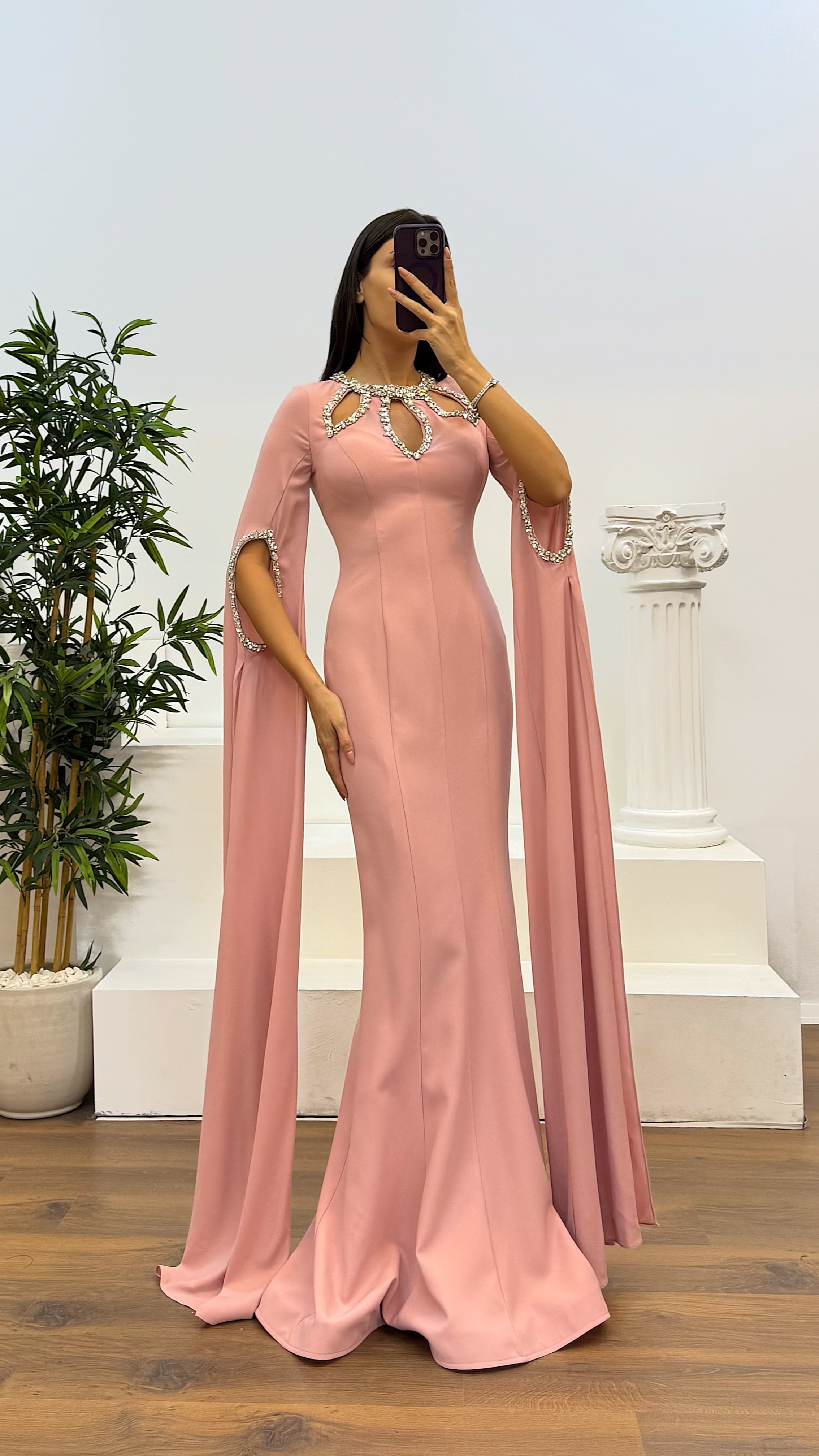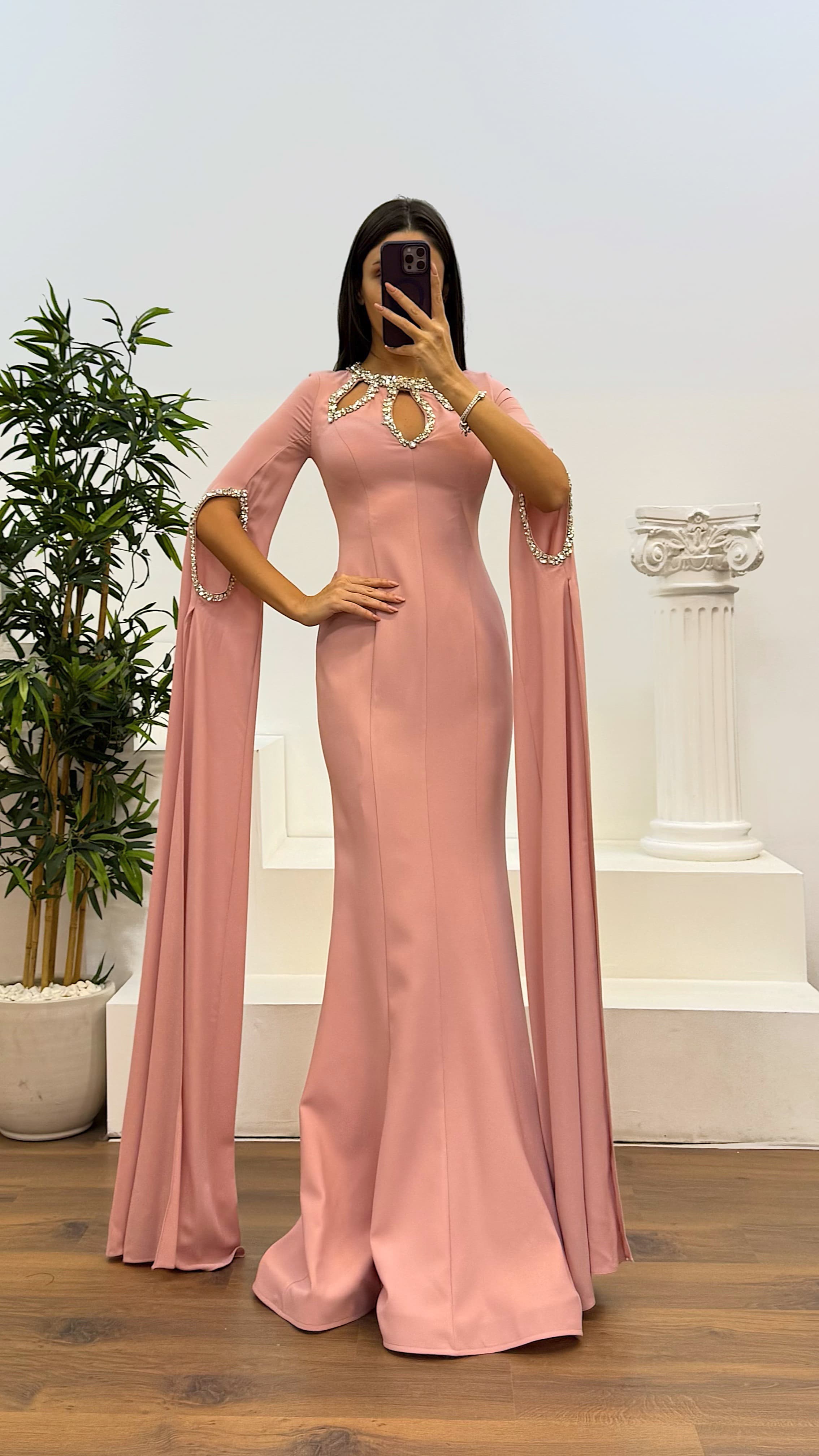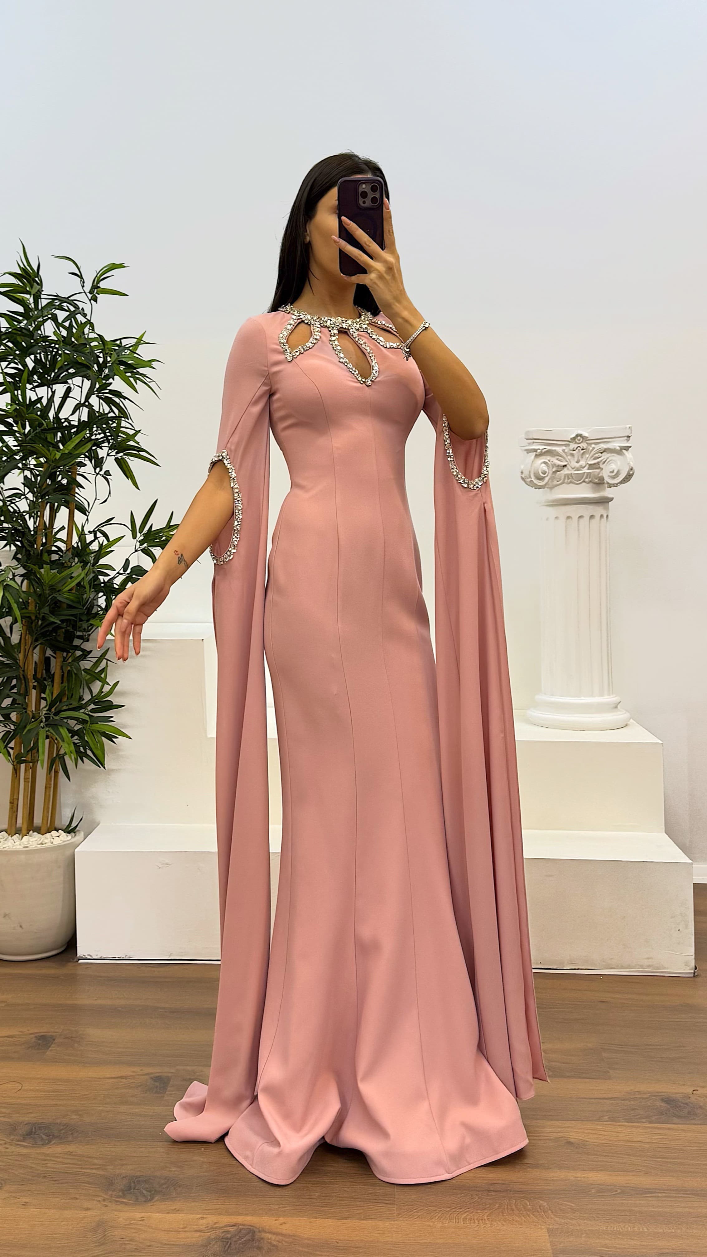 • Pudra Taş Detay Abiye Elbise