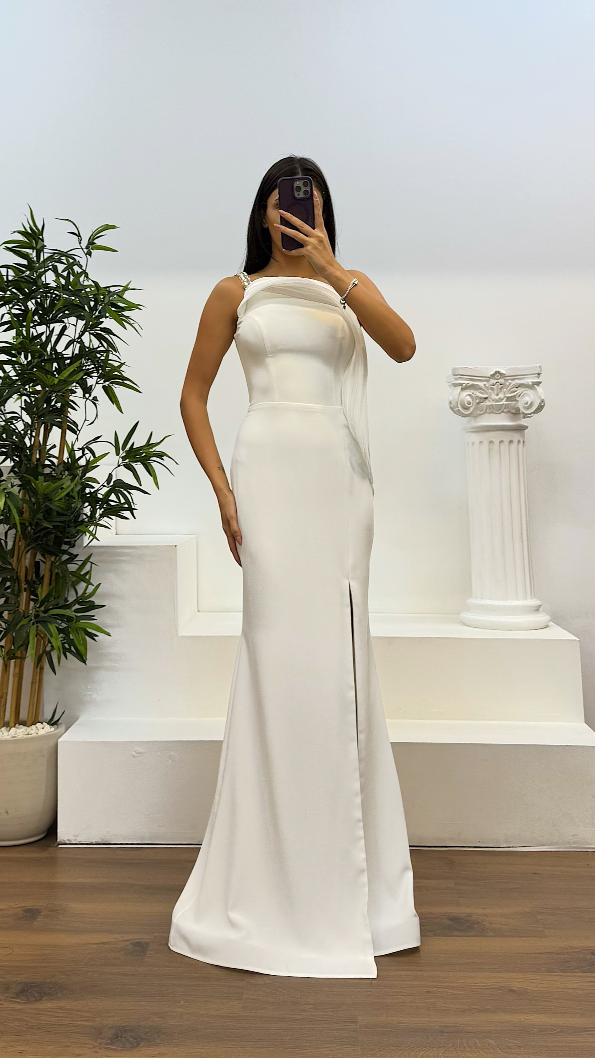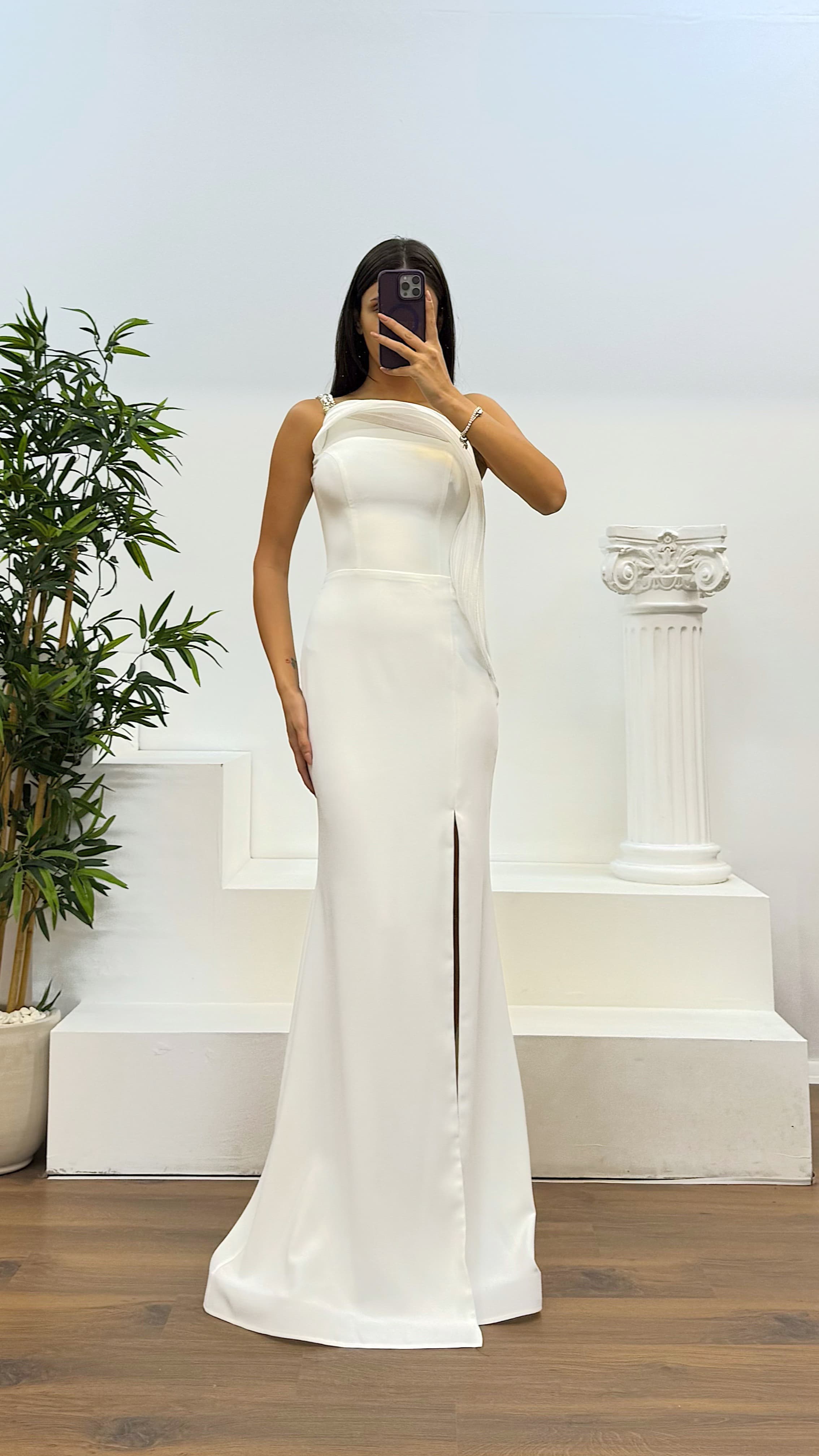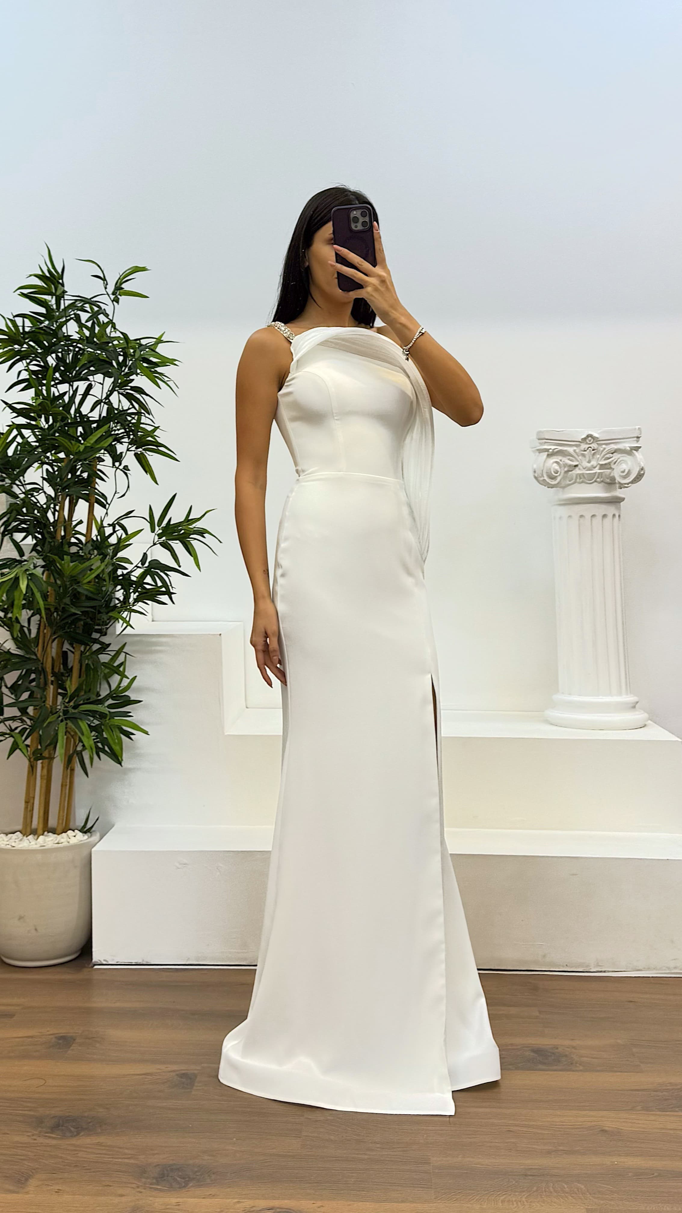 • Beyaz Tek Omuz Taş Detay Abiye Elbise