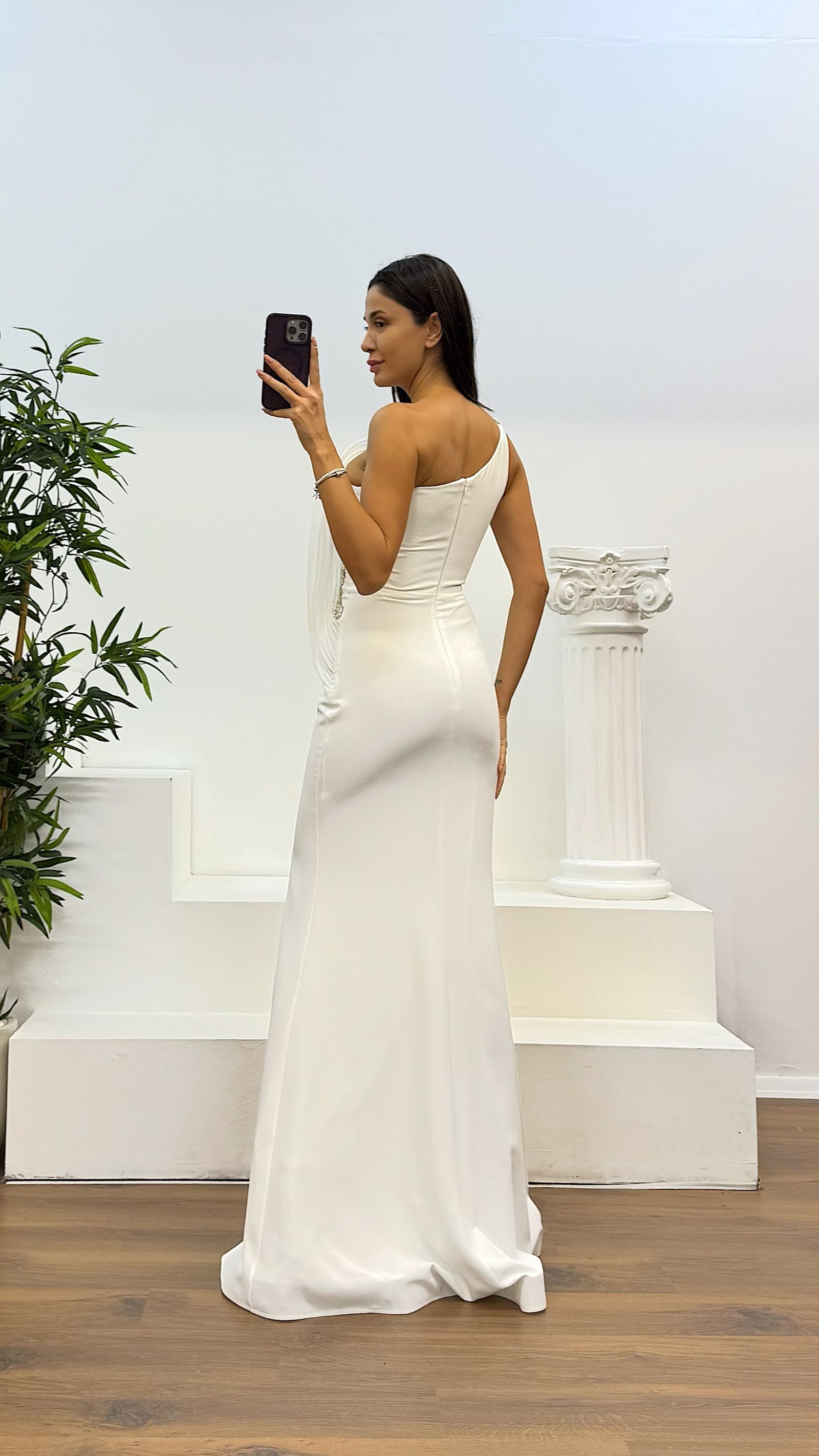 Beyaz Tek Omuz Taş Detay Abiye Elbise