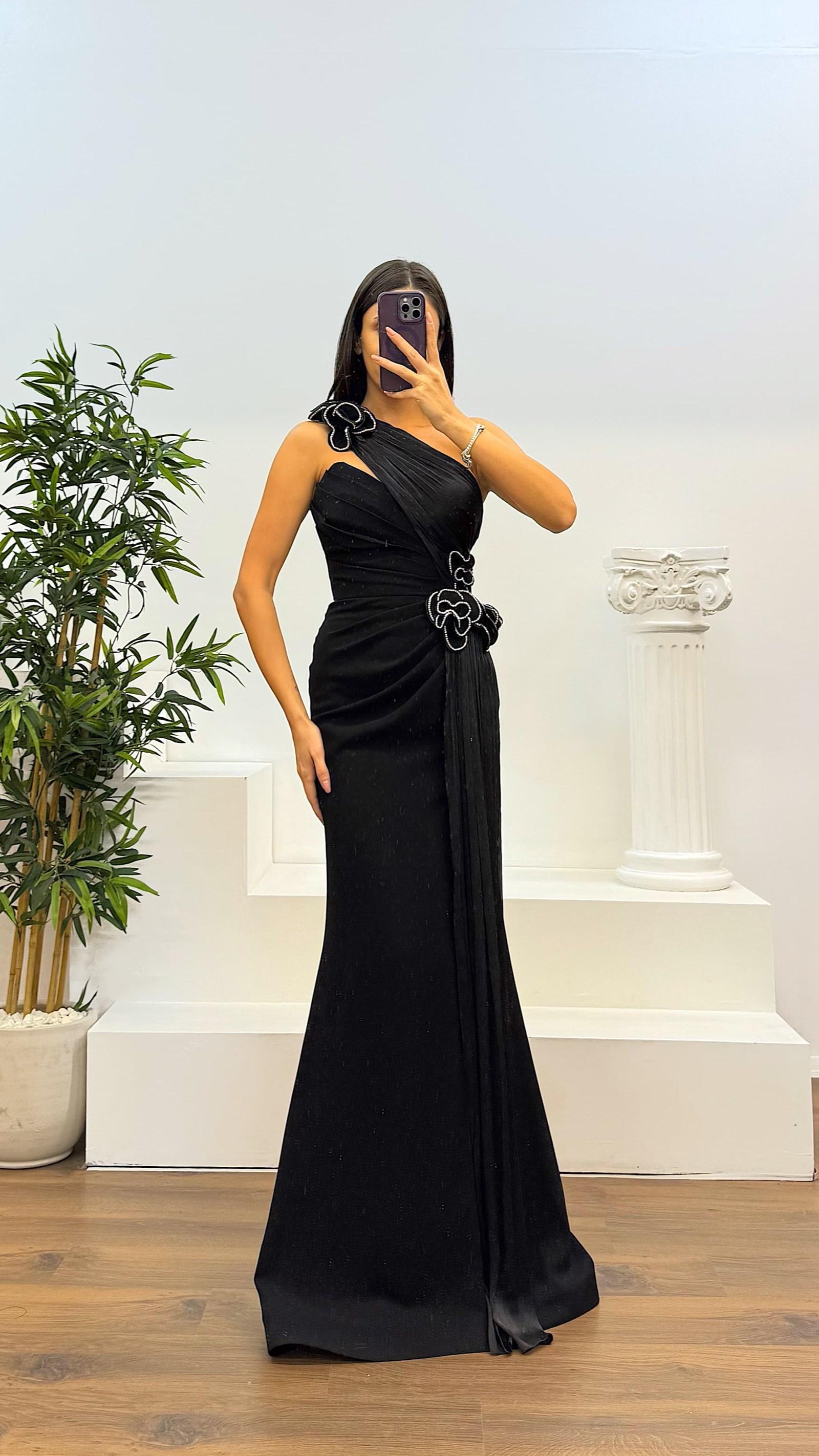 • Siyah Tek Omuz Çiçek Detay Abiye Elbise